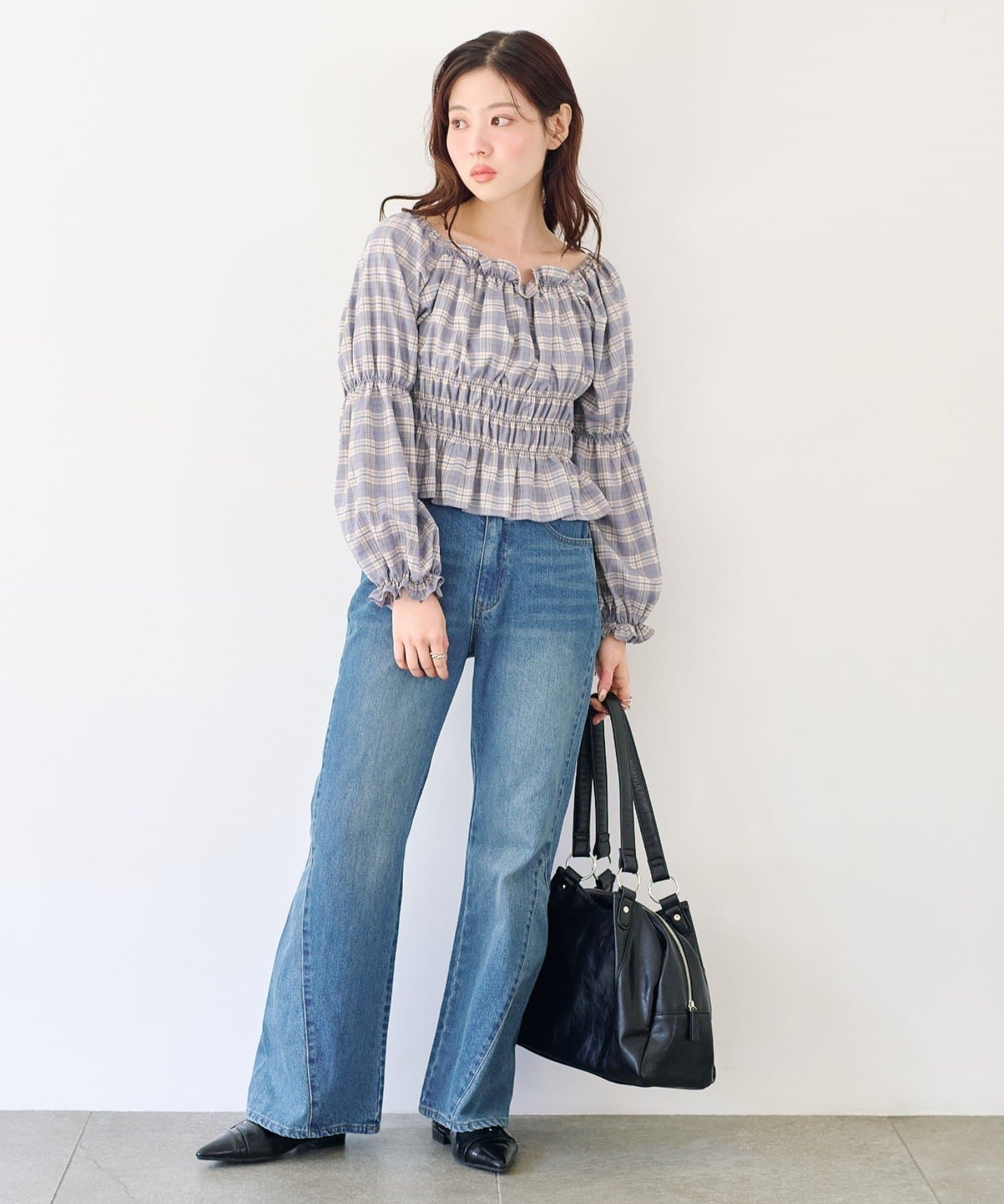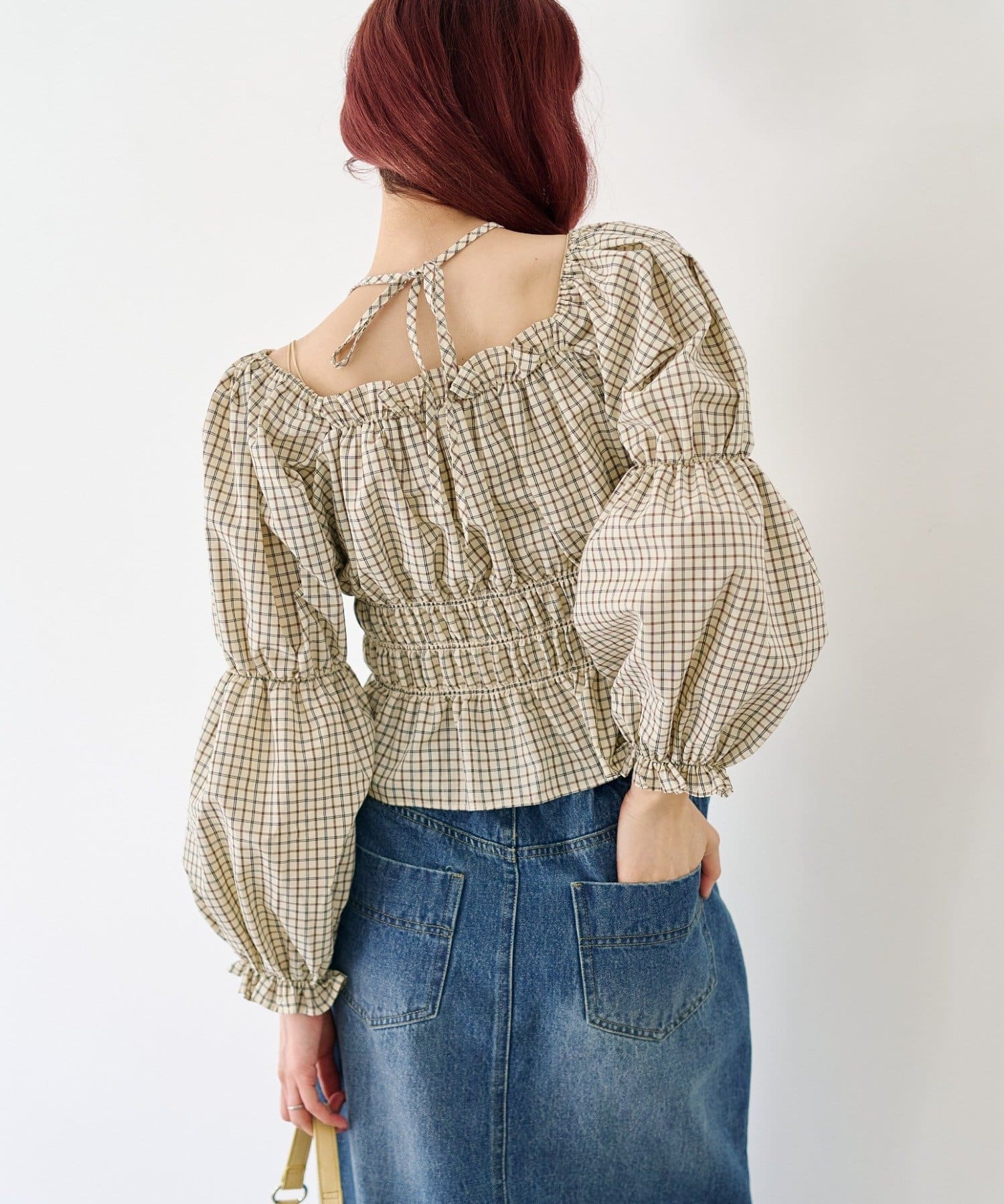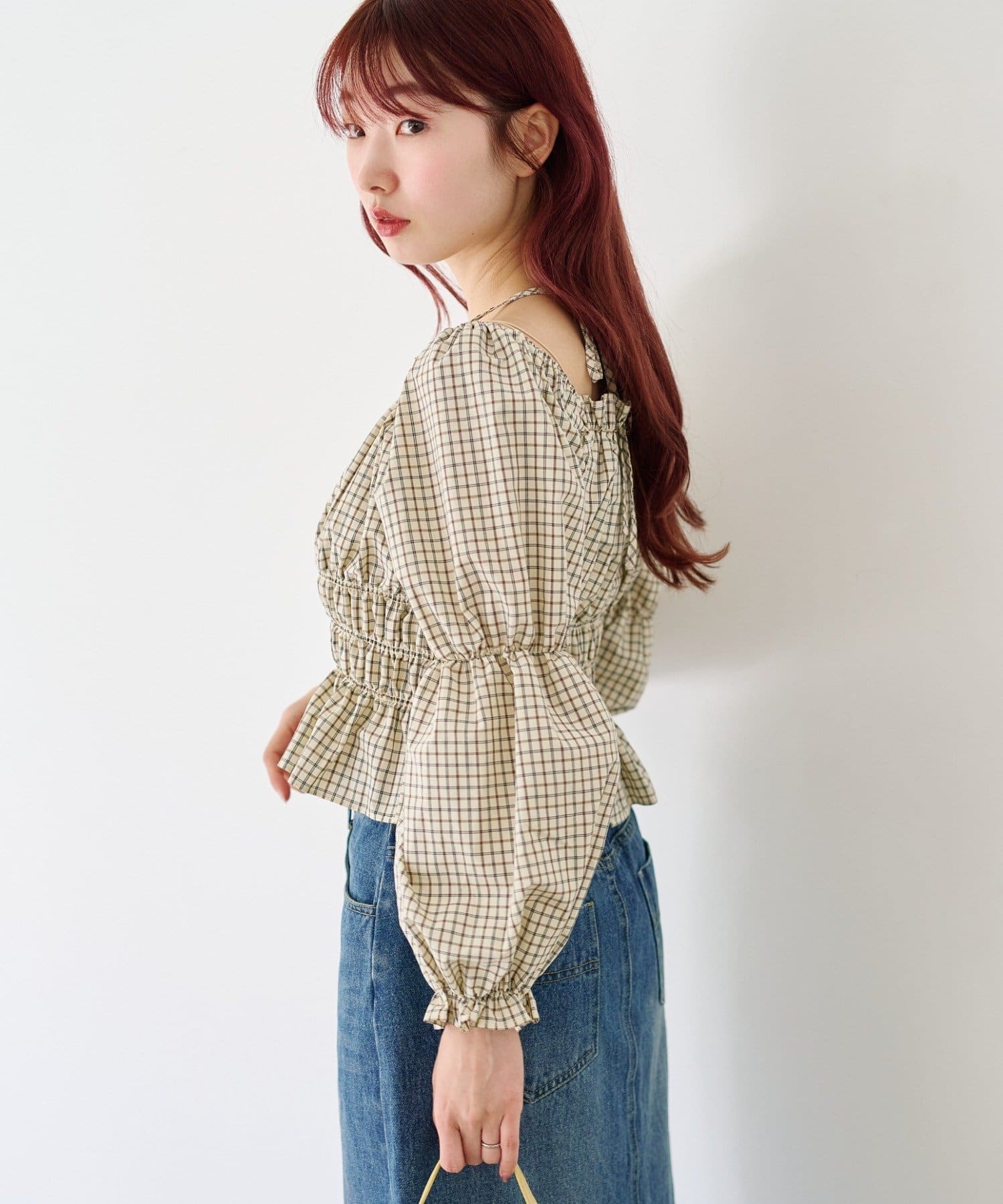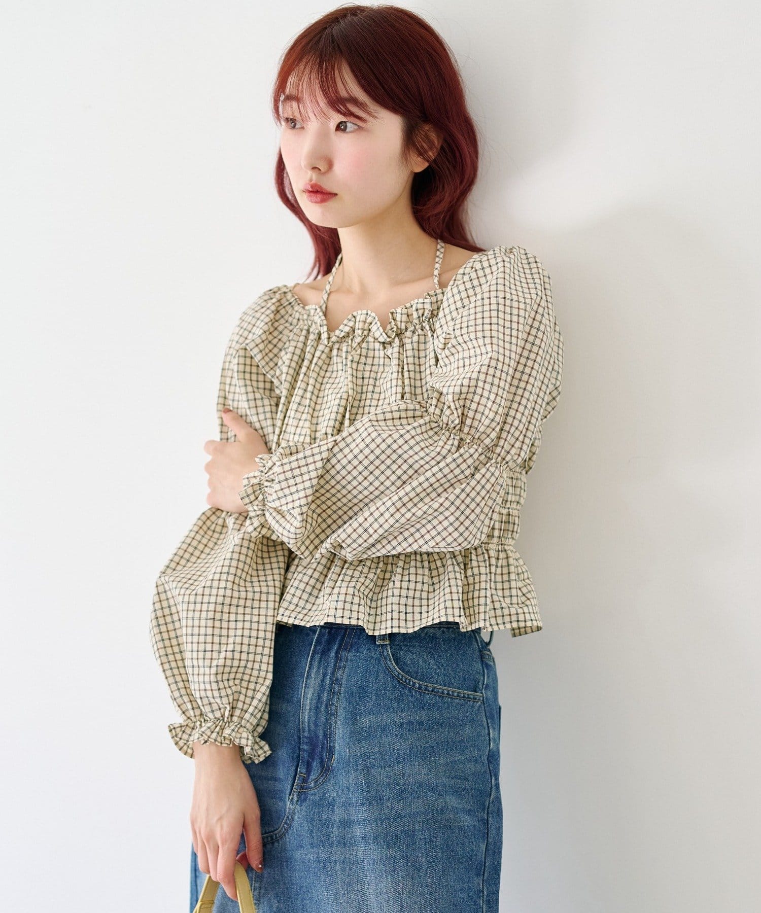 【2.20(金)12:00発売/WEB先行/チェック&無地】シャーリングリボンブラウス