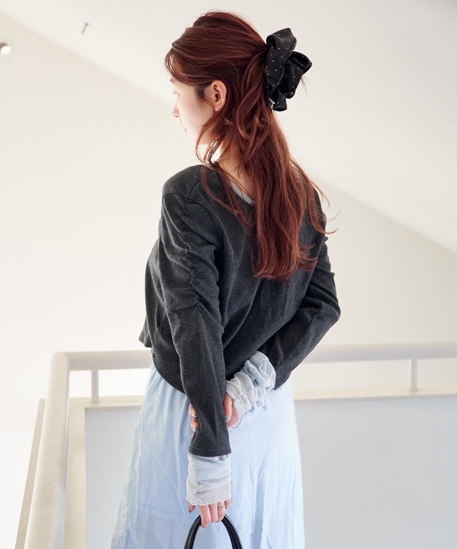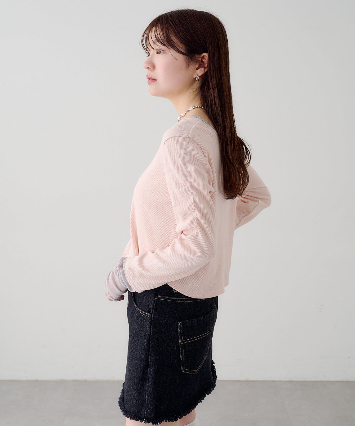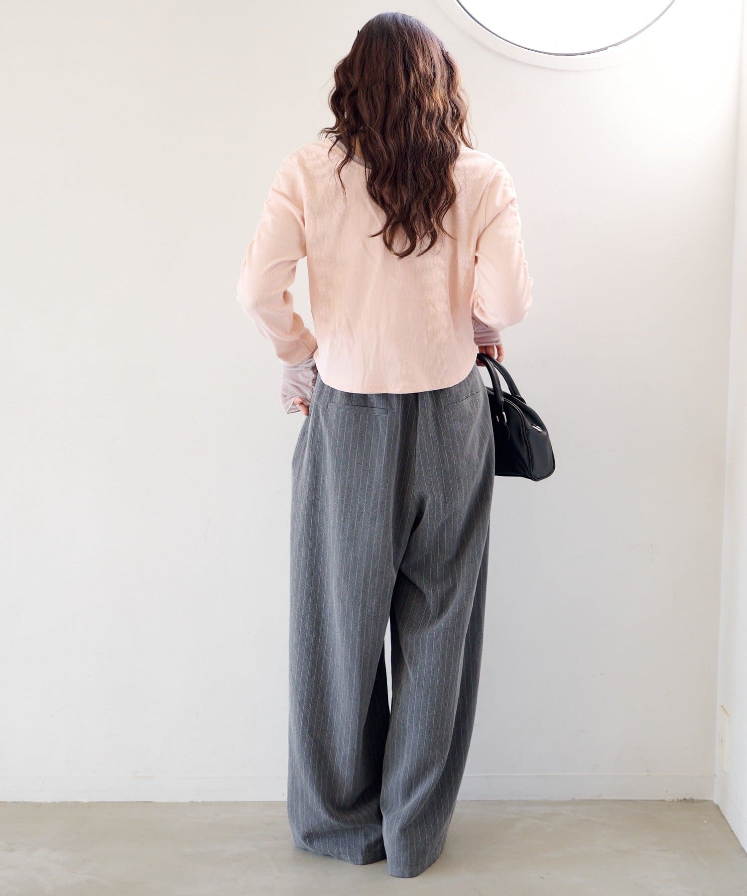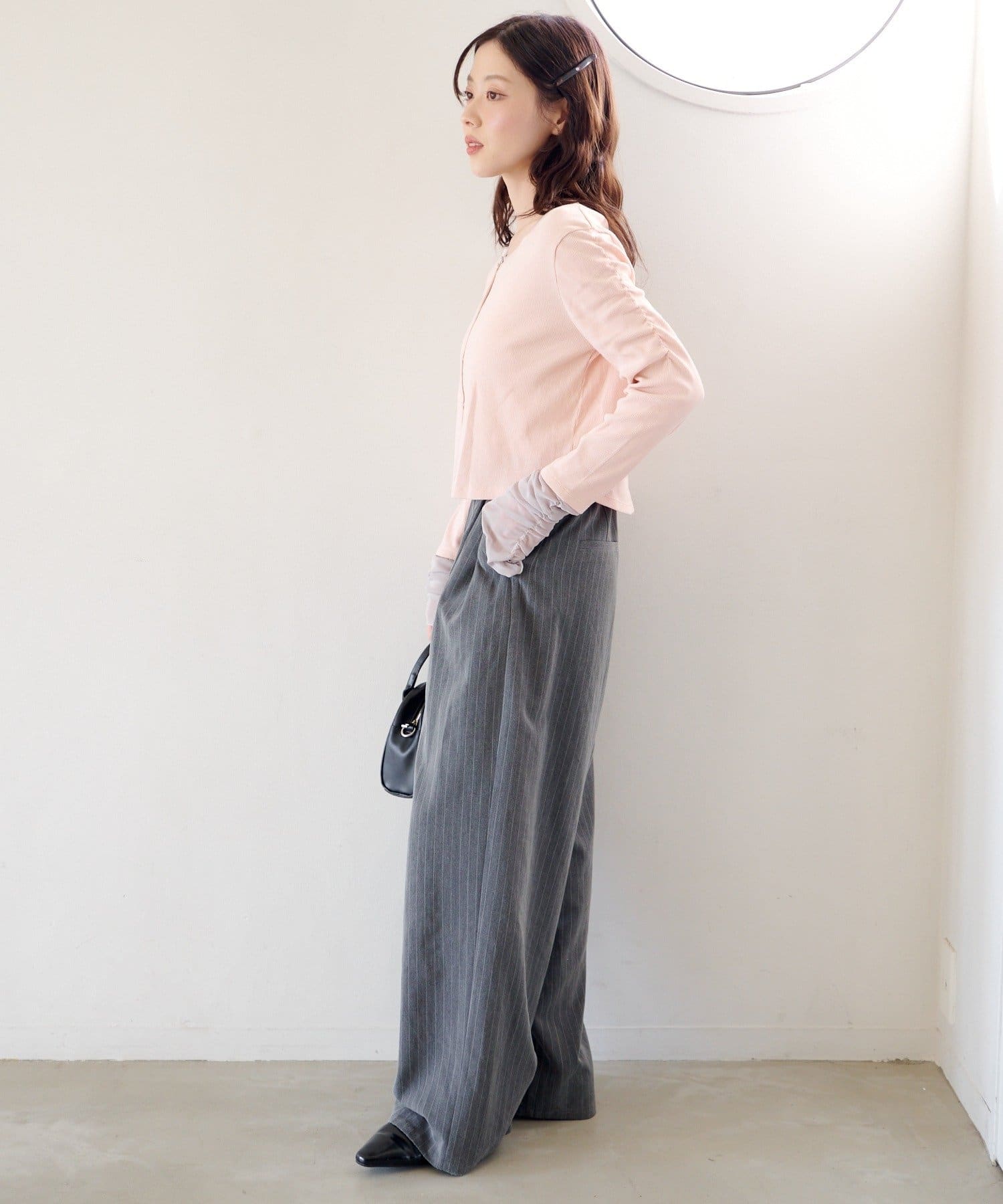 異素材袖がポイントになるので、シンプルなボトムと好相性◎。