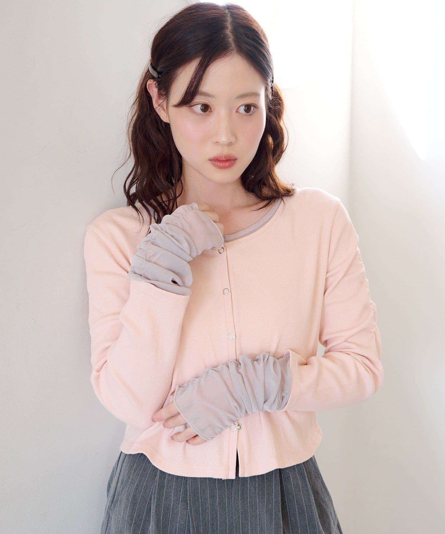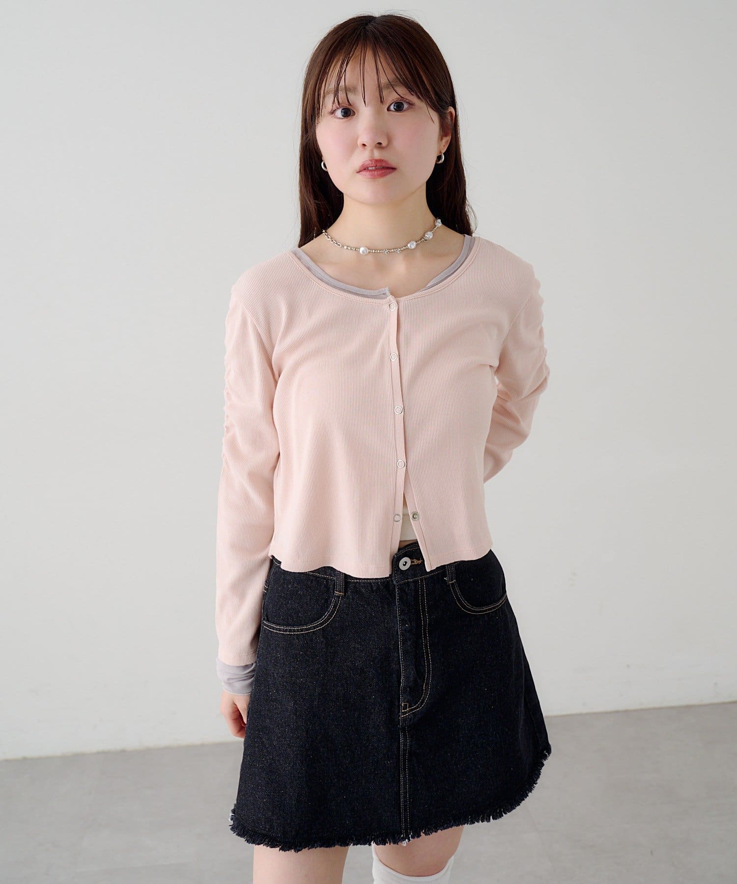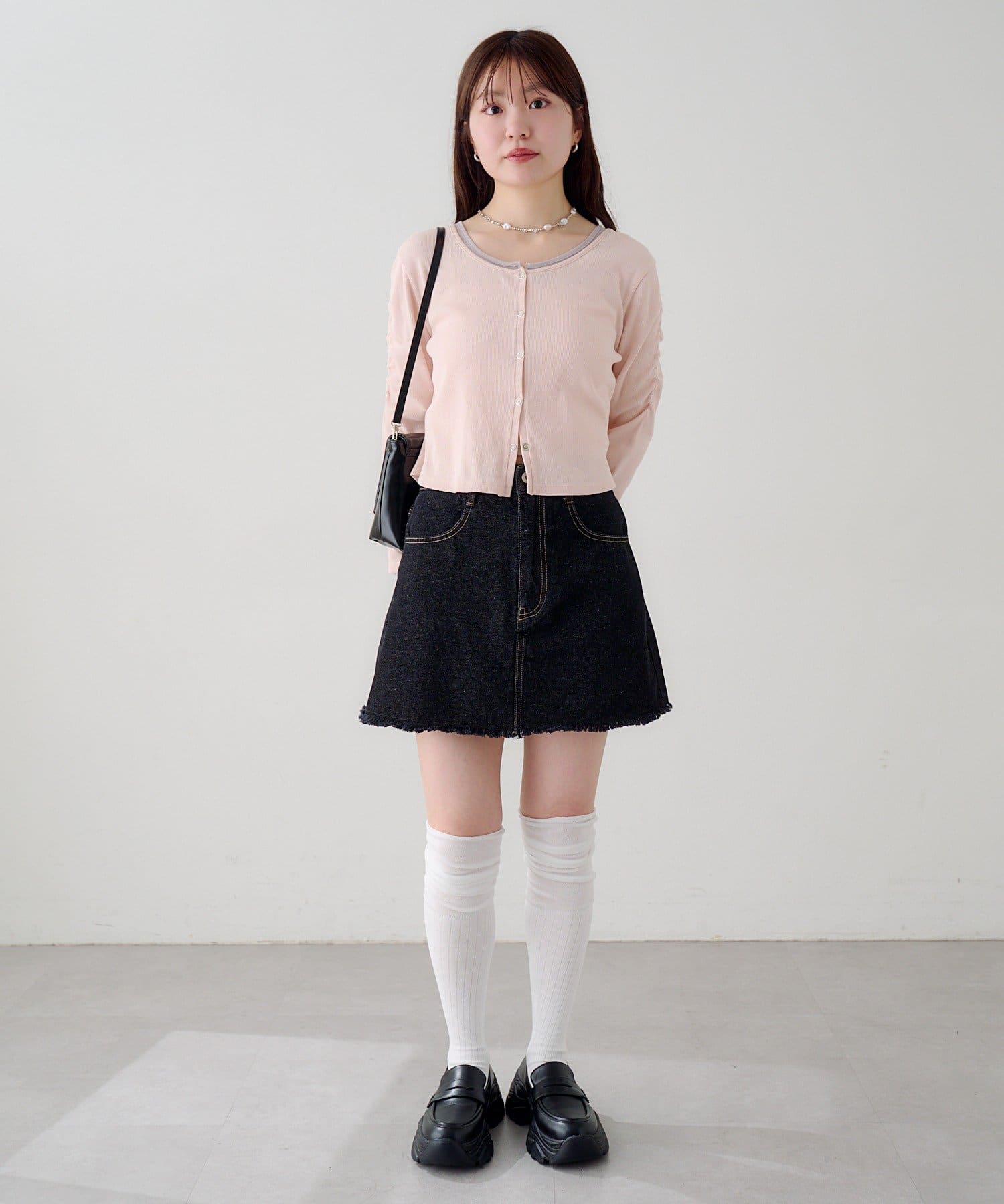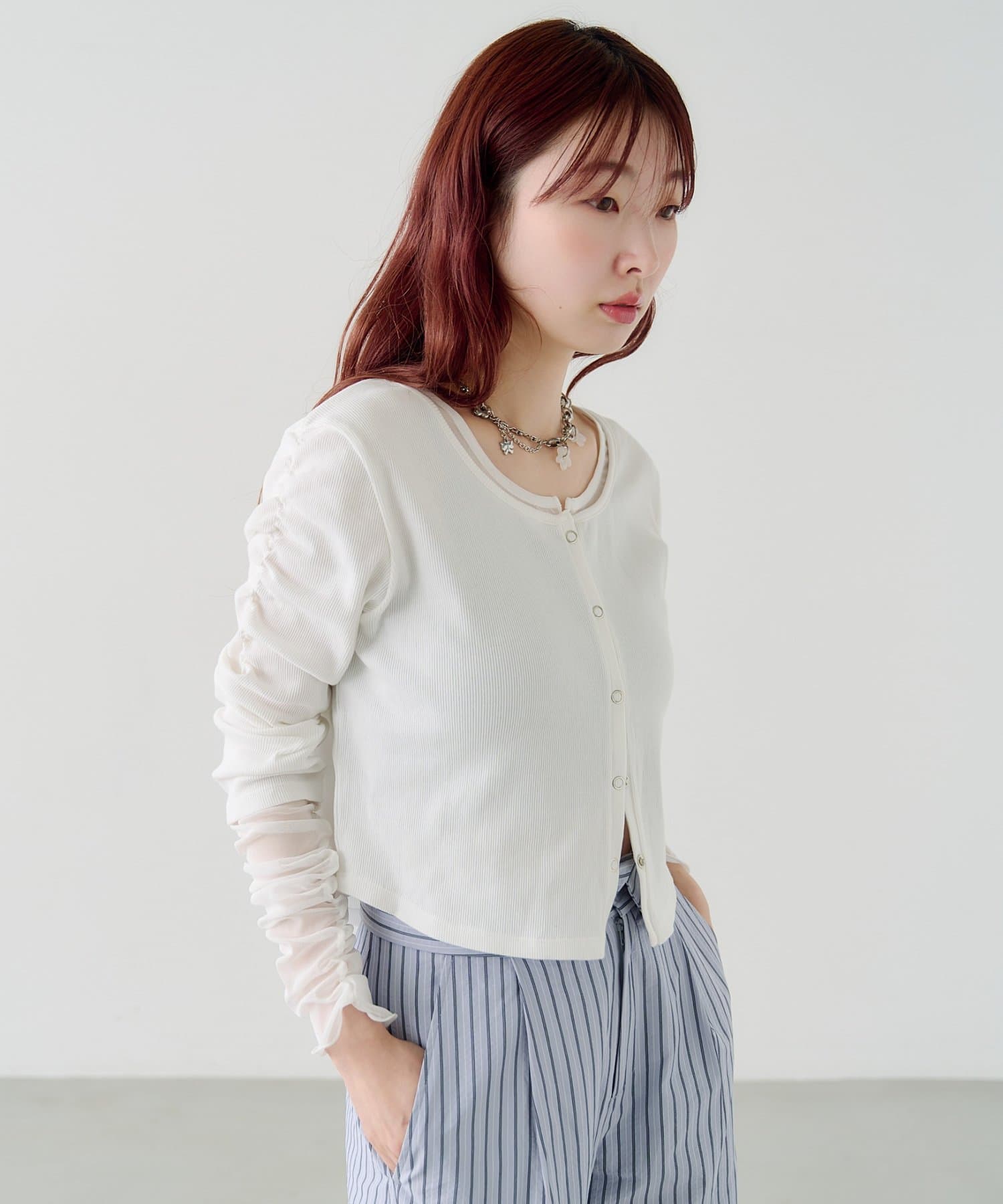 異素材袖がポイントになるので、シンプルなボトムと好相性◎。