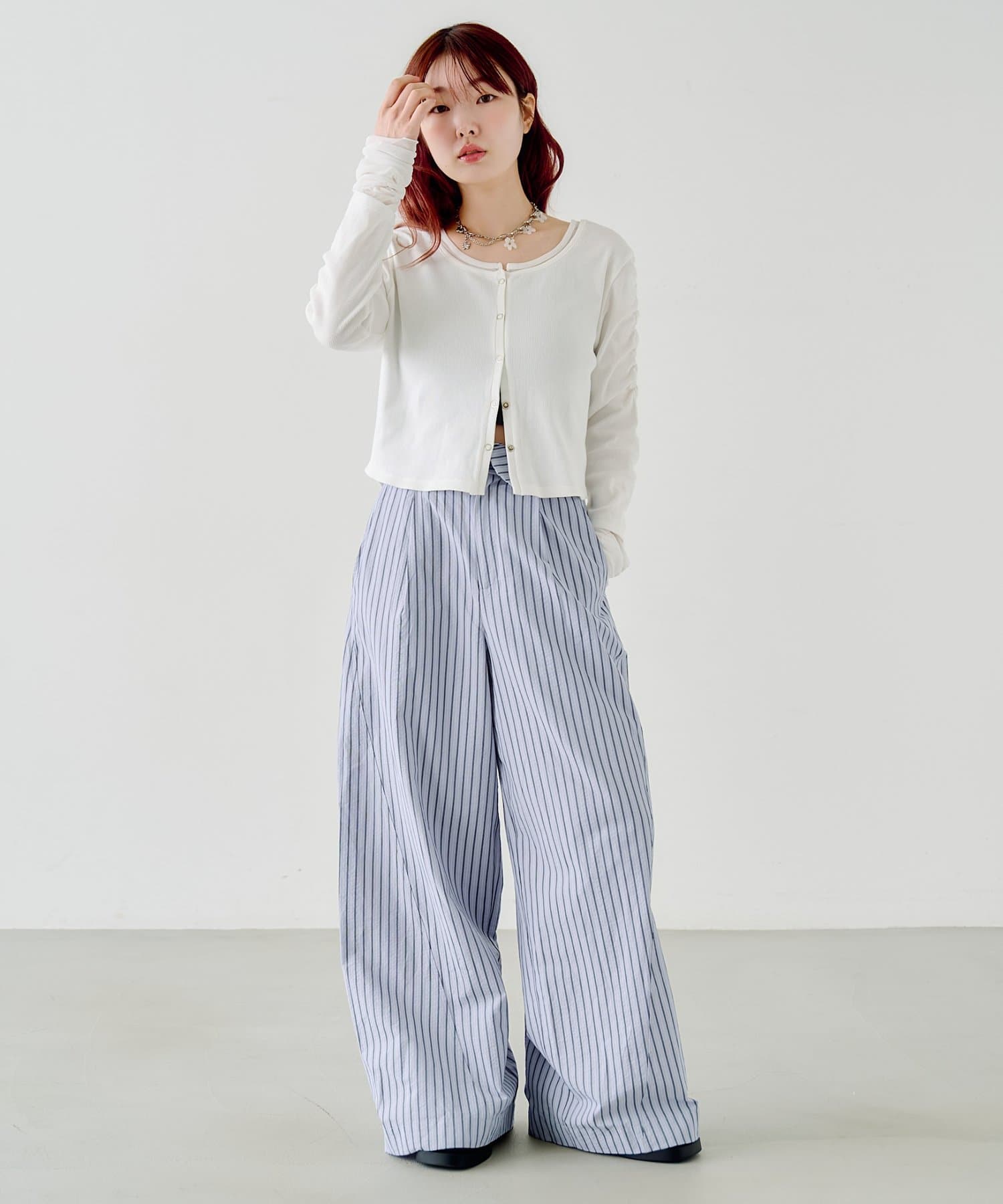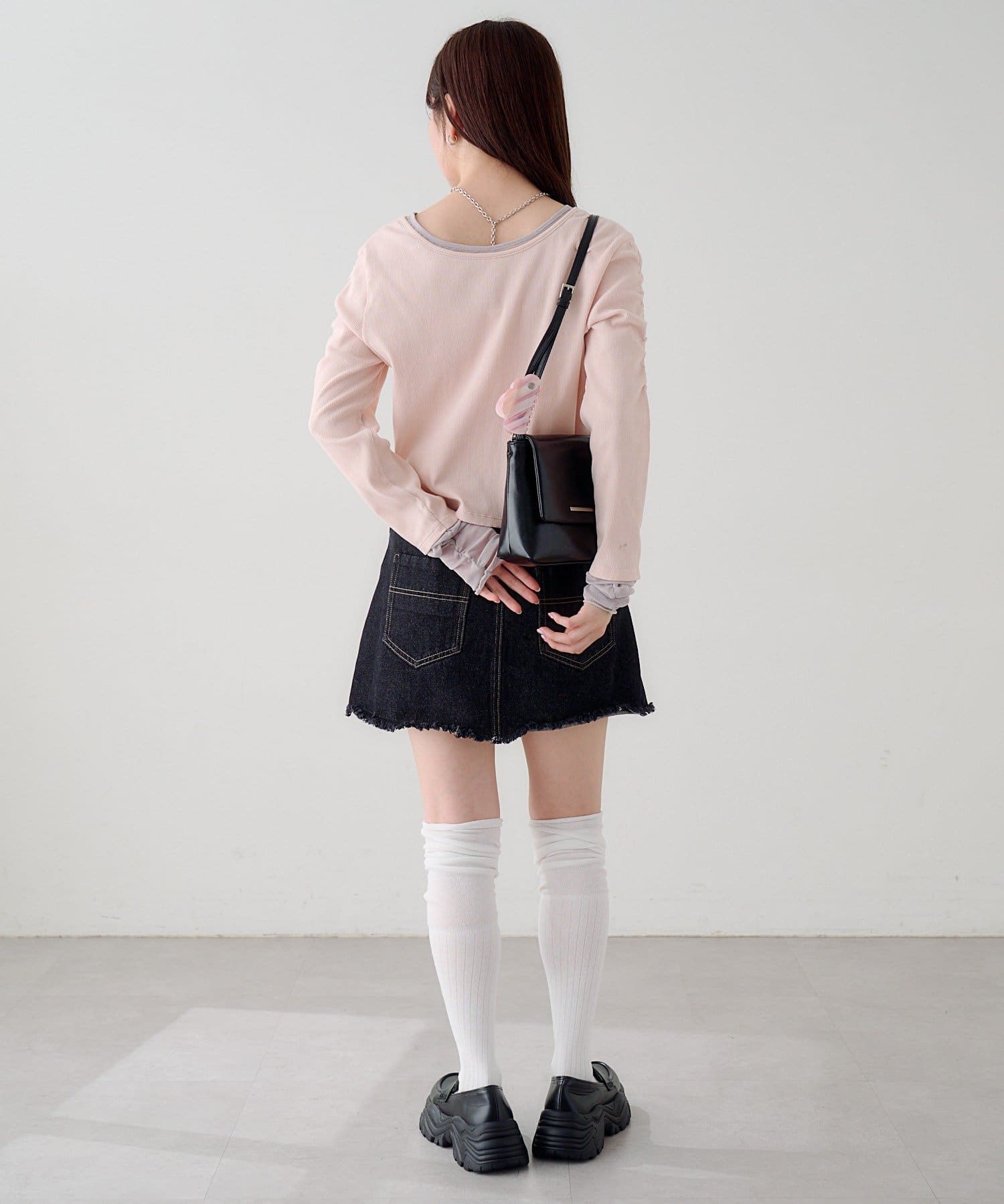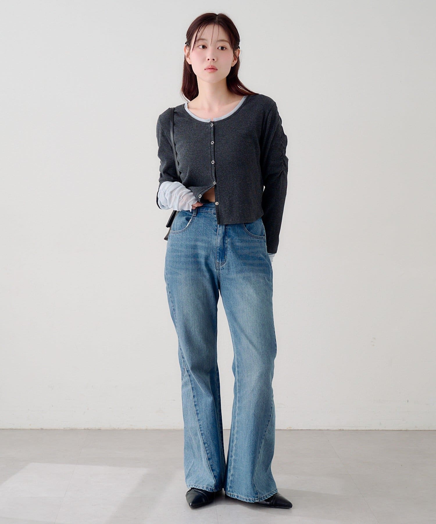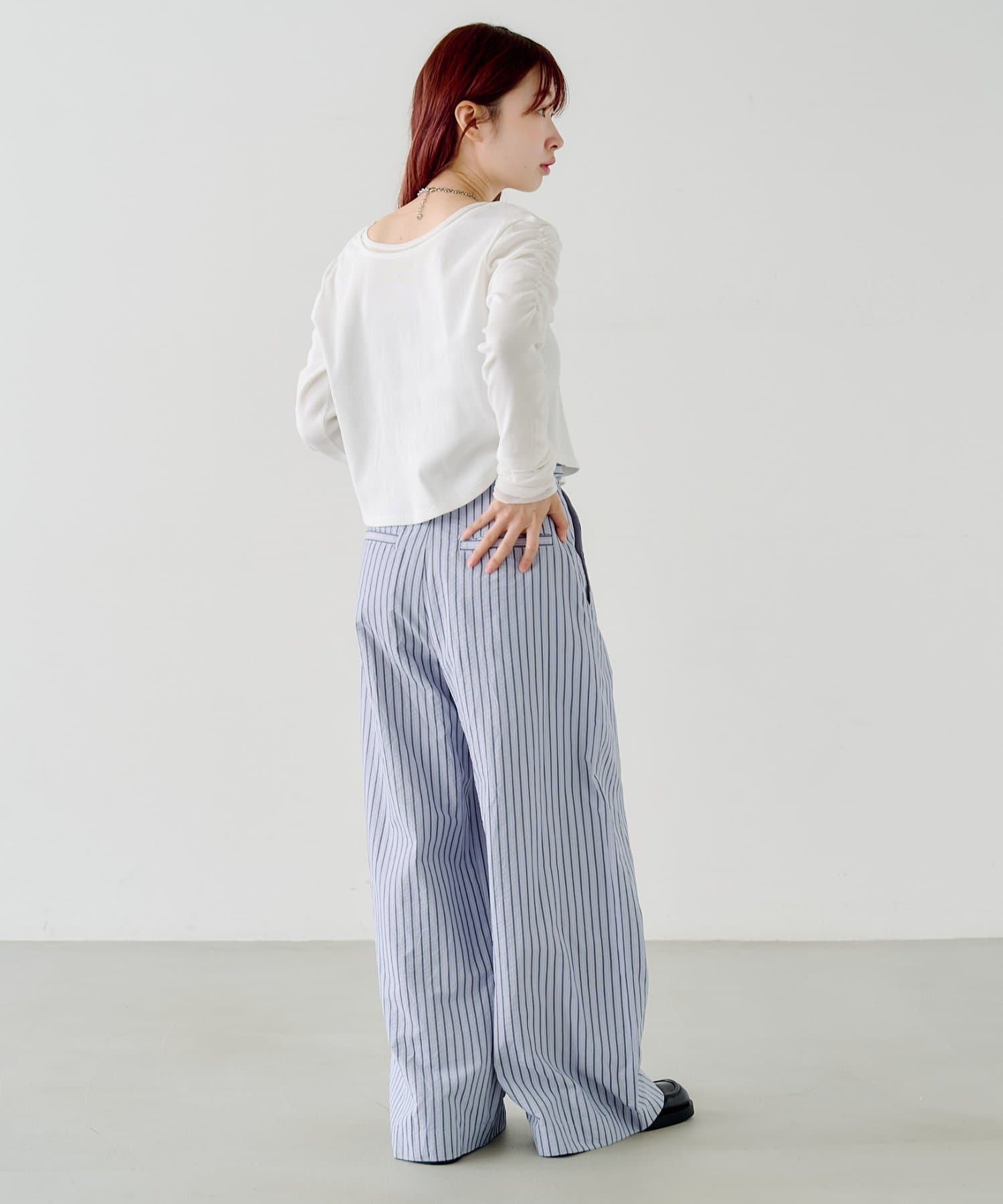 異素材袖がポイントになるので、シンプルなボトムと好相性◎。