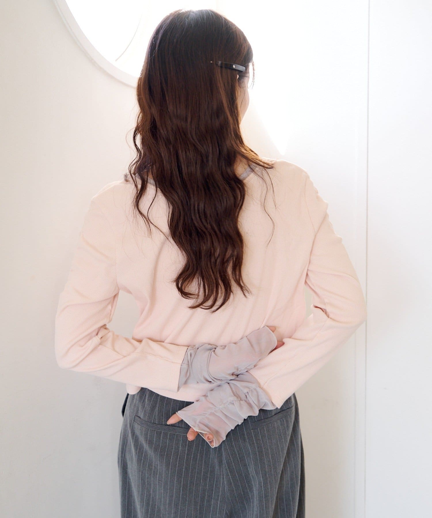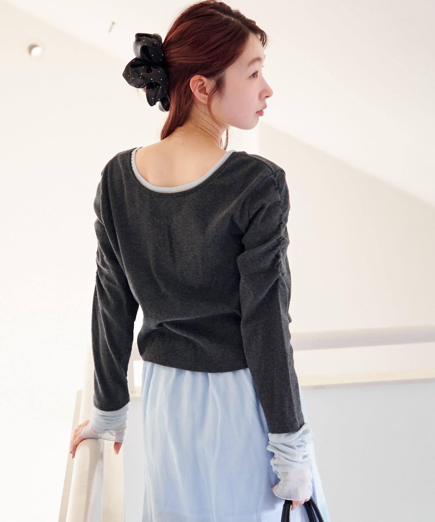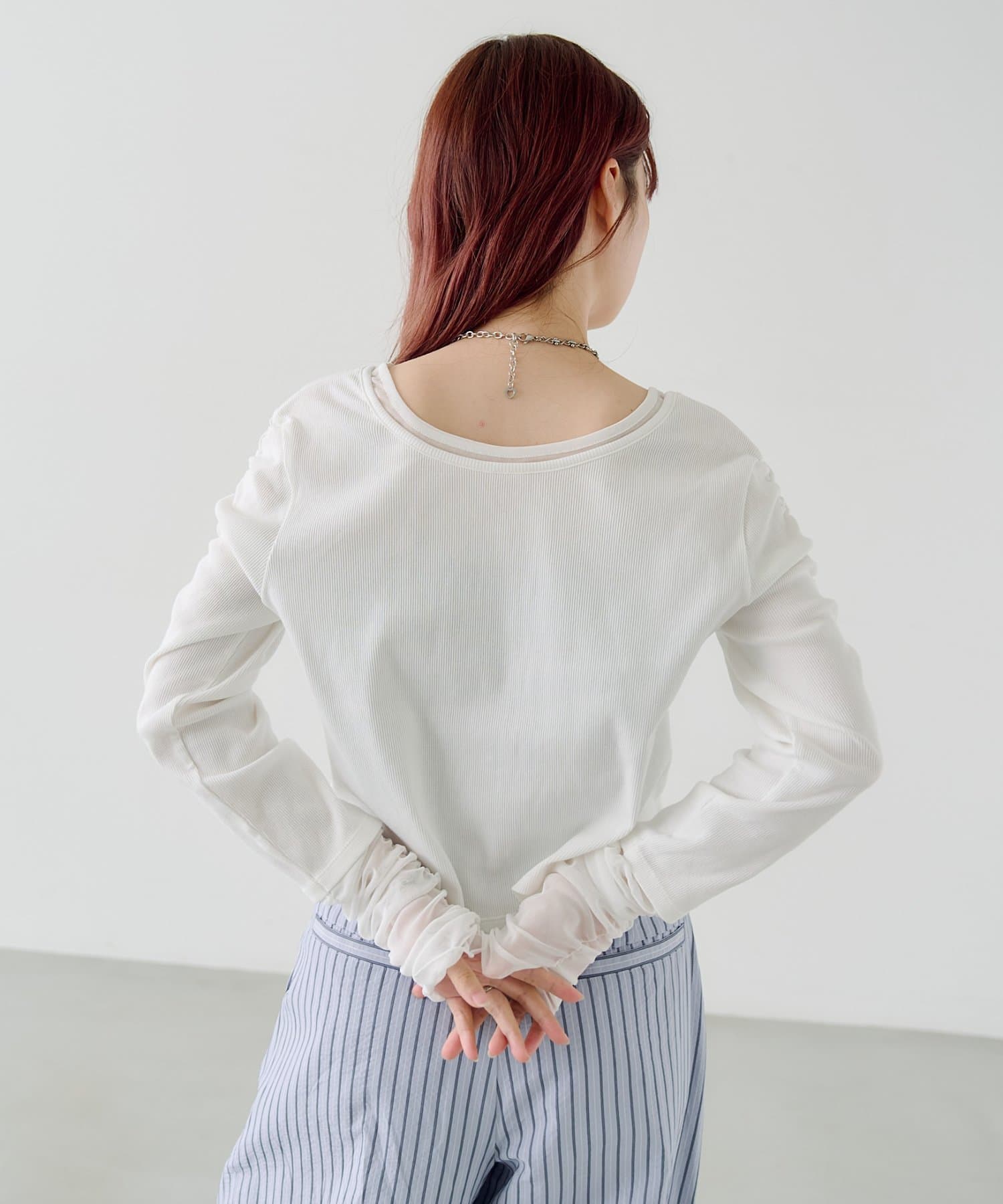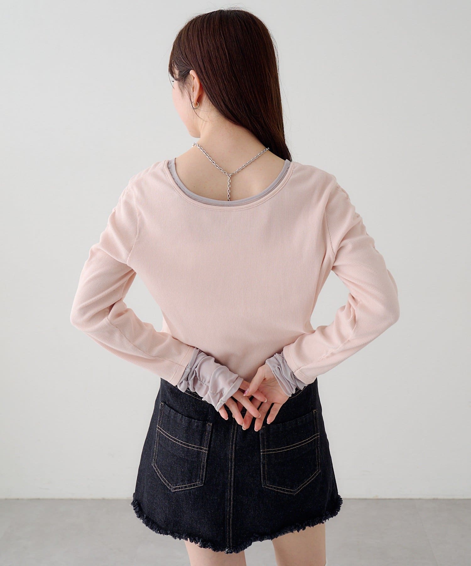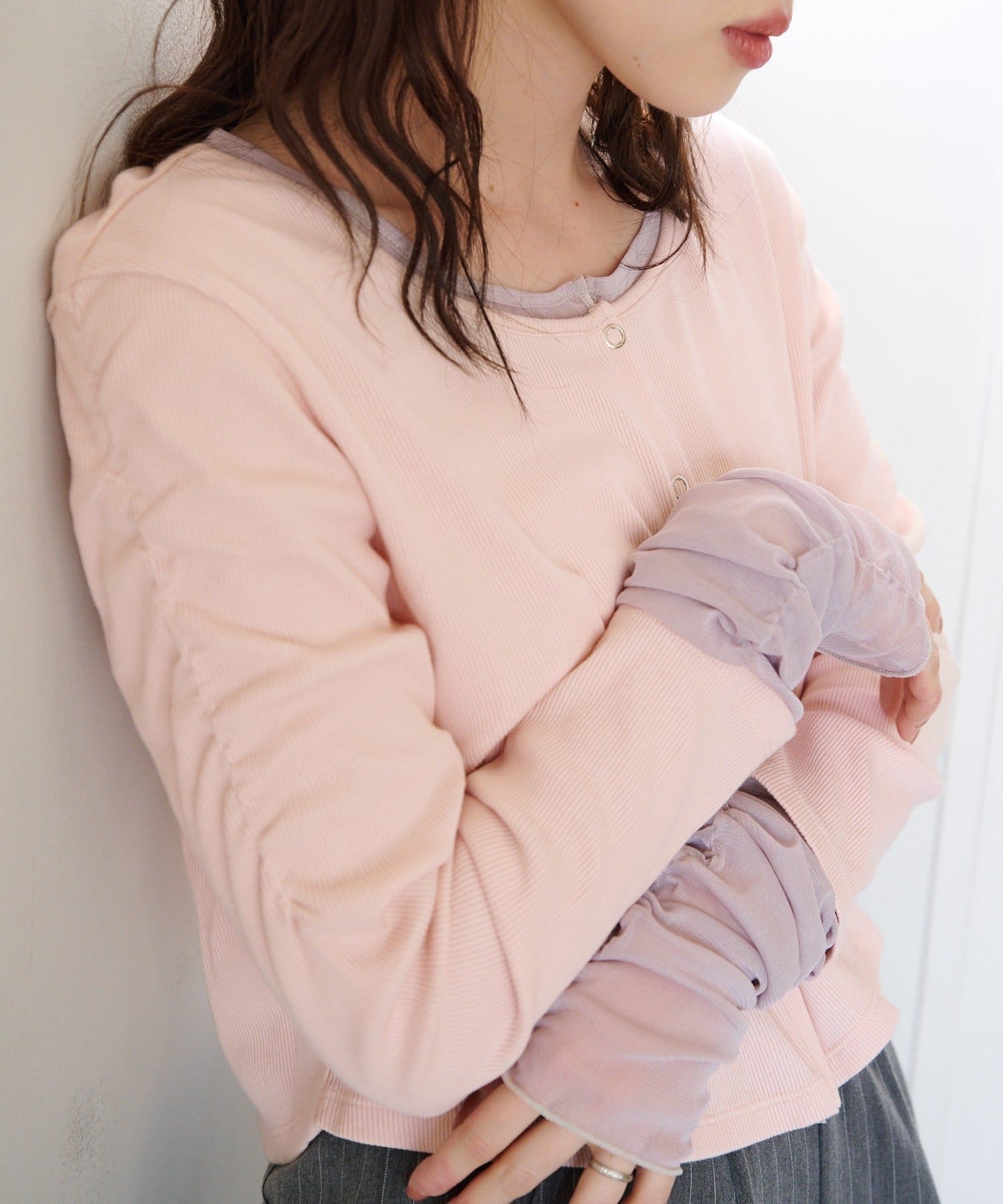 伸縮性のあるテレコ生地をベースに、袖先にはチュール素材をドッキング。