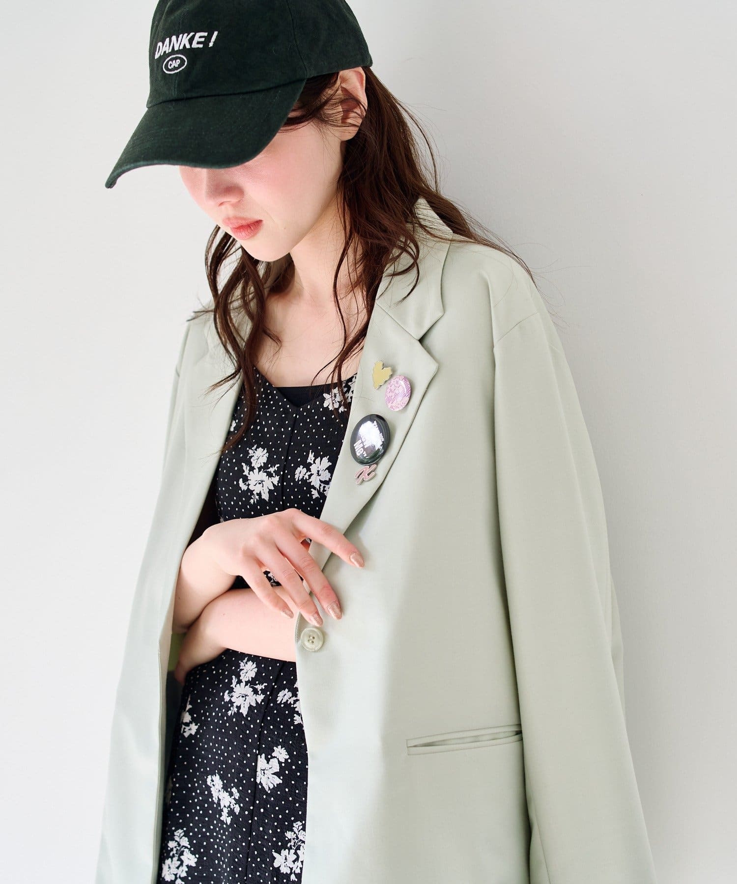 胸元のバッジデザインがアクセントになるテーラードジャケット。