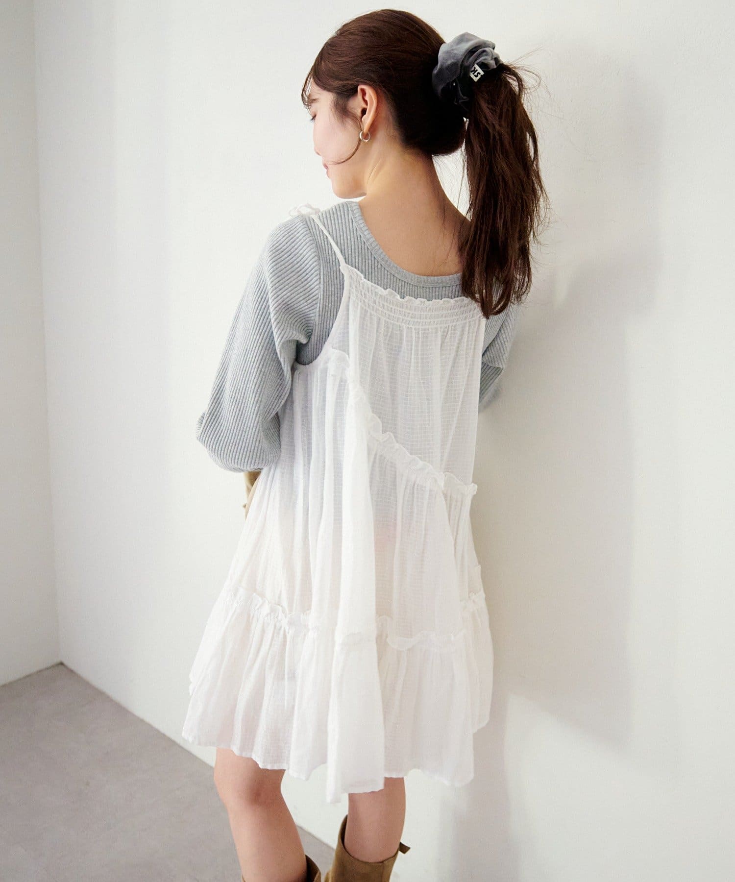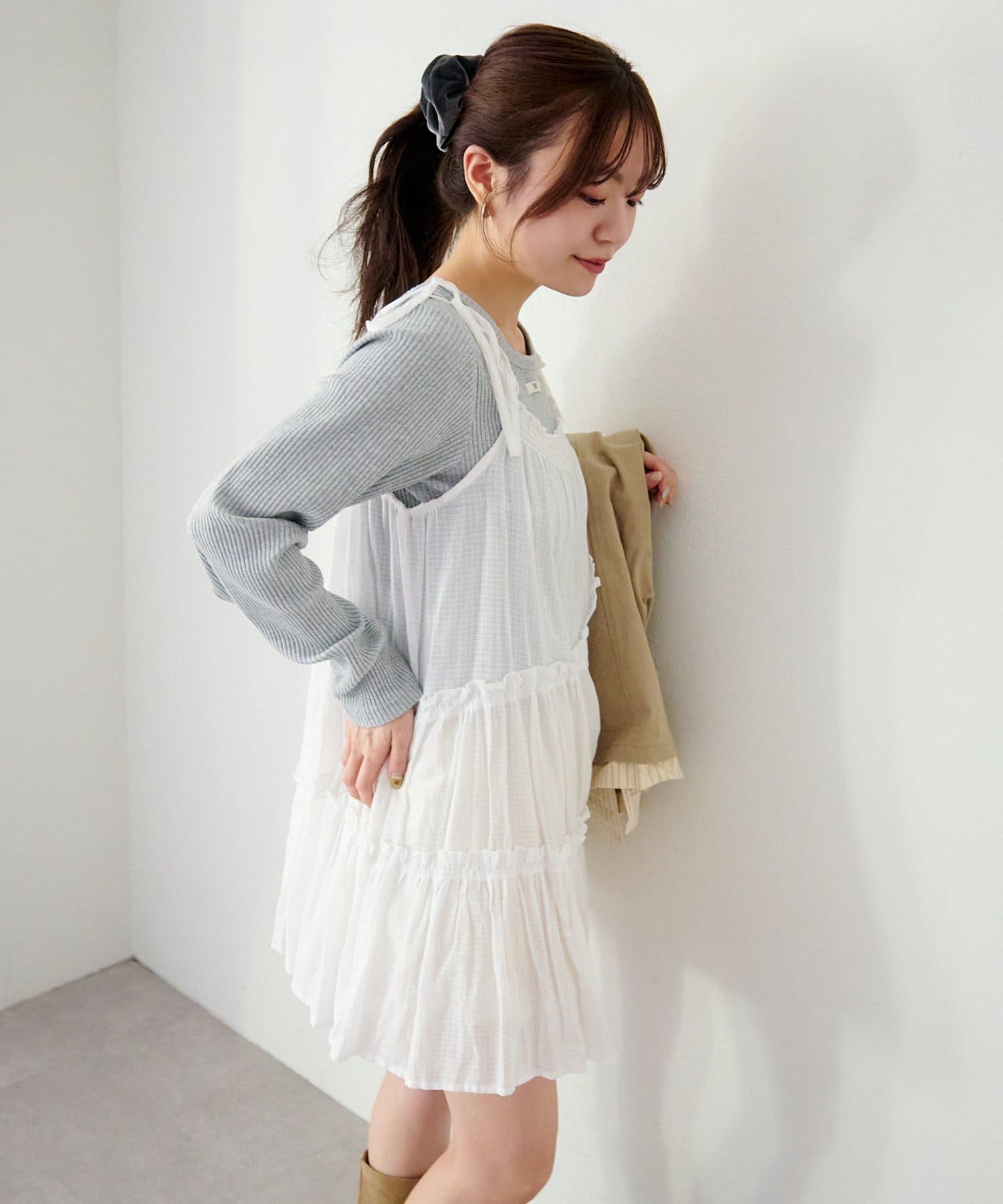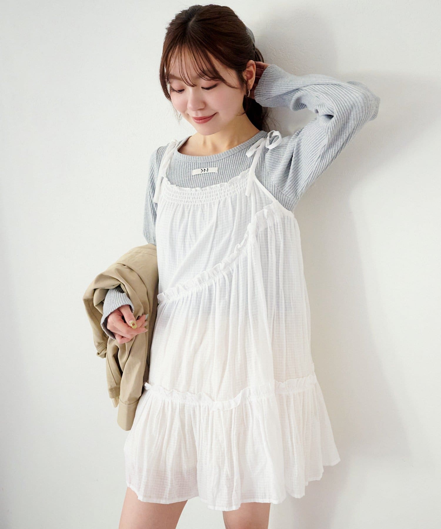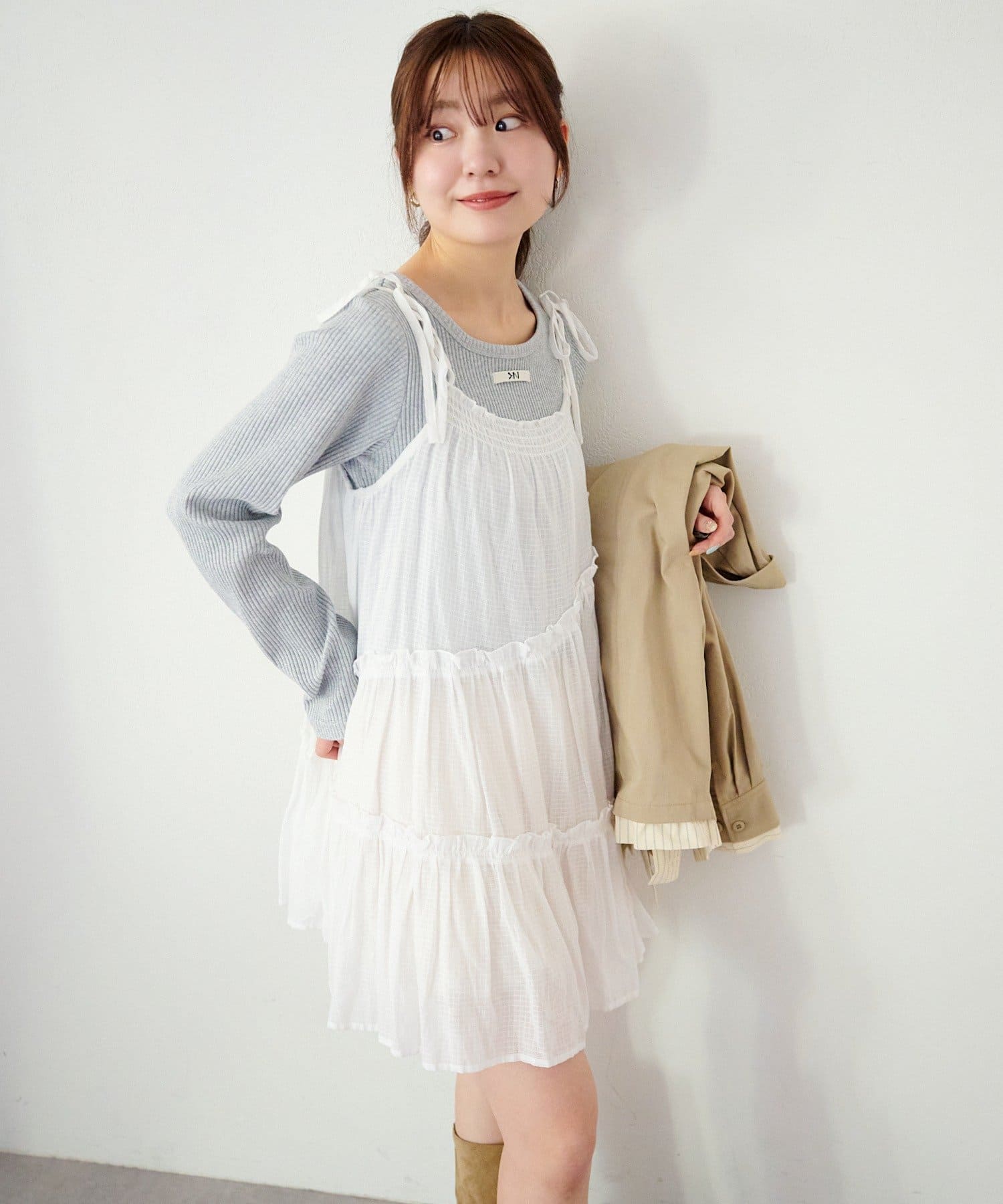 ティアードのデザインに胸元はギャザー仕様でアクセント。