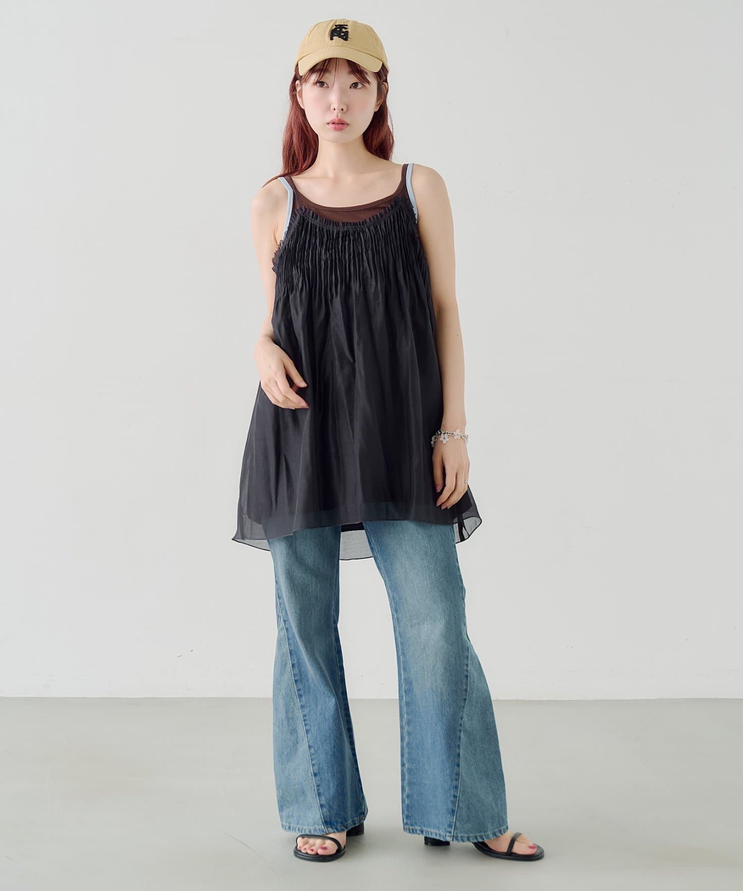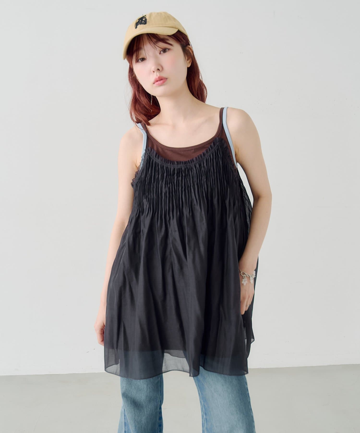 タンクトップやキャミソールと合わせたレイヤードスタイルがおすすめ。