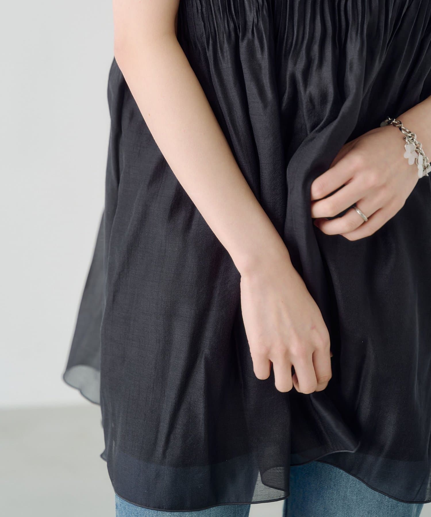 胸元にはギャザーを寄せ、ふんわりと広がるシルエットが女性らしい軽やかな印象に。