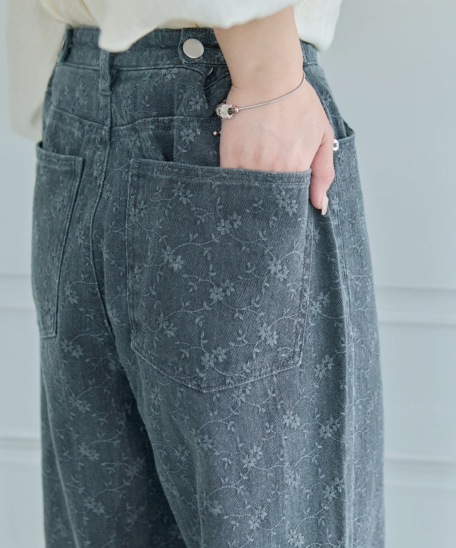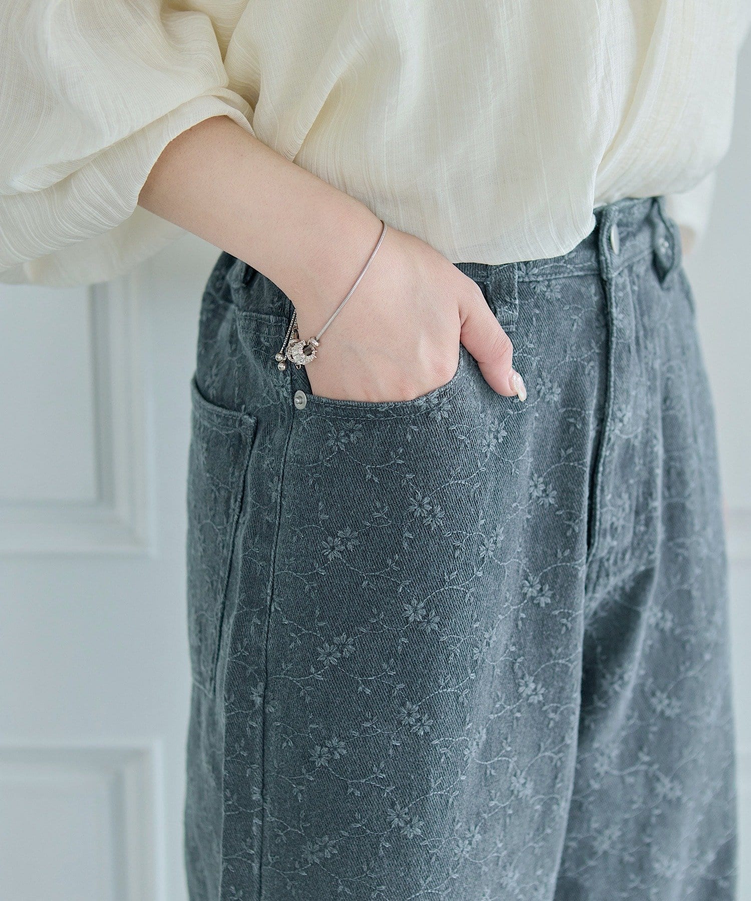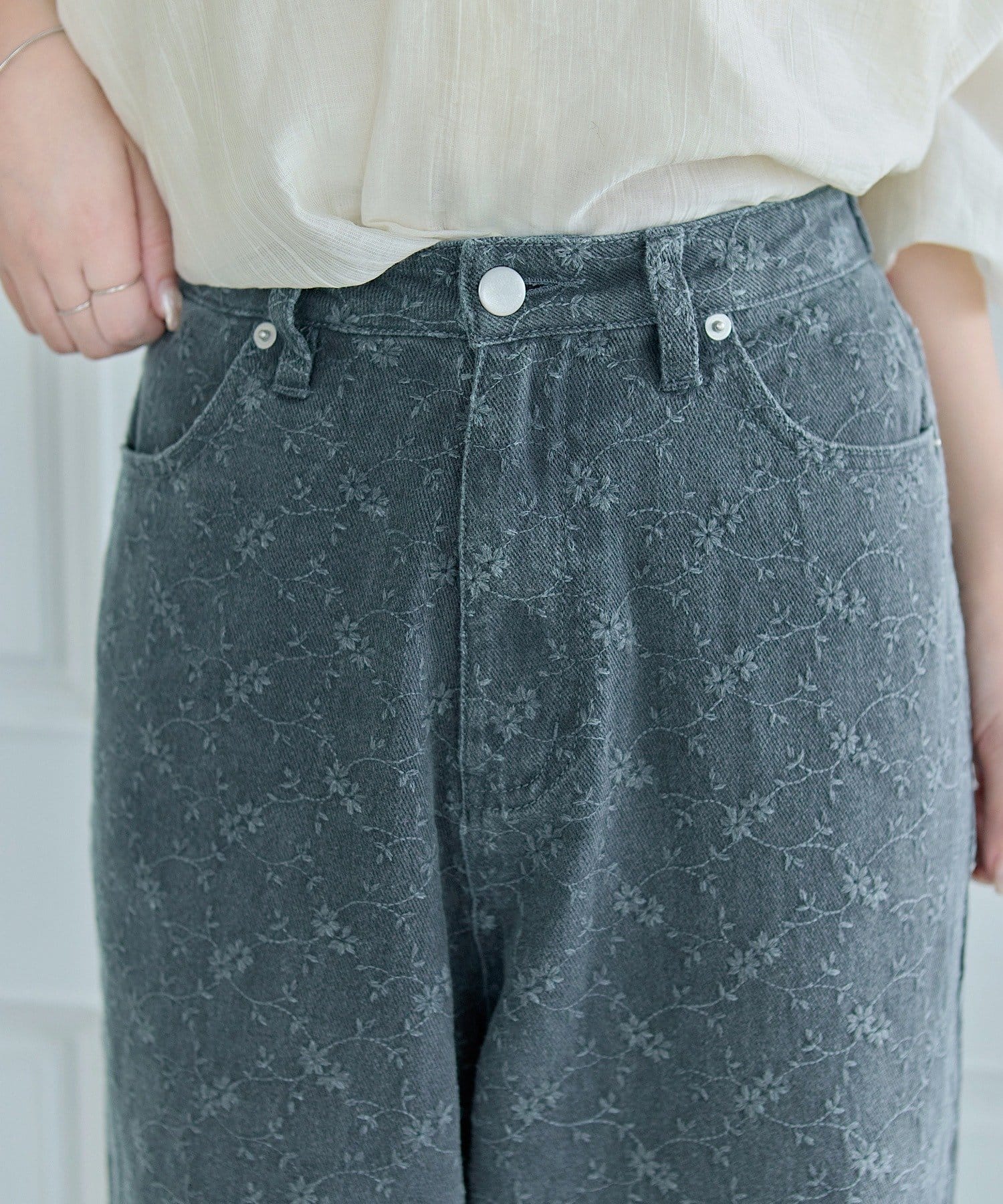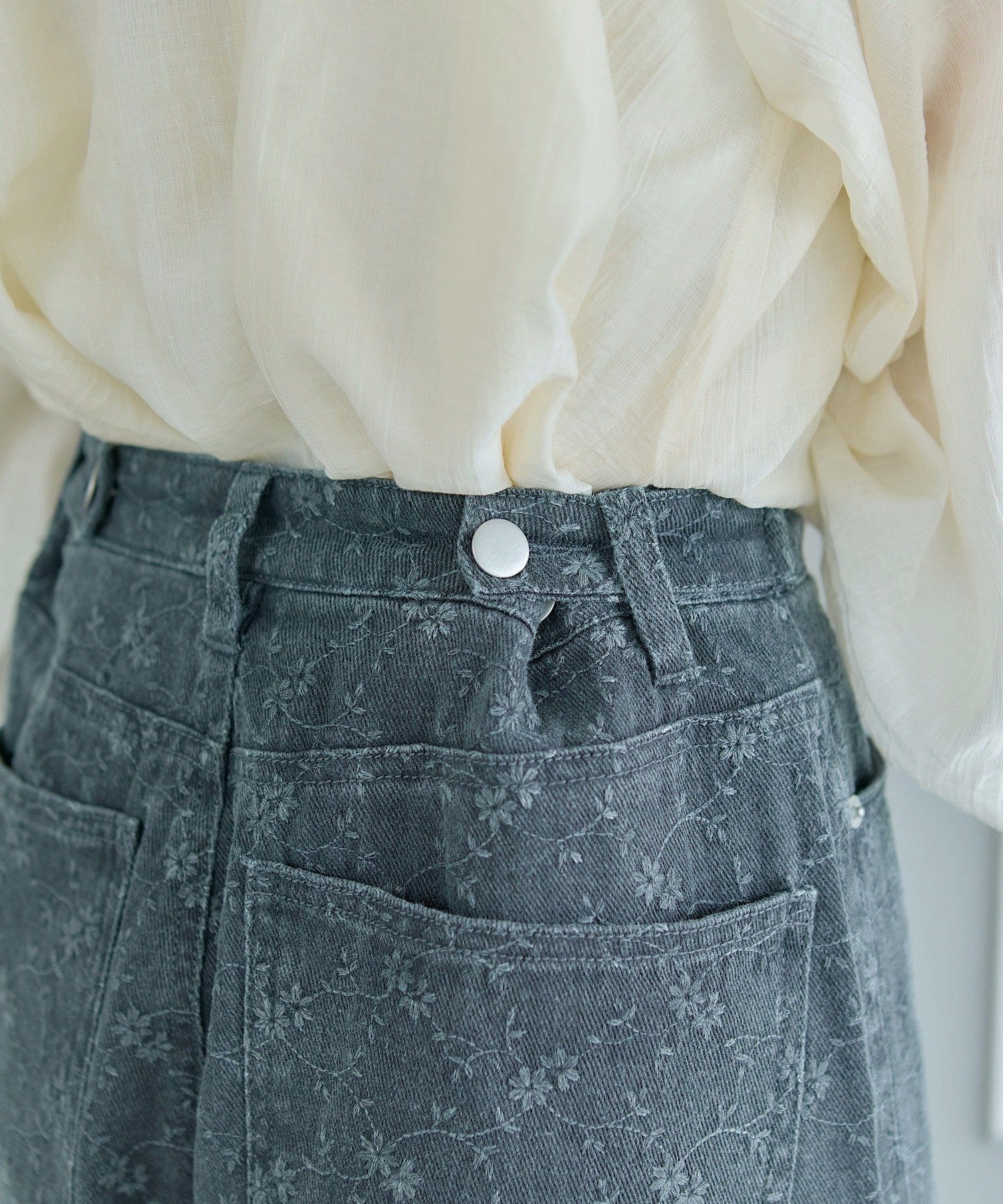 【2サイズ展開/低身長サイズ】ワイドフラワーエンブロイダリーデニム