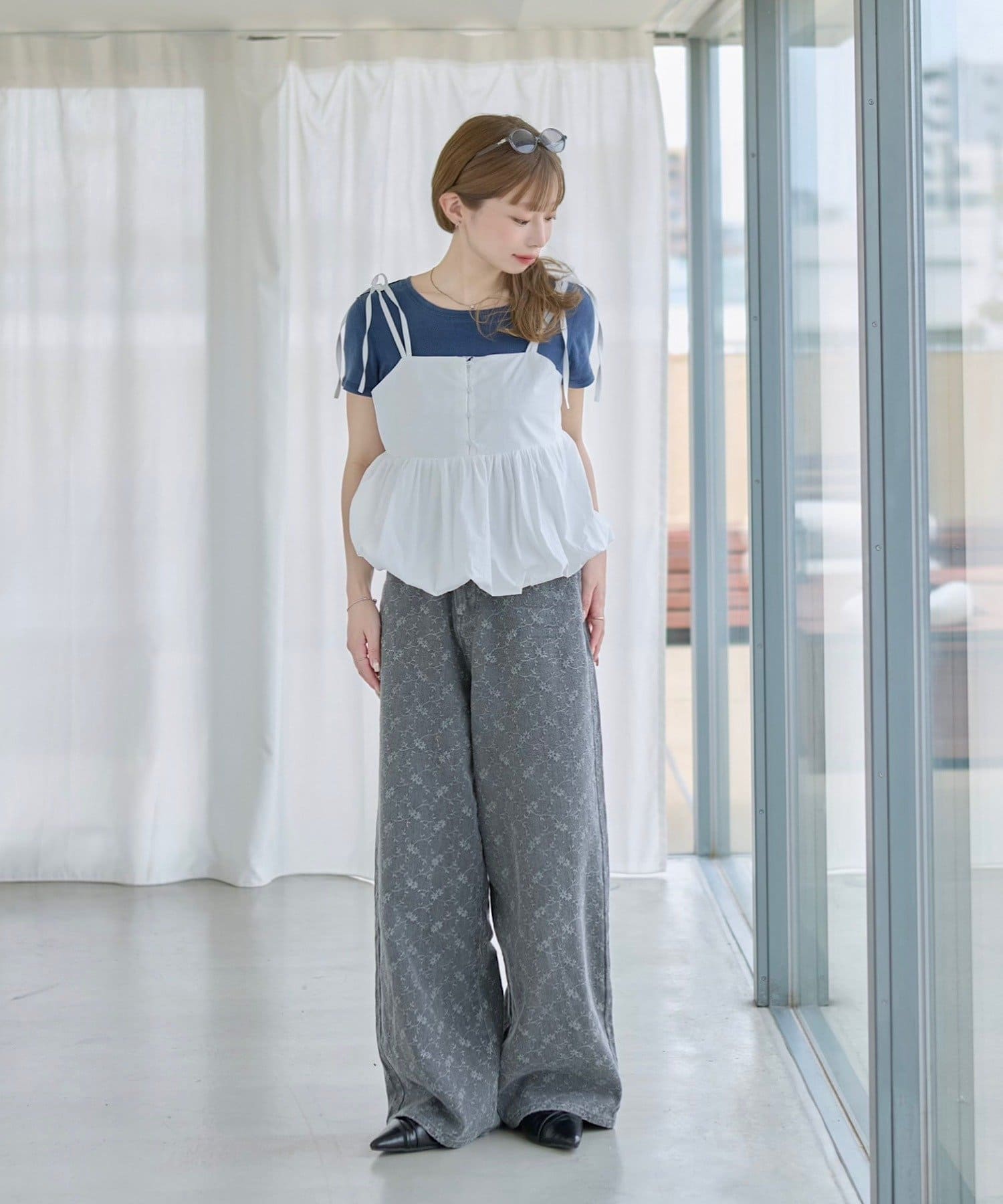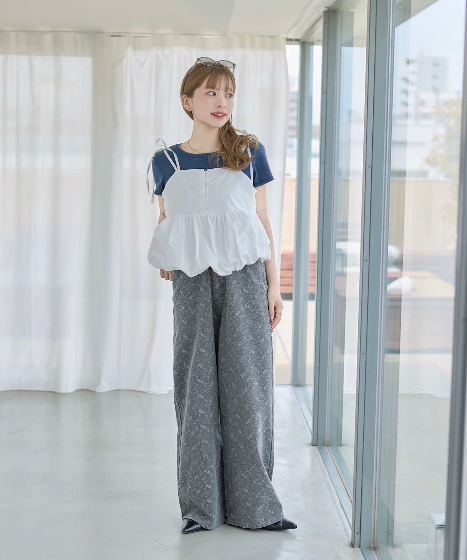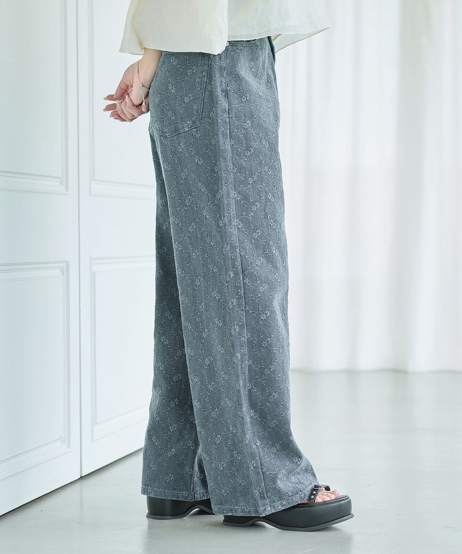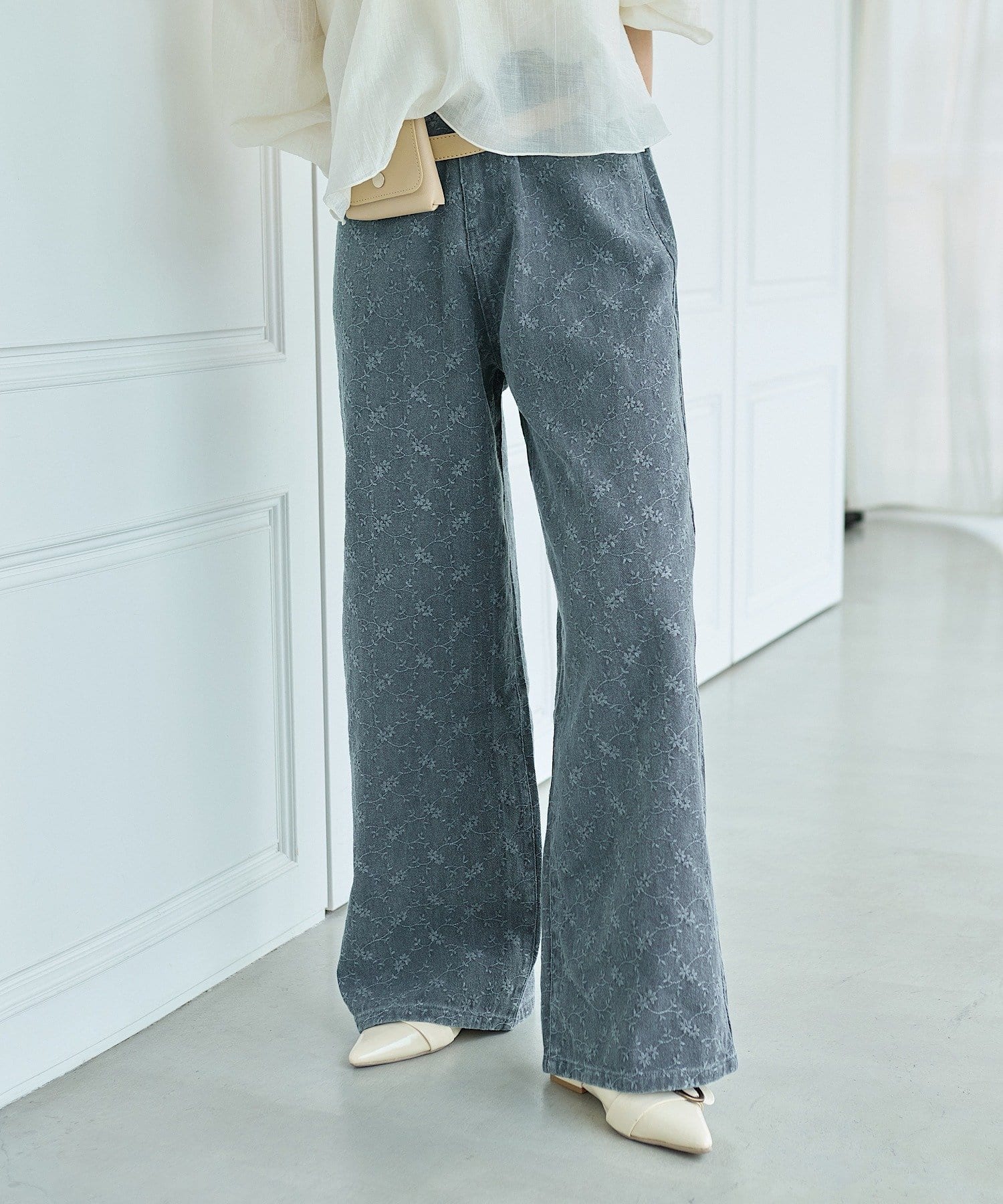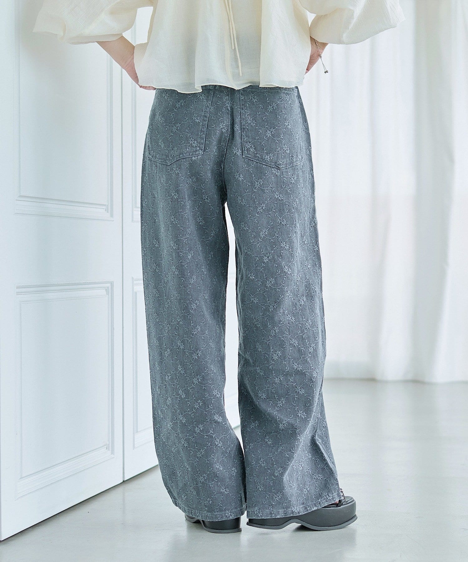 【2サイズ展開/低身長サイズ】ワイドフラワーエンブロイダリーデニム