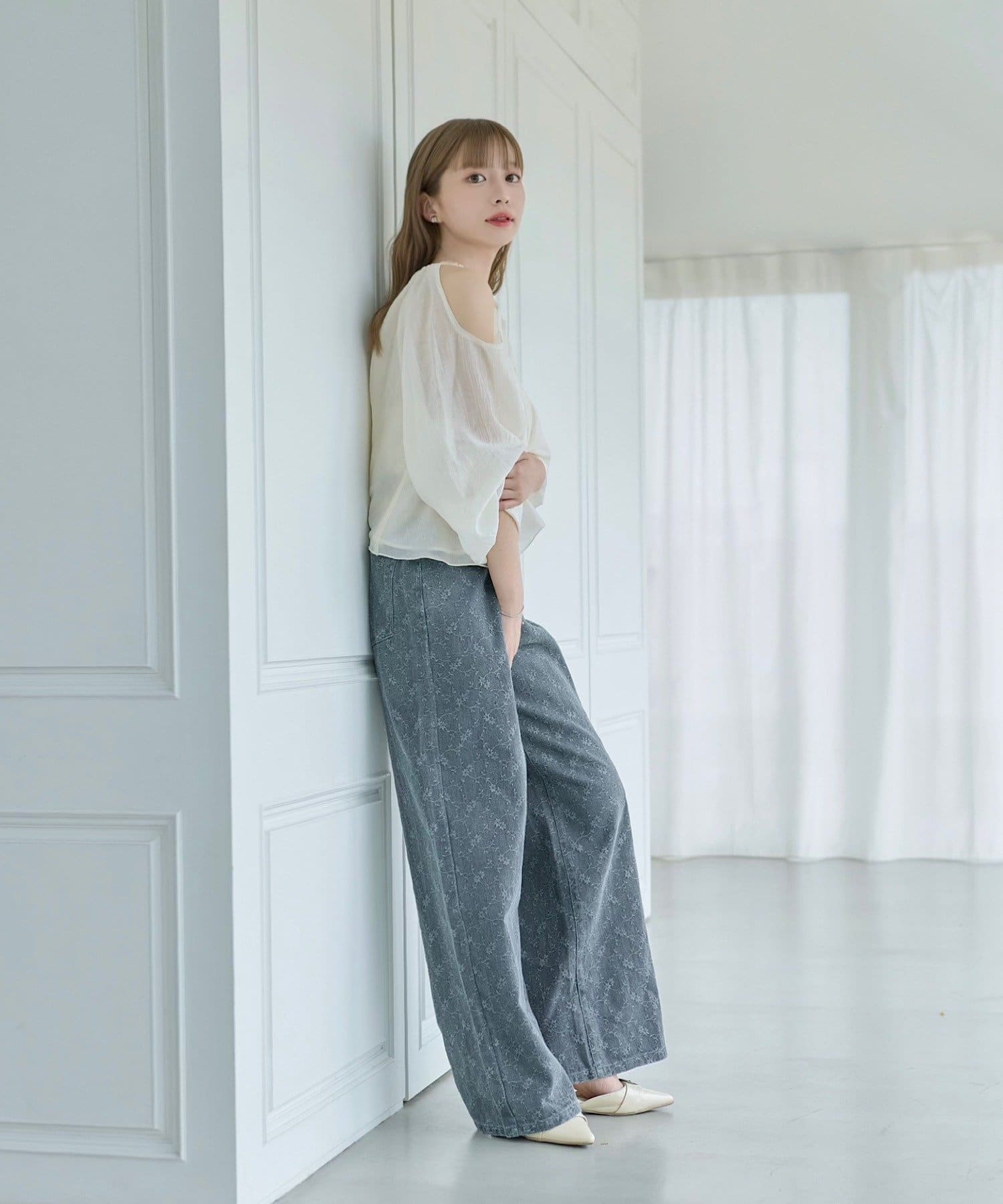 繊細なフラワープリントが大人っぽく映えるワイドパンツ。
