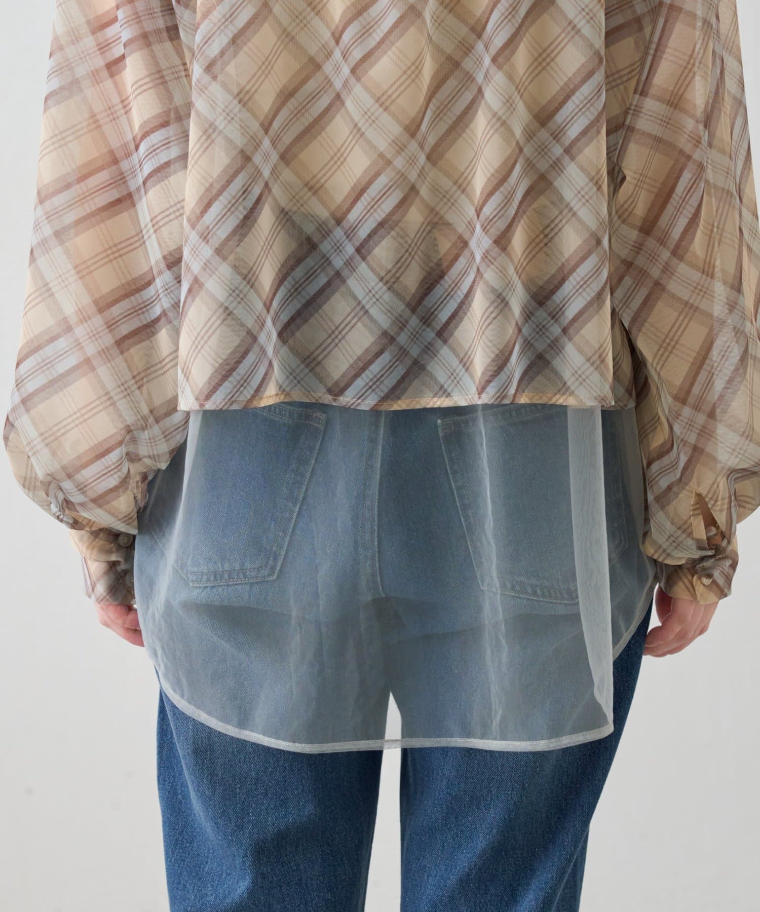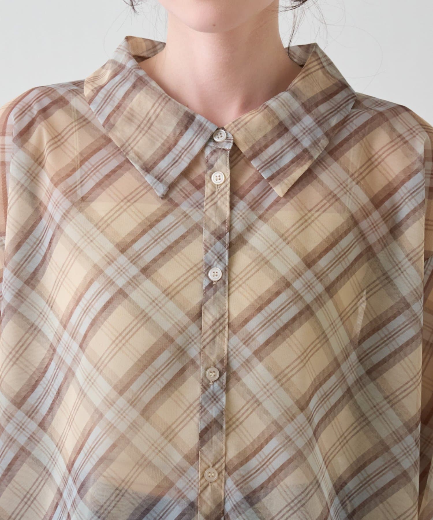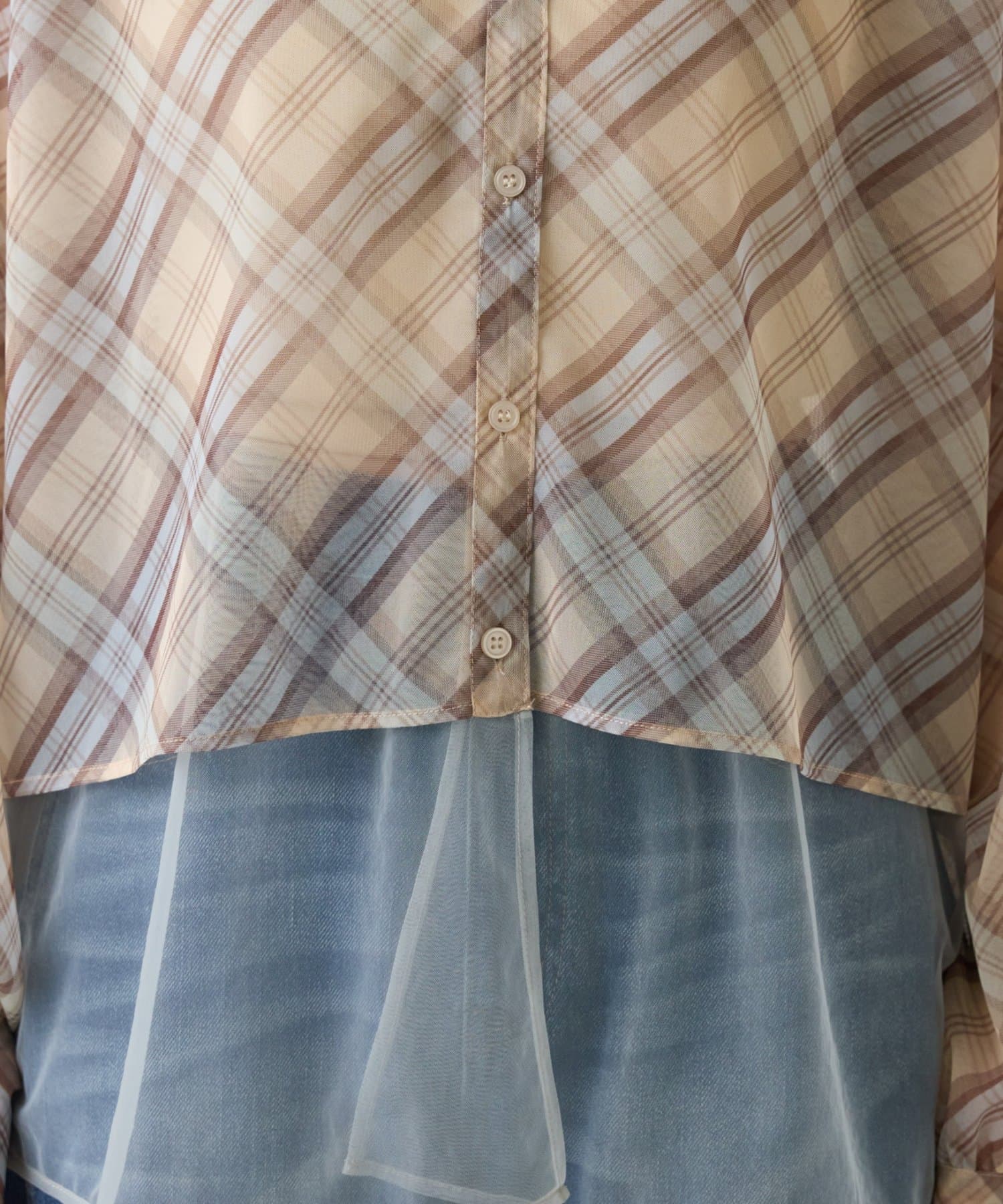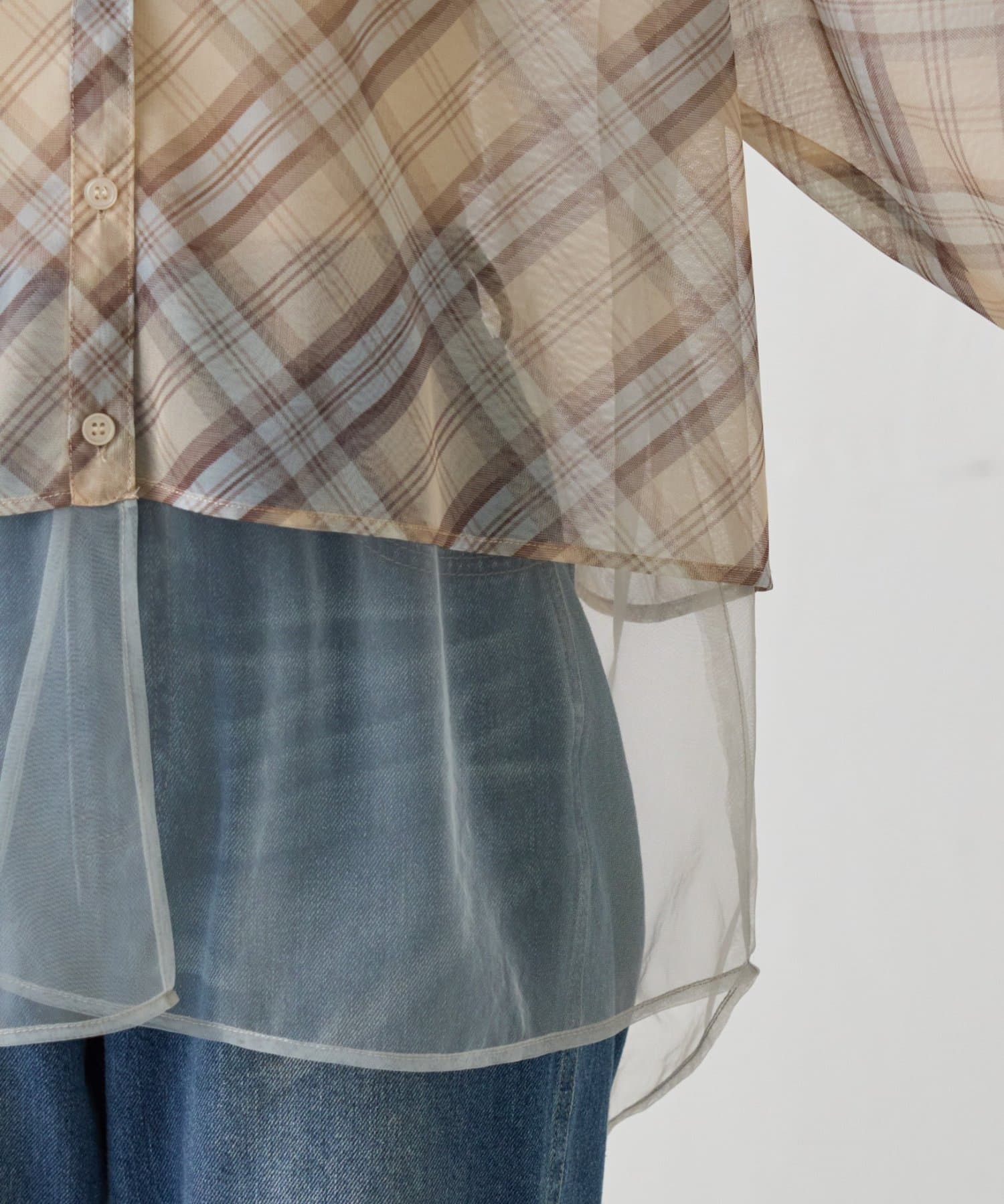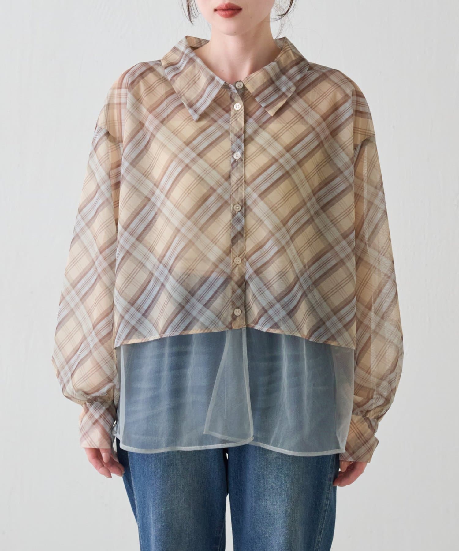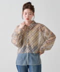 チェック柄とシアー素材を組み合わせた、レイヤード風デザインのシャツ。