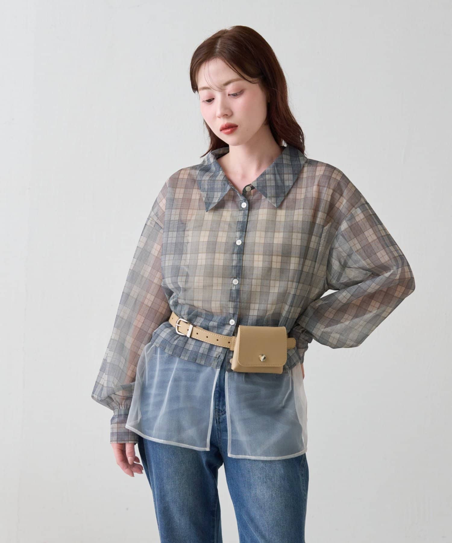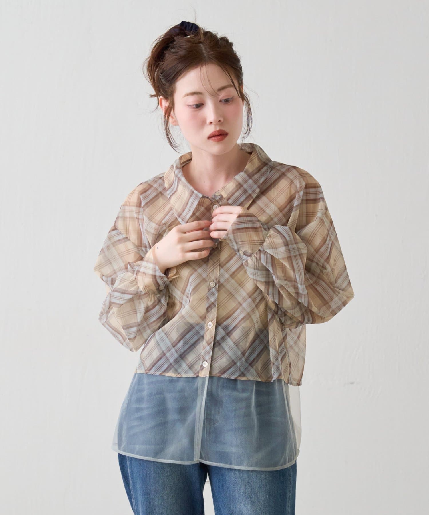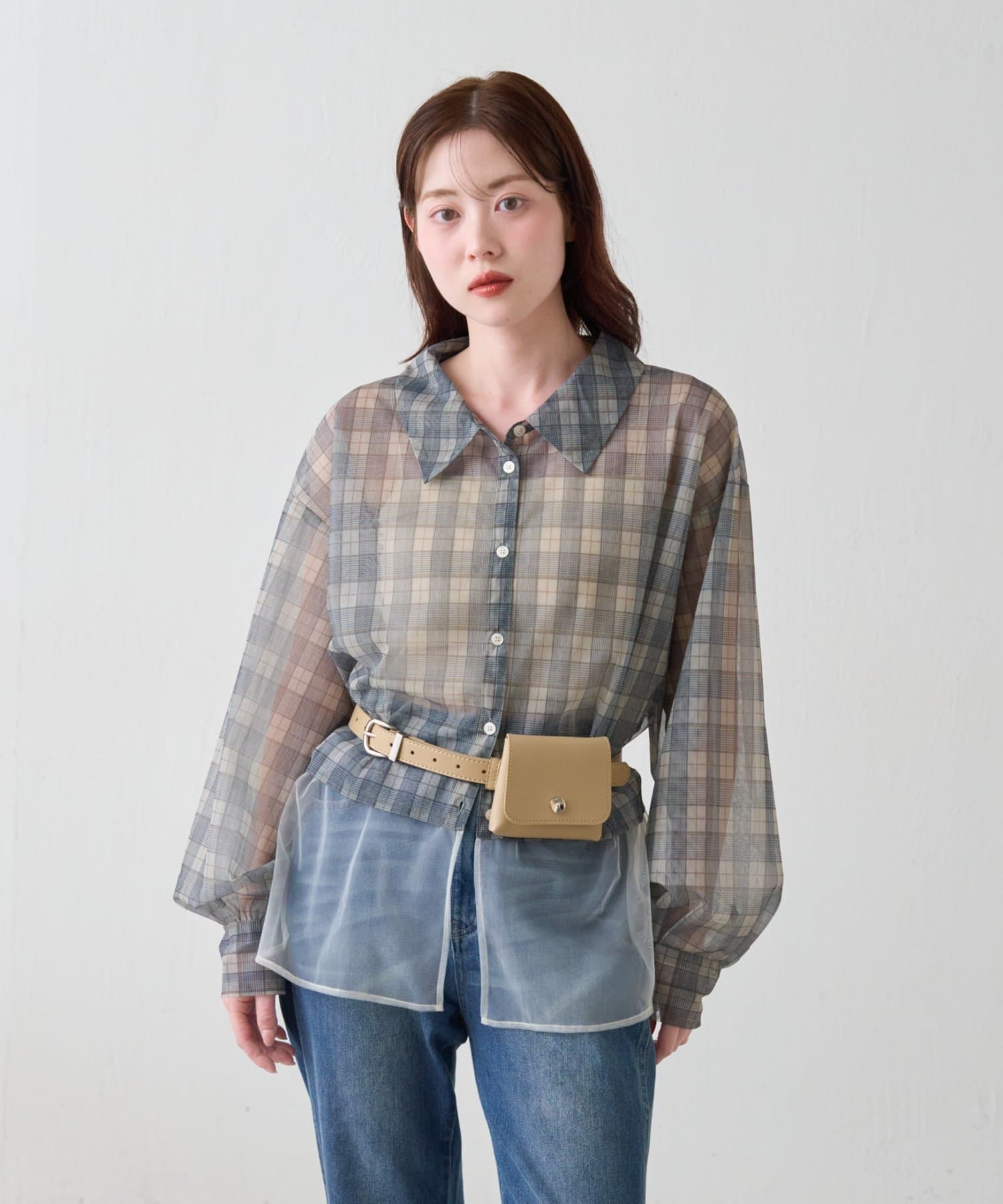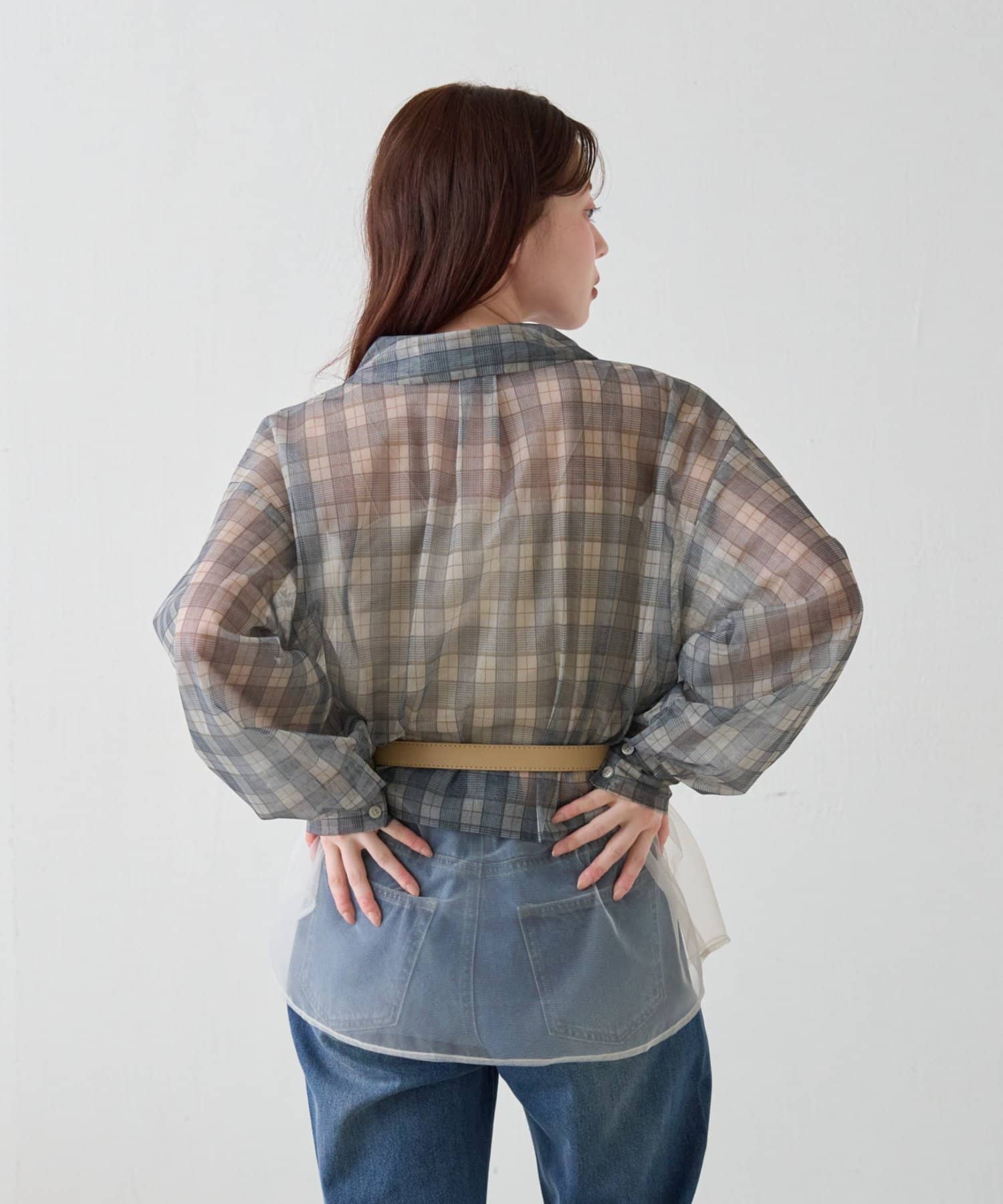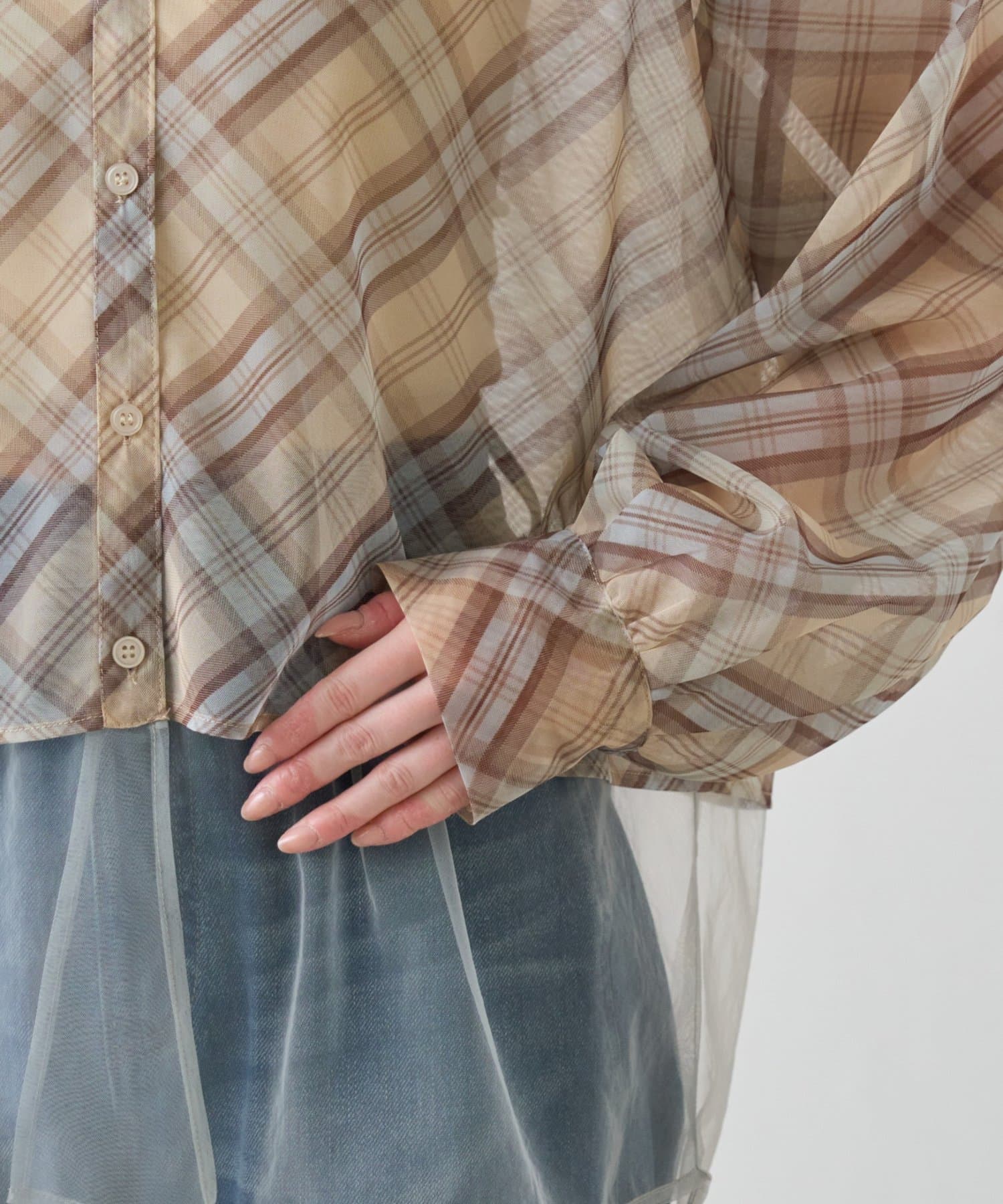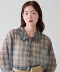 チェック柄とシアー素材を組み合わせた、レイヤード風デザインのシャツ。