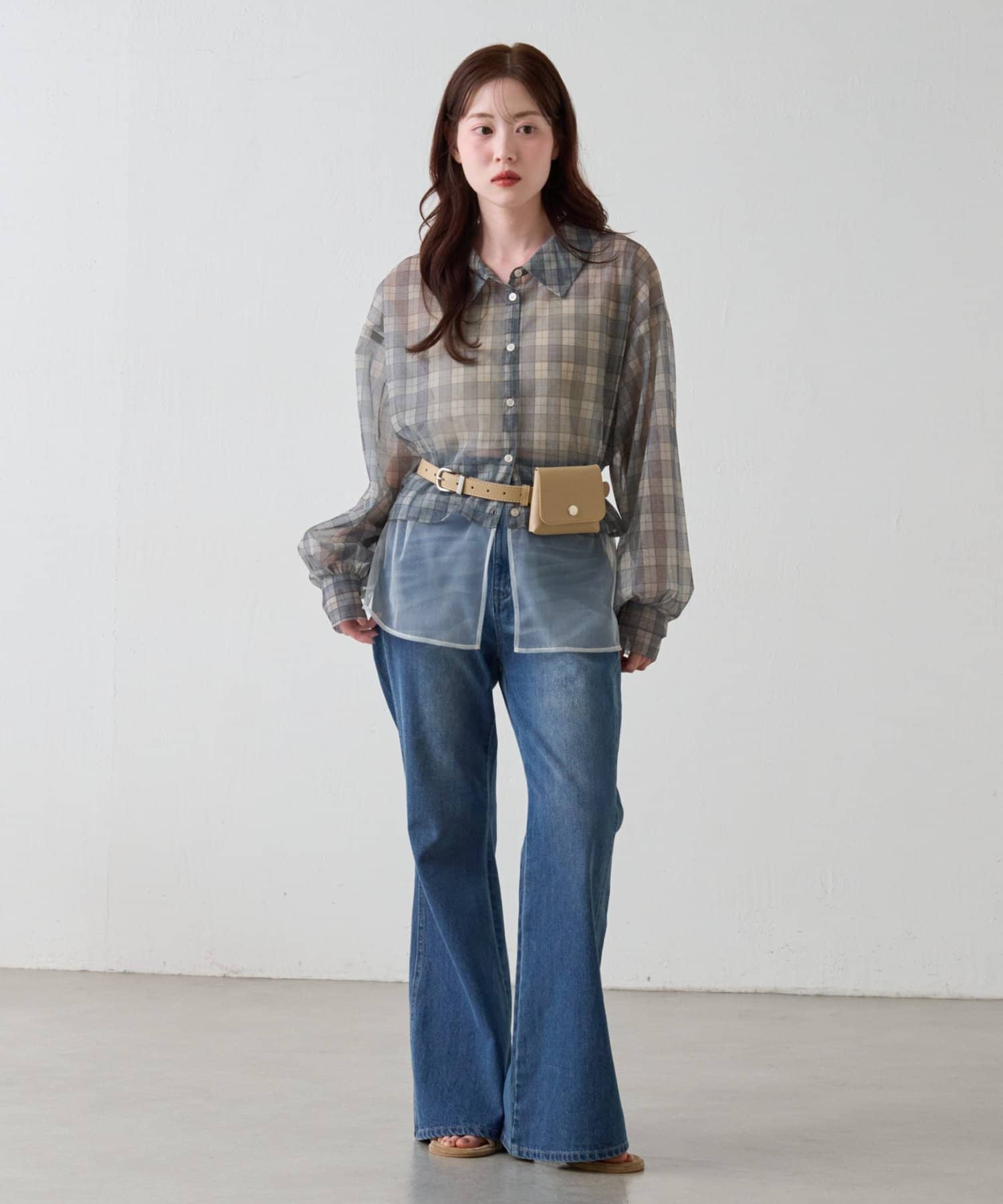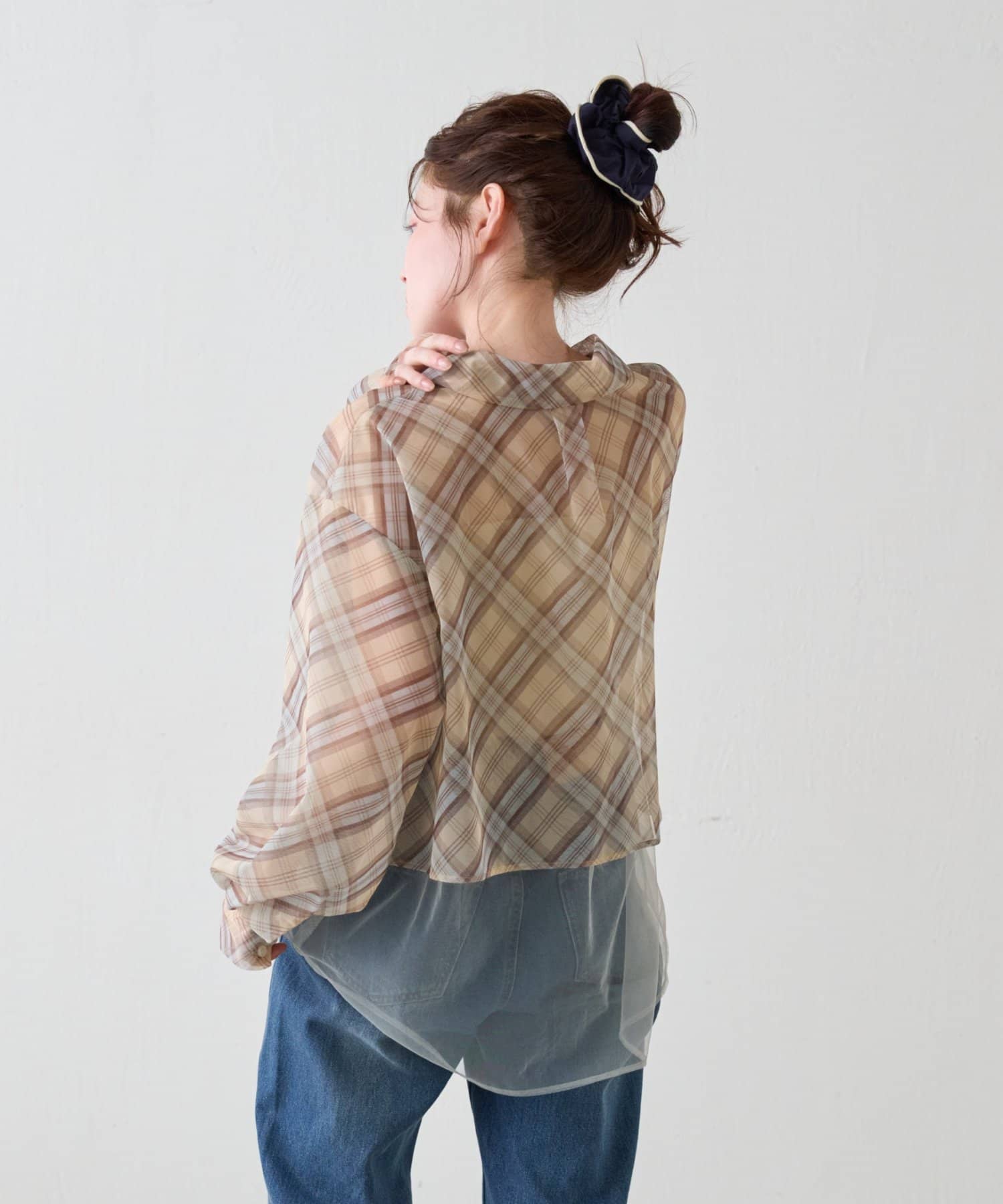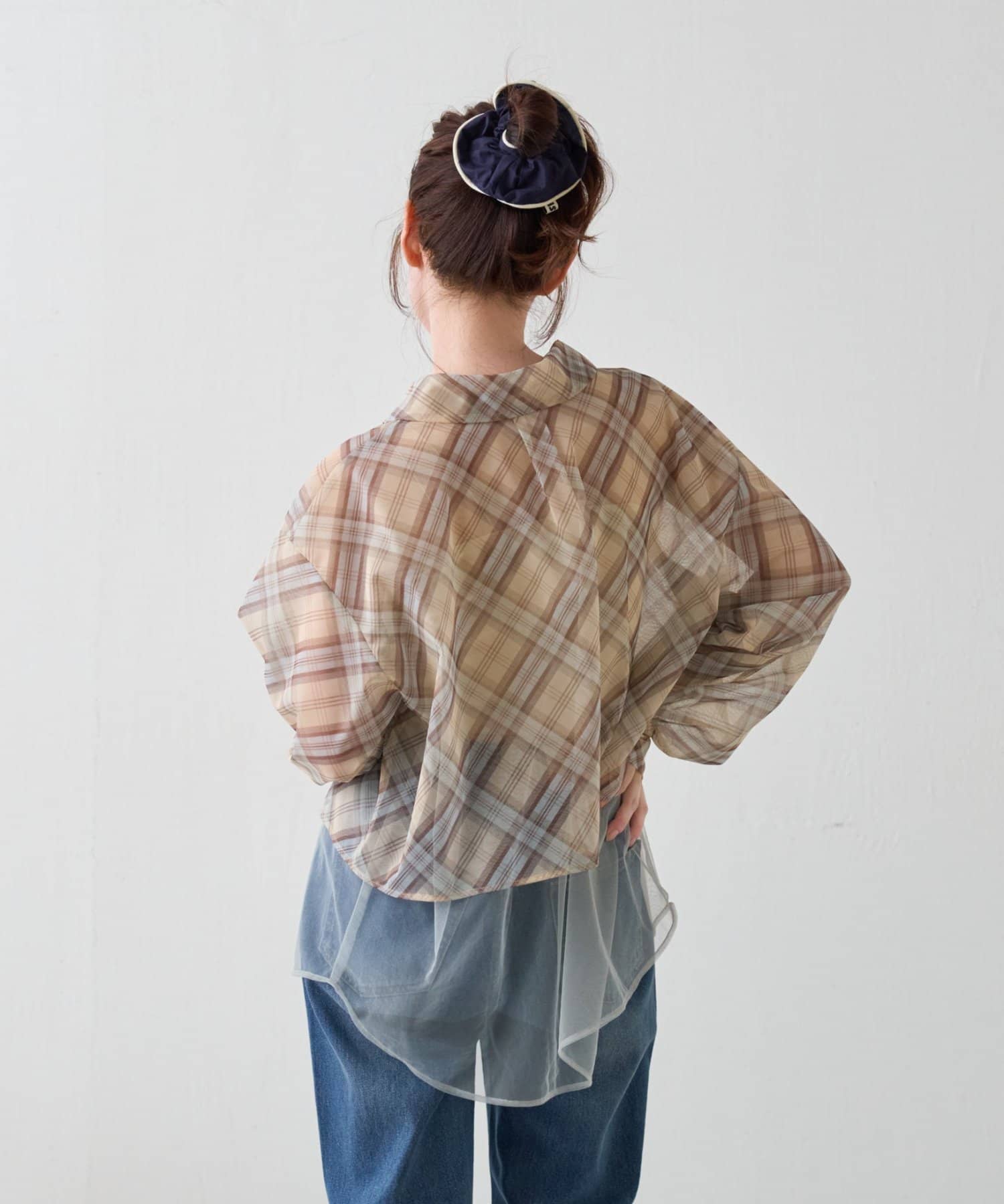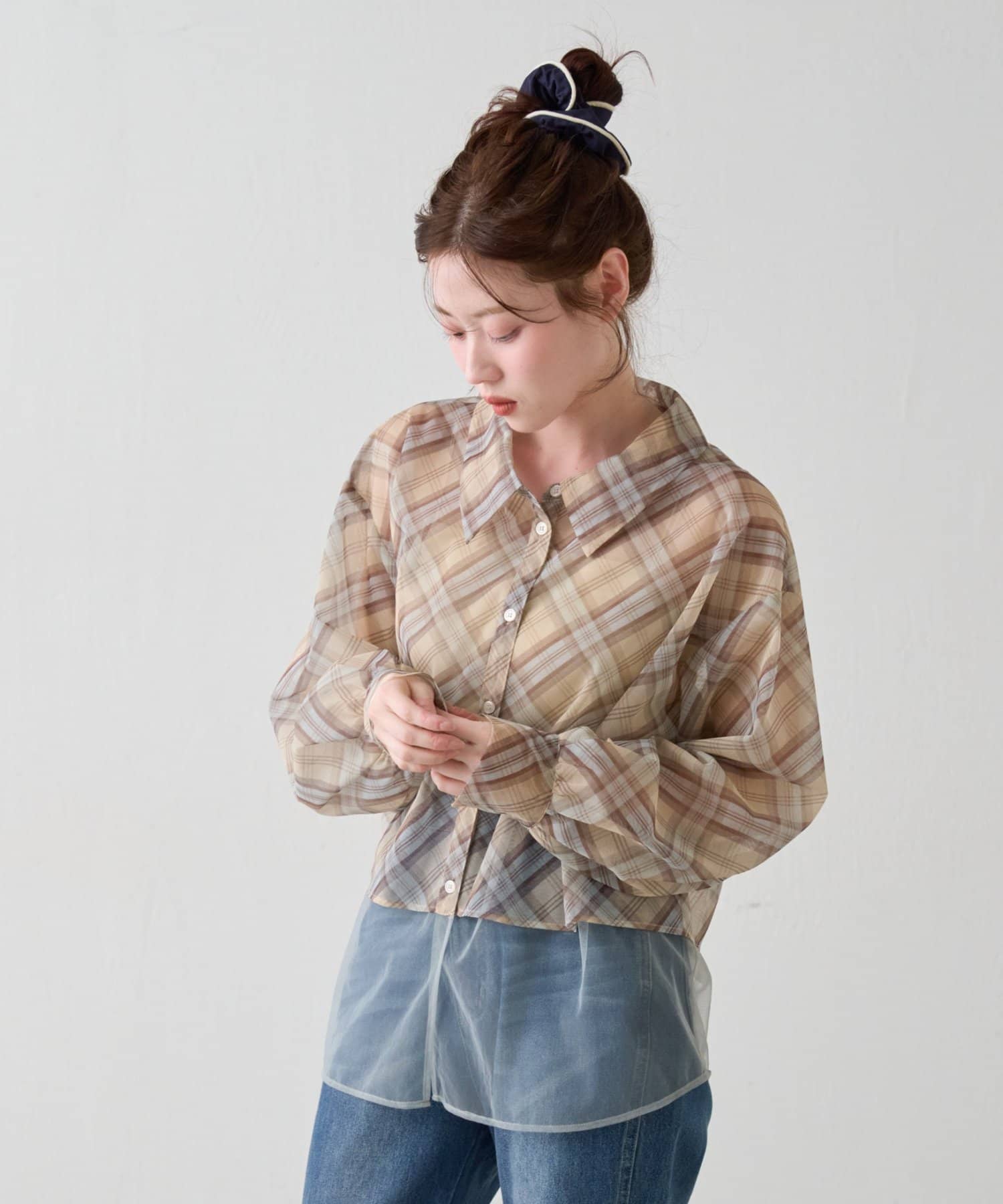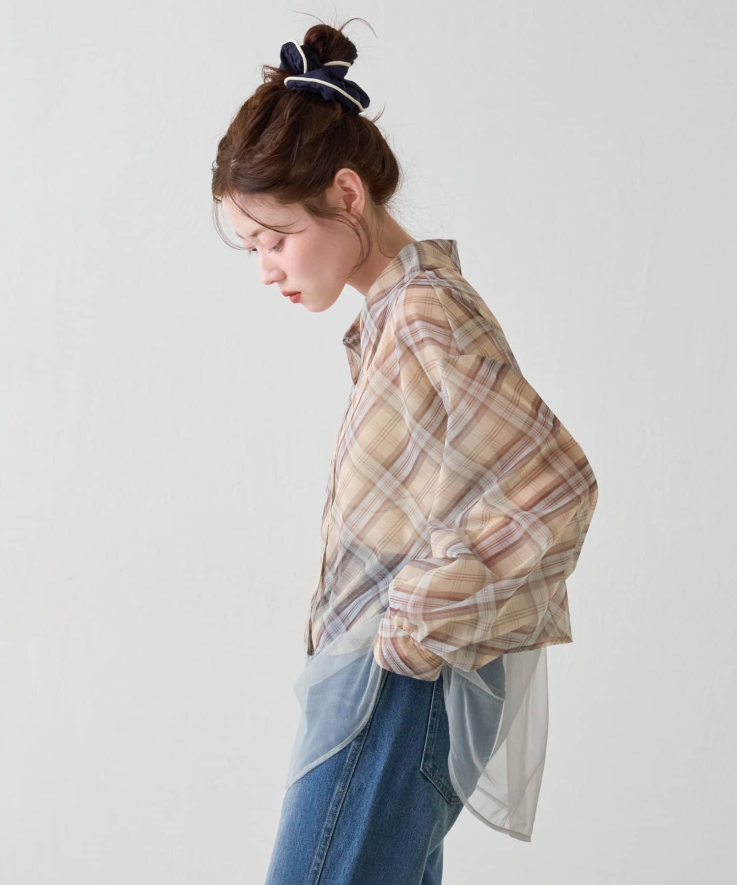 チェック柄とシアー素材を組み合わせた、レイヤード風デザインのシャツ。