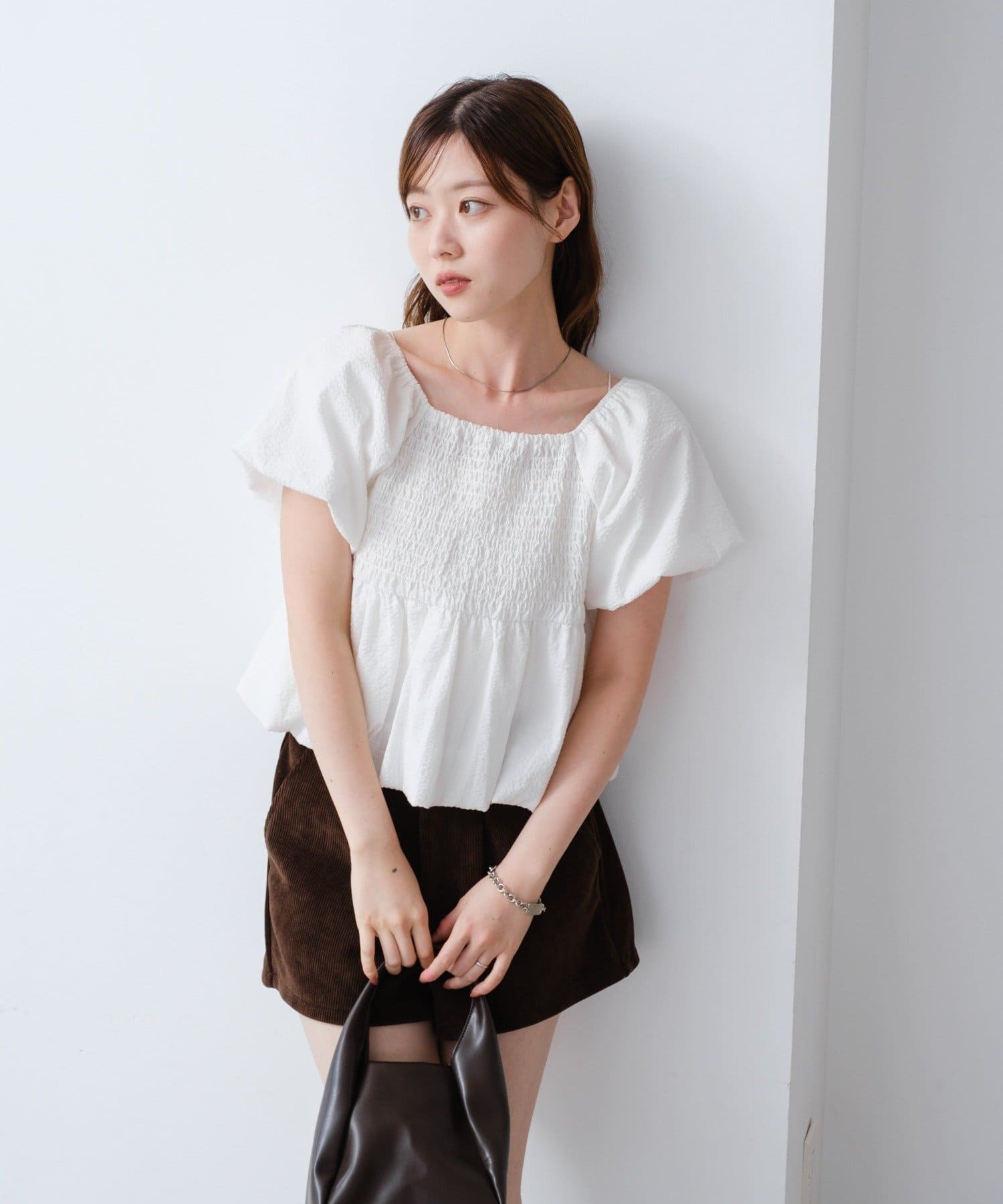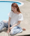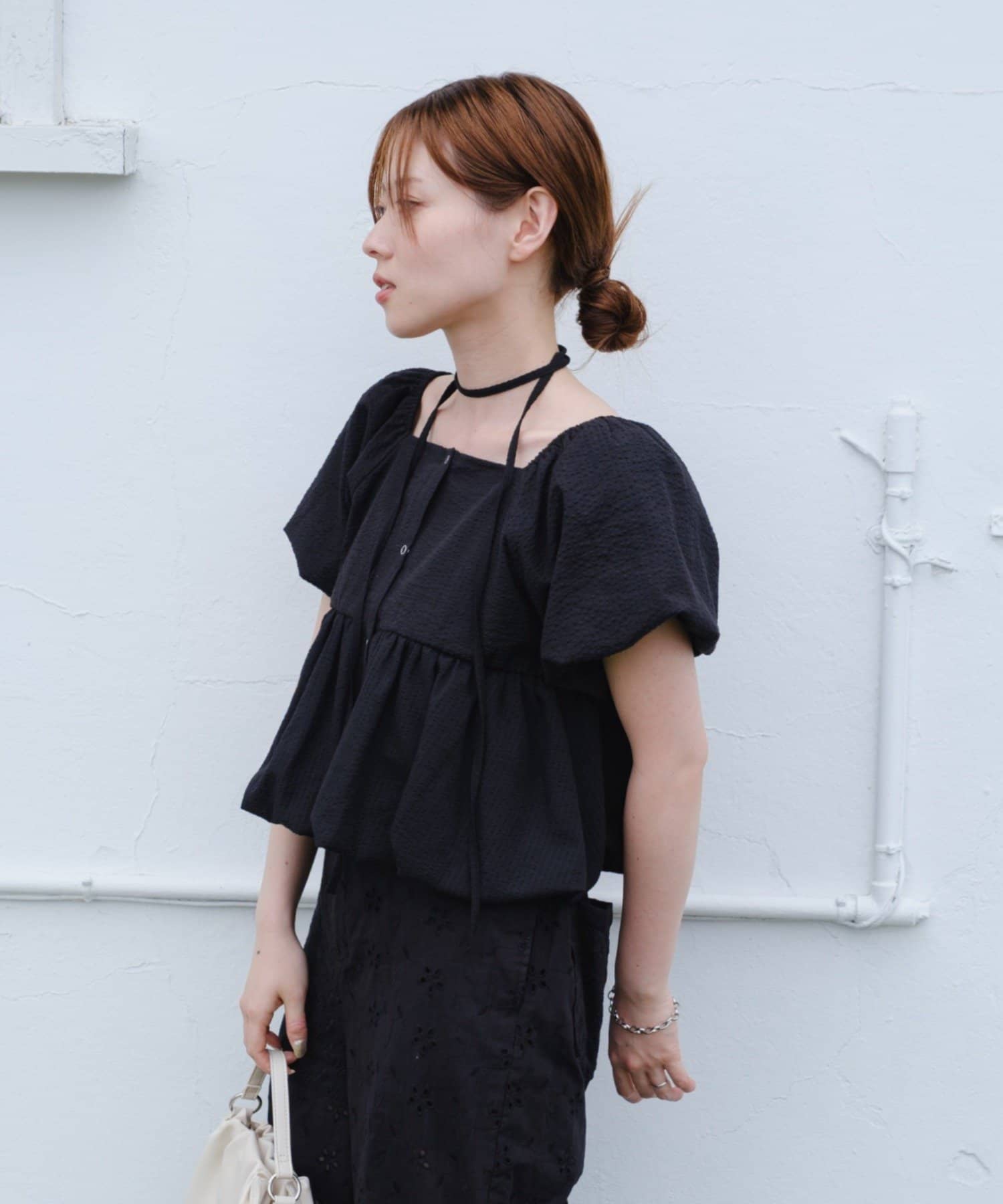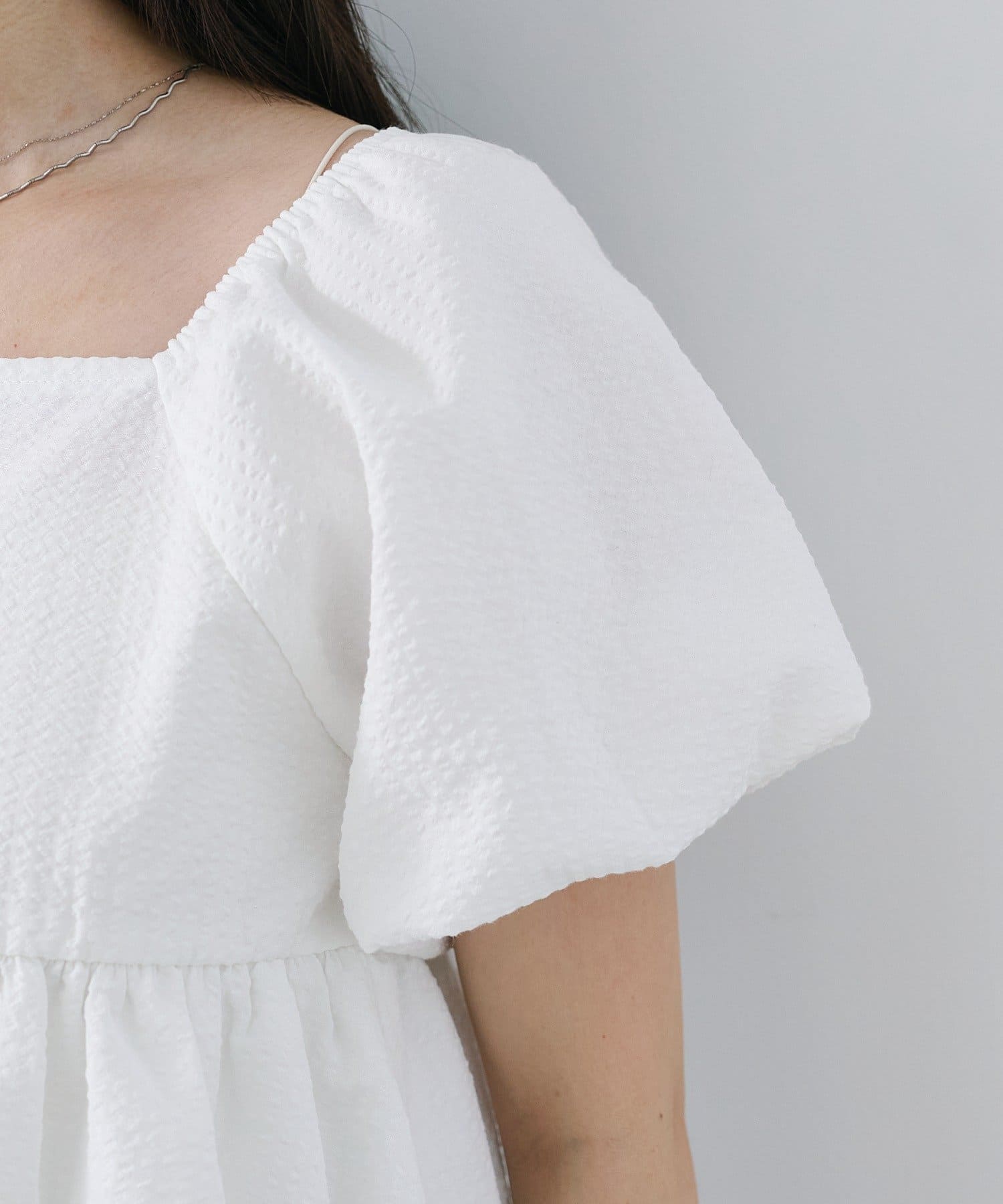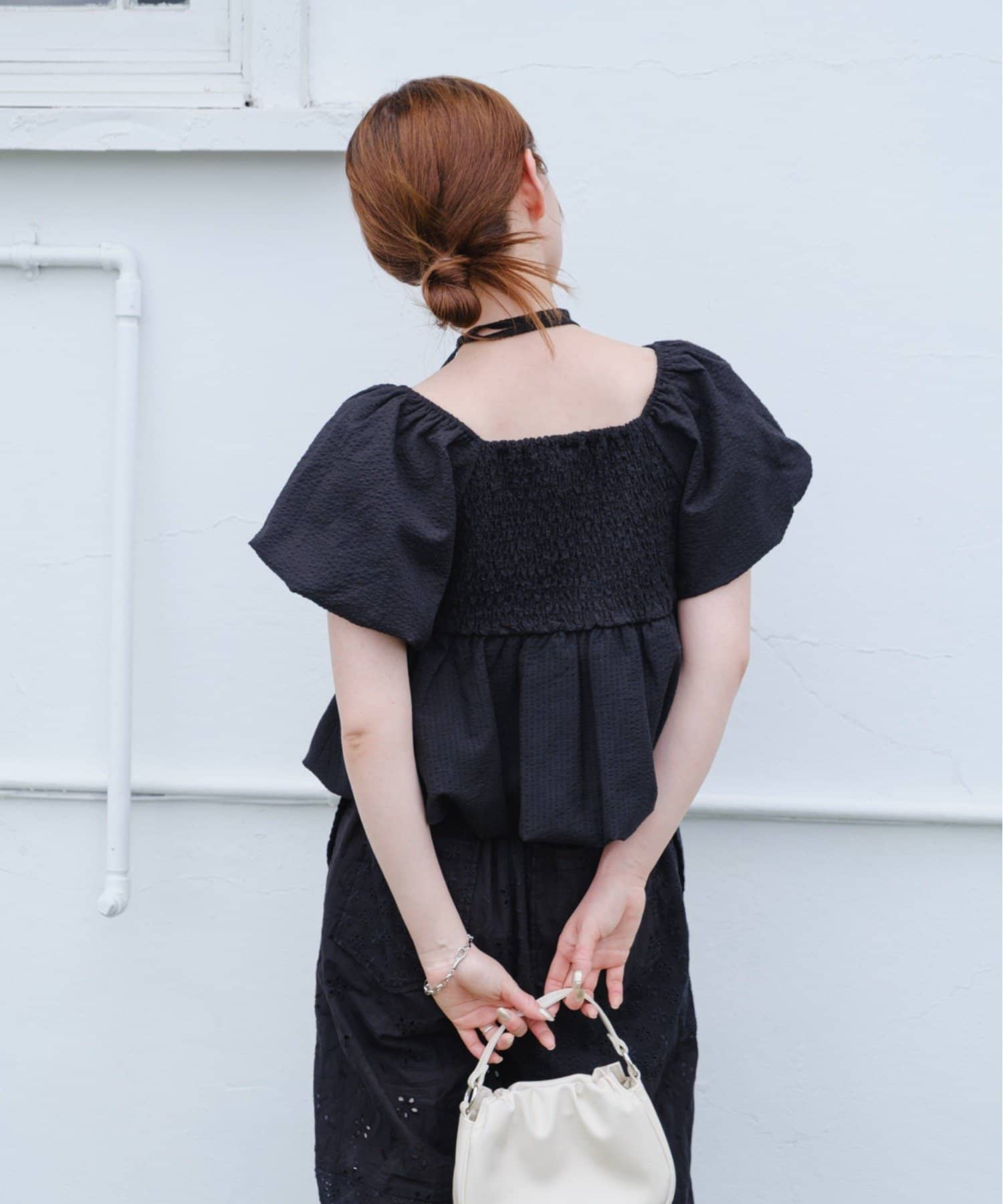 ボリュームのあるパフスリーブが華奢見えに。
