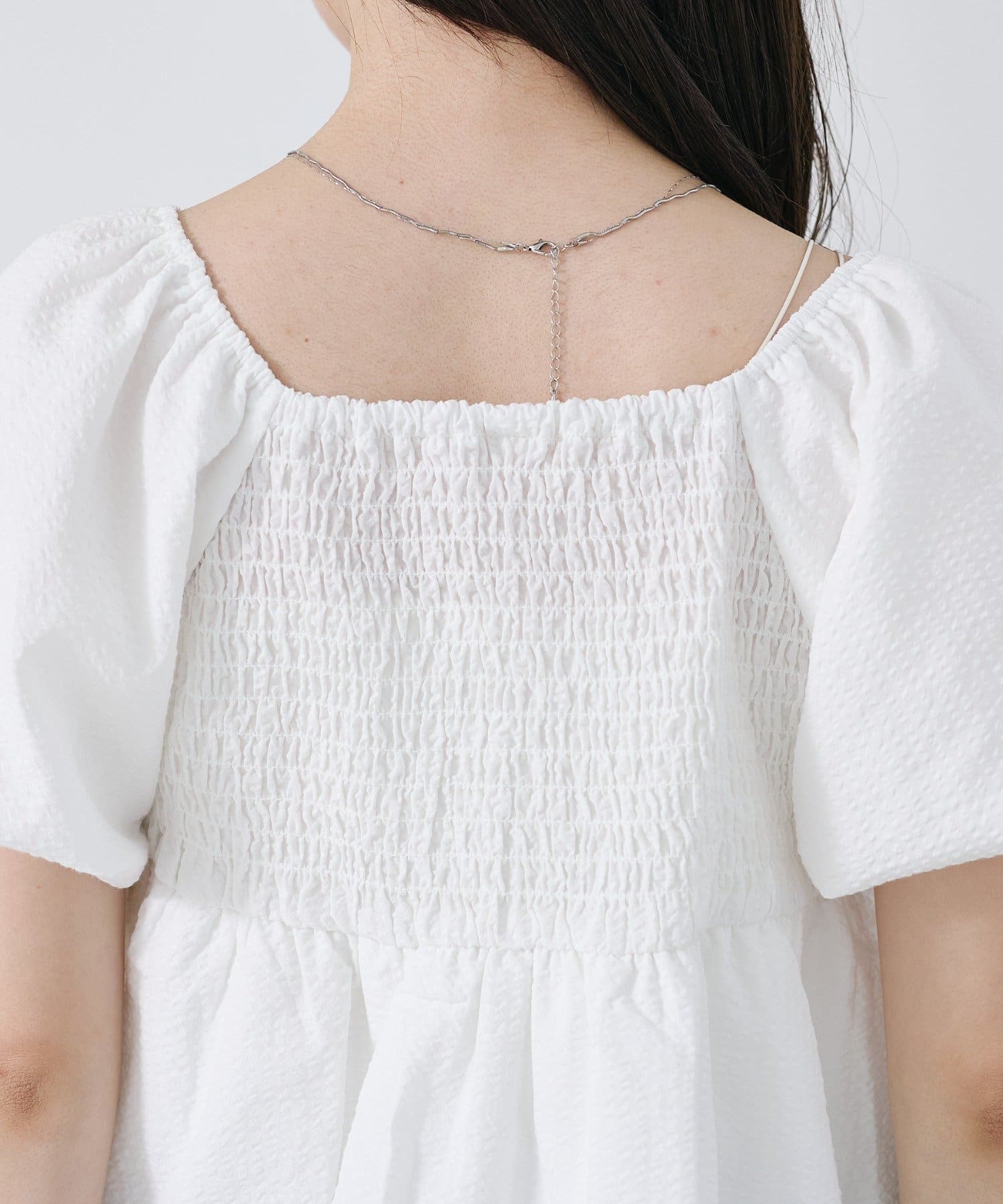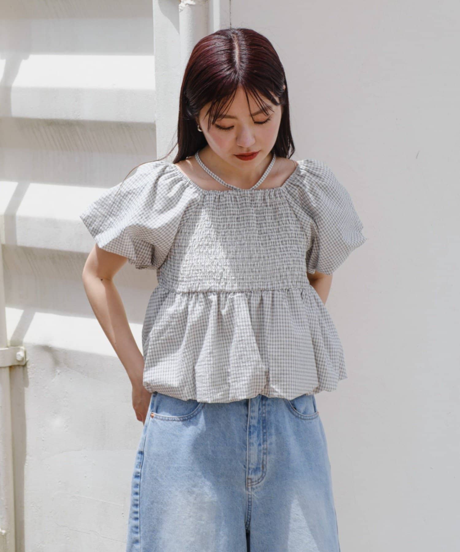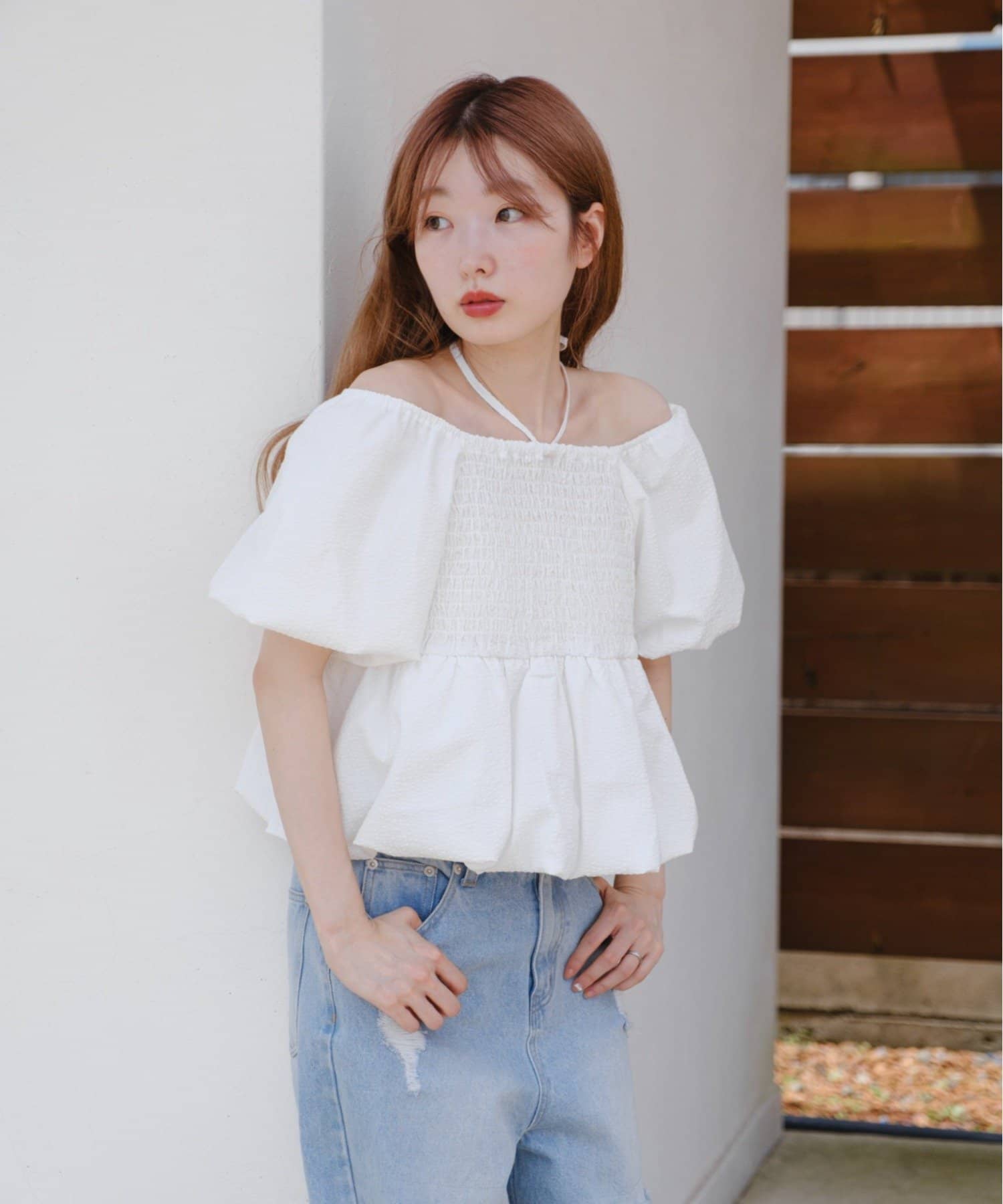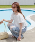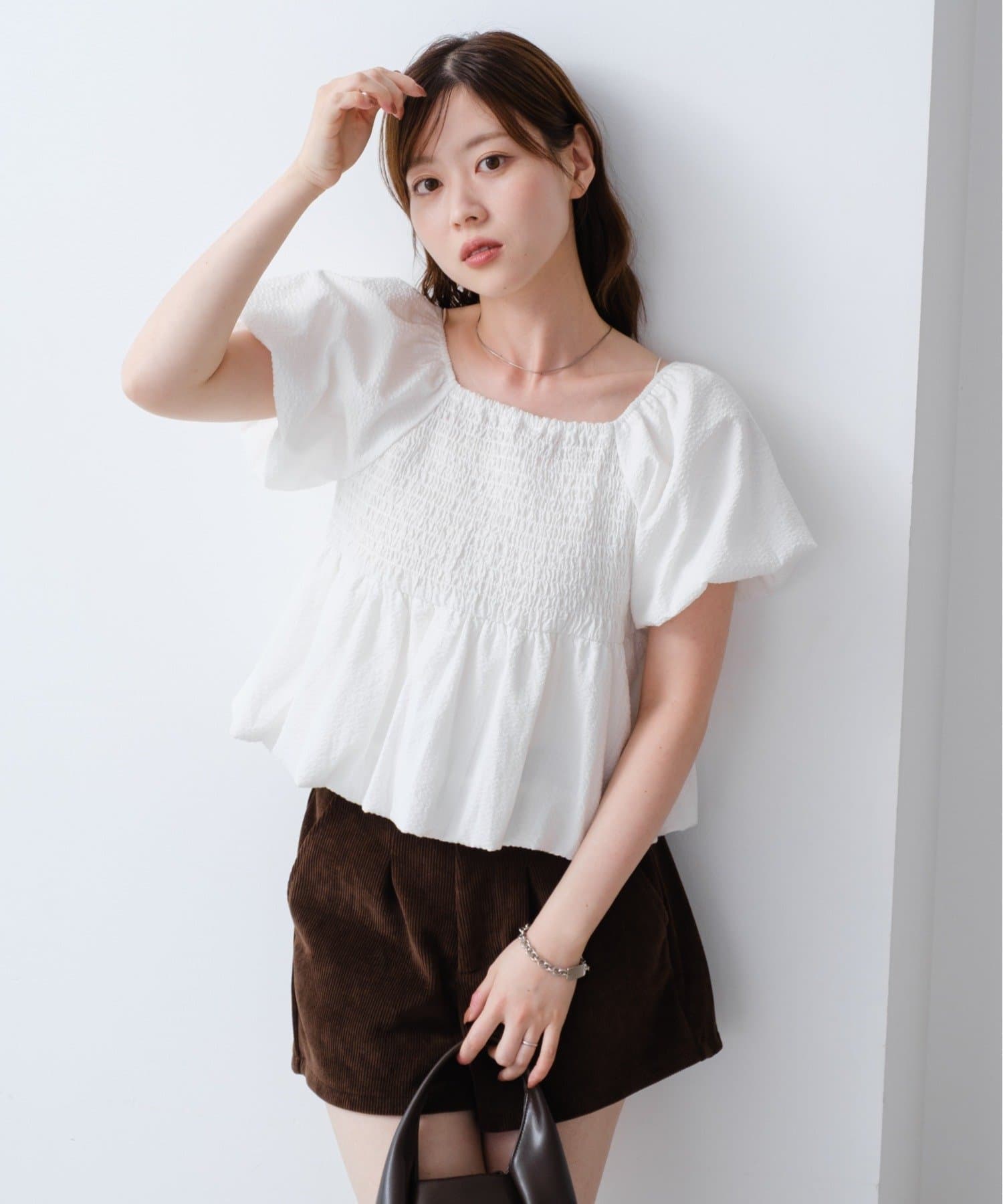 ボリュームのあるパフスリーブが華奢見えに。