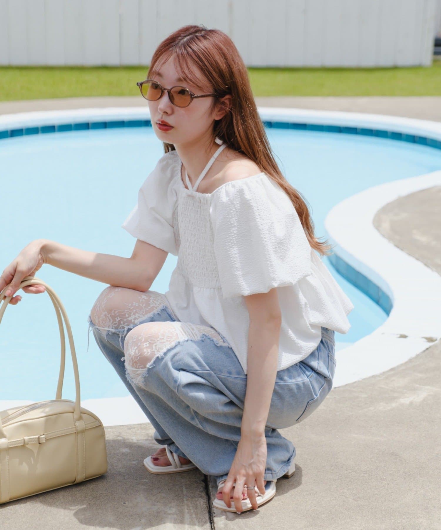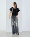 ボトムはデニムやスラックスで甘さを控えるのがおすすめ。