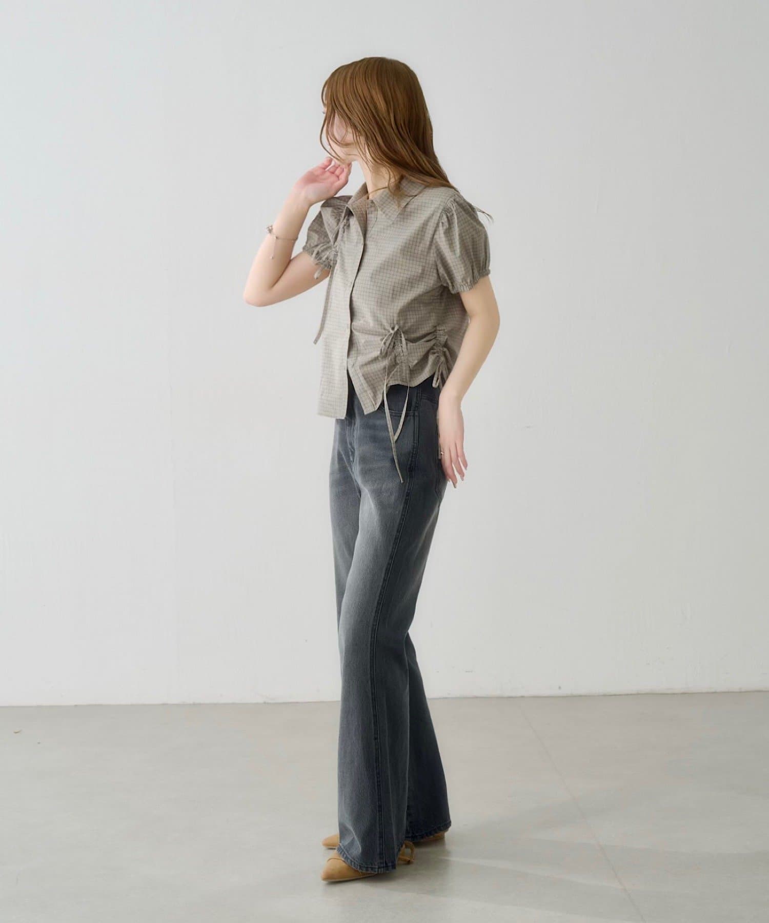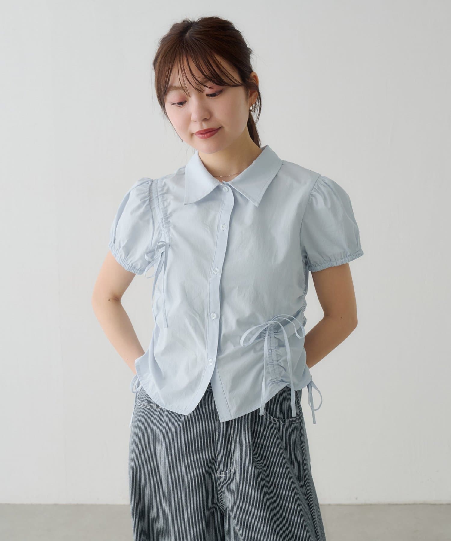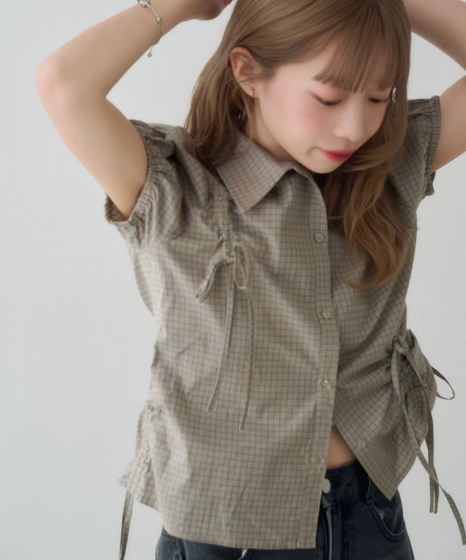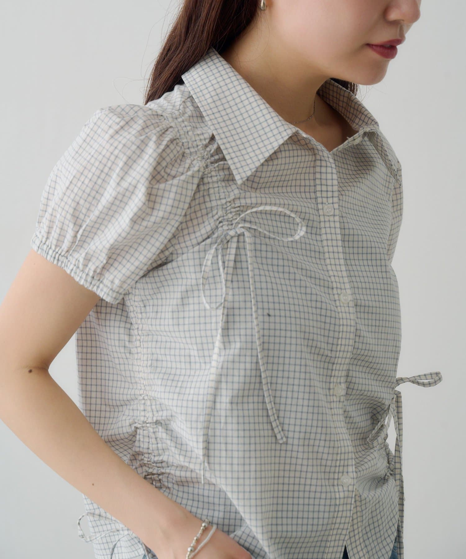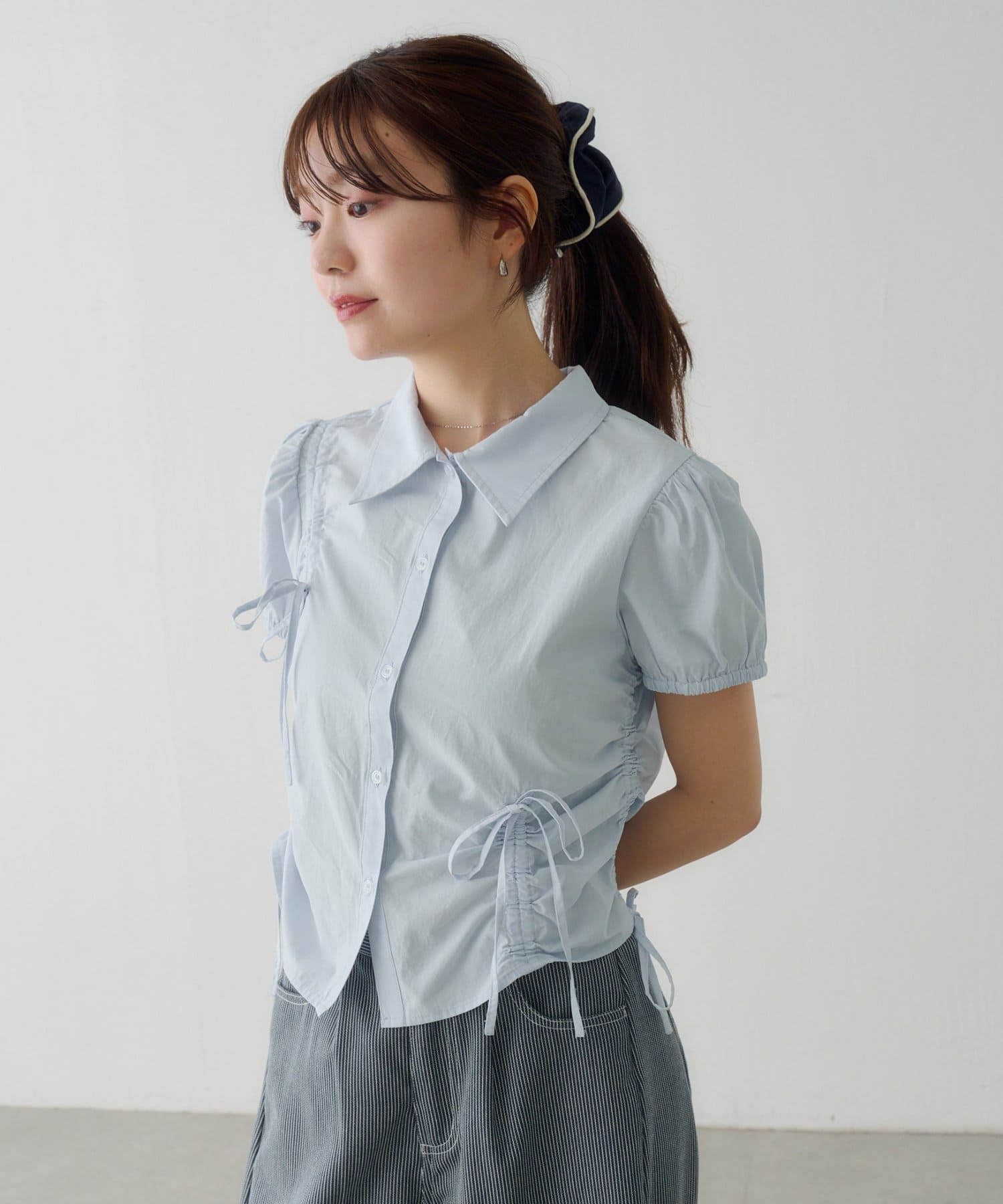 立体感のあるパフスリーブと、サイドのリボンディテールが印象的なデザインシャツ。