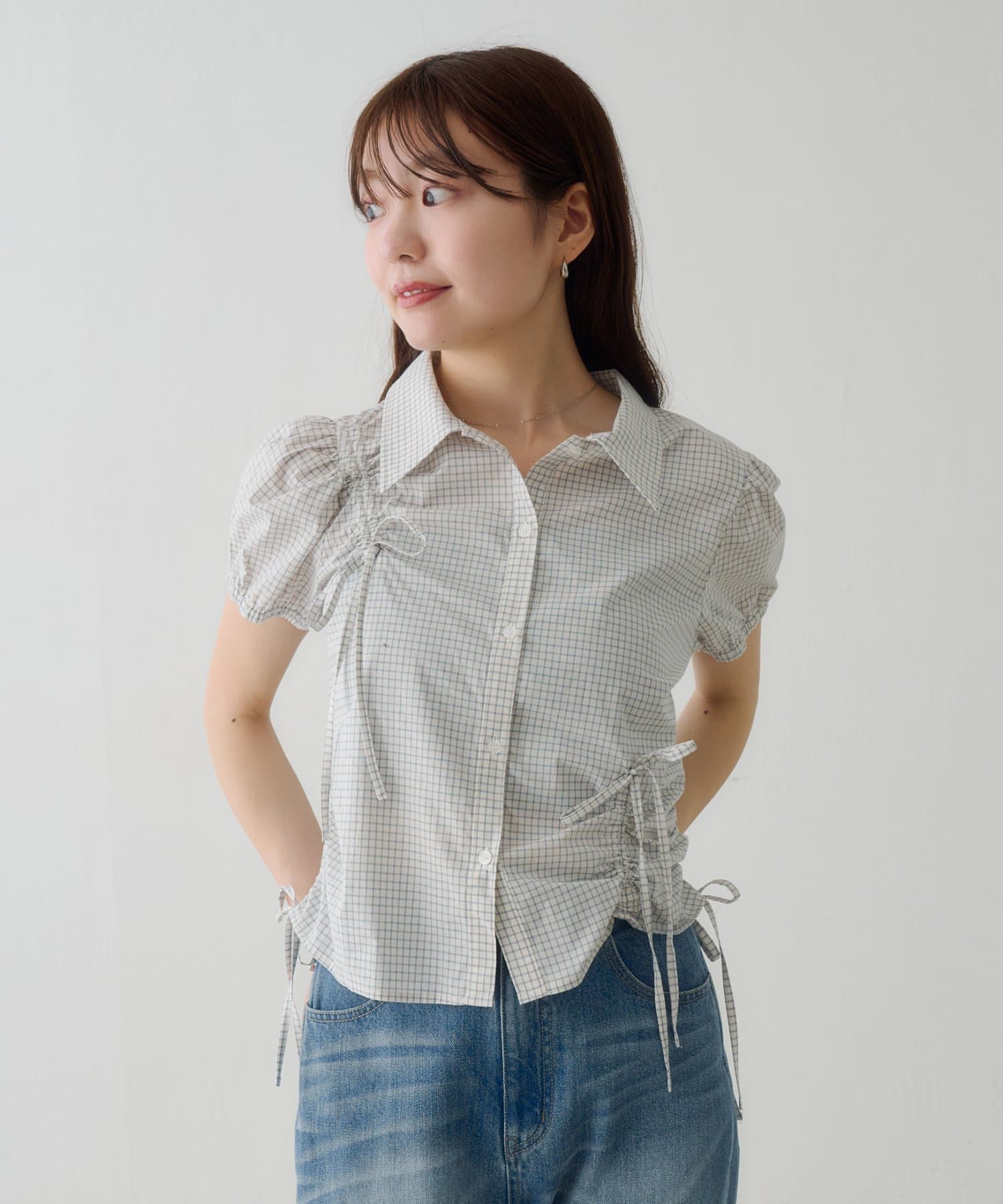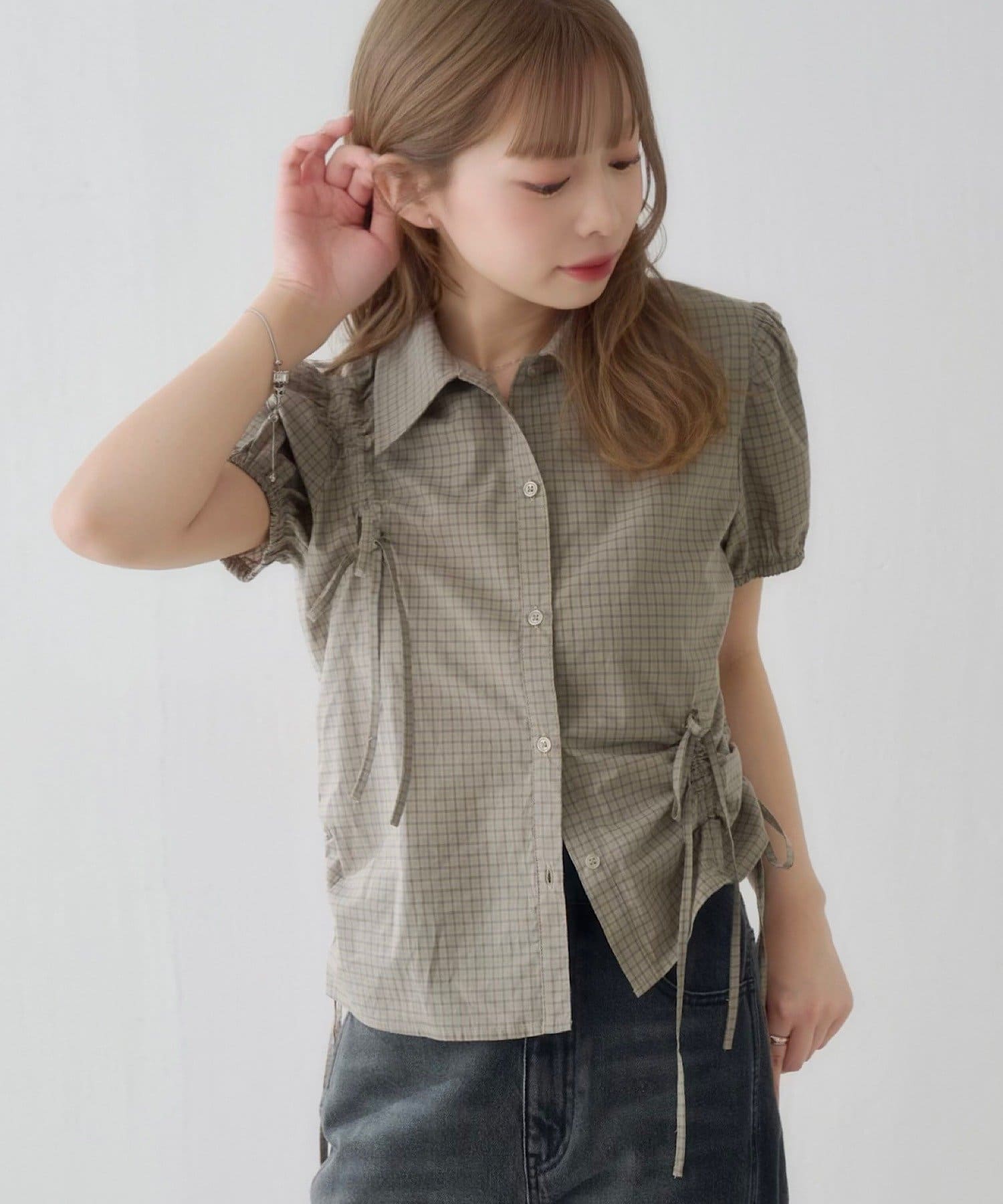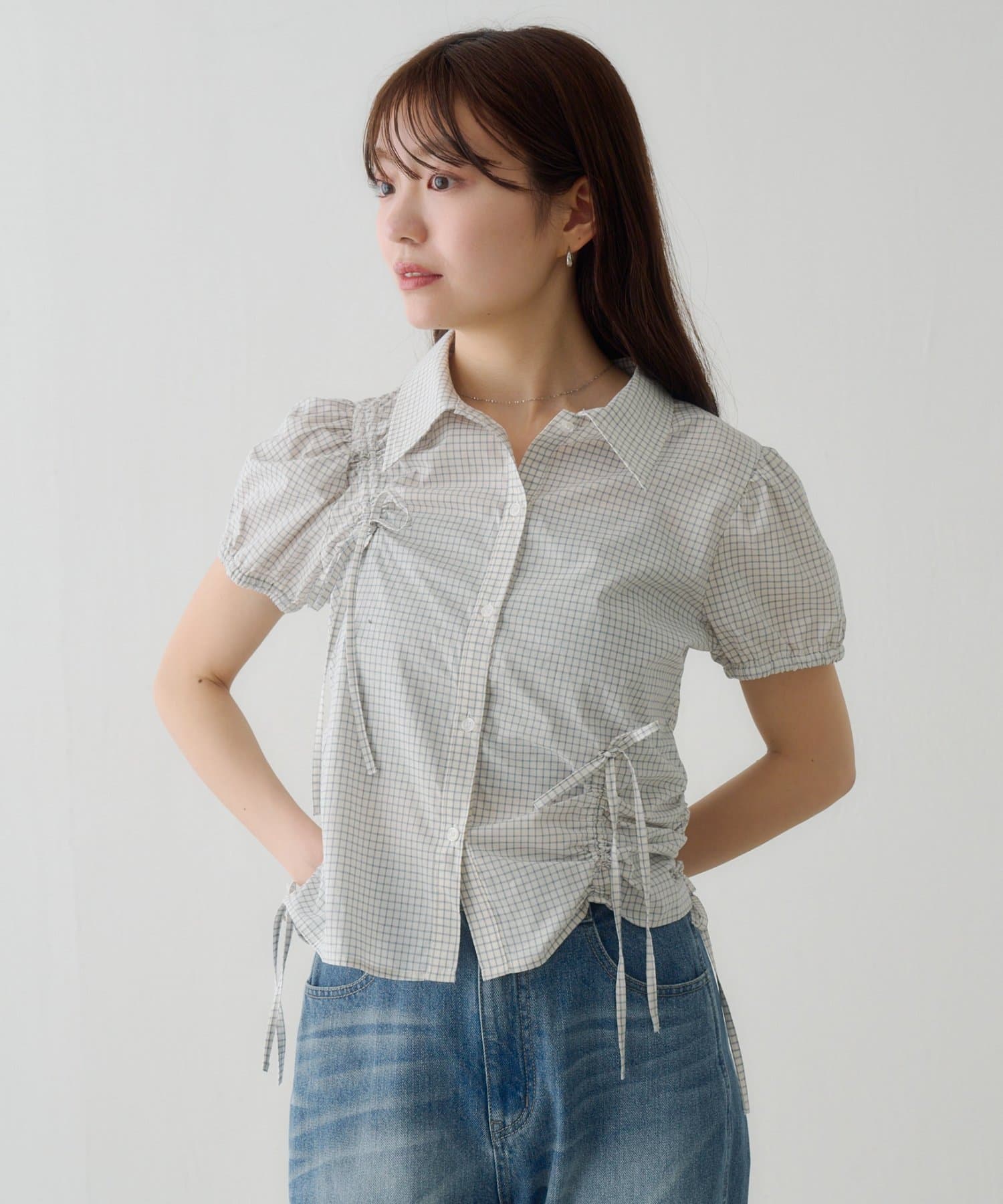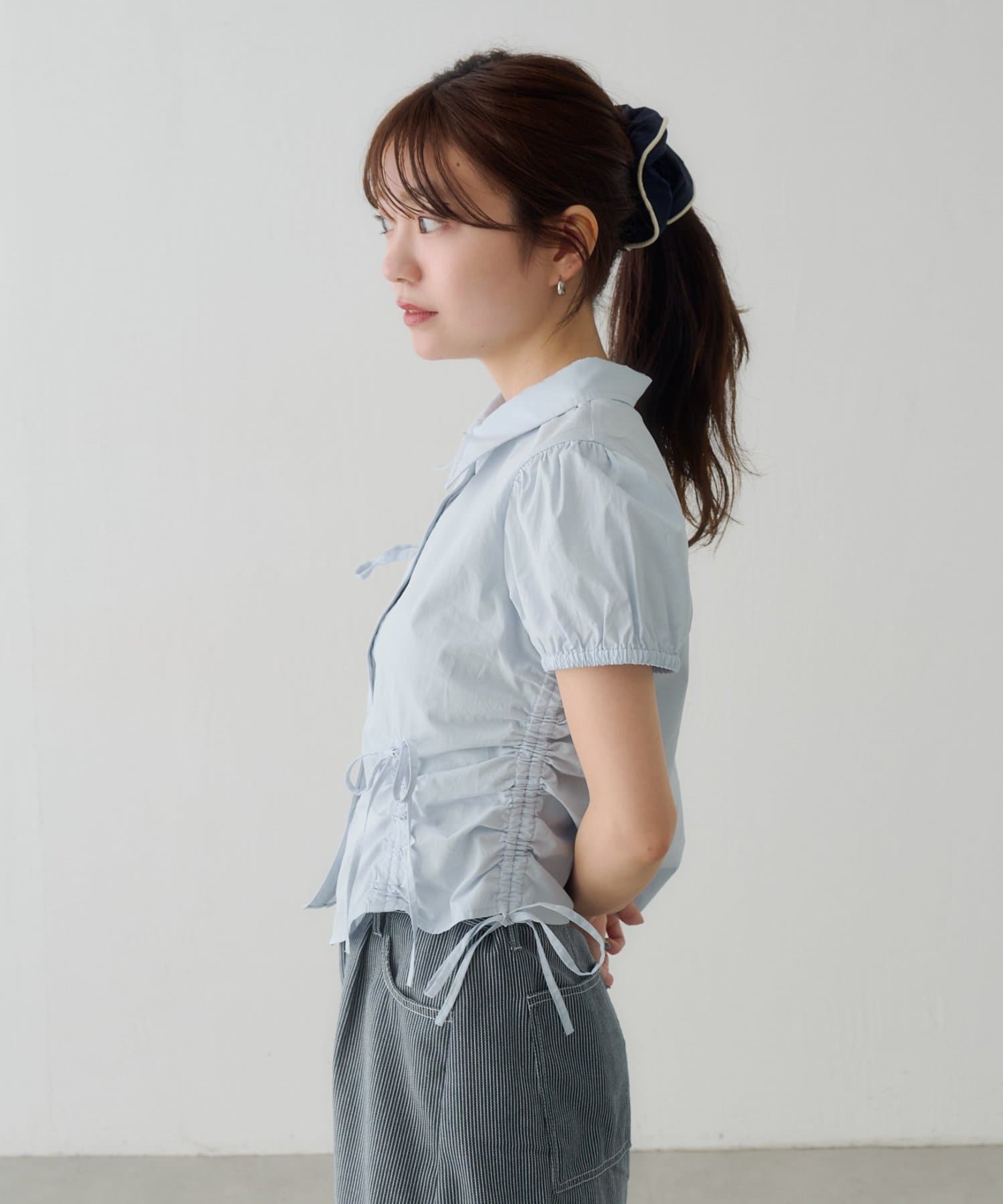立体感のあるパフスリーブと、サイドのリボンディテールが印象的なデザインシャツ。