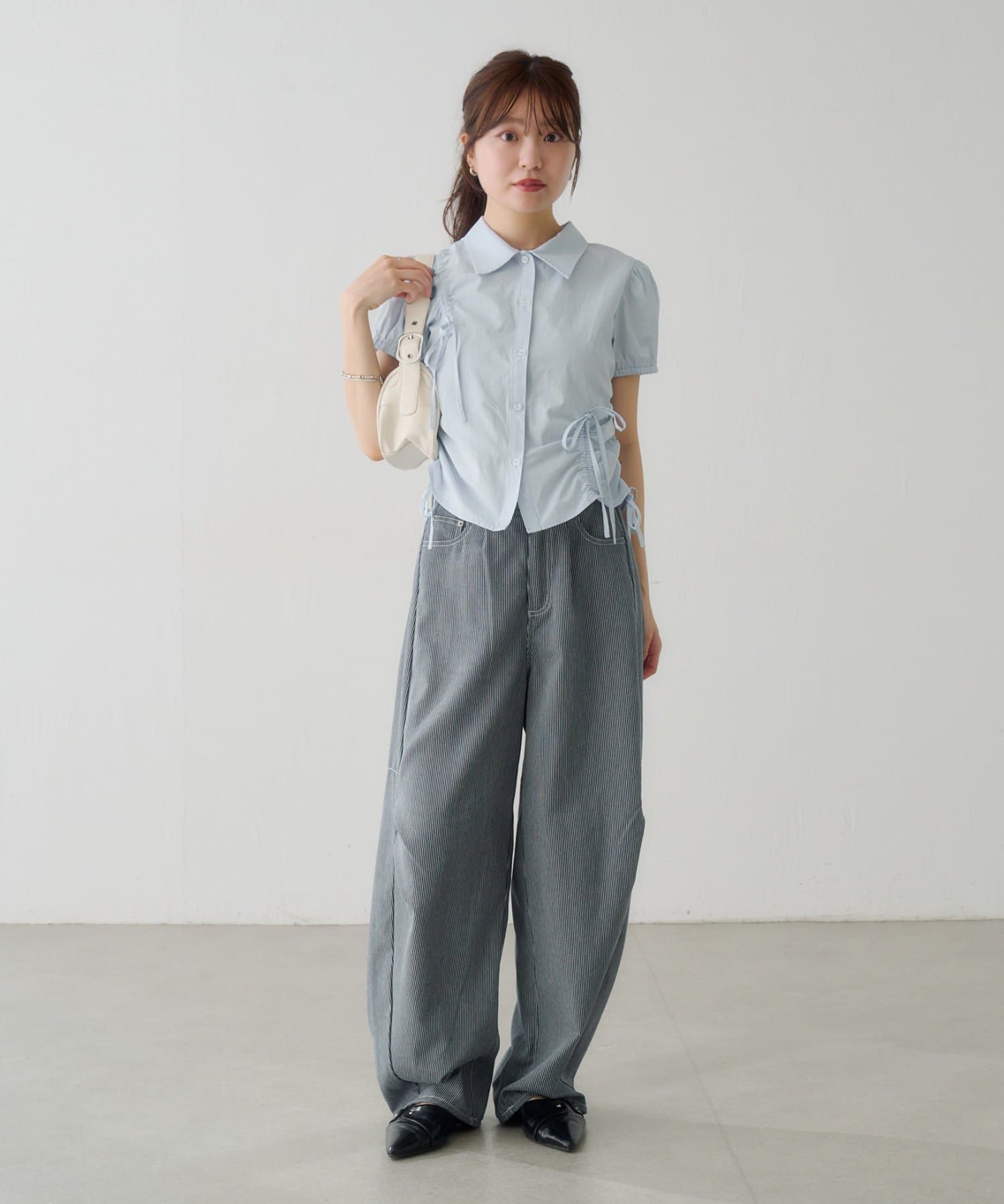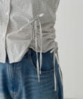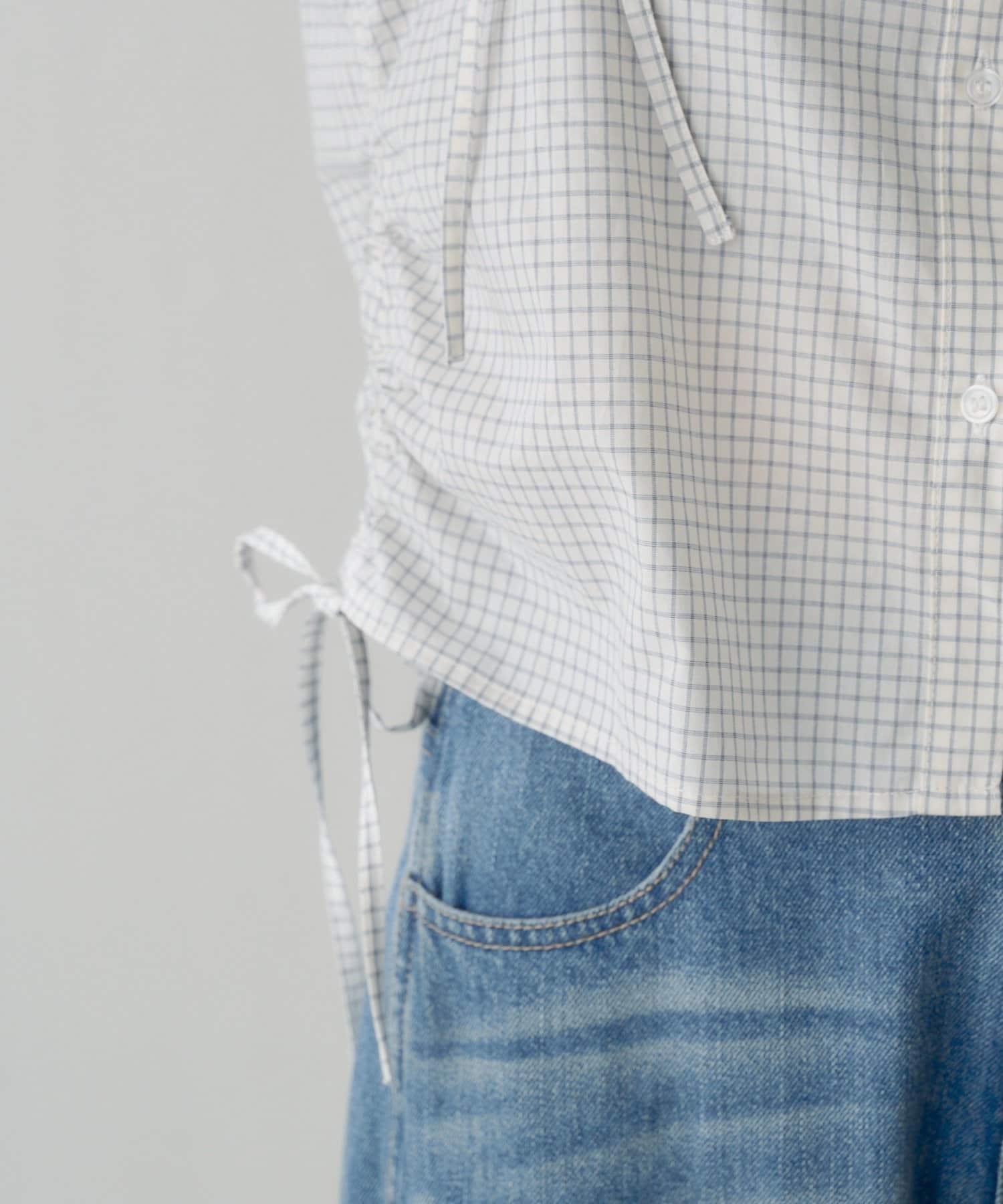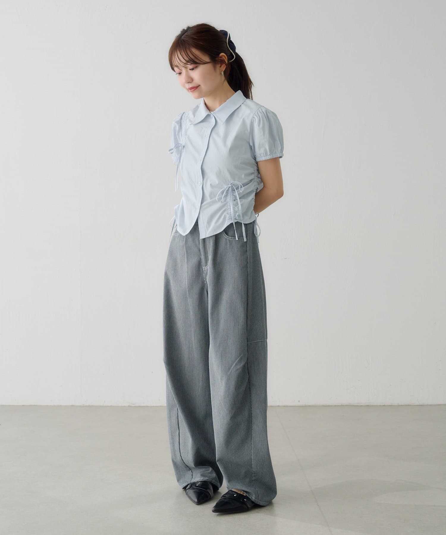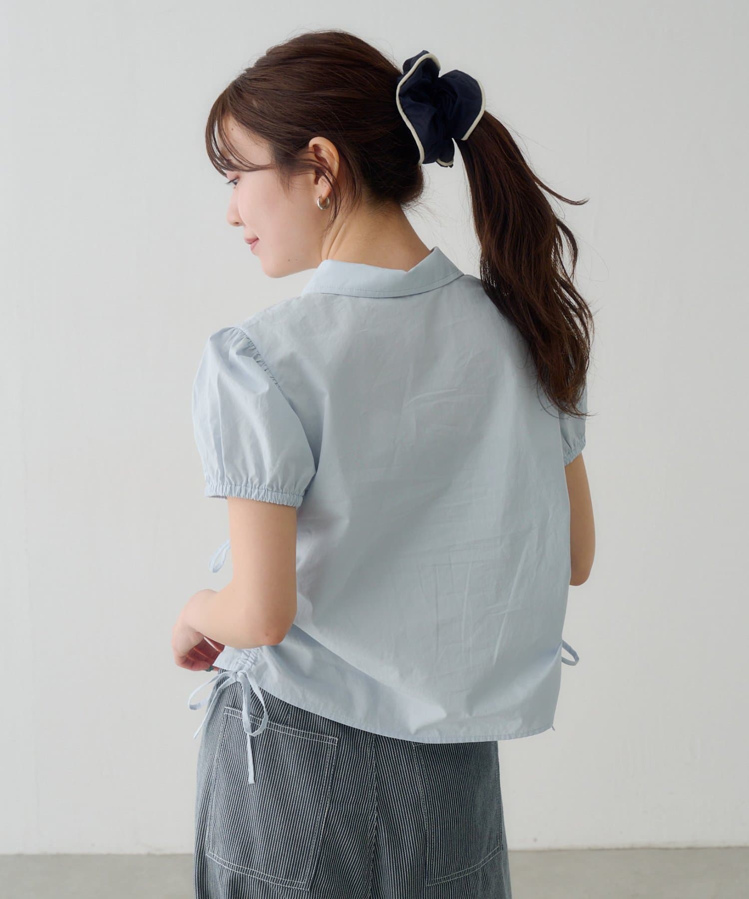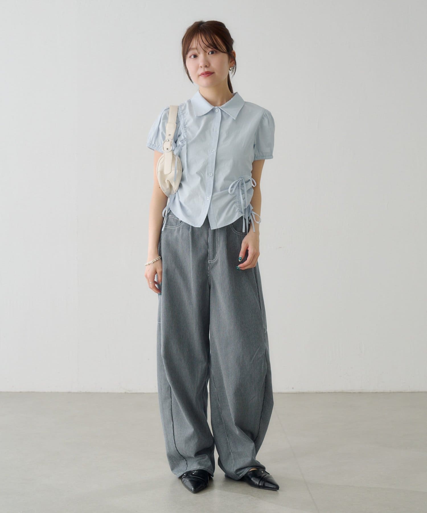 立体感のあるパフスリーブと、サイドのリボンディテールが印象的なデザインシャツ。