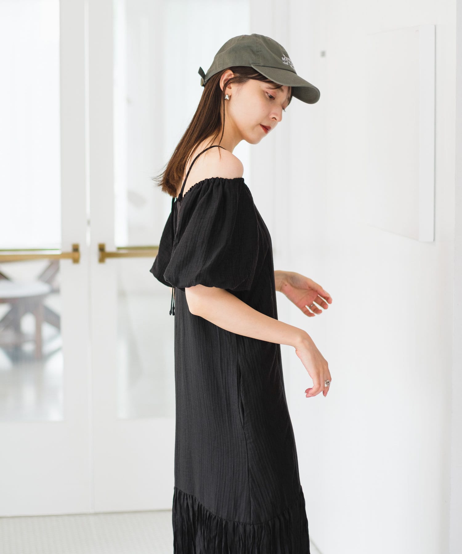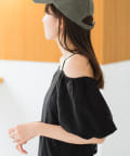 二の腕をカバーしてくれるバルーン袖は、オフショルにもなる2WAY仕様。