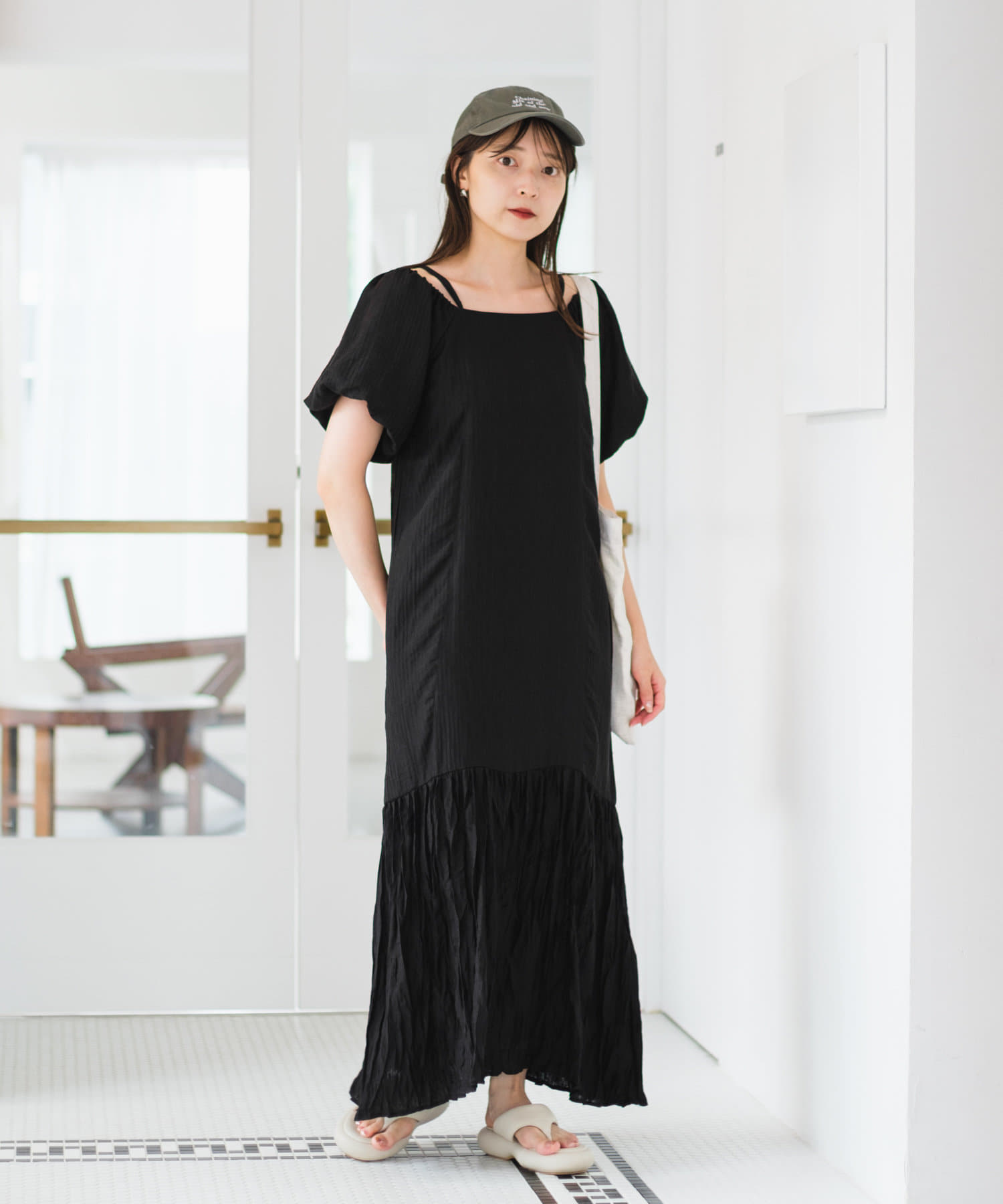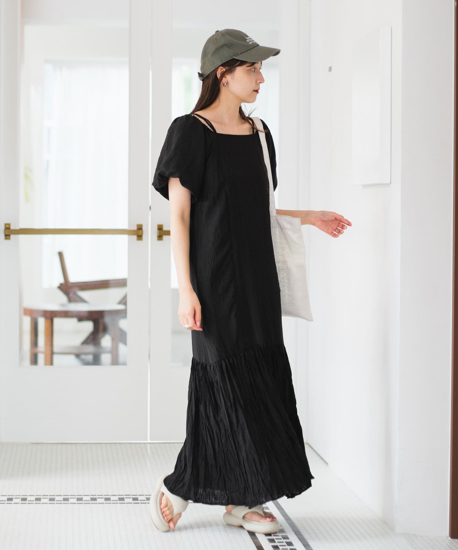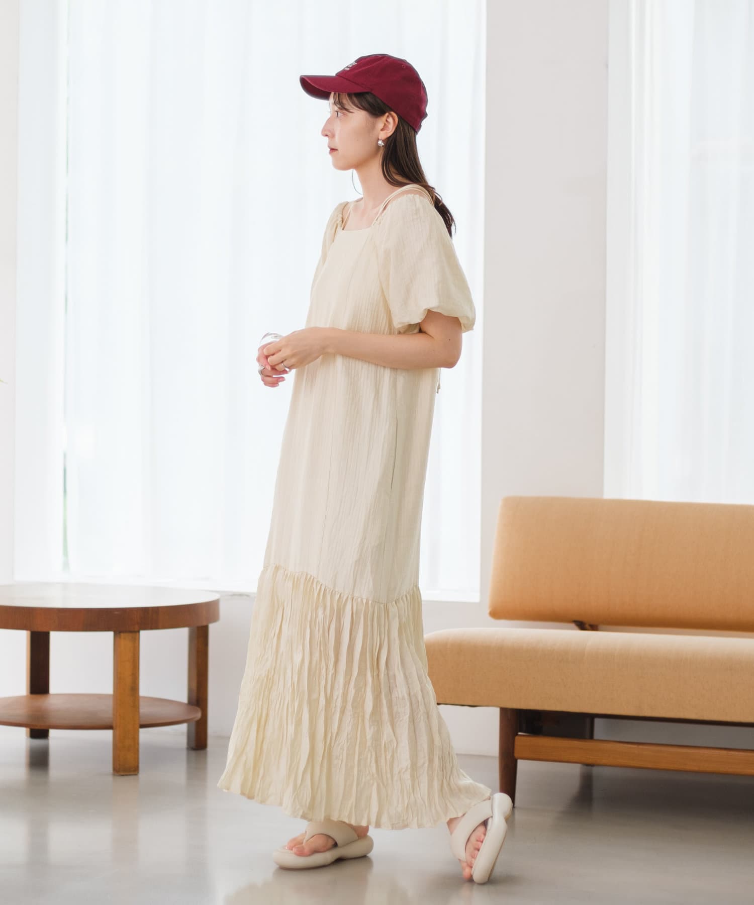 人気アイテムのギャザーオールインワンがワンピースverになって登場。