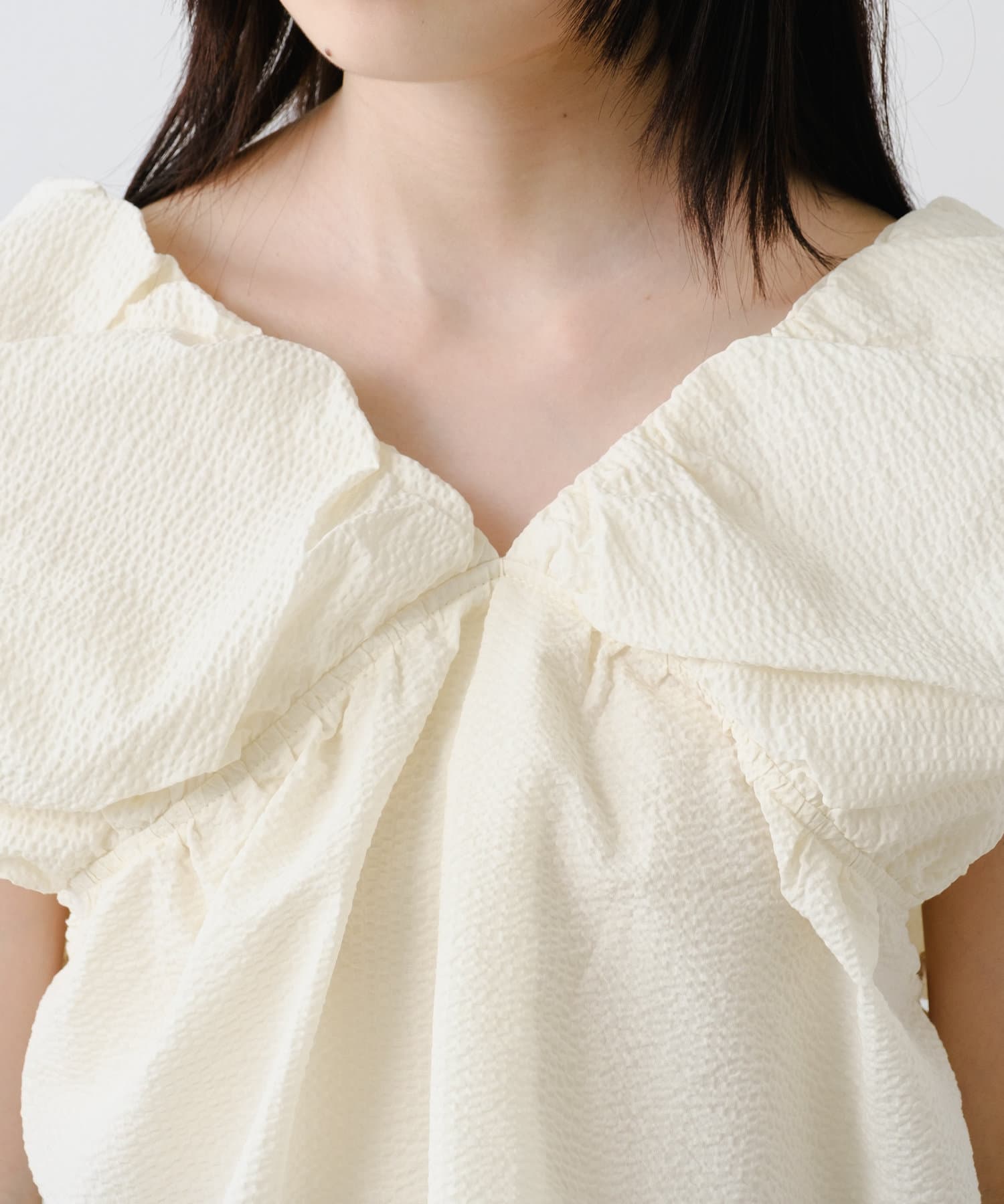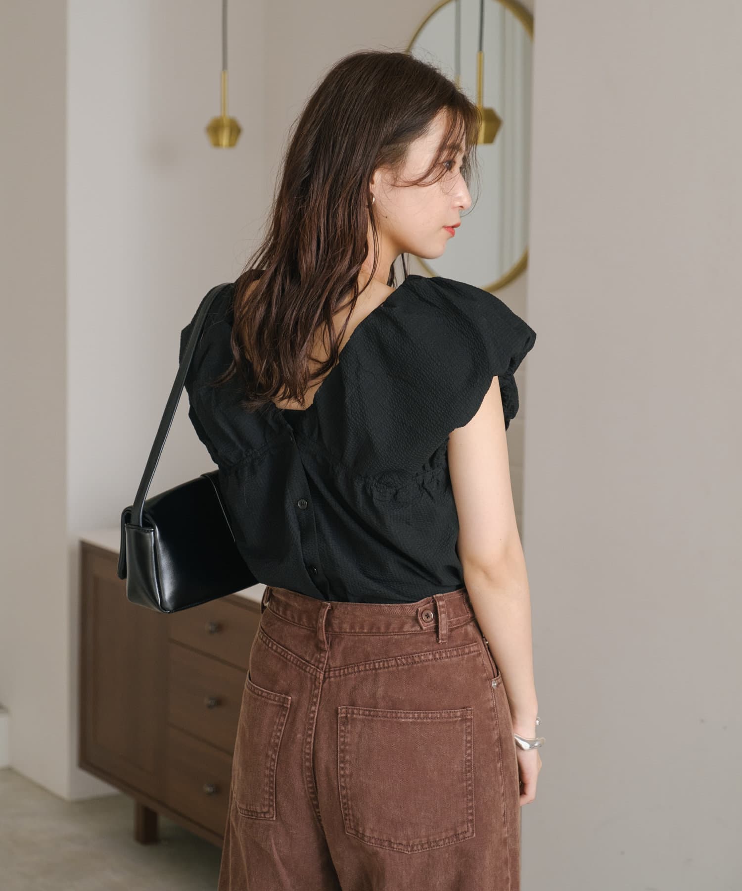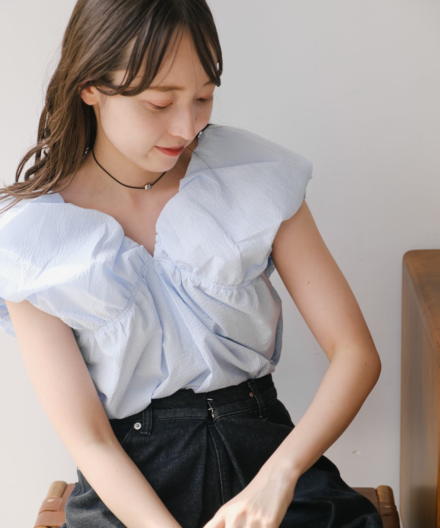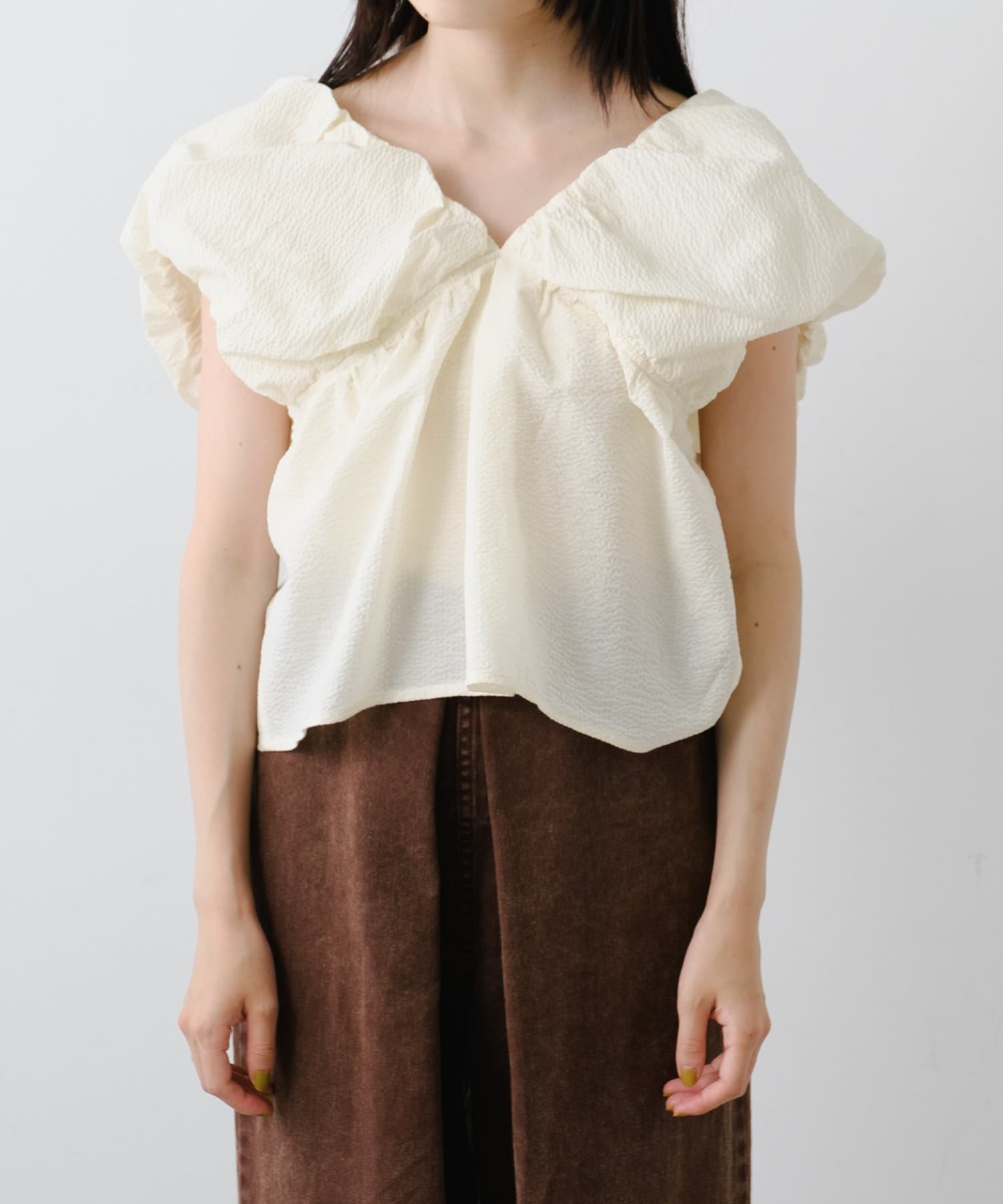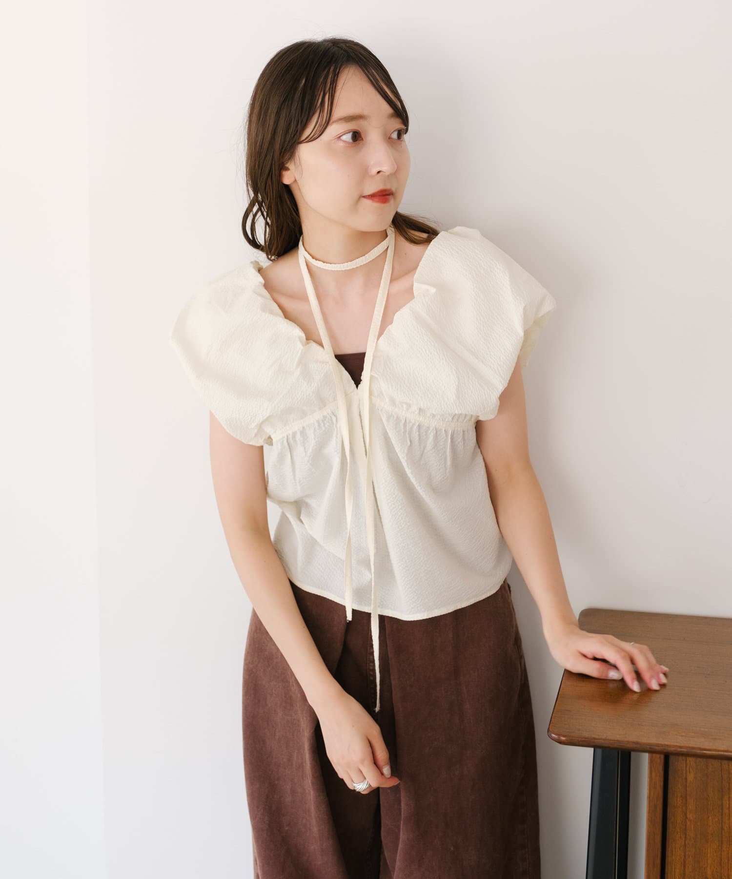 腕まわりをカバーしつつ、首元もほどよく開いているので顔周りがすっきりして見えます。