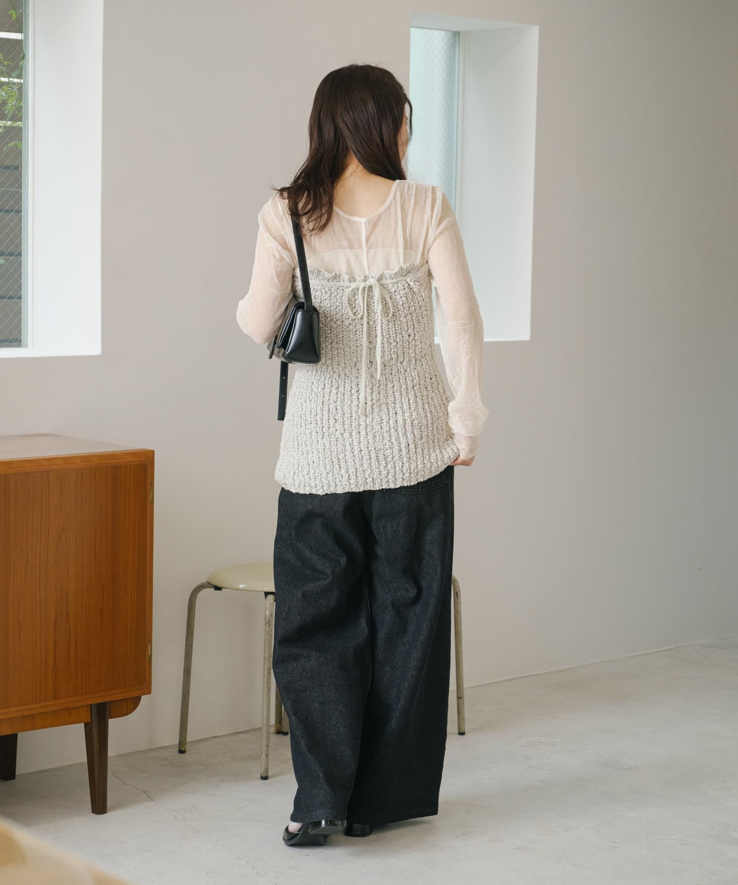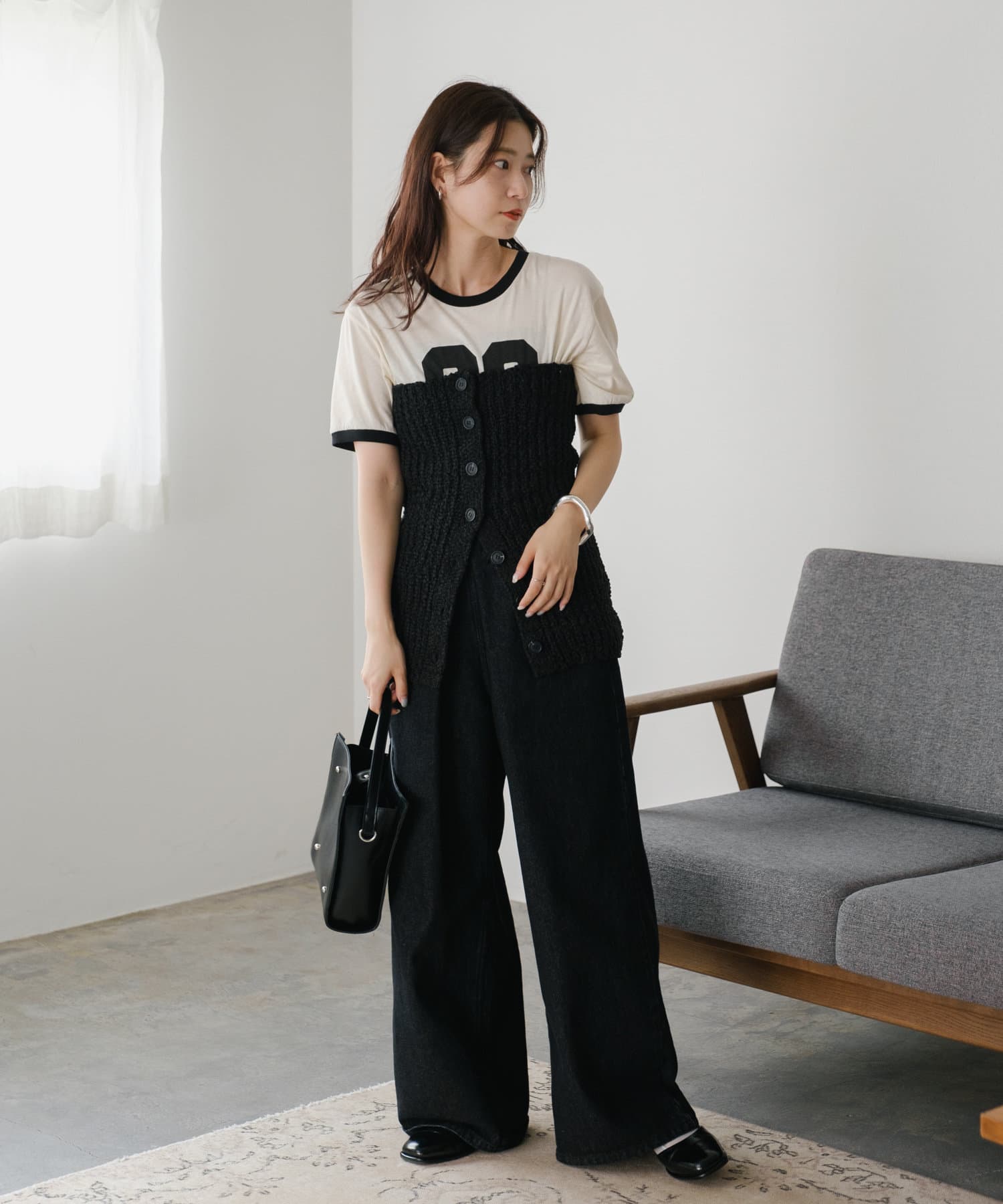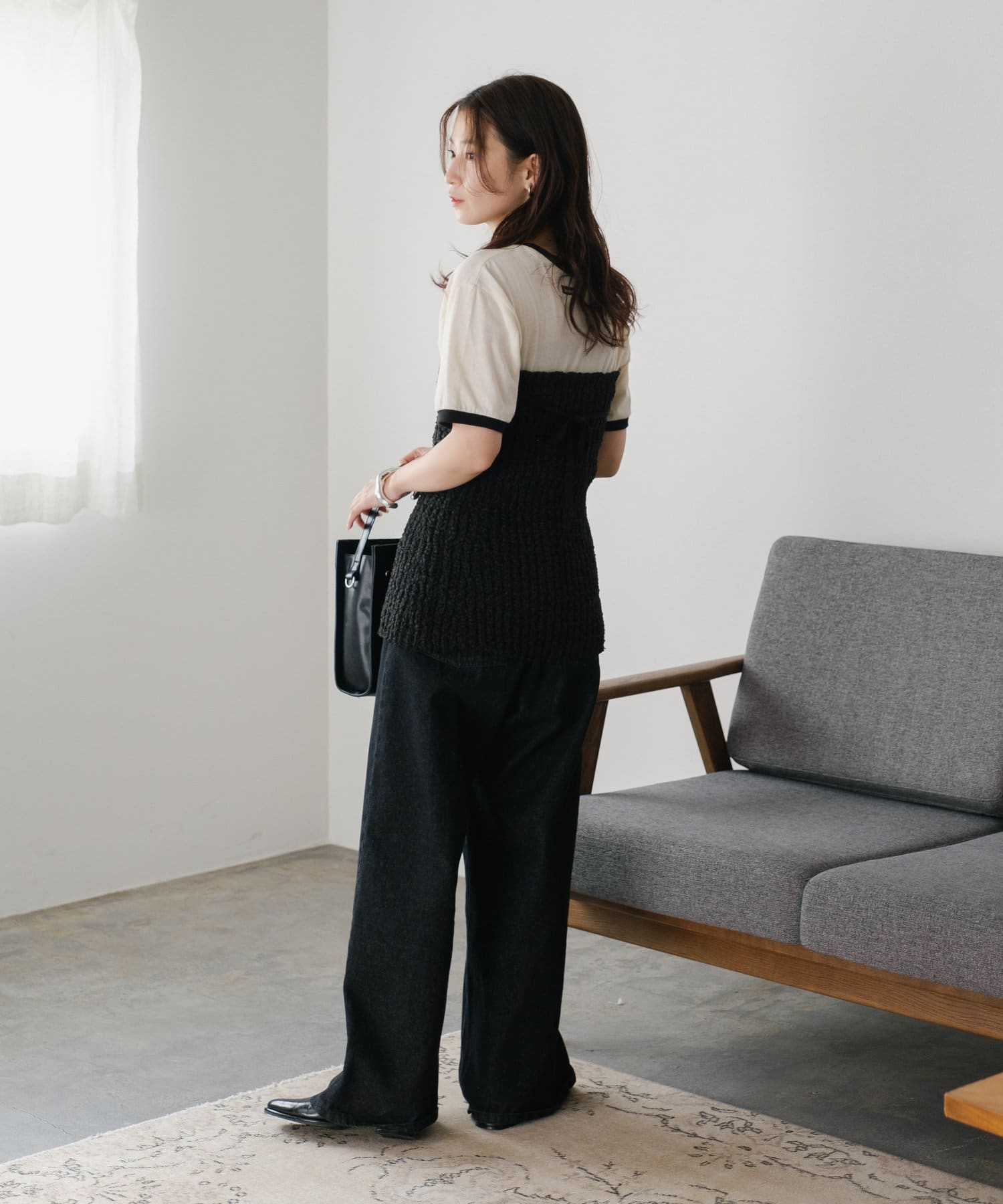 タイトなシルエットになるので、ボリューム感のあるボトムと相性◎
