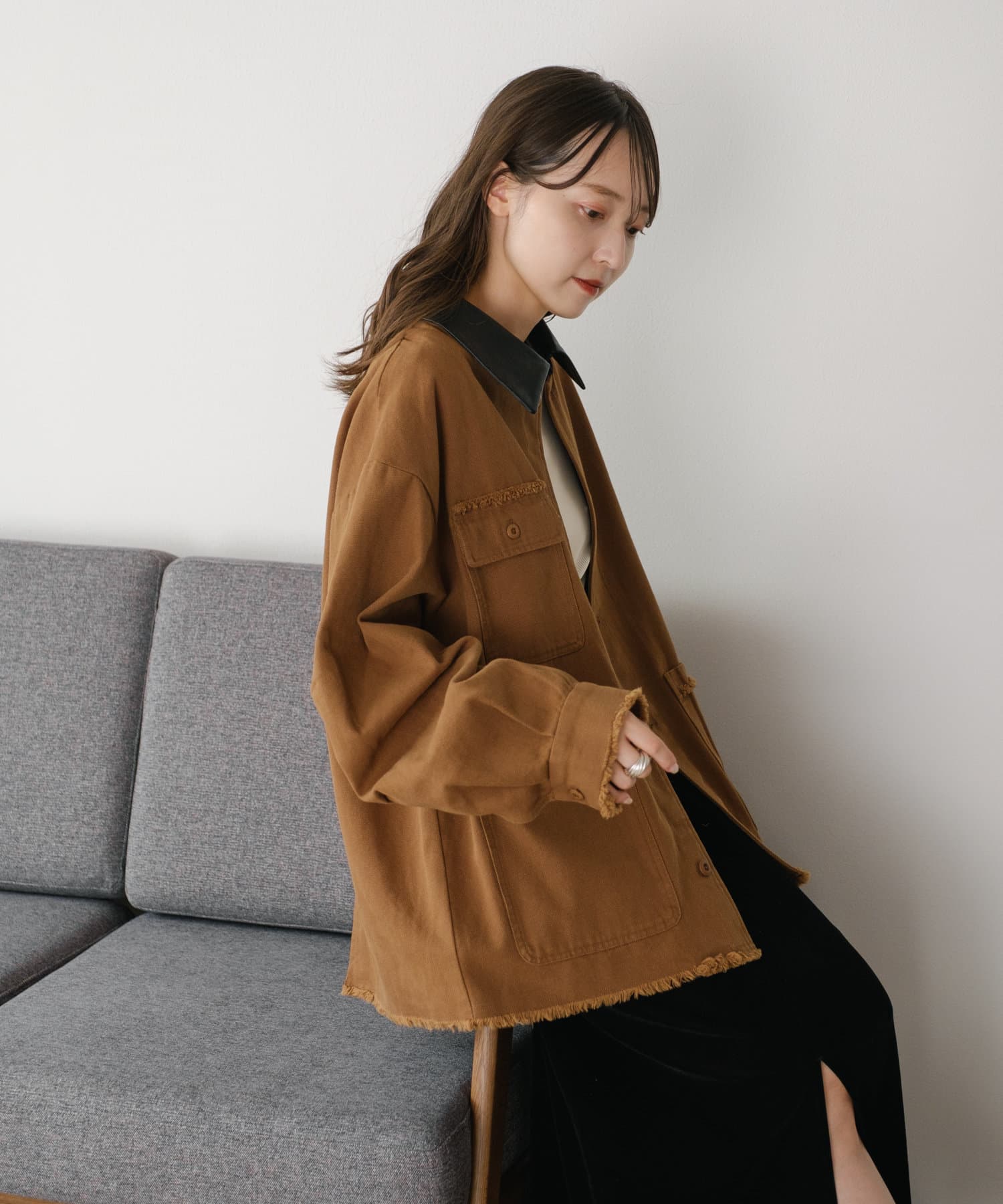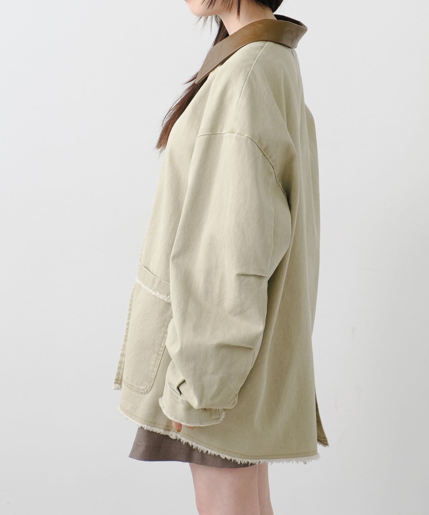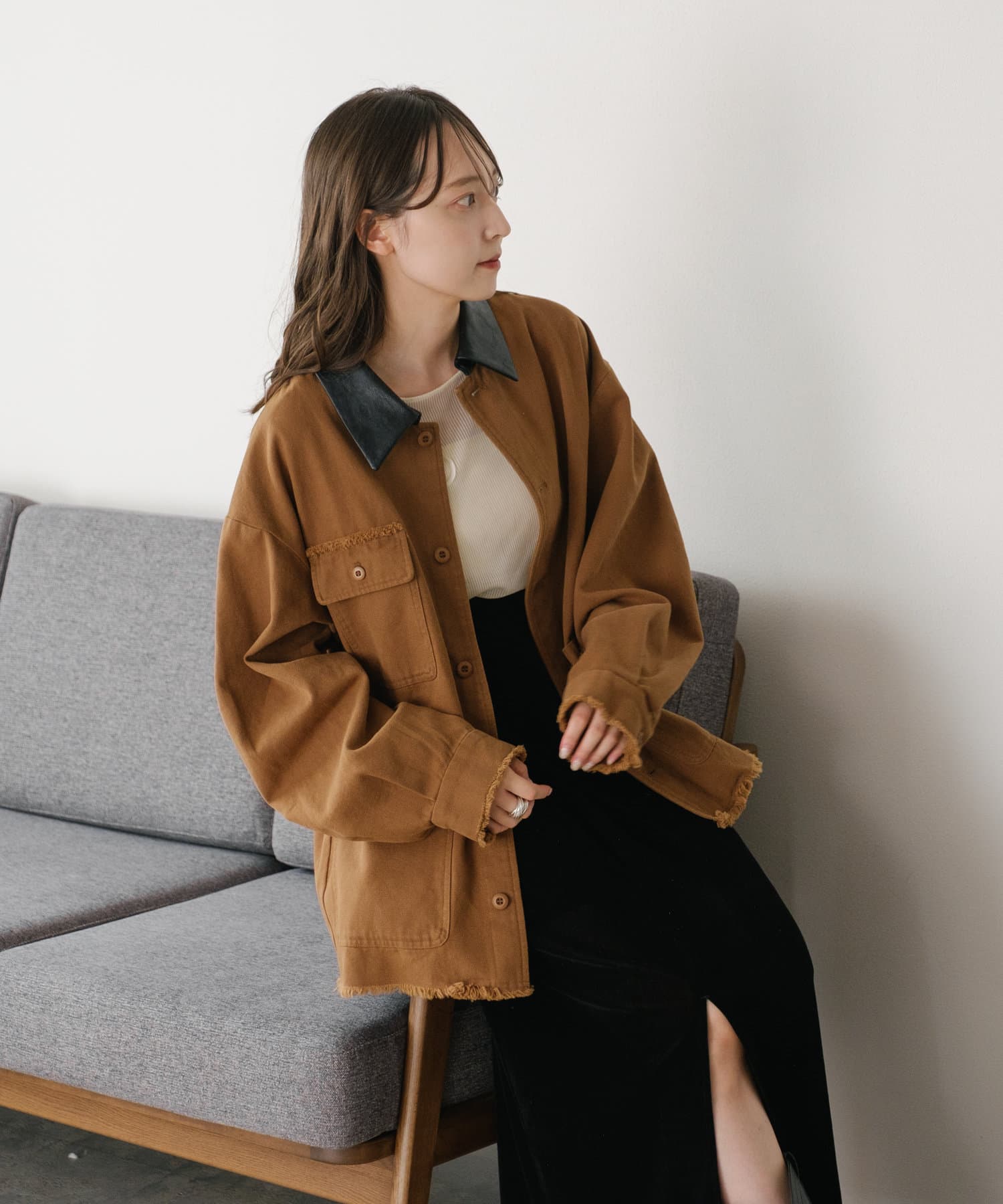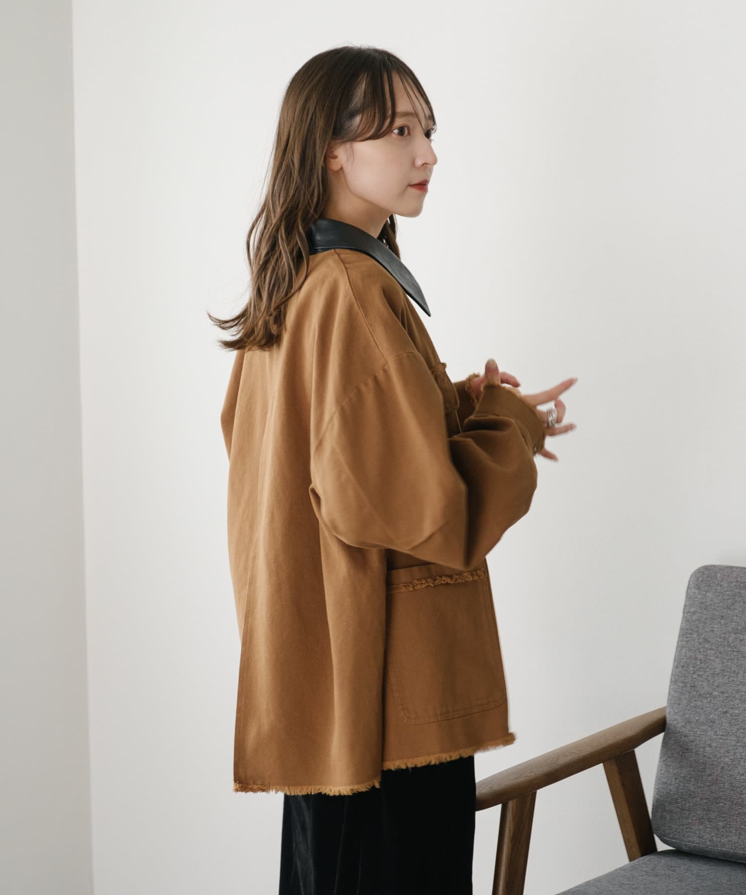 断ち切りのデザインではありますが、襟周りはフェイクレザーなのでラフになりすぎません。