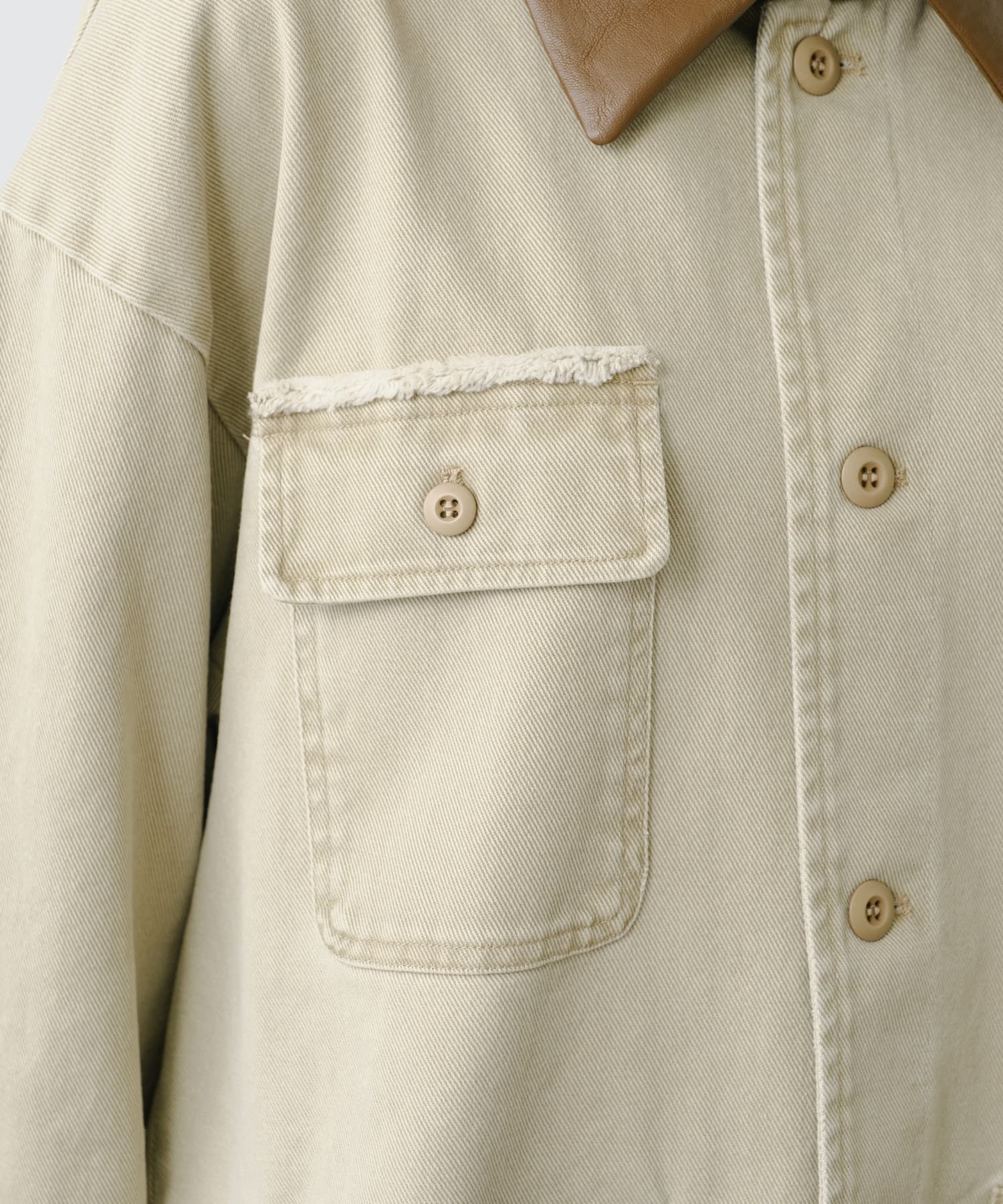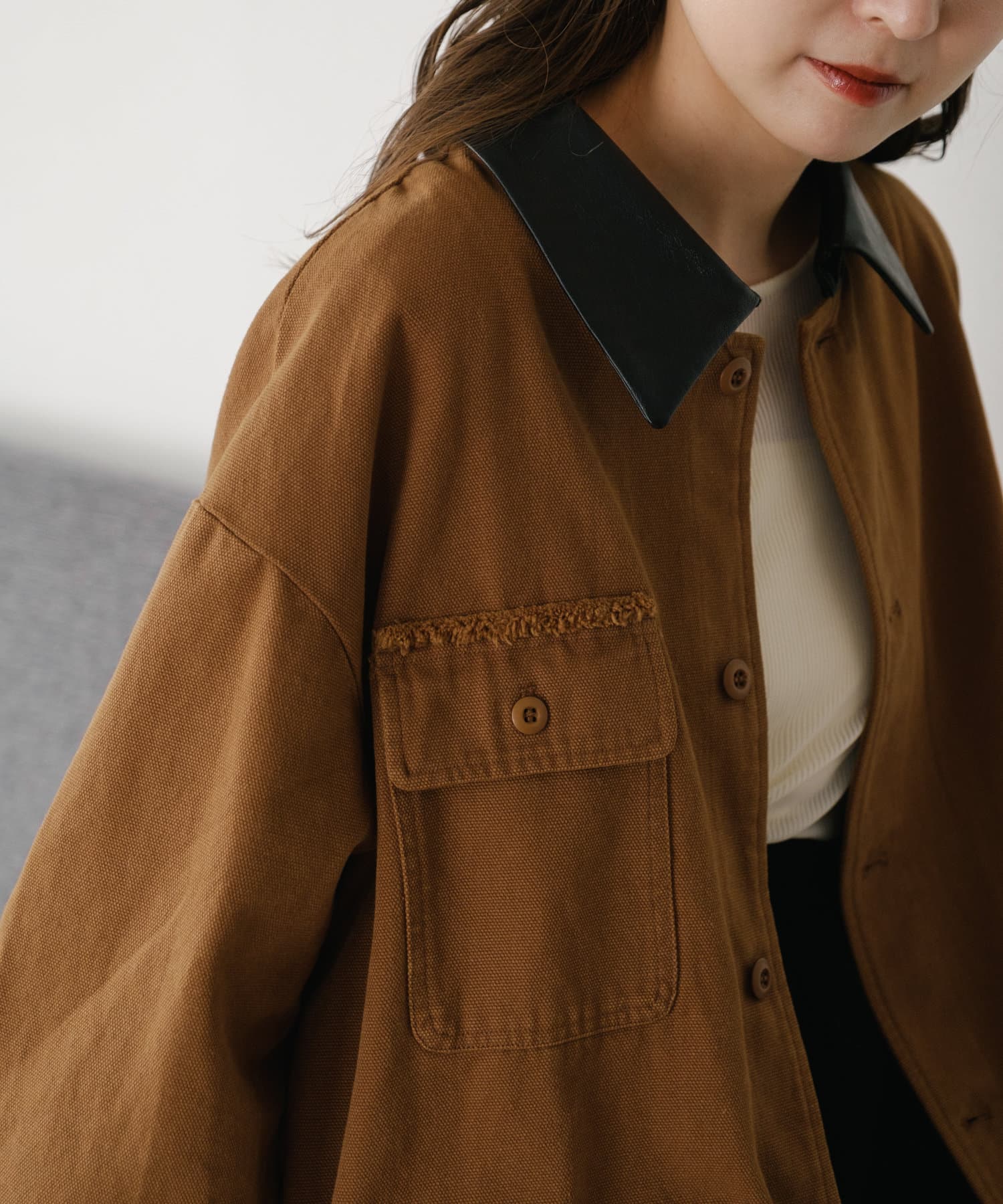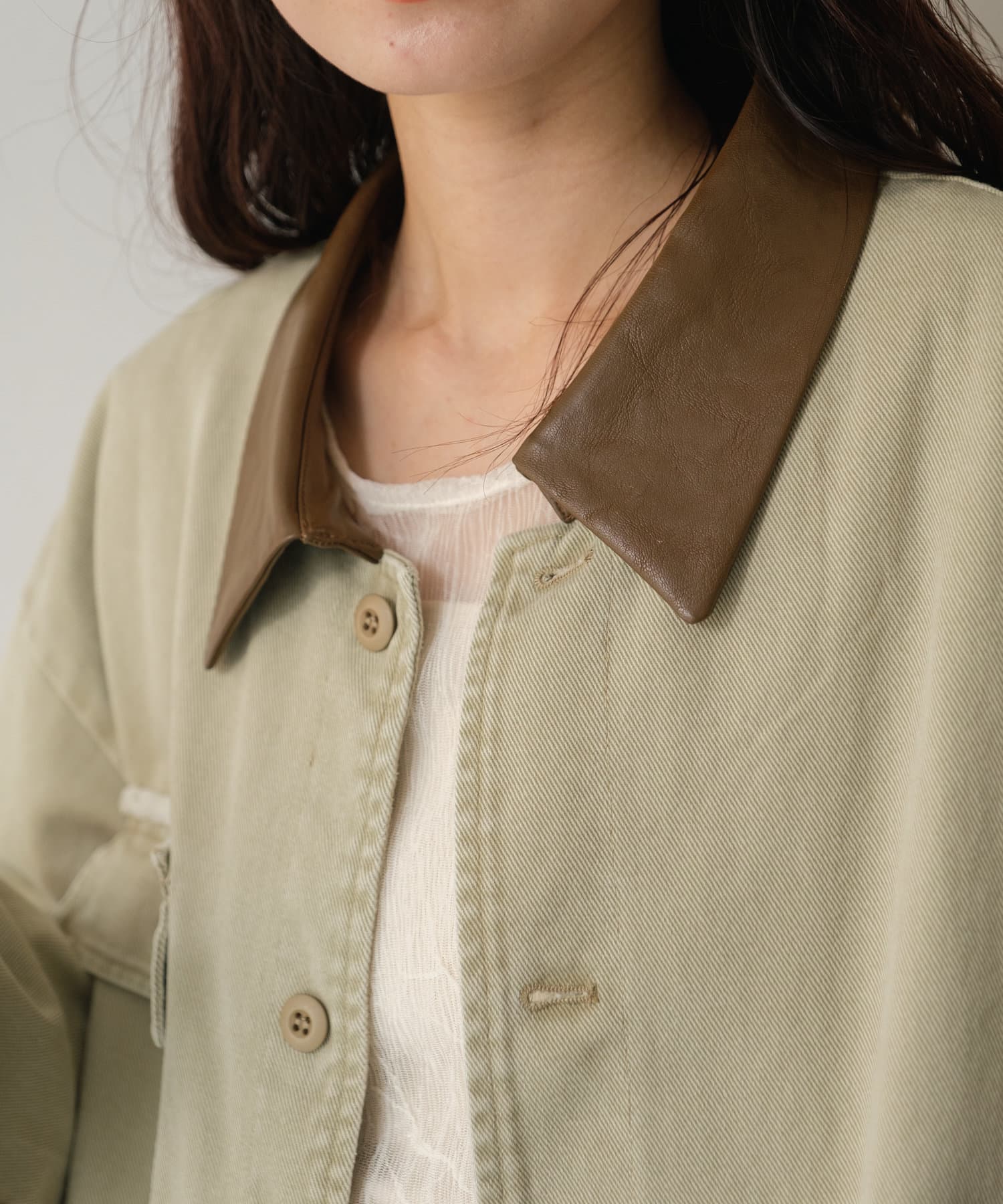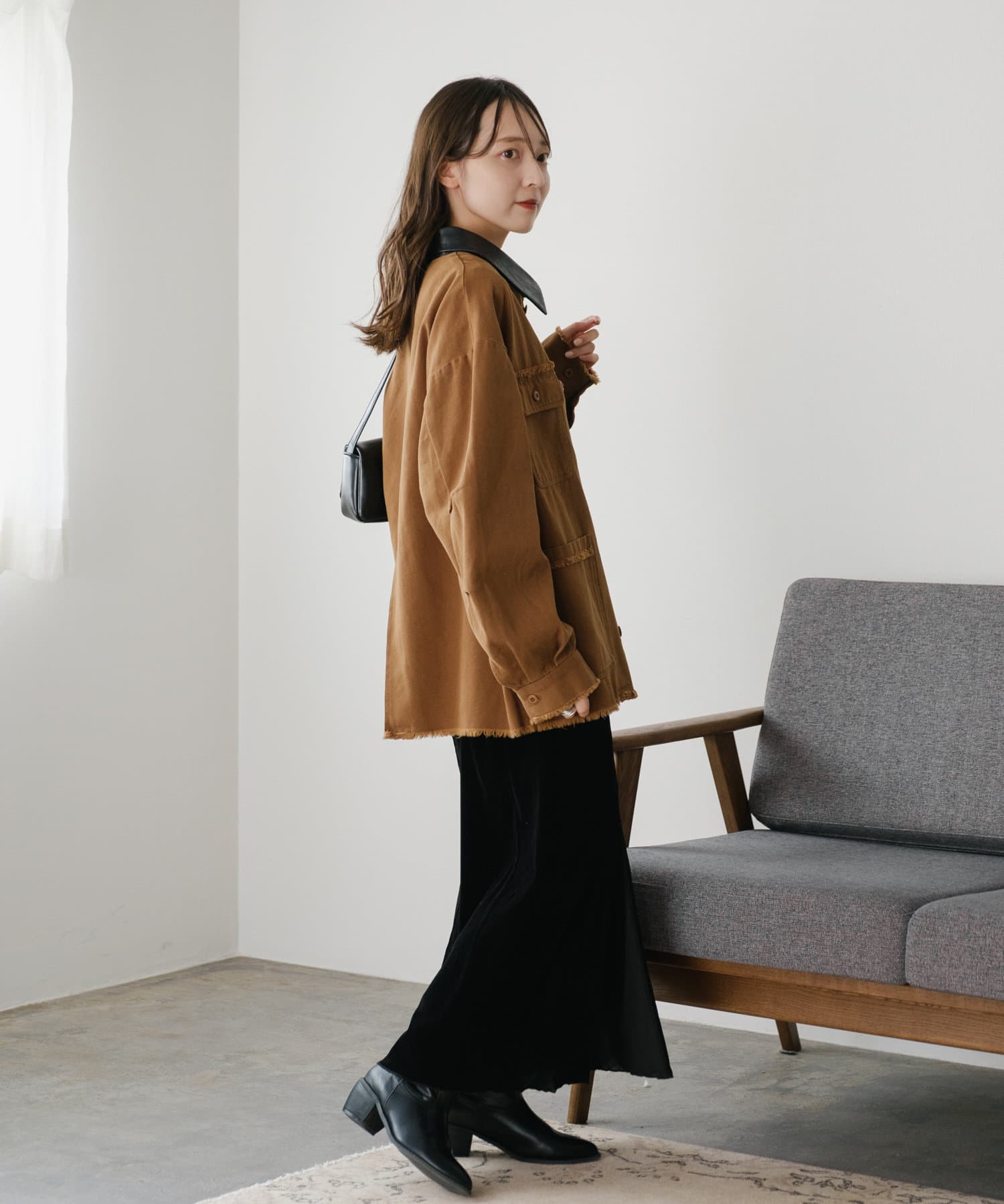 断ち切りのデザインではありますが、襟周りはフェイクレザーなのでラフになりすぎません。