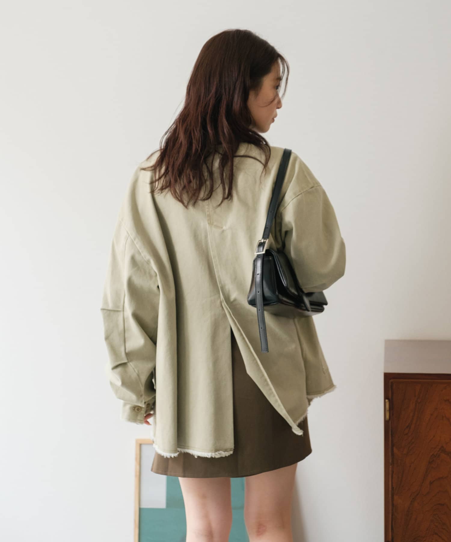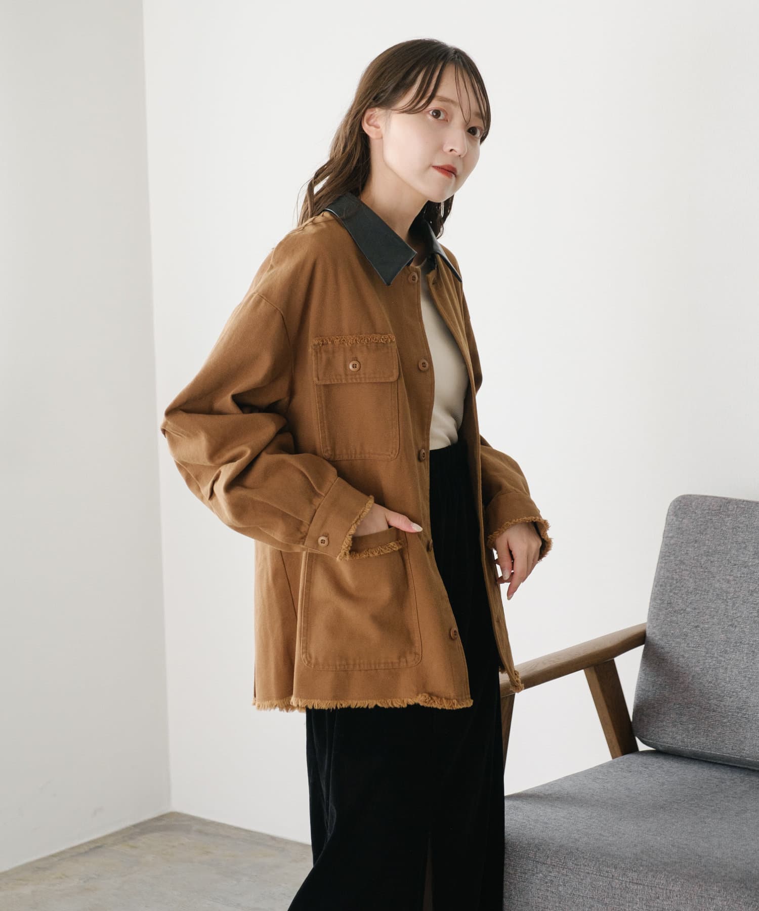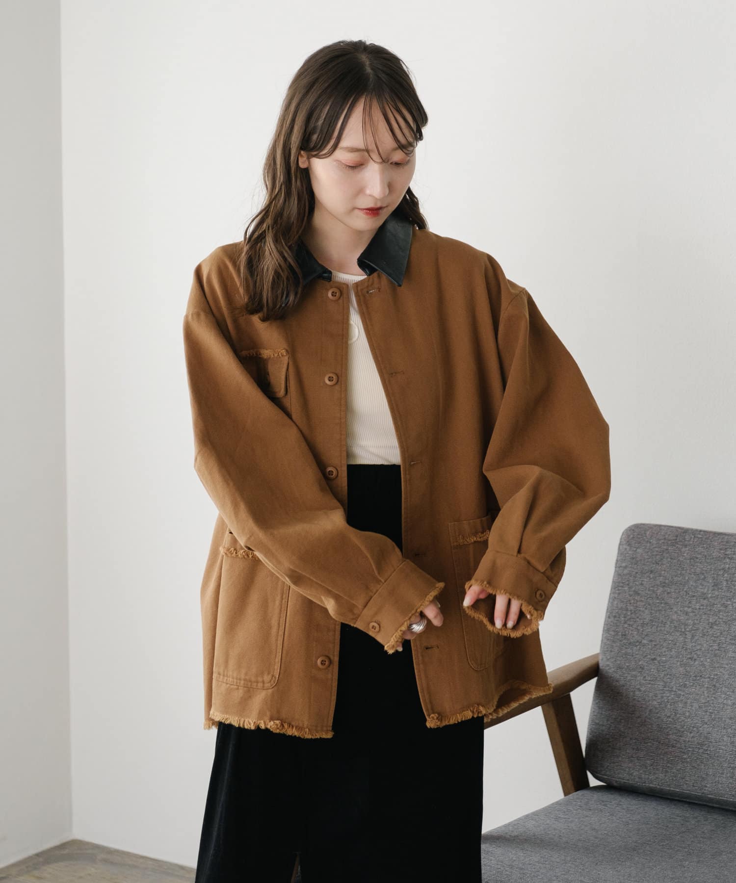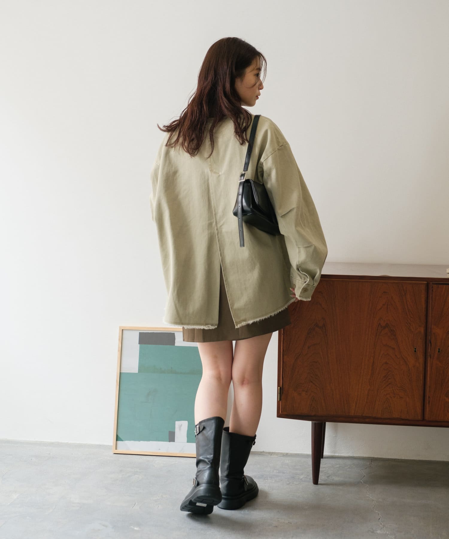 断ち切りのデザインではありますが、襟周りはフェイクレザーなのでラフになりすぎません。