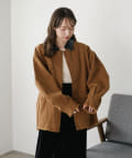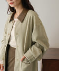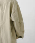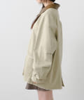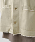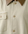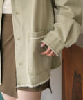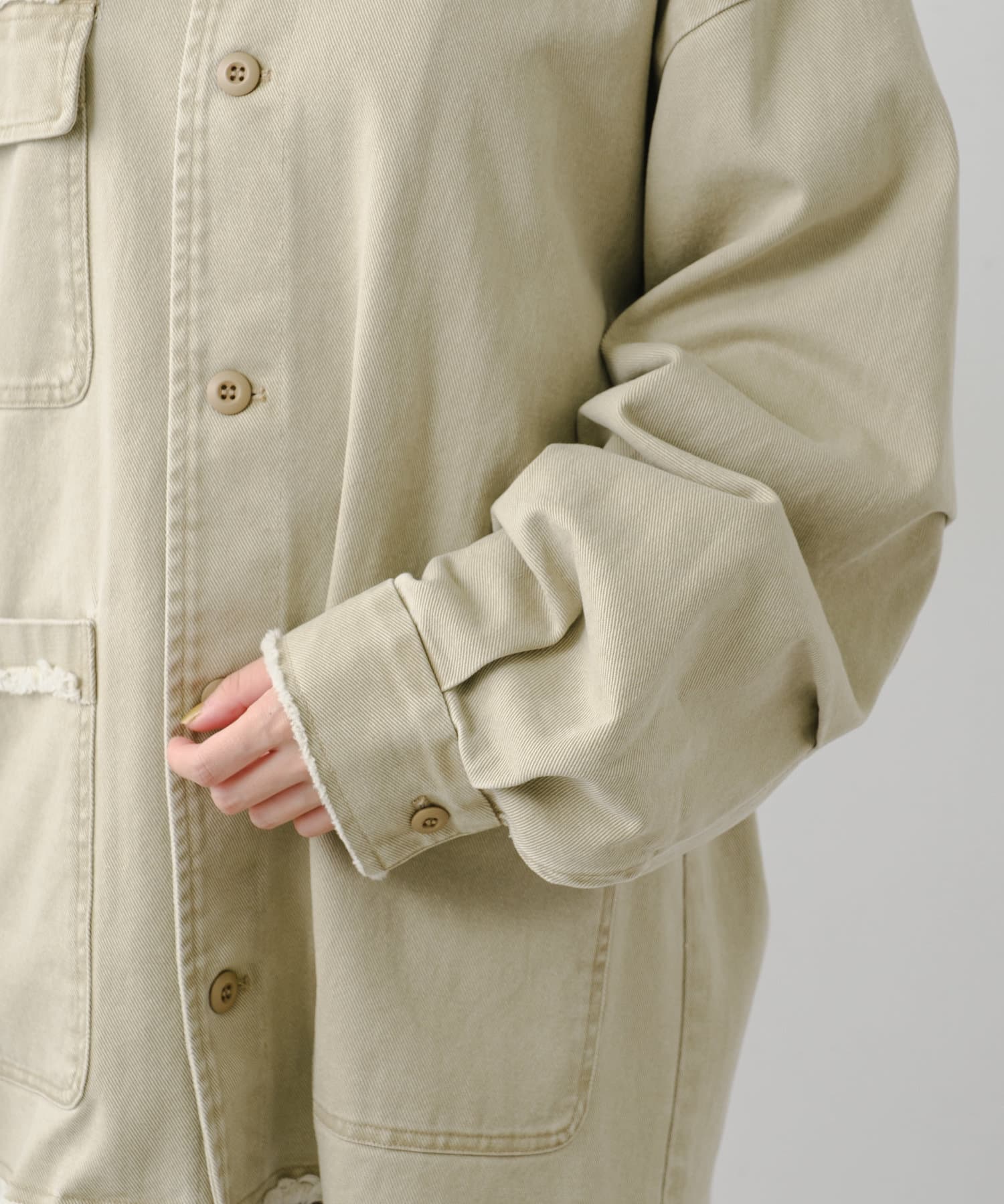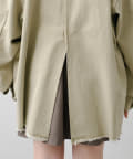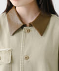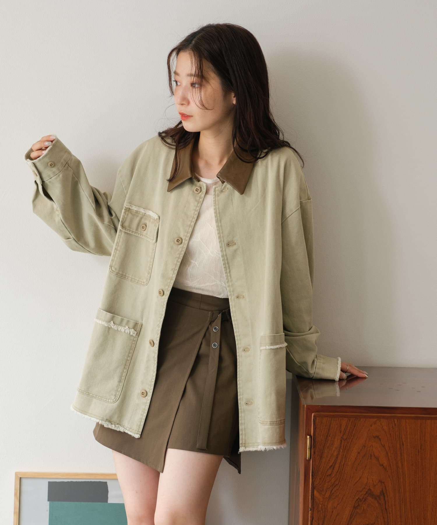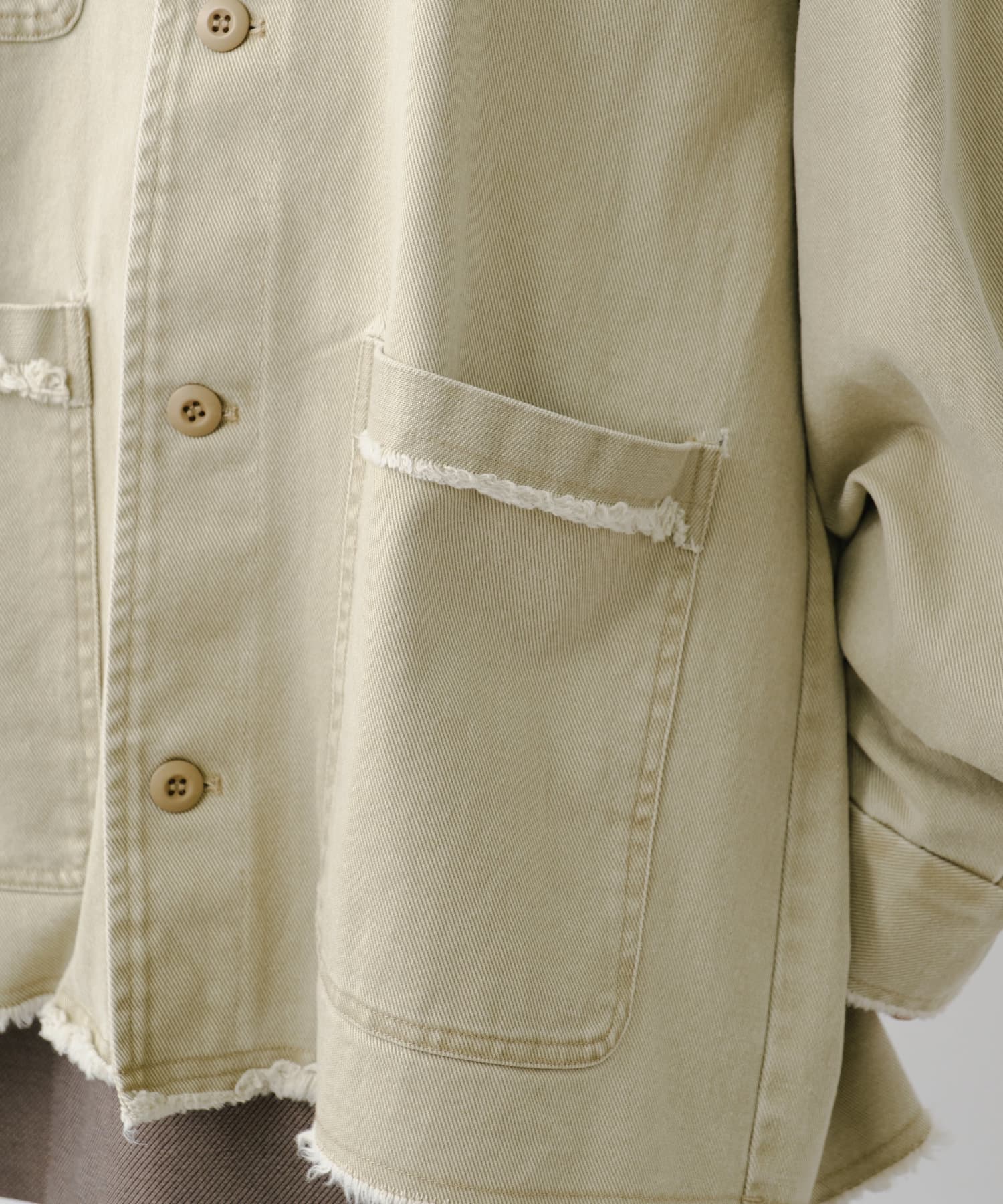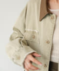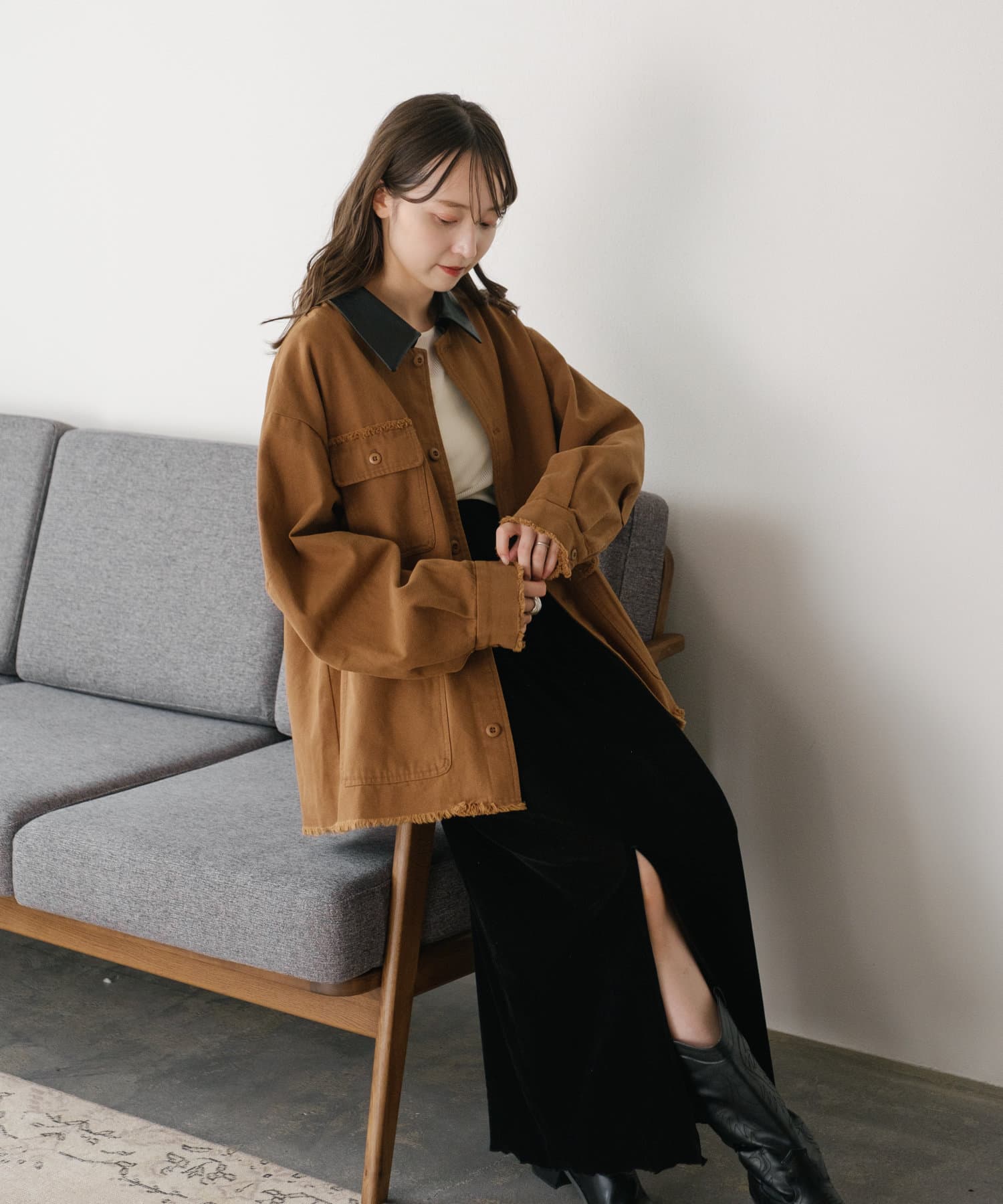 断ち切りのデザインではありますが、襟周りはフェイクレザーなのでラフになりすぎません。