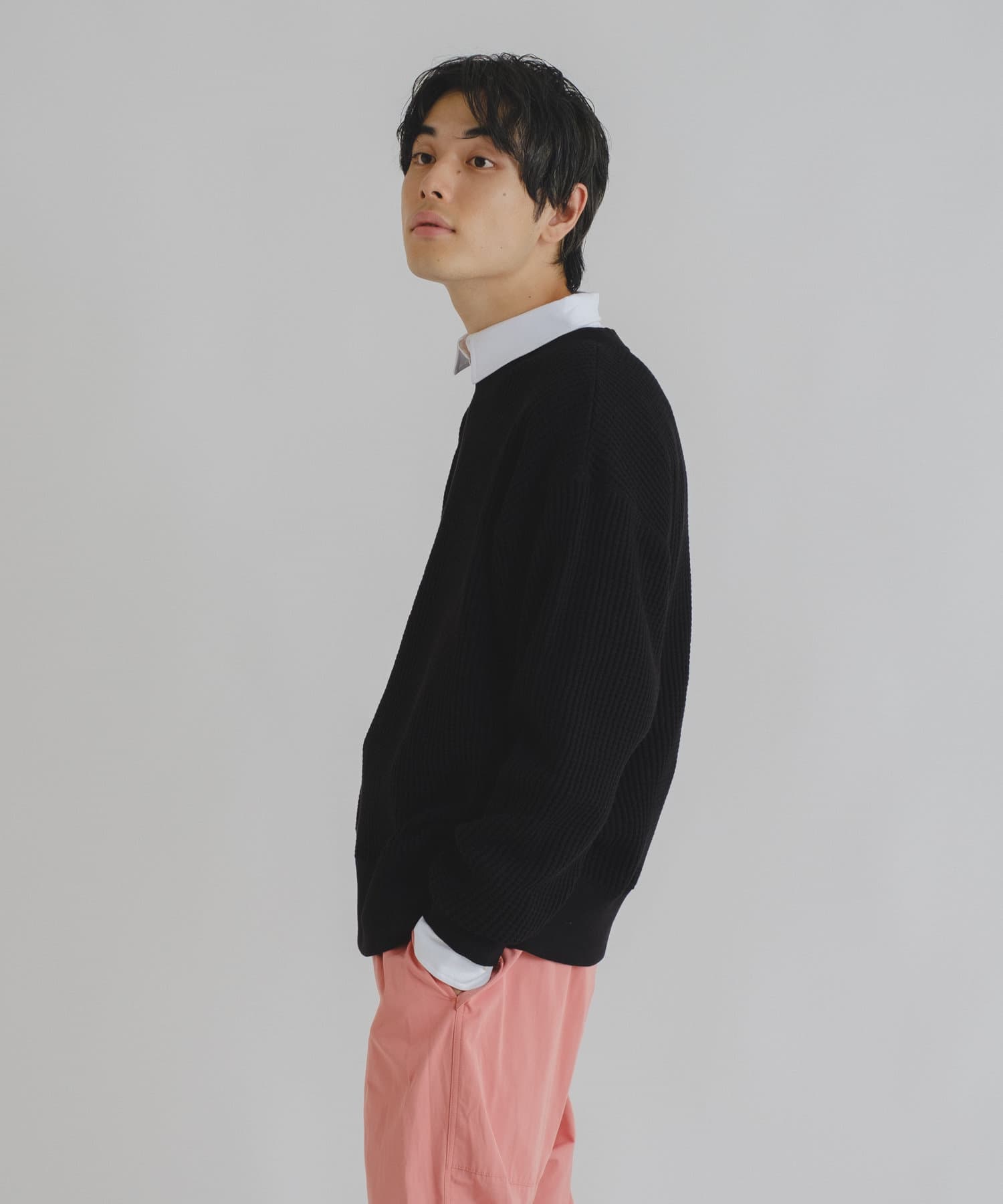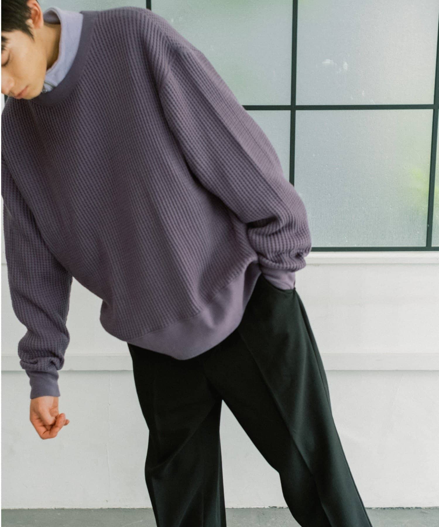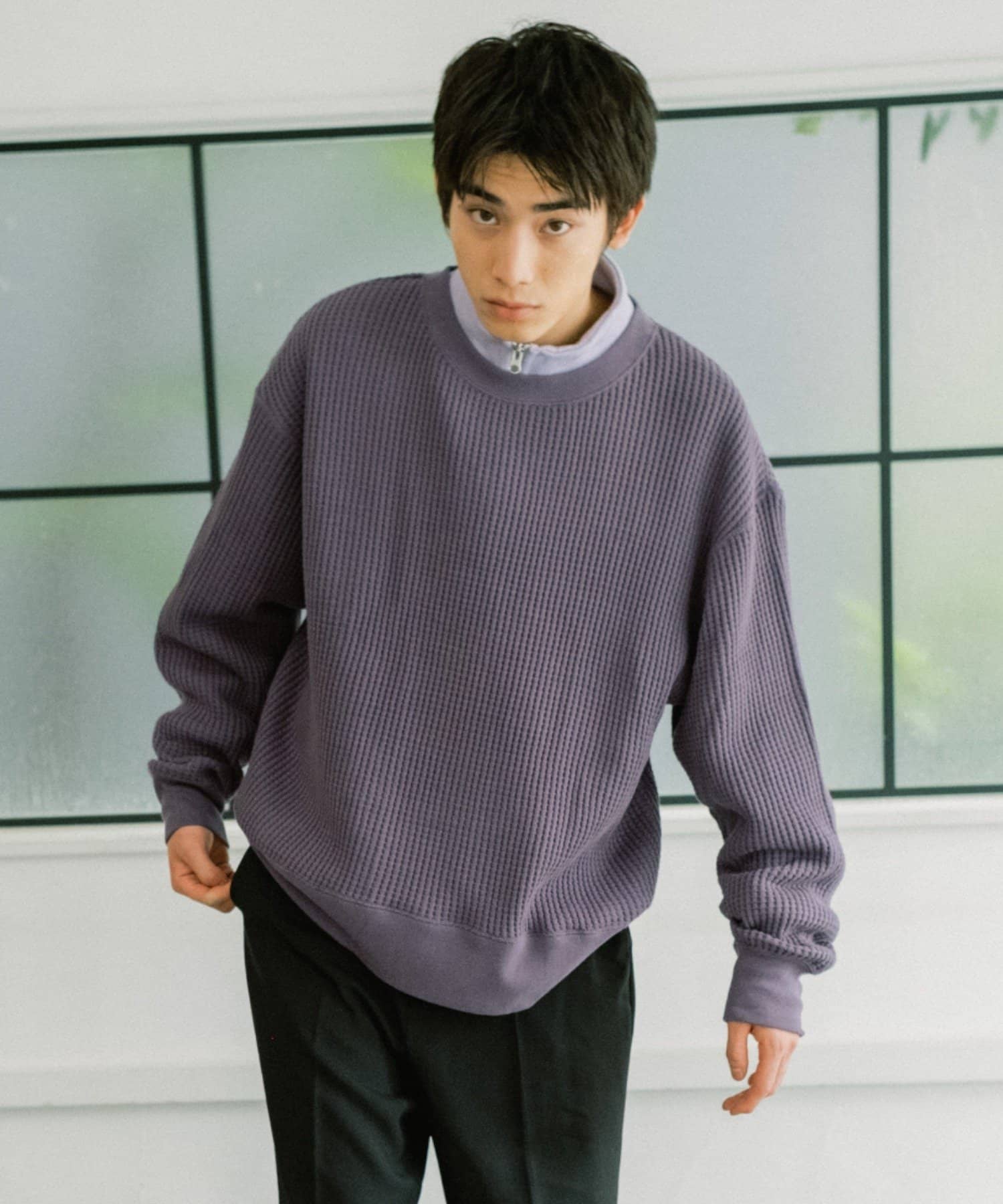 シンプルながらも素材感が引き立つワッフルプルオーバー。