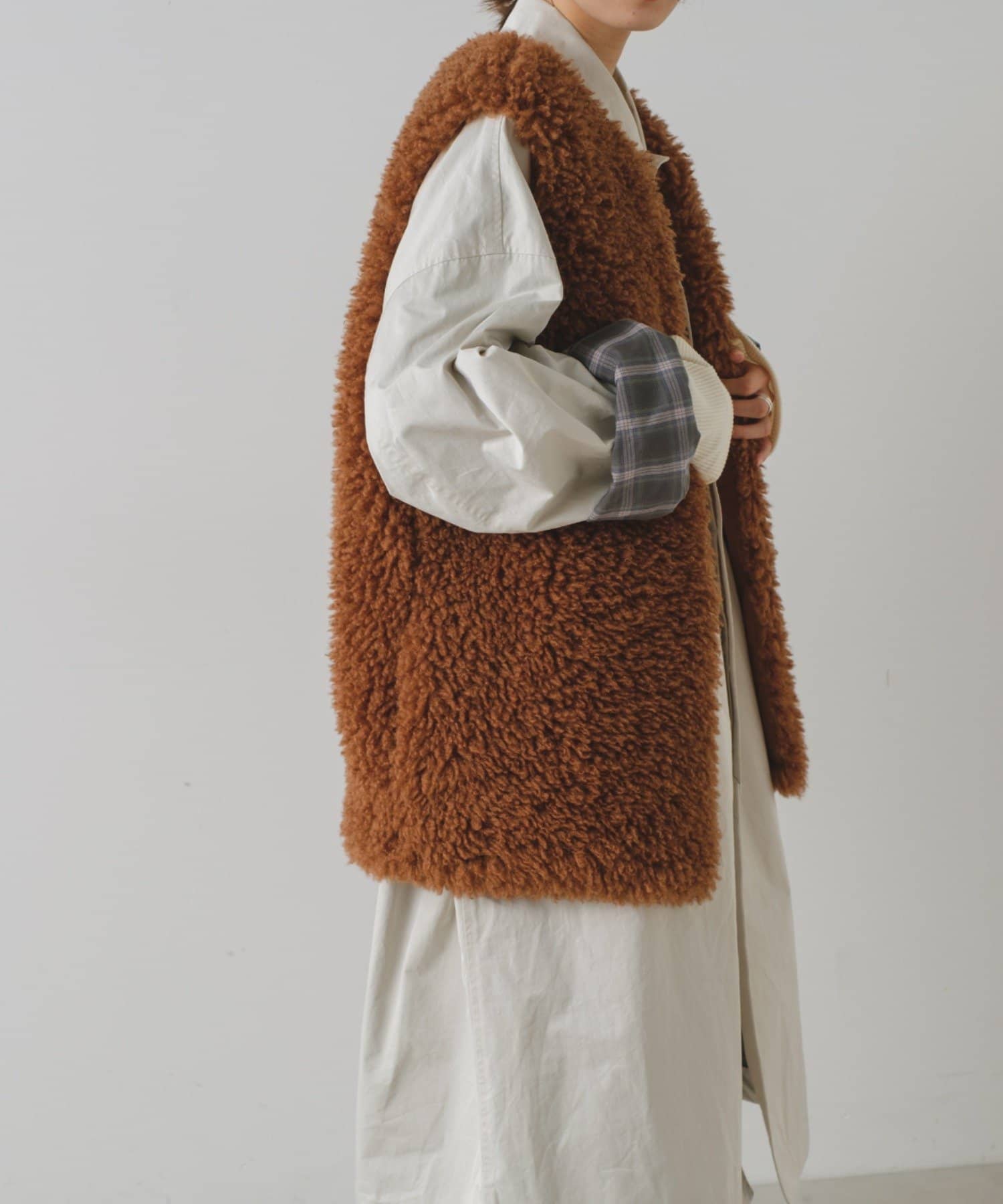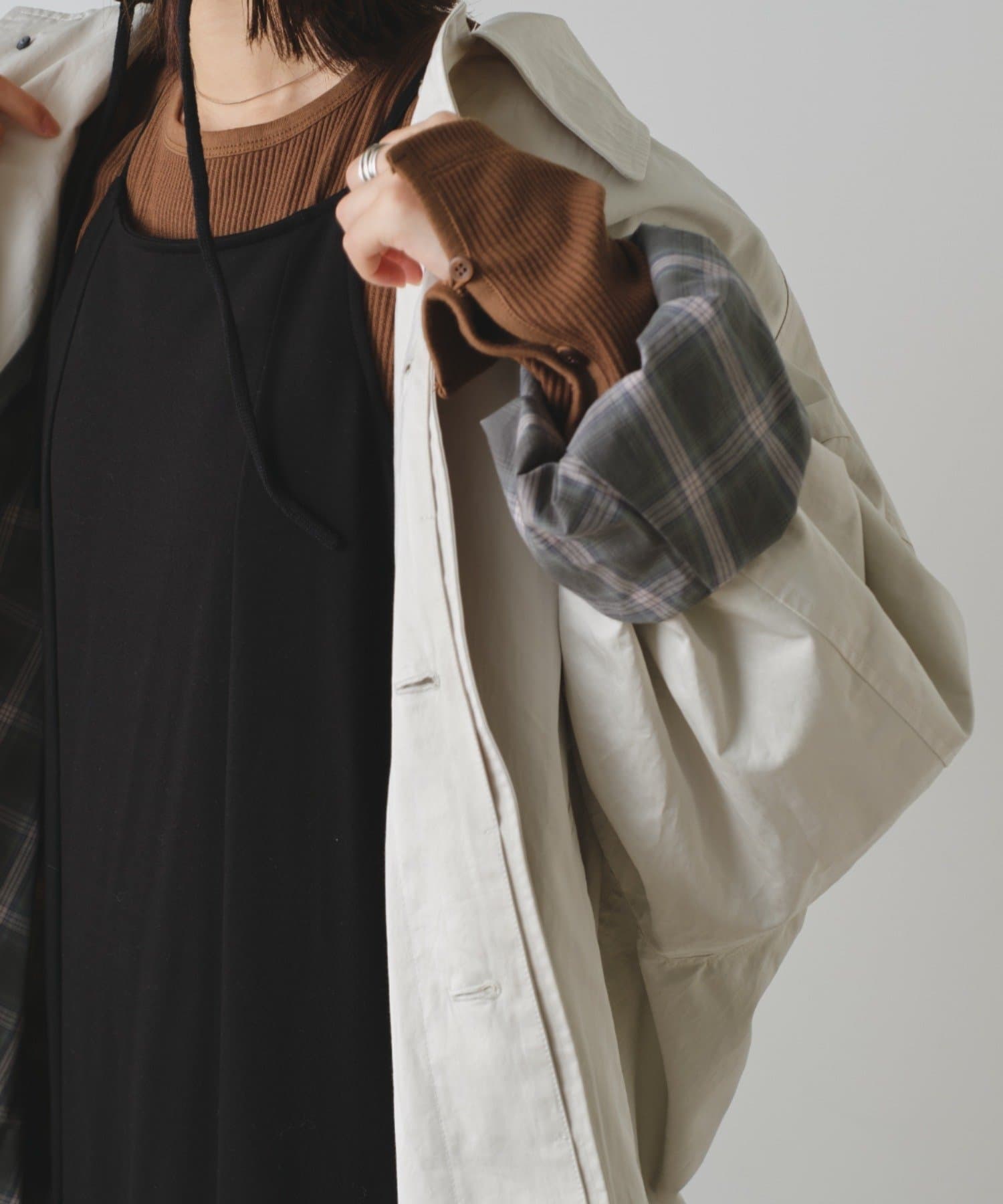 ジャケットやスウェットパーカーの上から羽織ることもできるシルエットで、