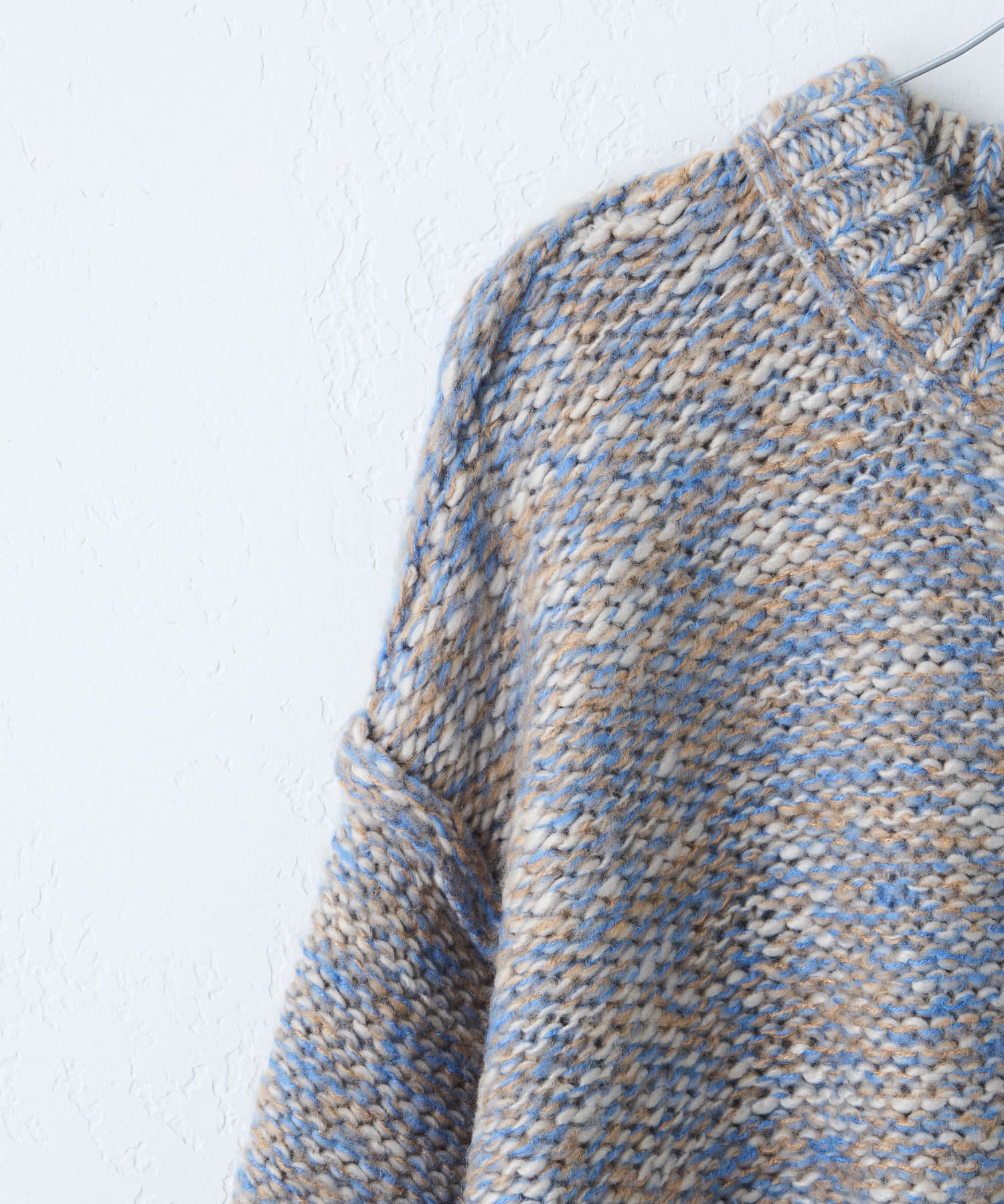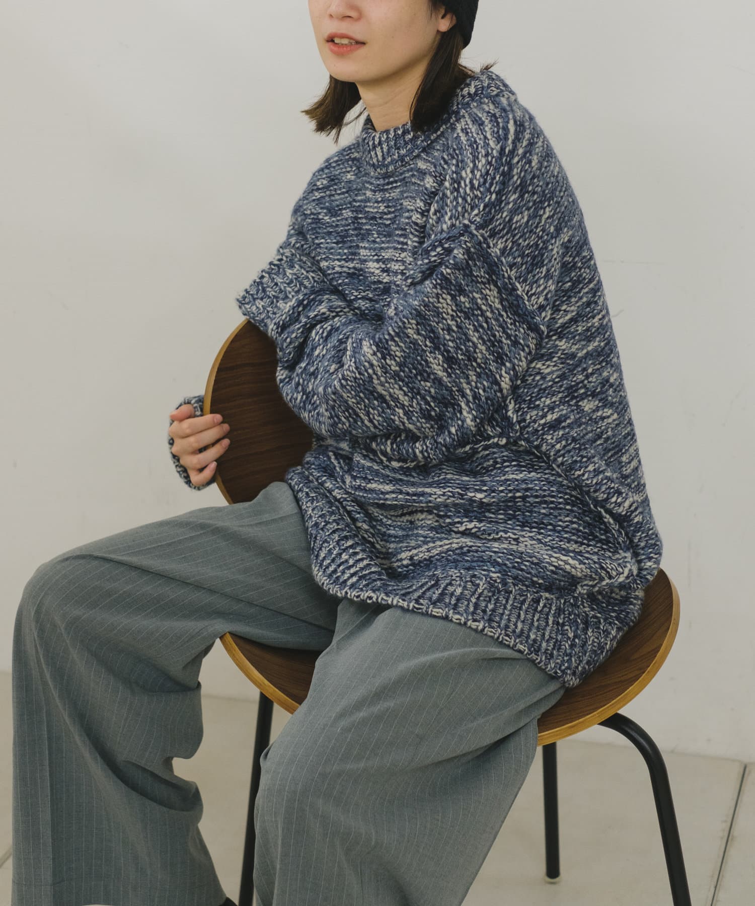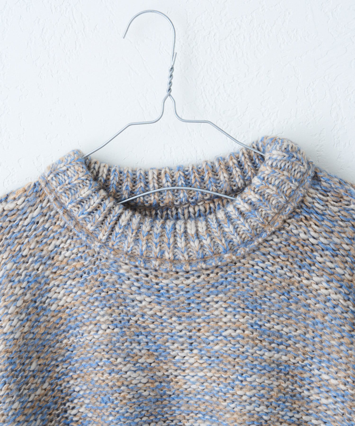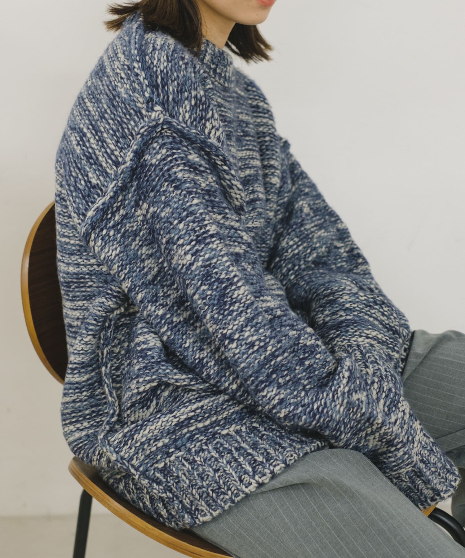 ミックス糸をローゲージでざっくりと編み上げた裏目編み使いのニットプルオーバーです。