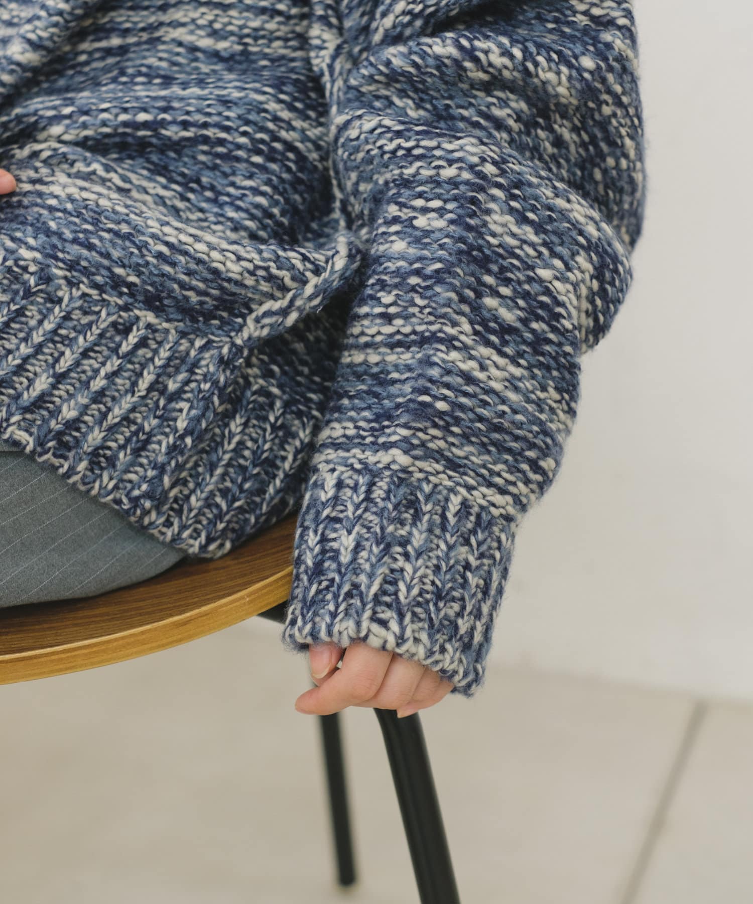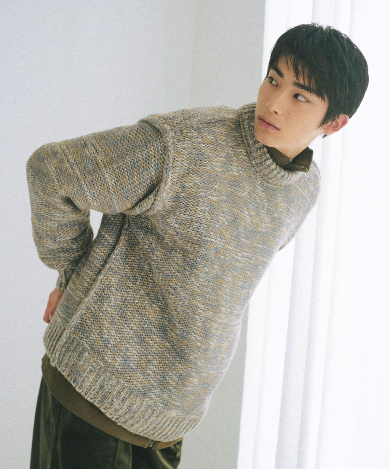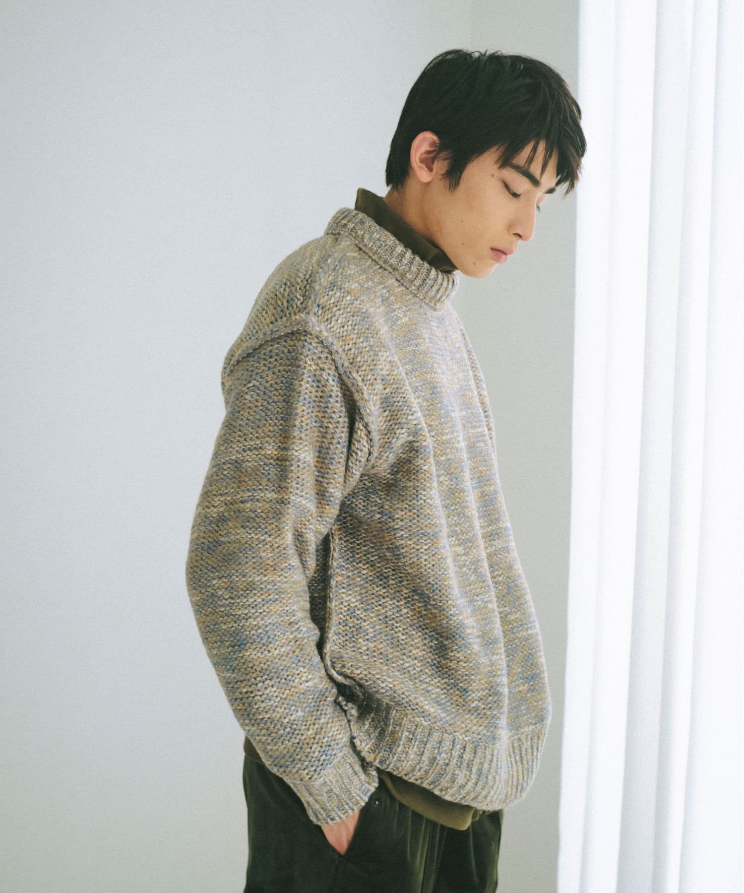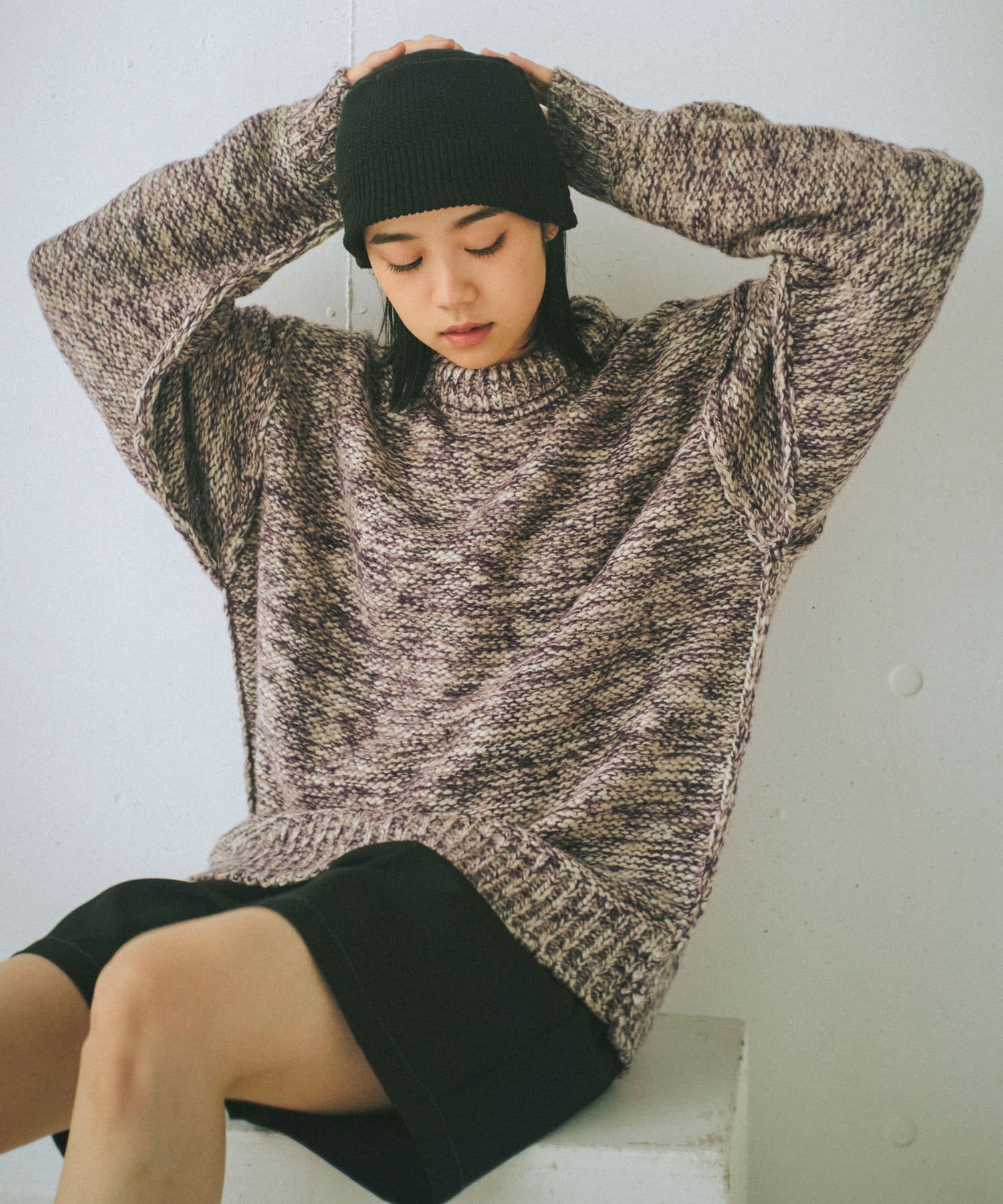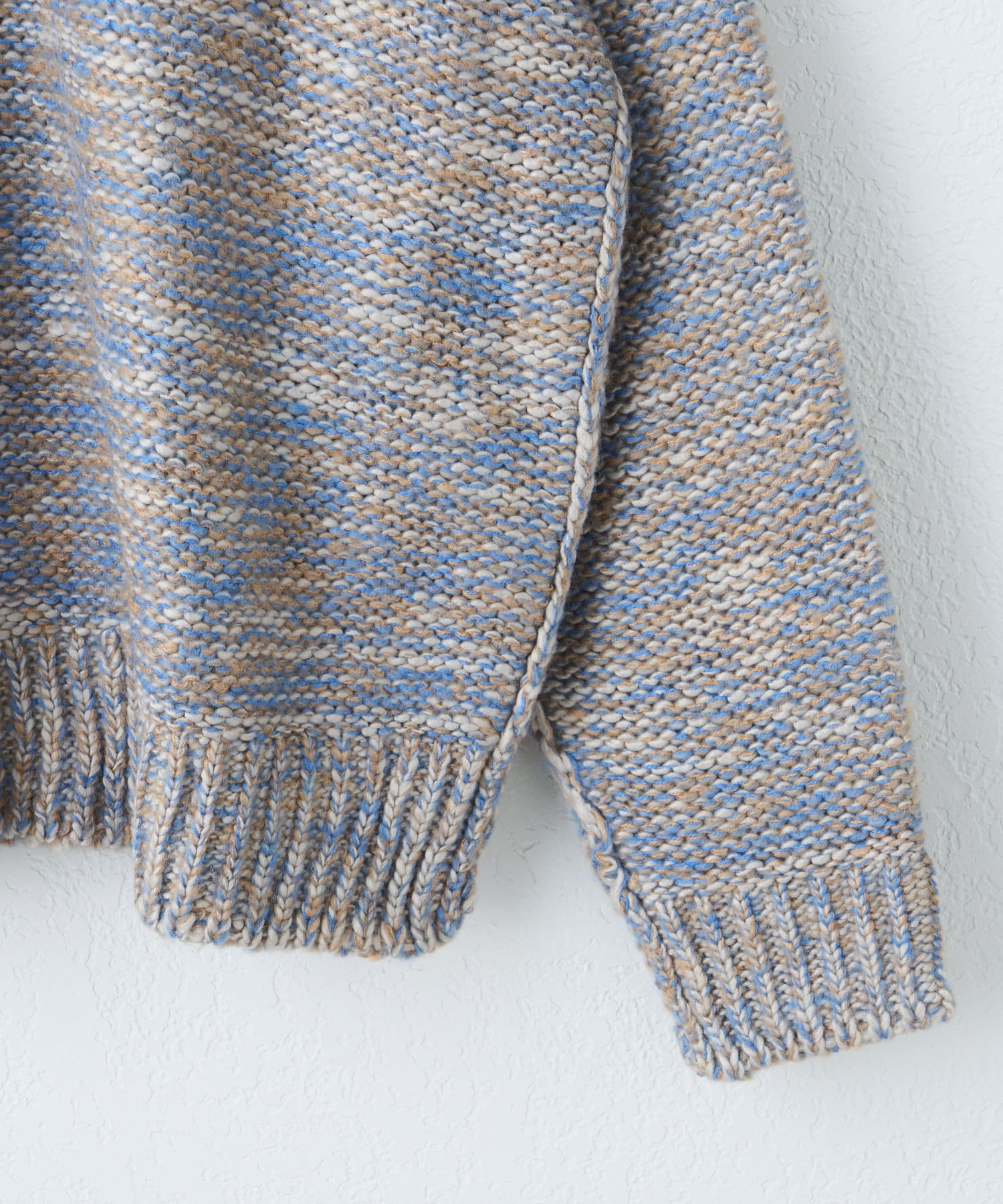 ミックス糸をローゲージでざっくりと編み上げた裏目編み使いのニットプルオーバーです。