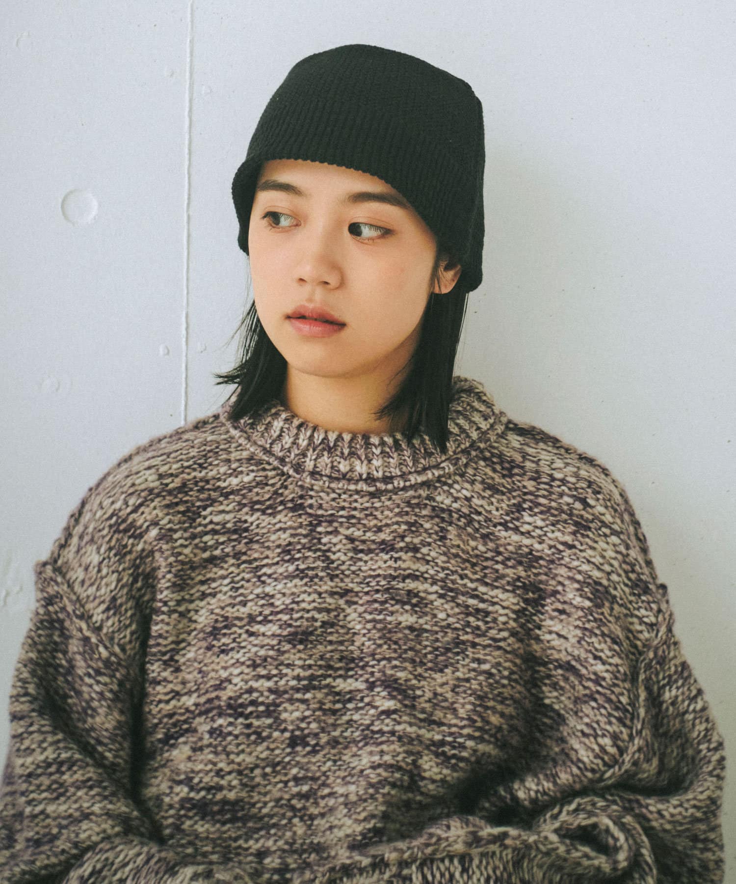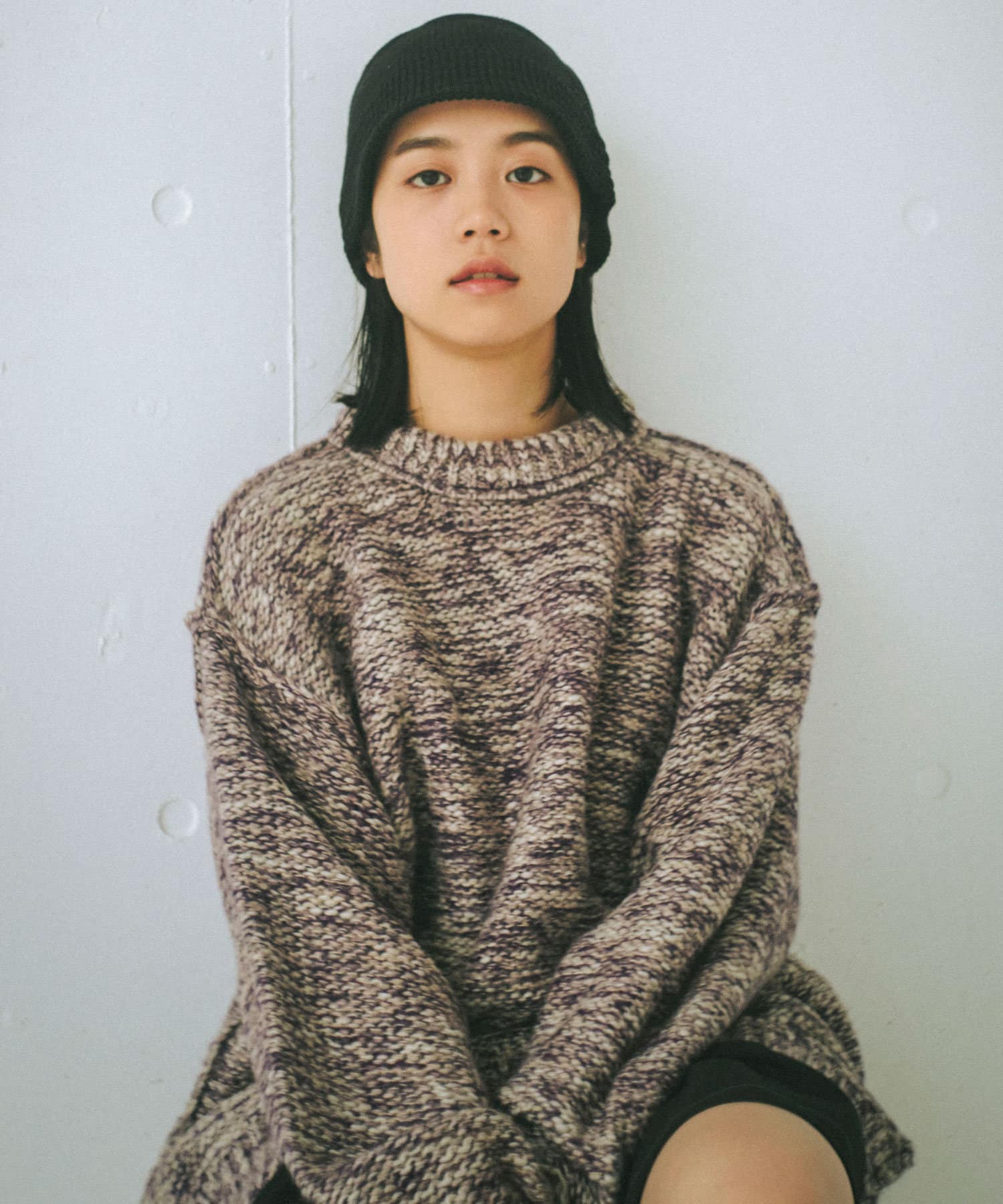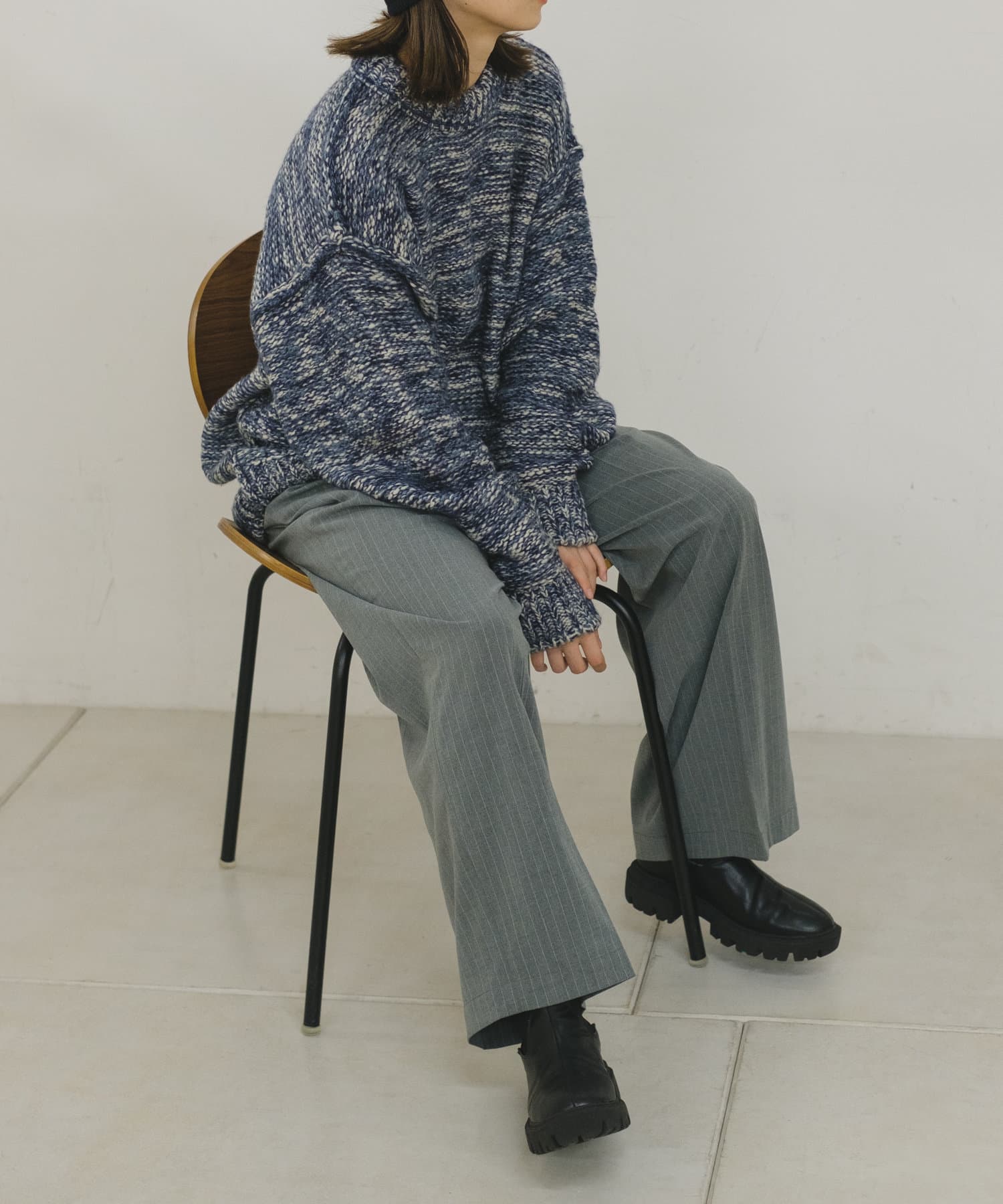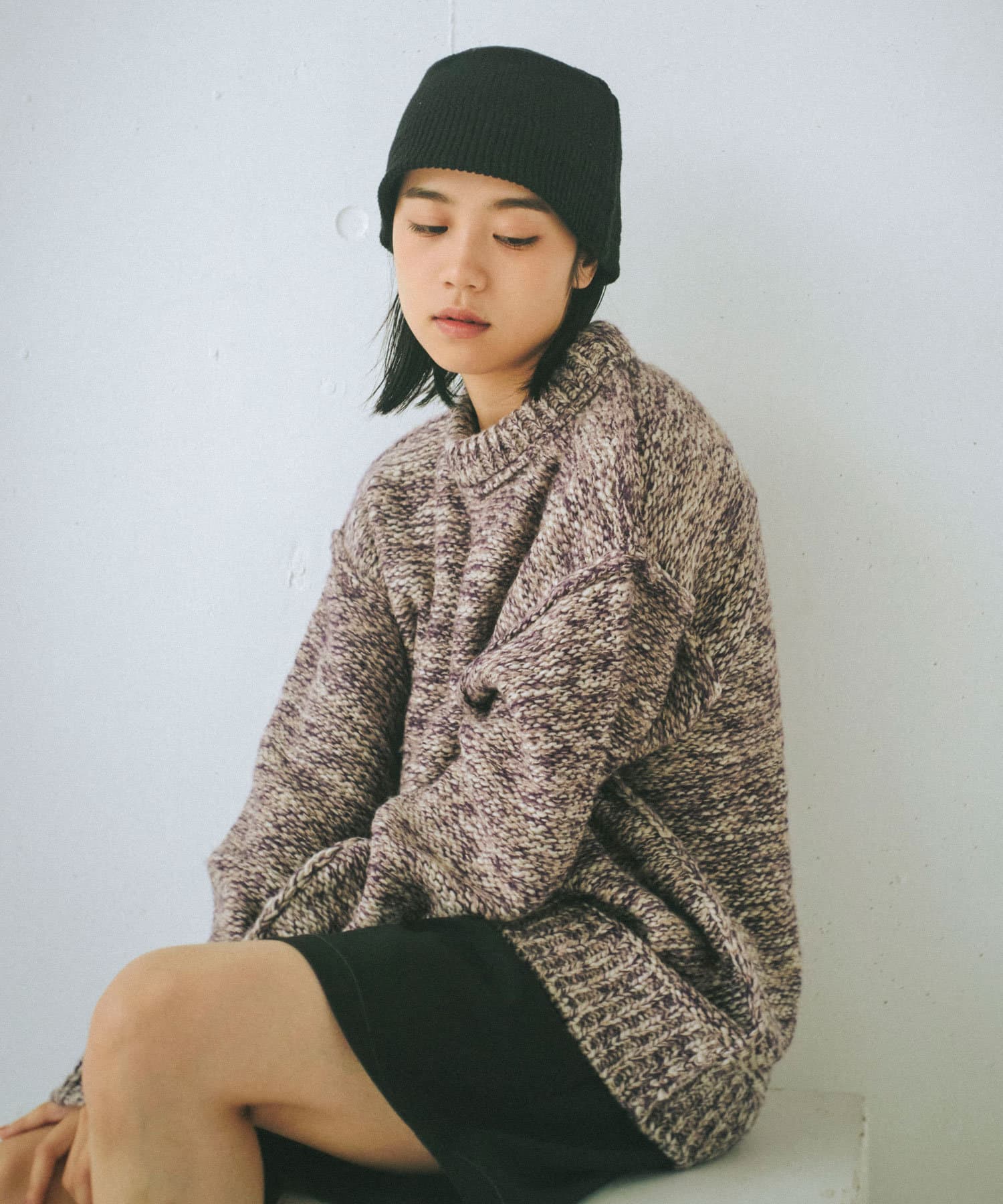 ミックス糸をローゲージでざっくりと編み上げた裏目編み使いのニットプルオーバーです。