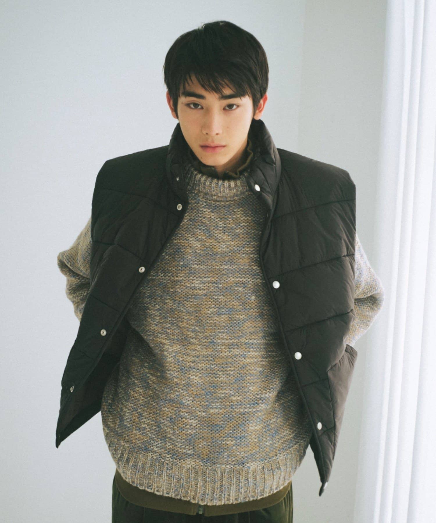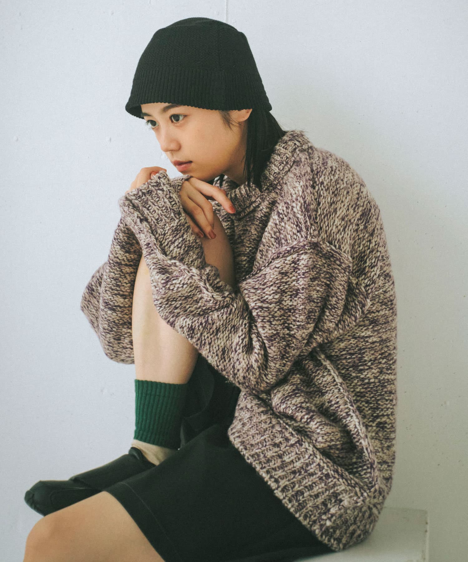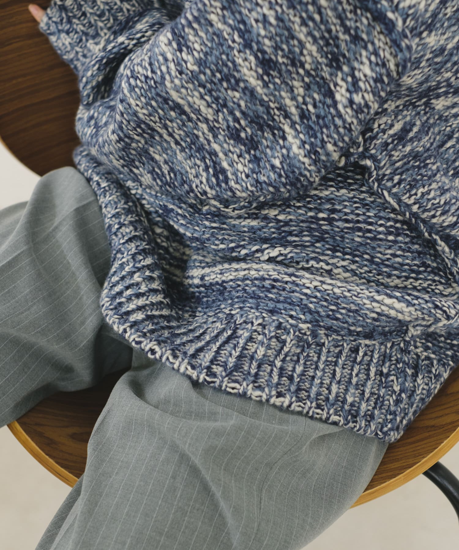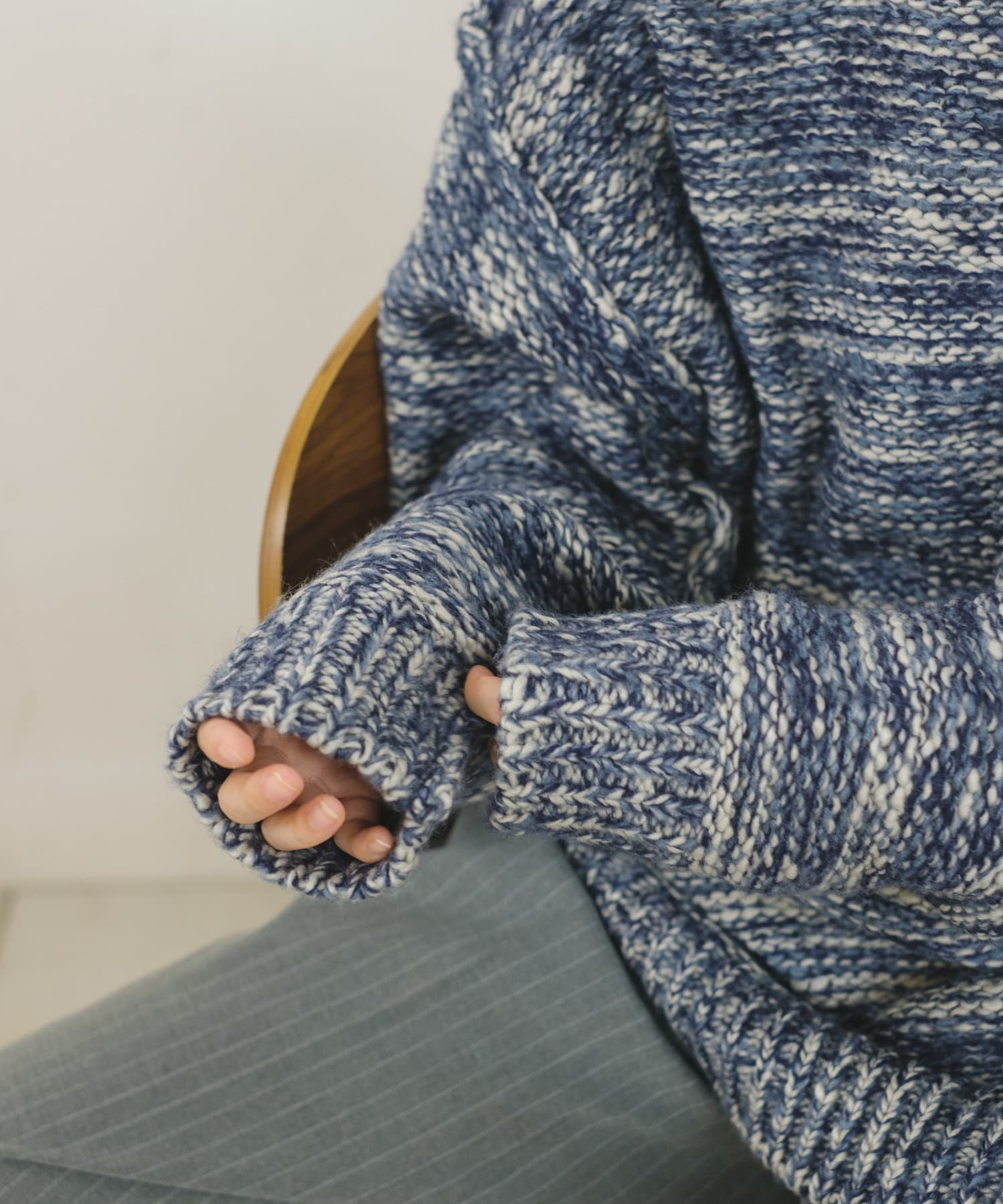 ミックス糸をローゲージでざっくりと編み上げた裏目編み使いのニットプルオーバーです。