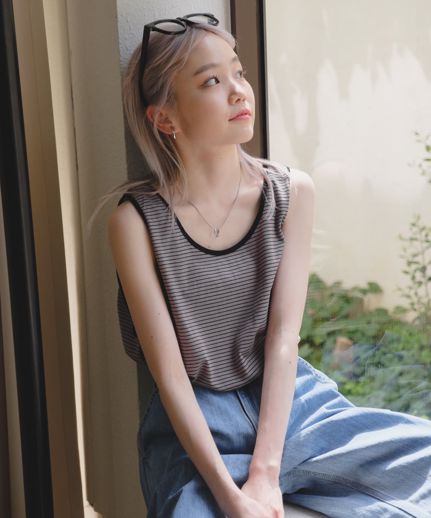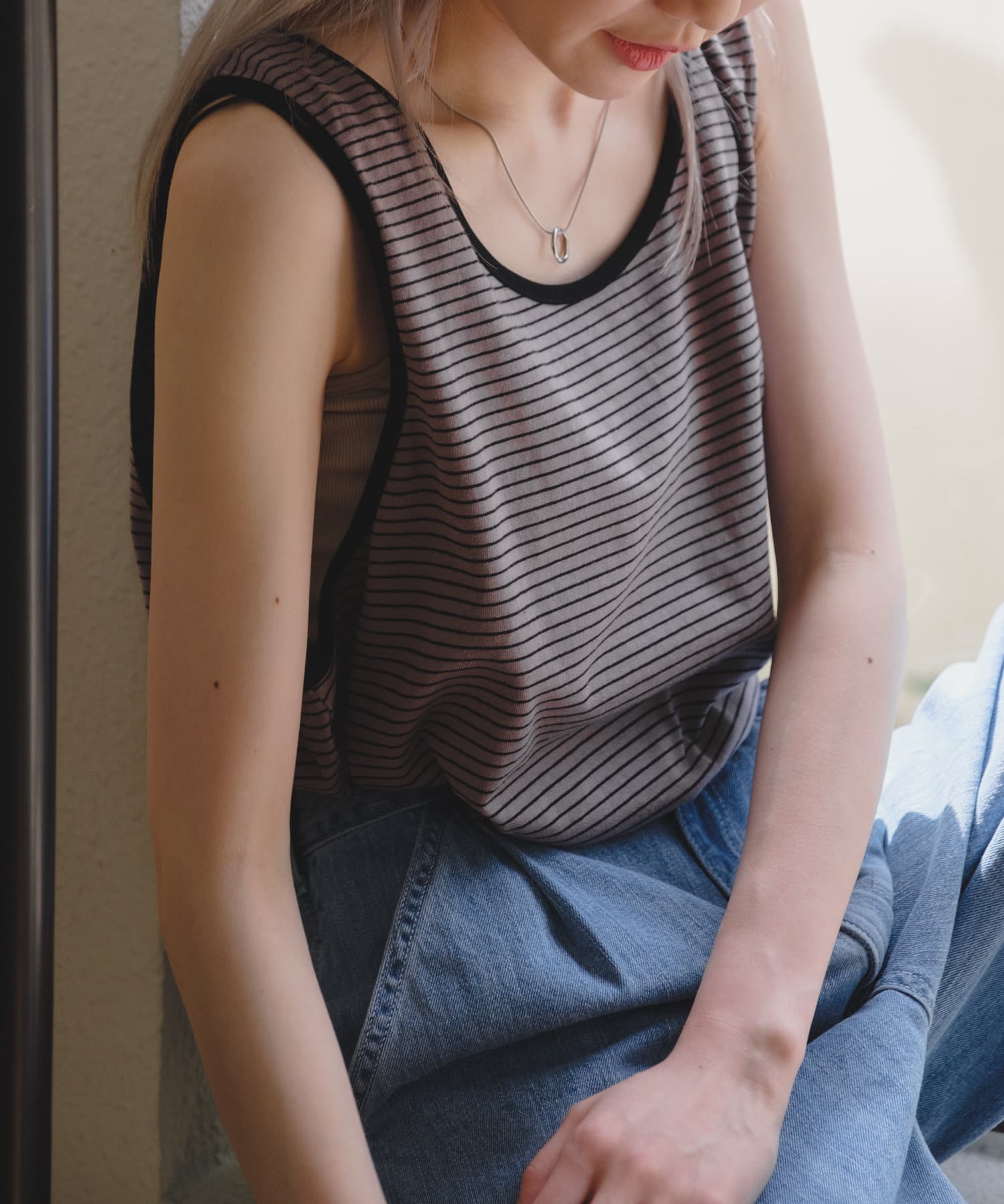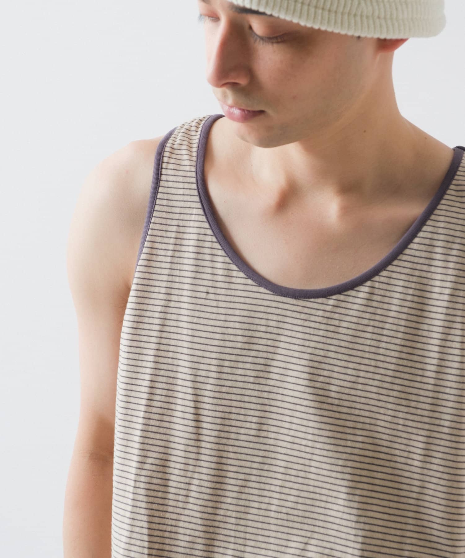 細かいピッチのボーダーがさりげないアクセントになるタンクトップ。