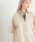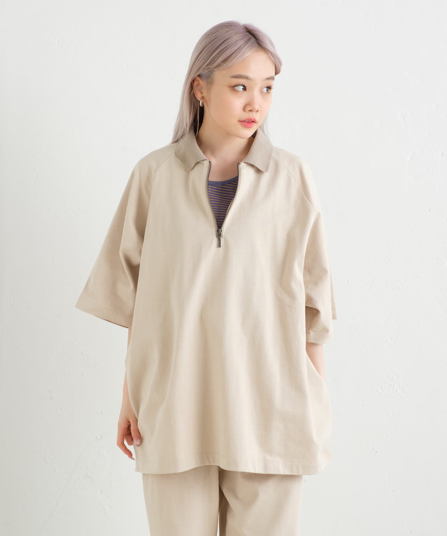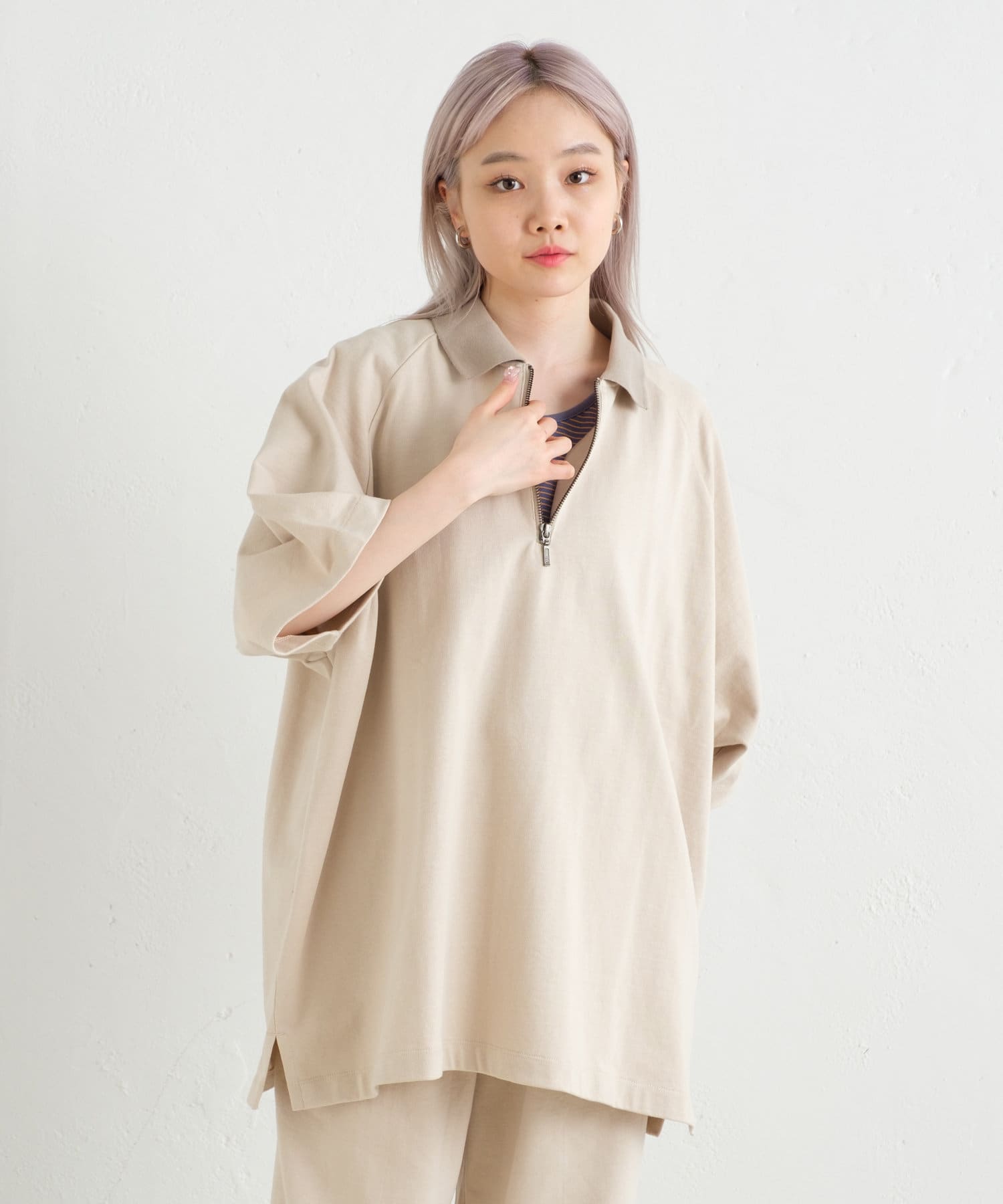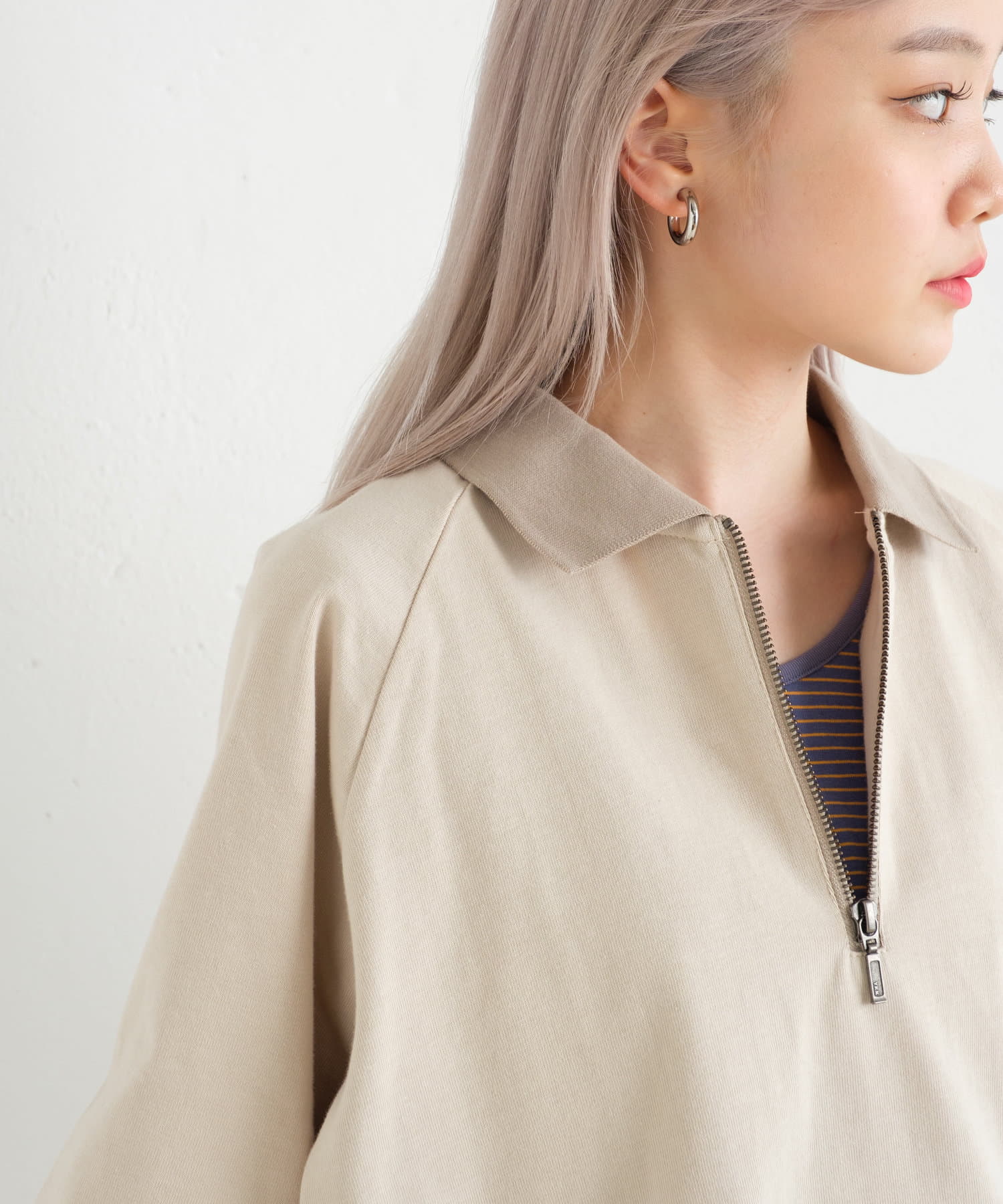 トレンドのハーフジップ仕様で、シルエットは肩がナチュラルに落ちるドロップショルダー、リラックスできるワイドシルエットです。