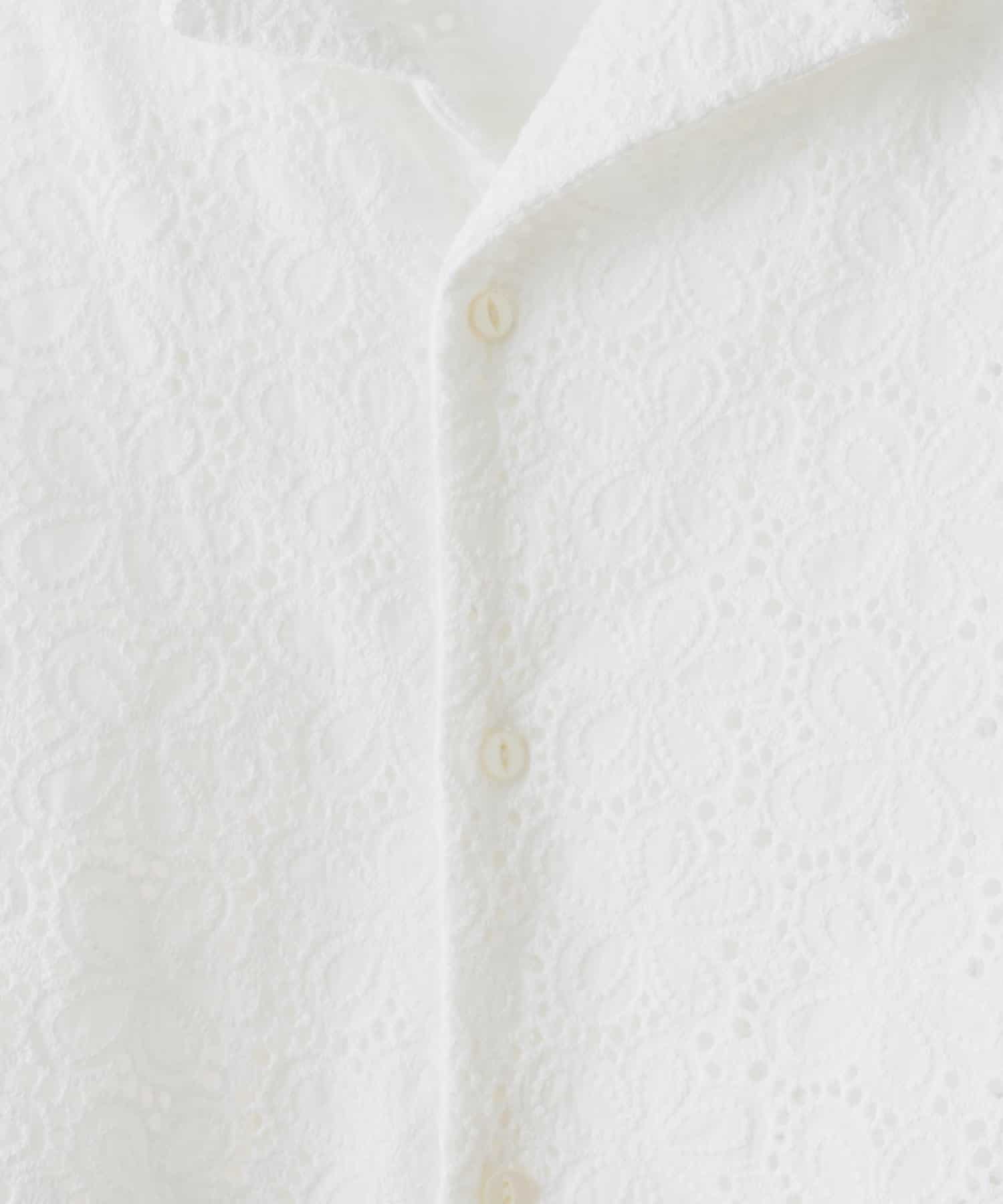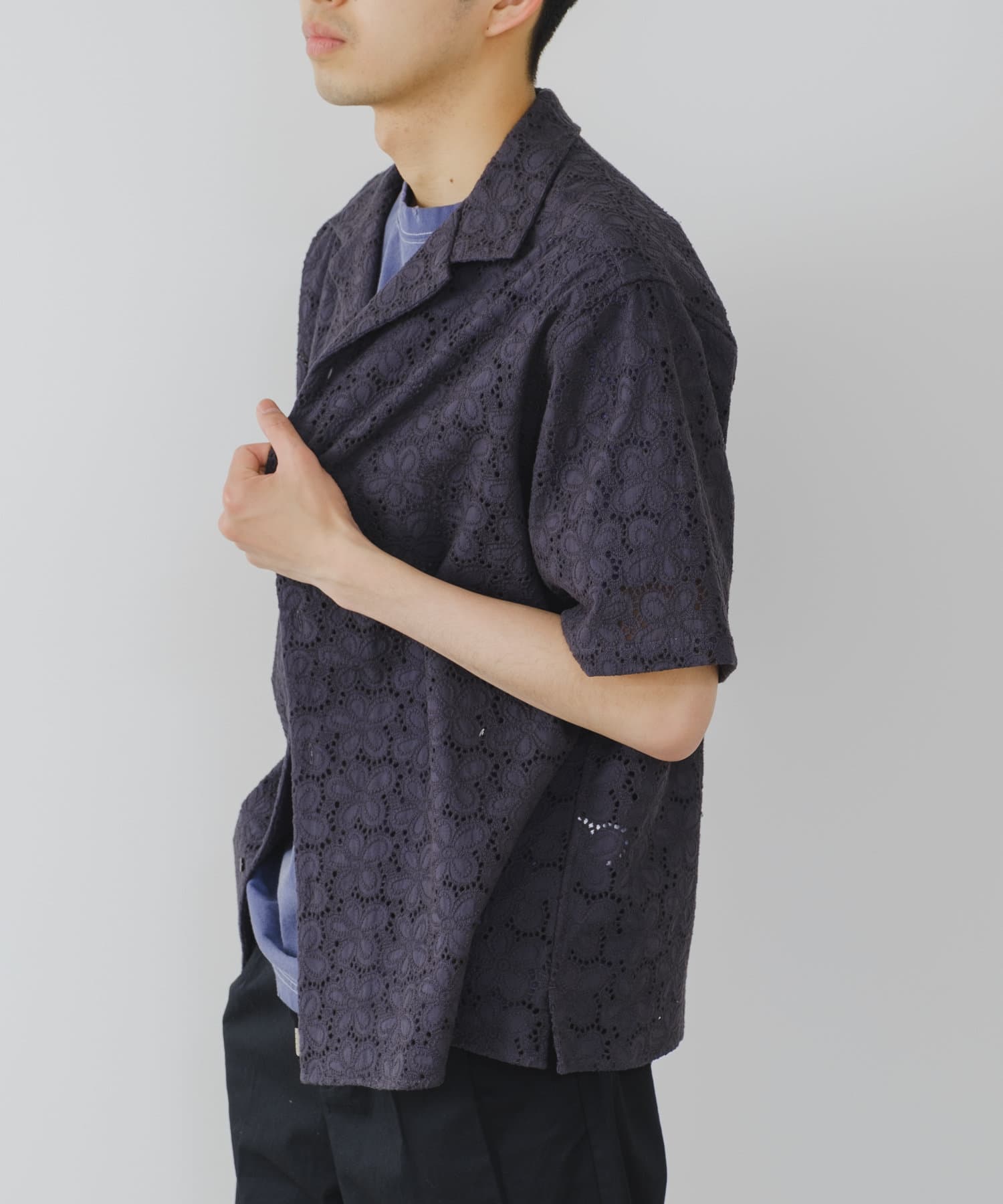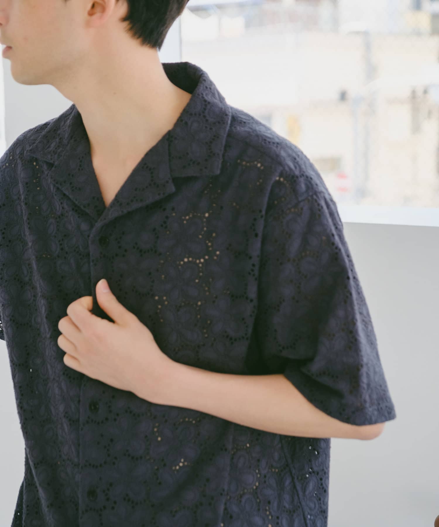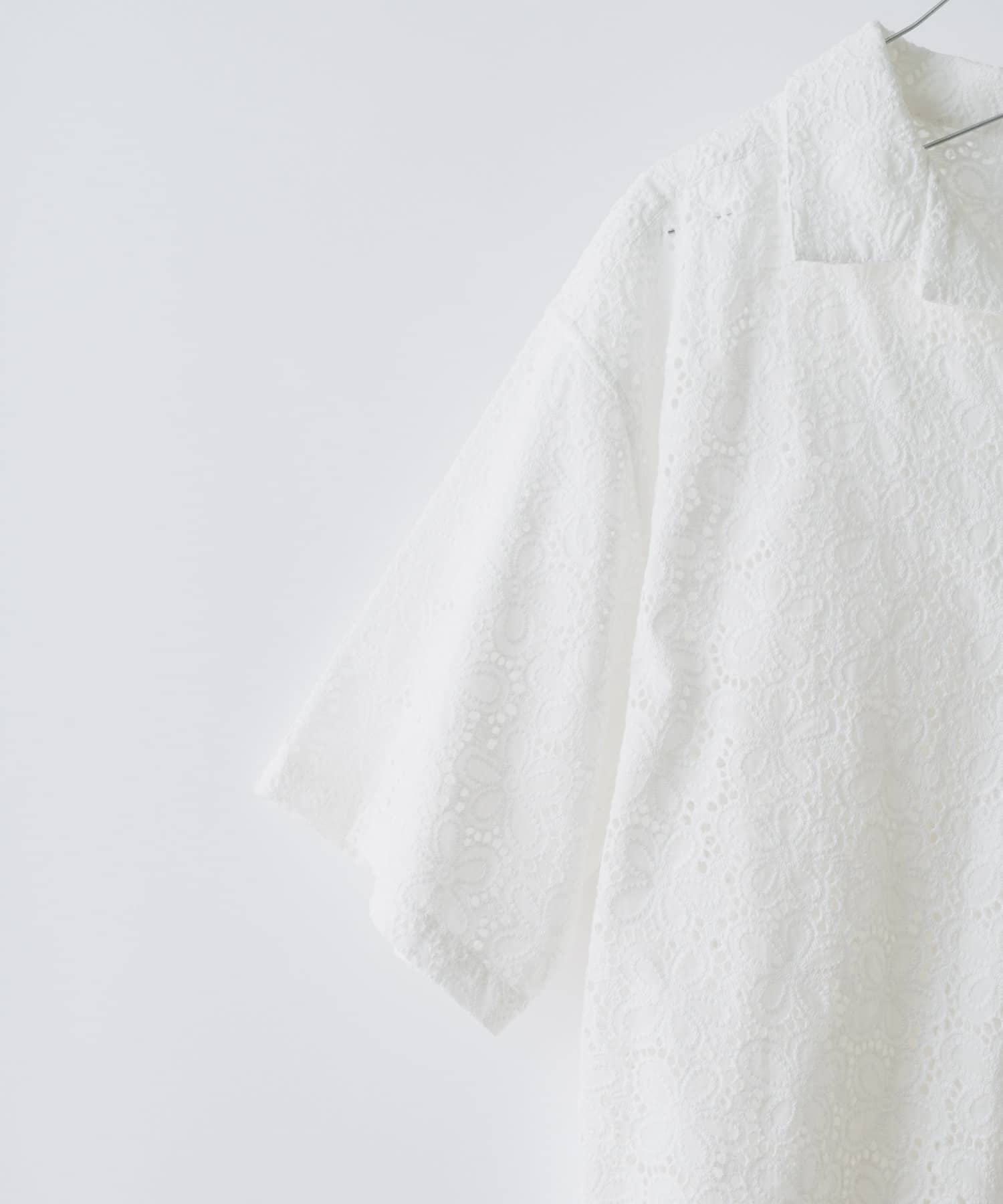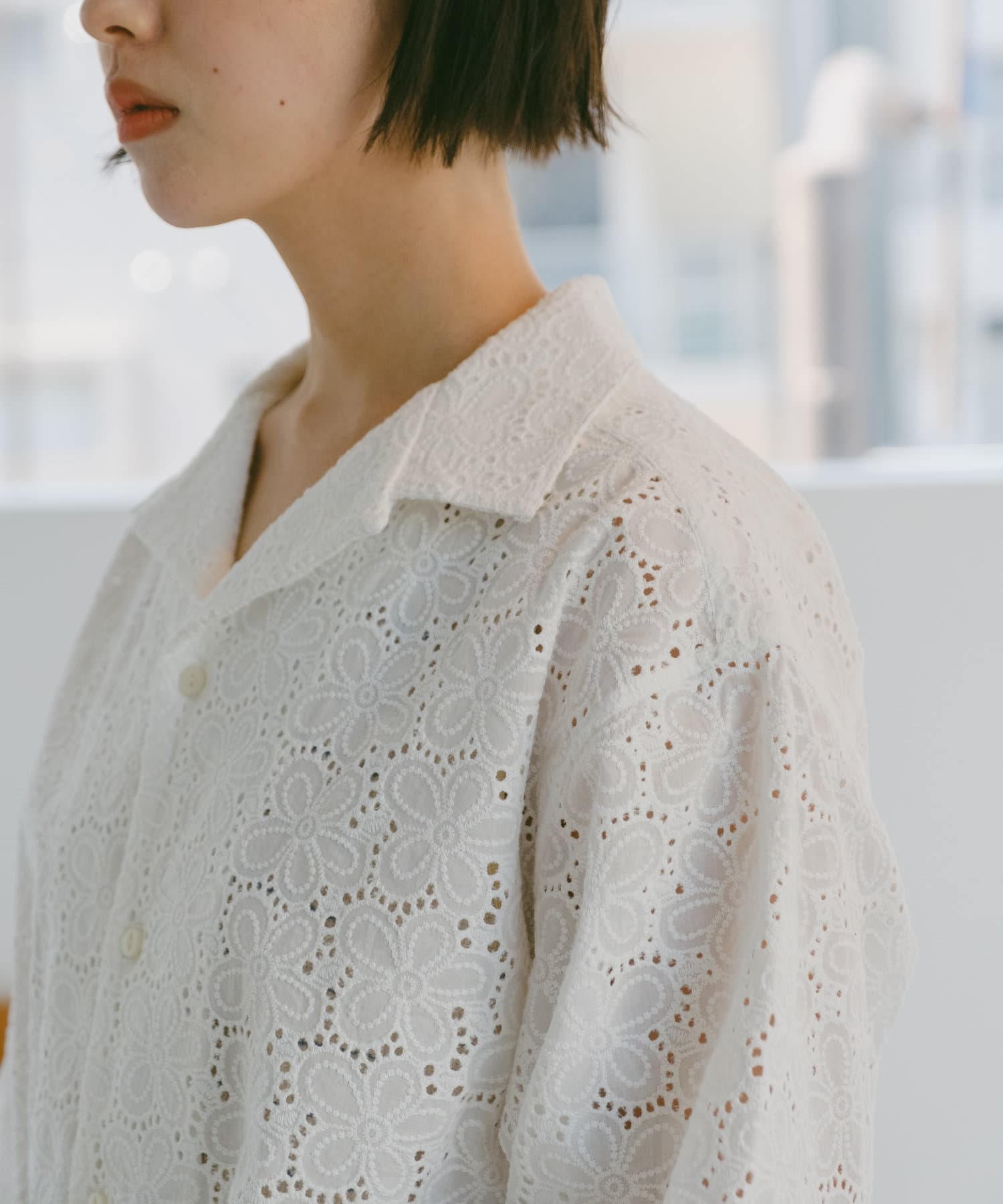 フラワーパターンレース生地を使用したオープンカラーシャツです。