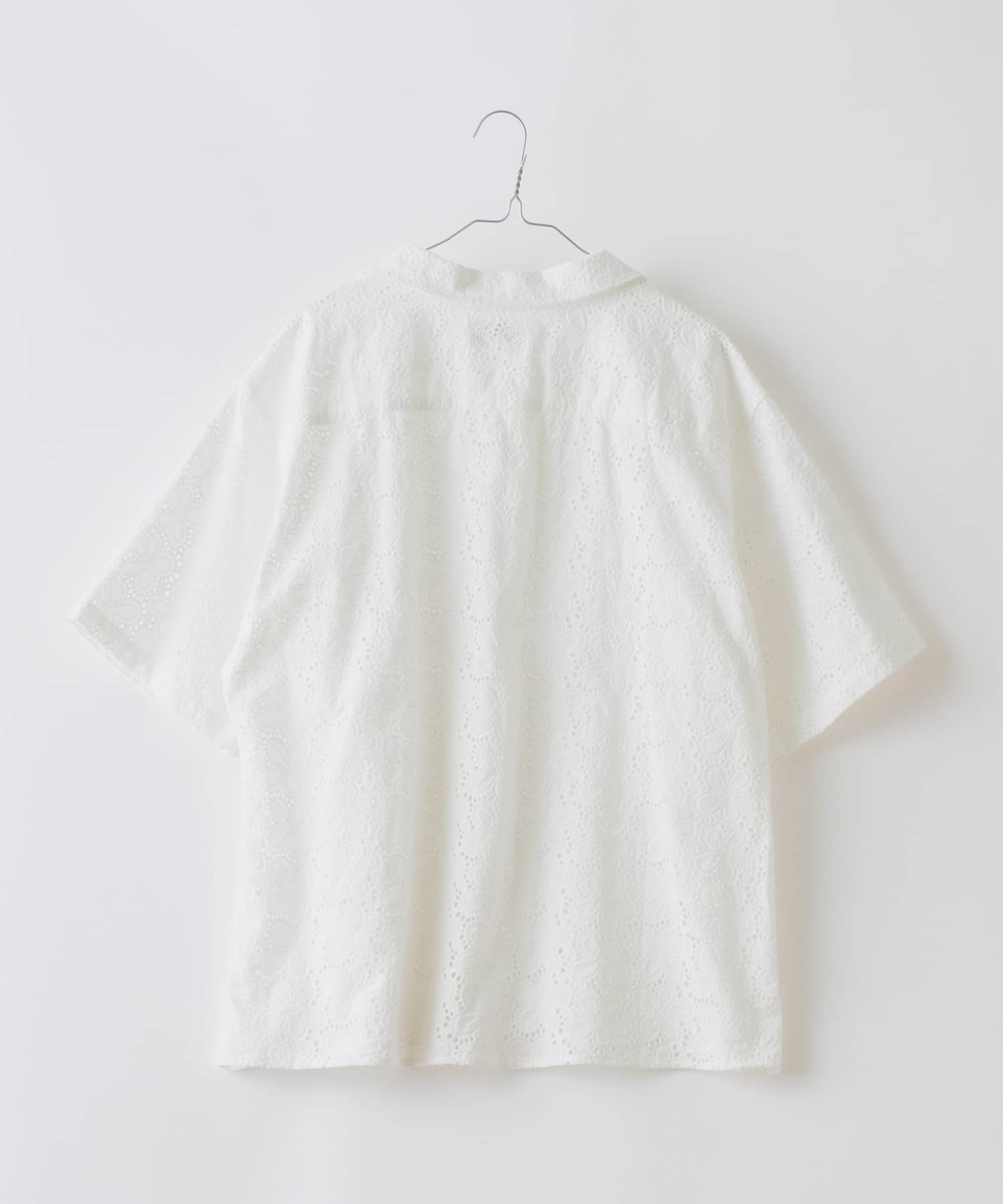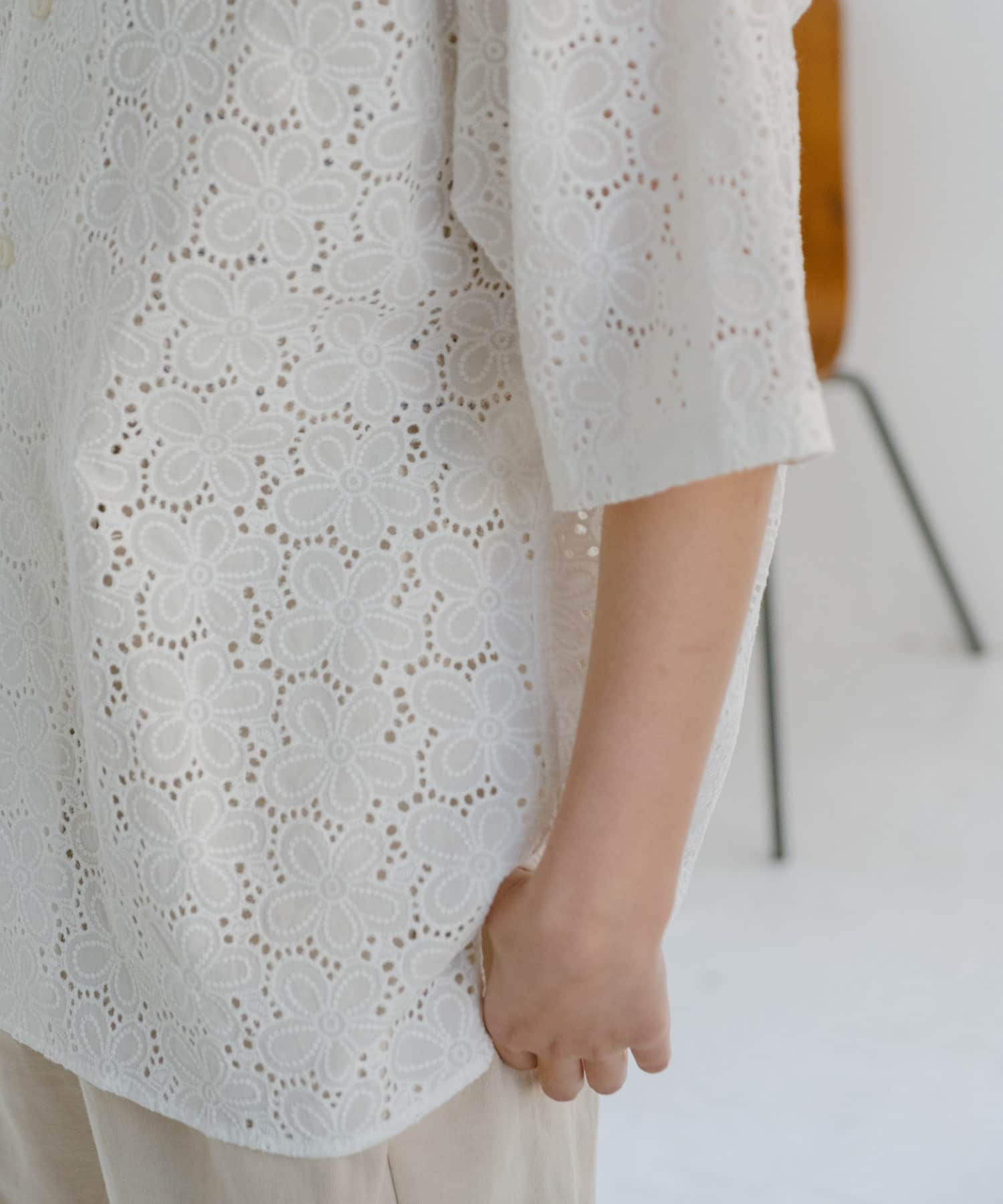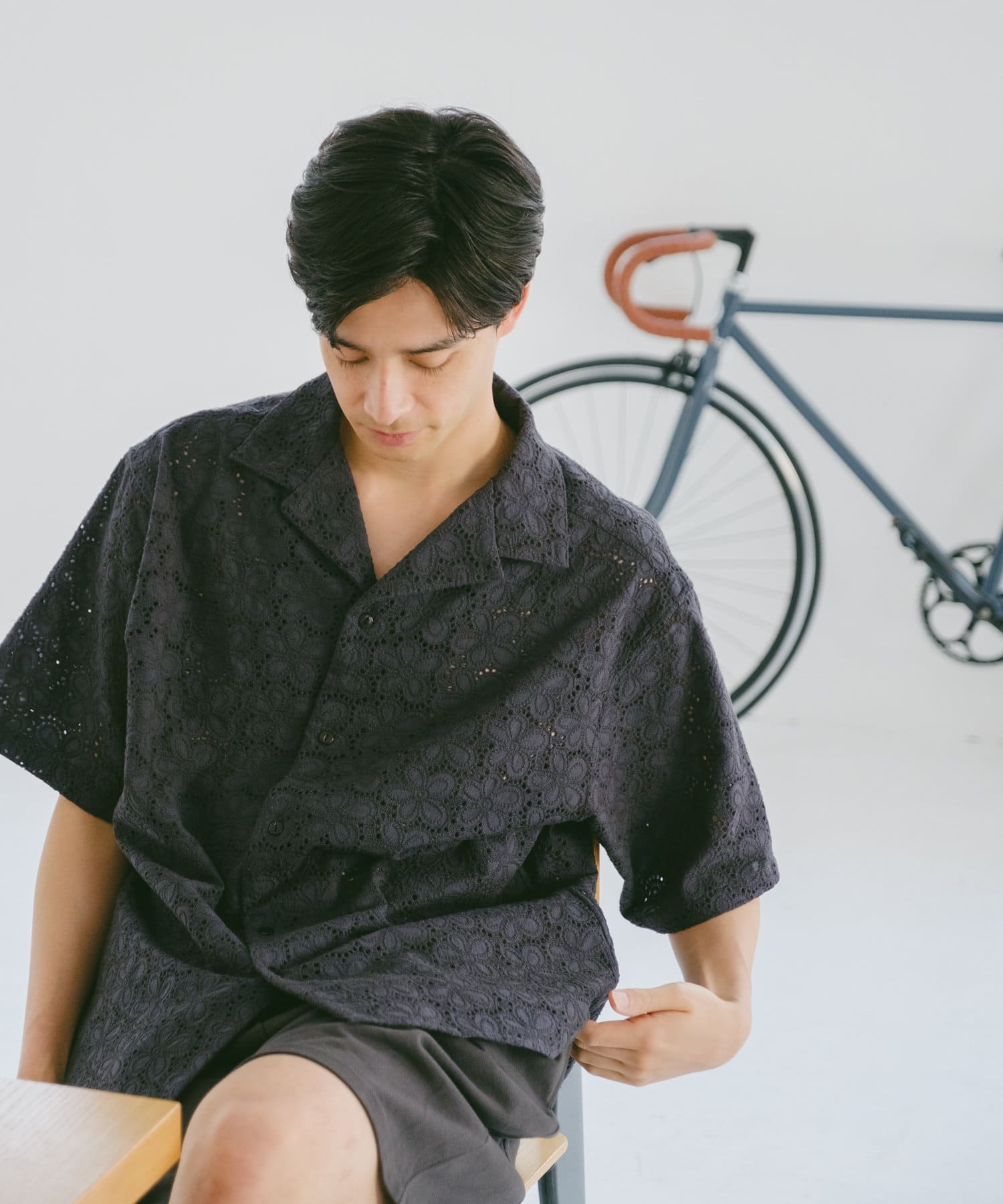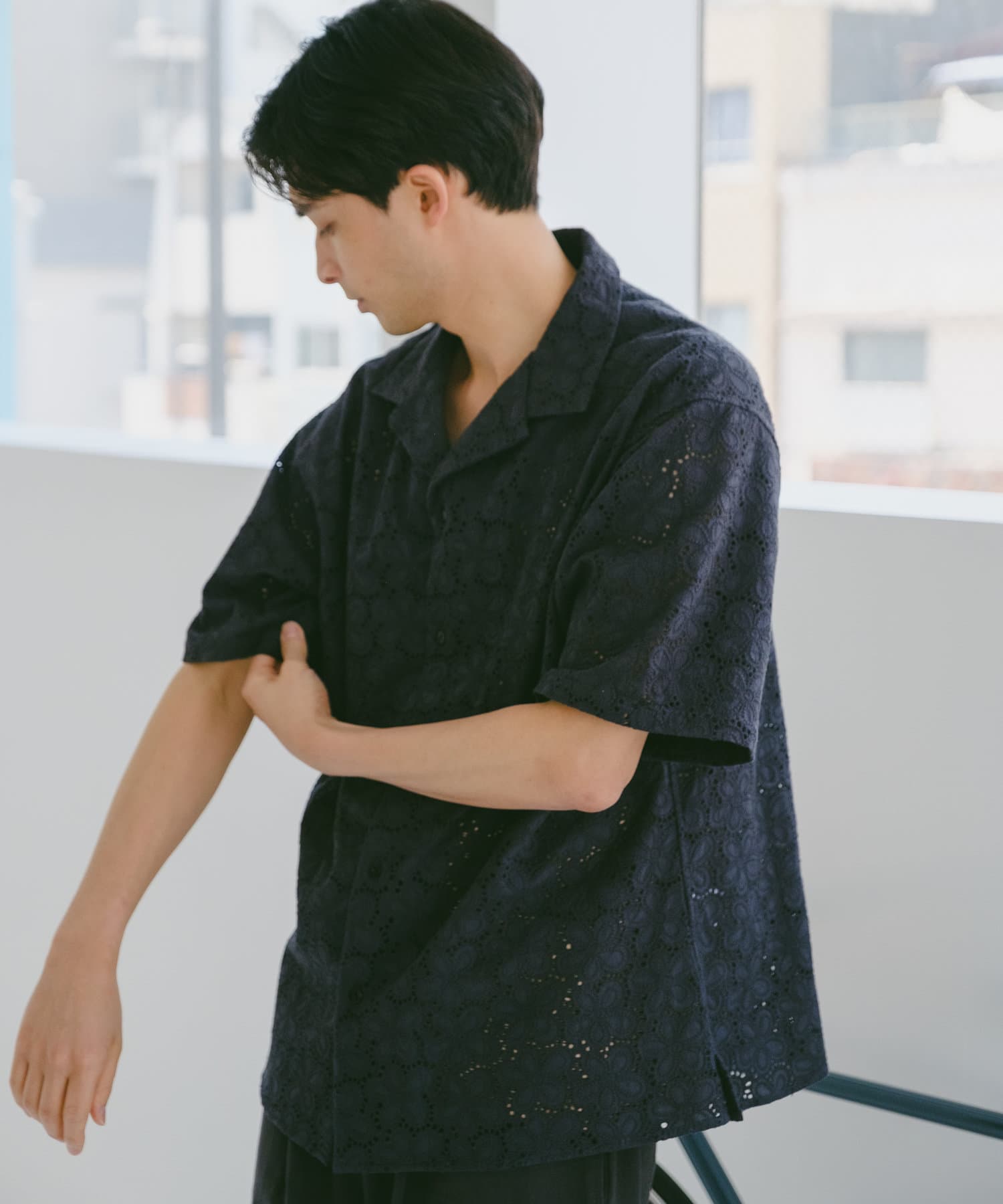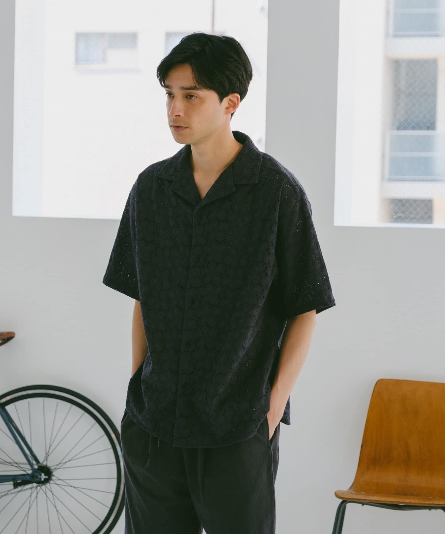 フラワーパターンレース生地を使用したオープンカラーシャツです。