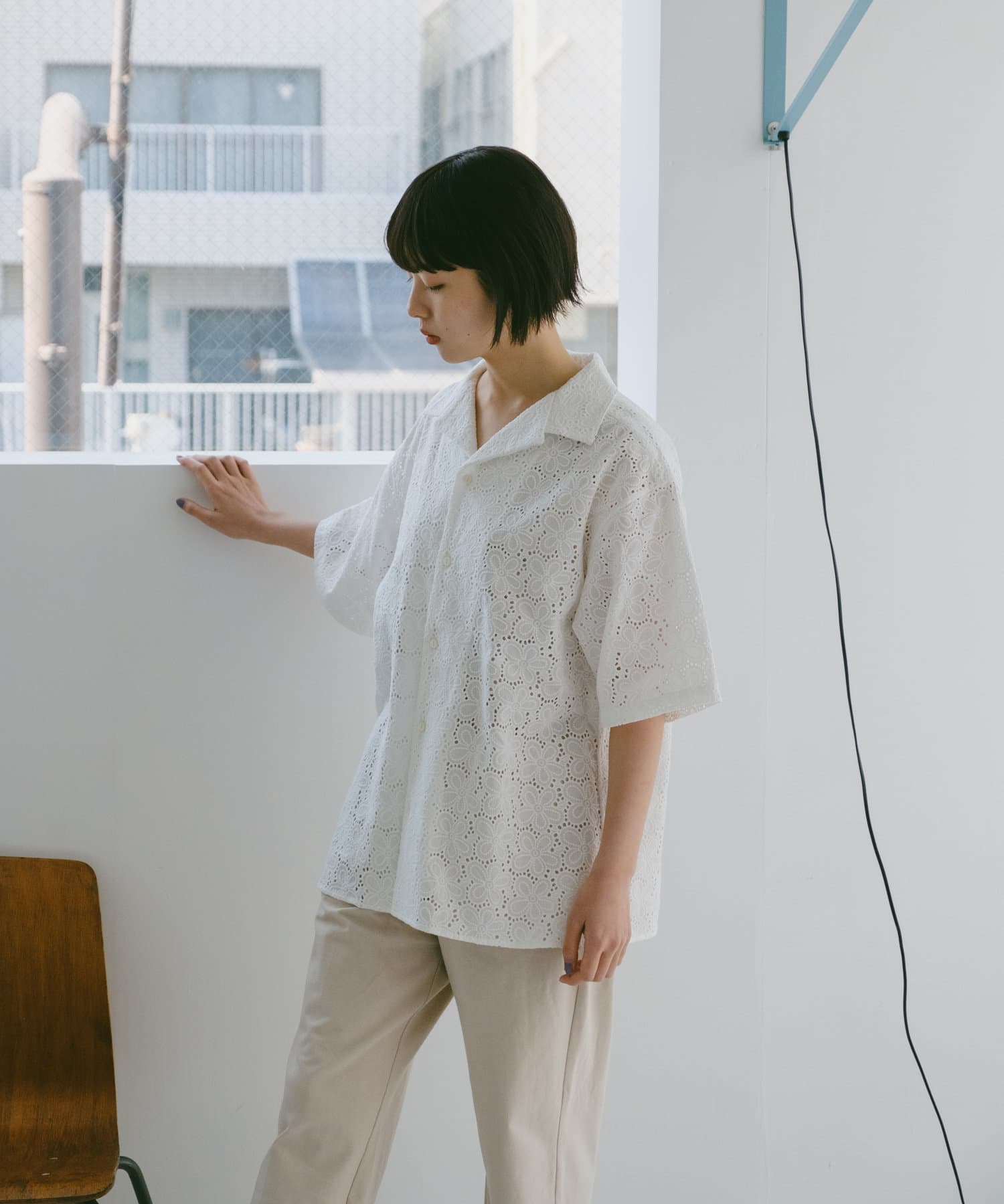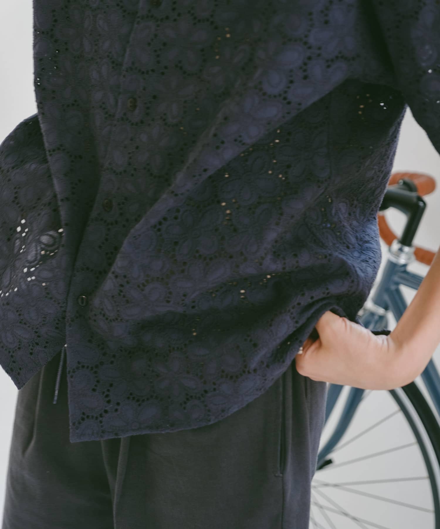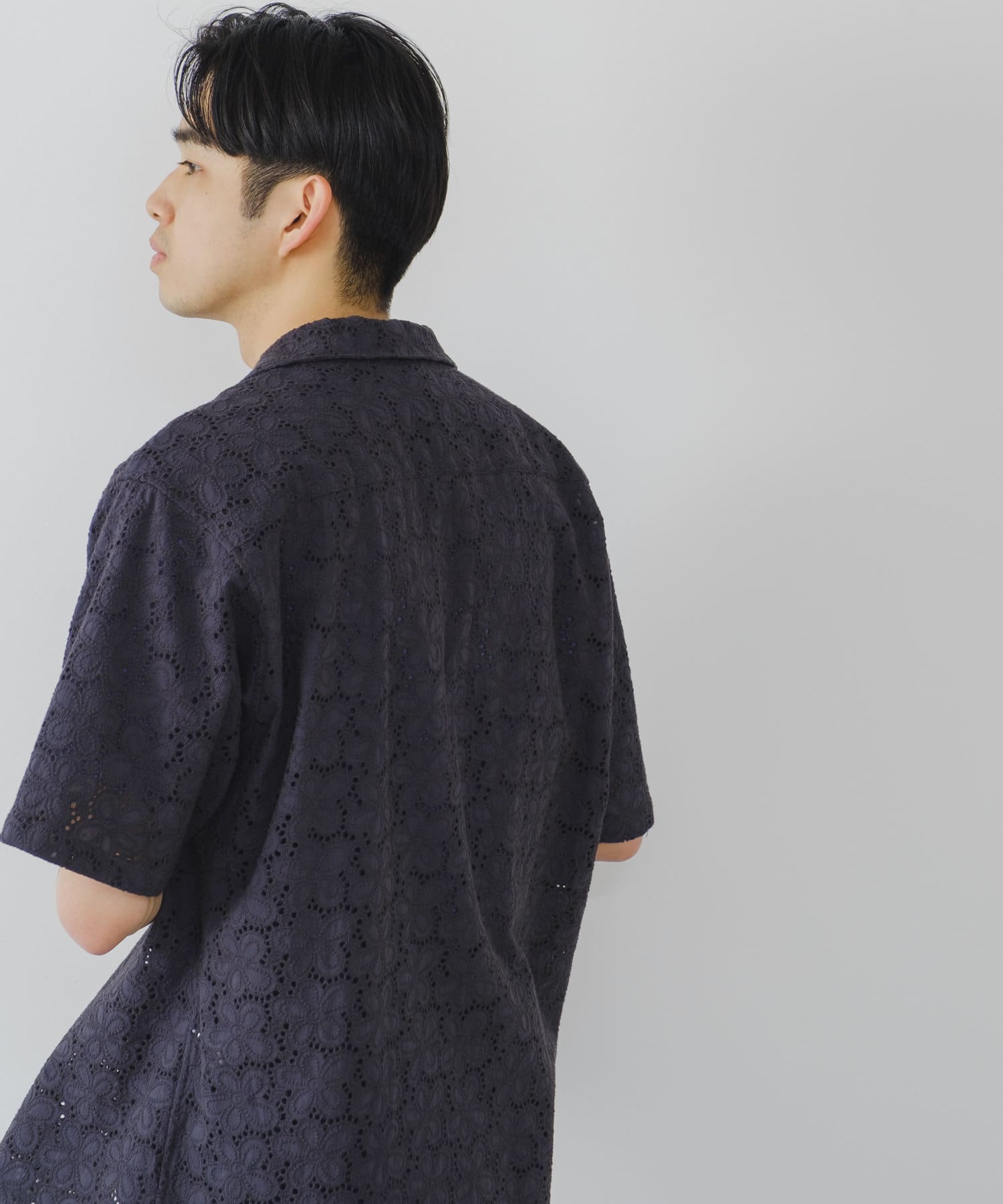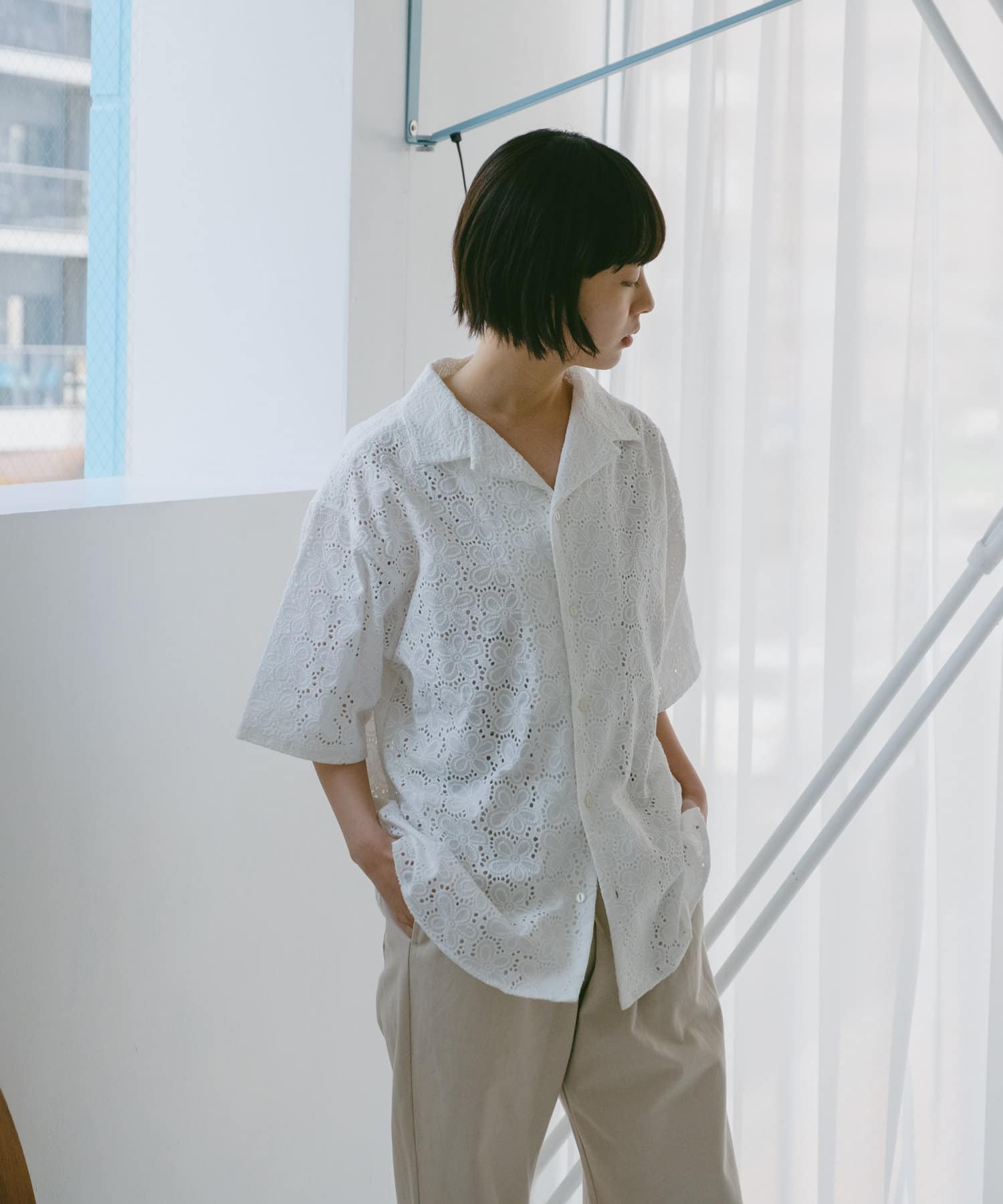 フラワーパターンレース生地を使用したオープンカラーシャツです。