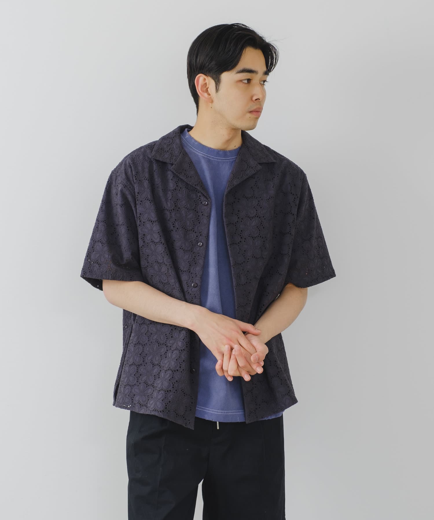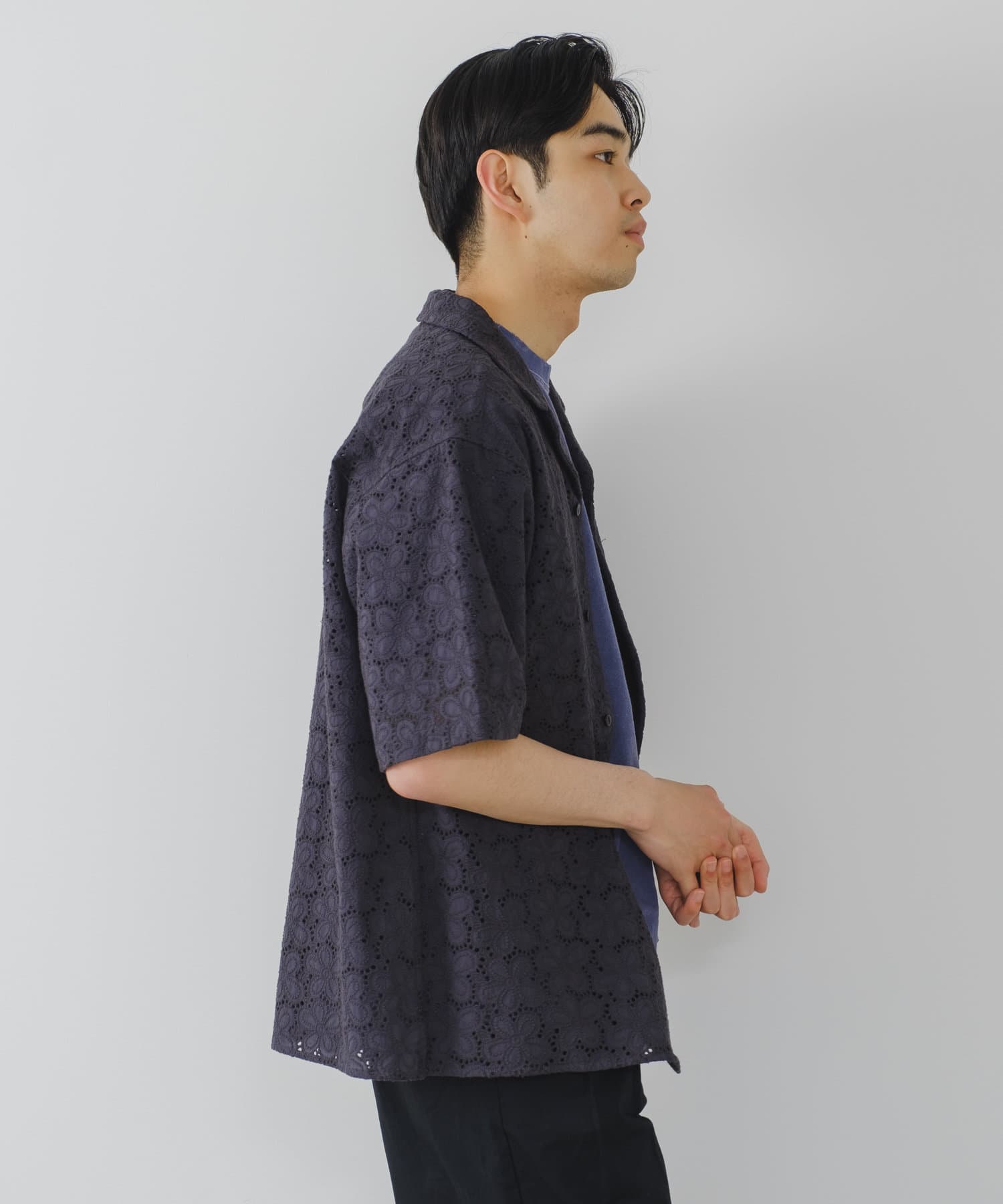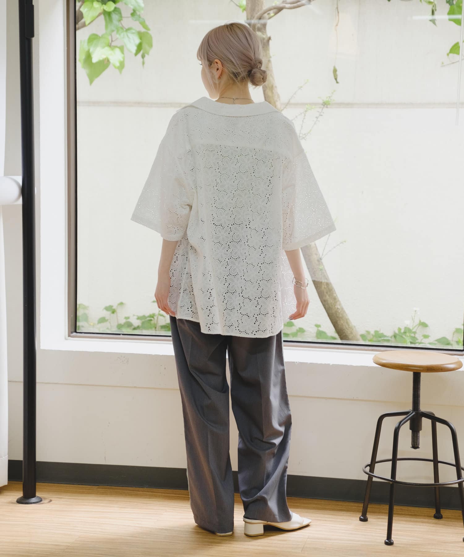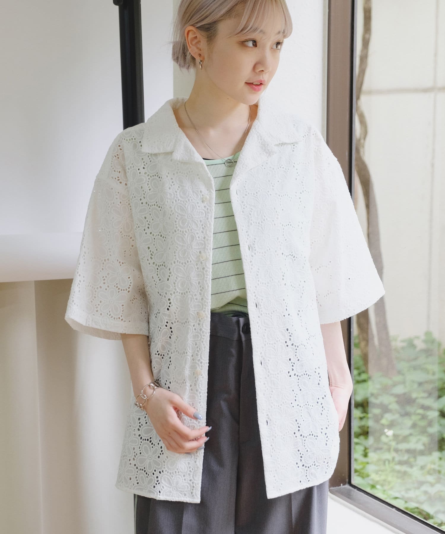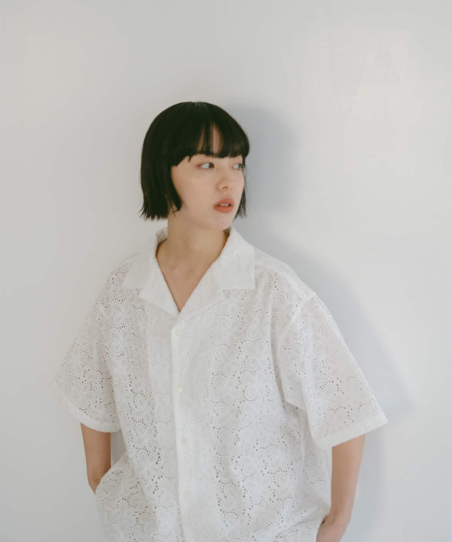 フラワーパターンレース生地を使用したオープンカラーシャツです。