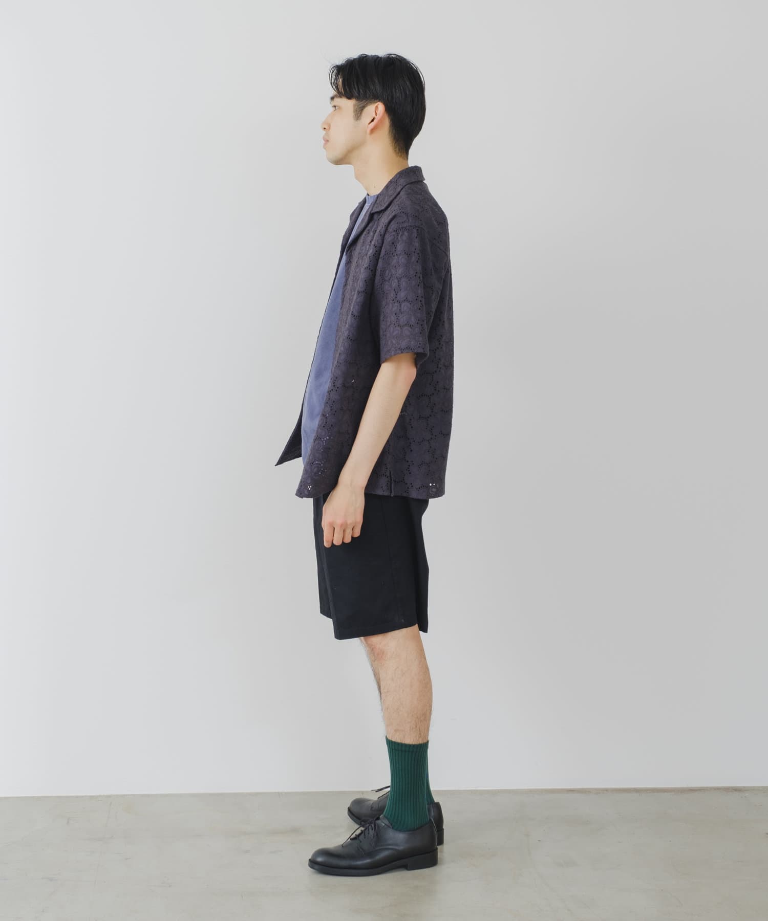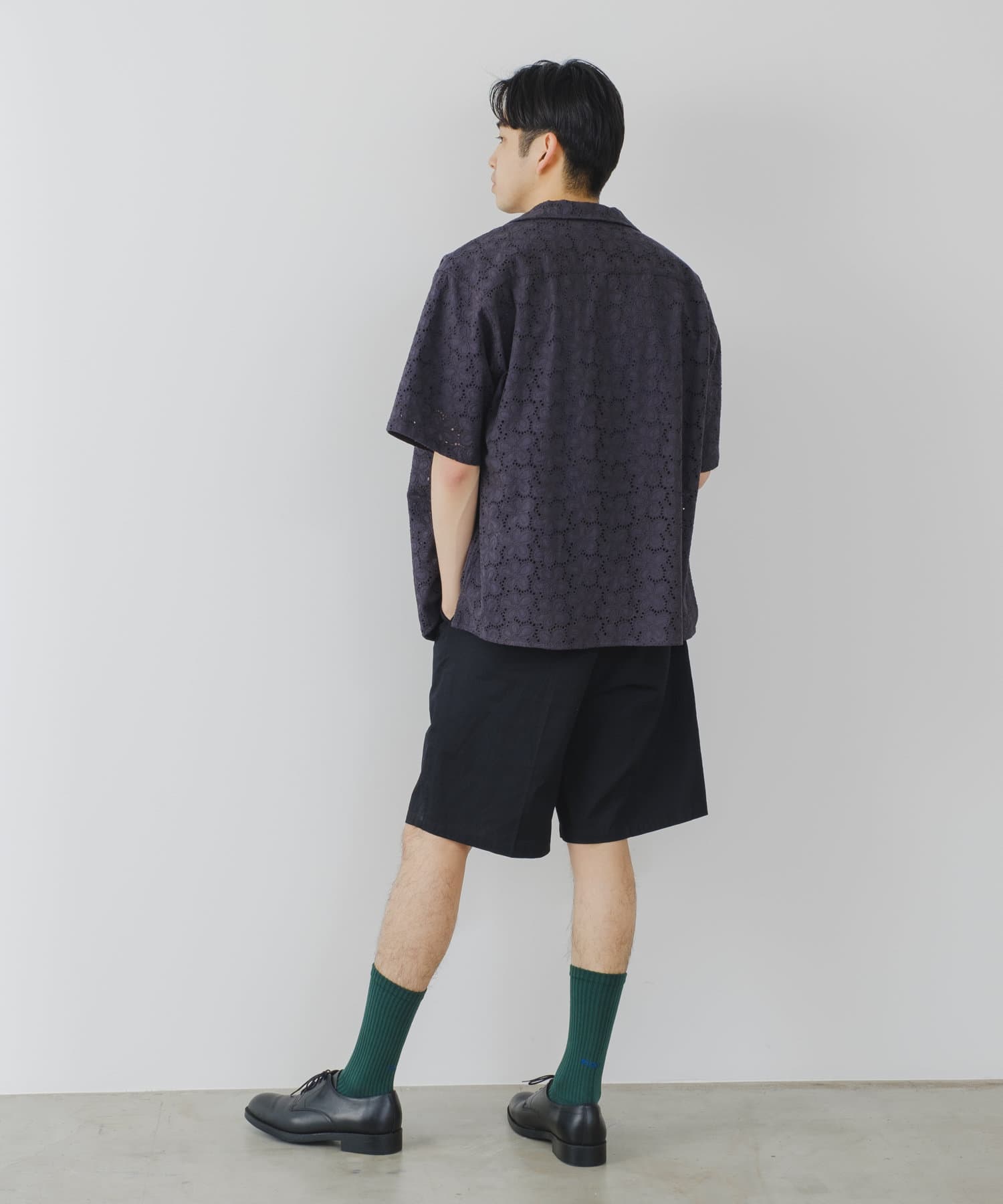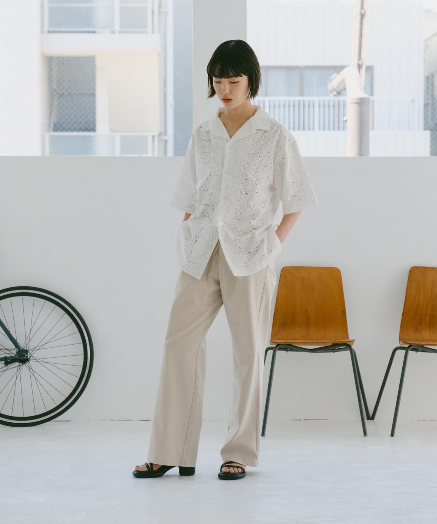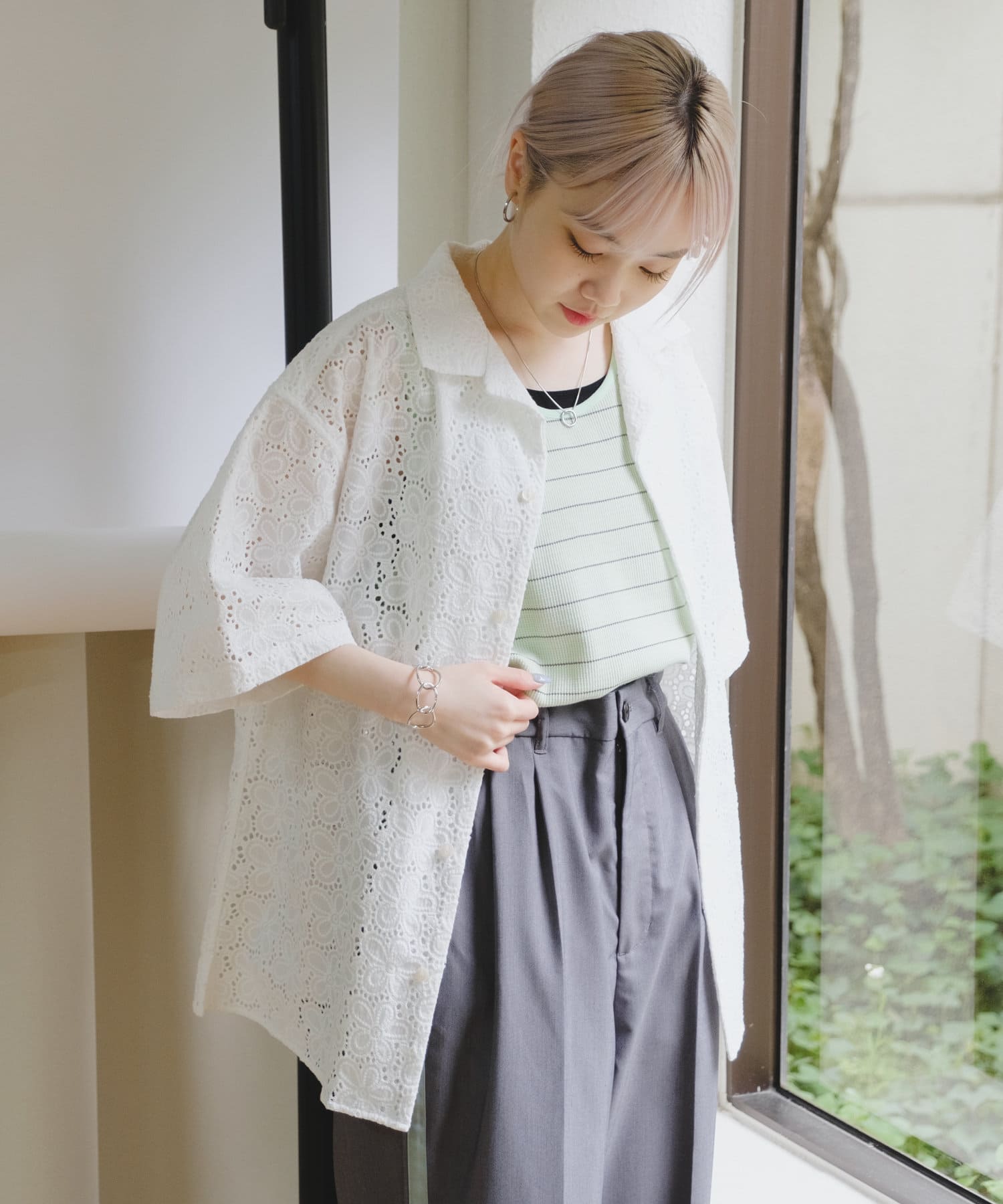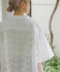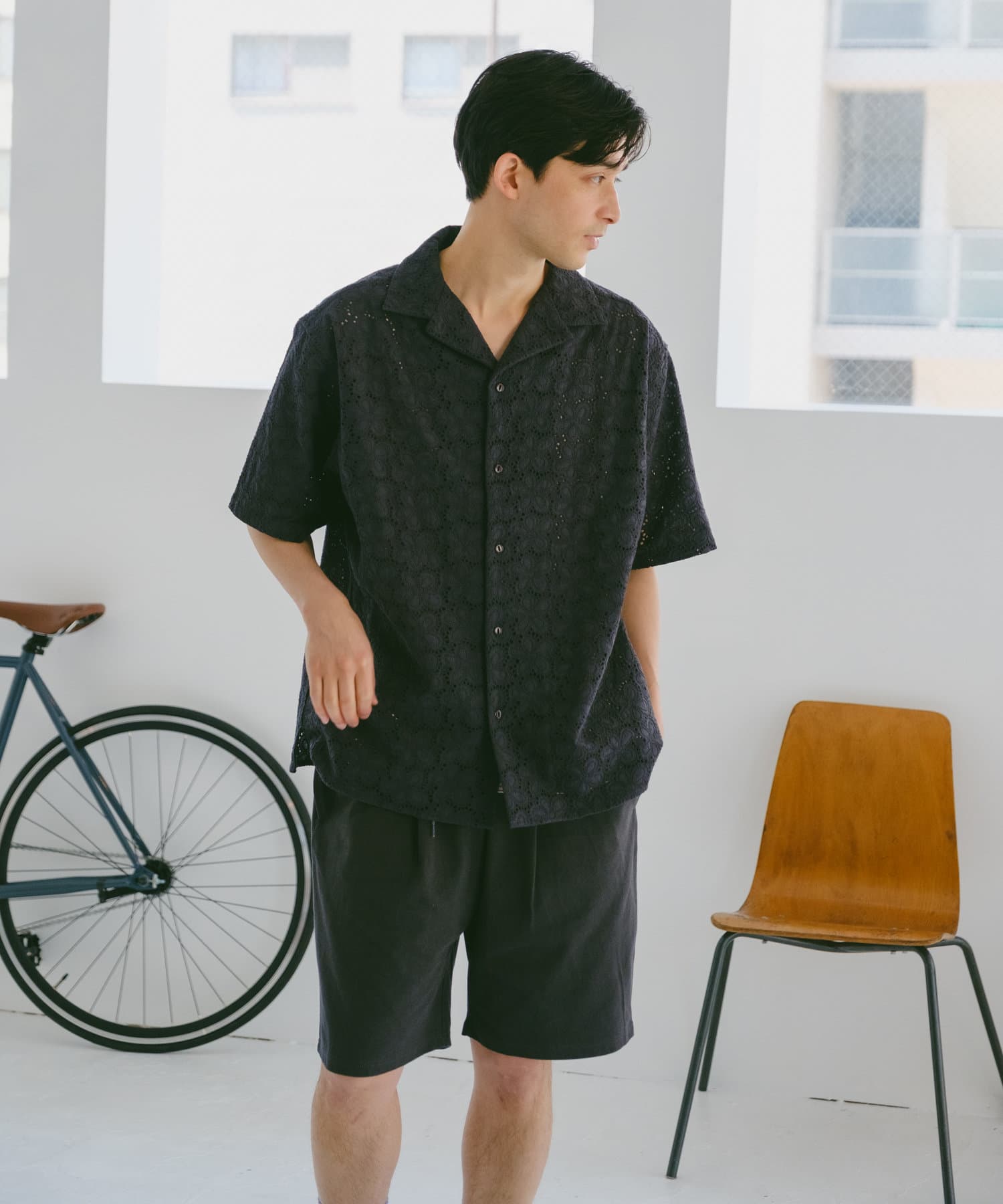 フラワーパターンレース生地を使用したオープンカラーシャツです。