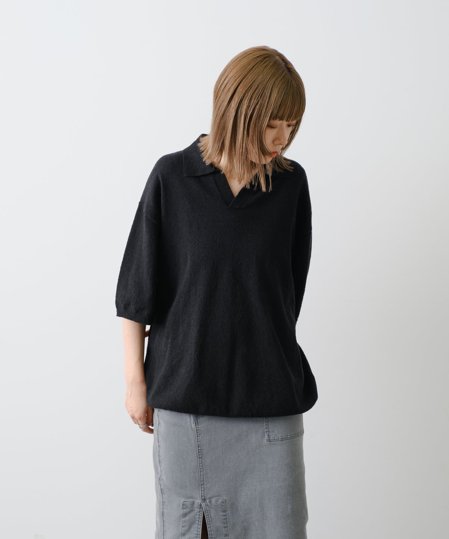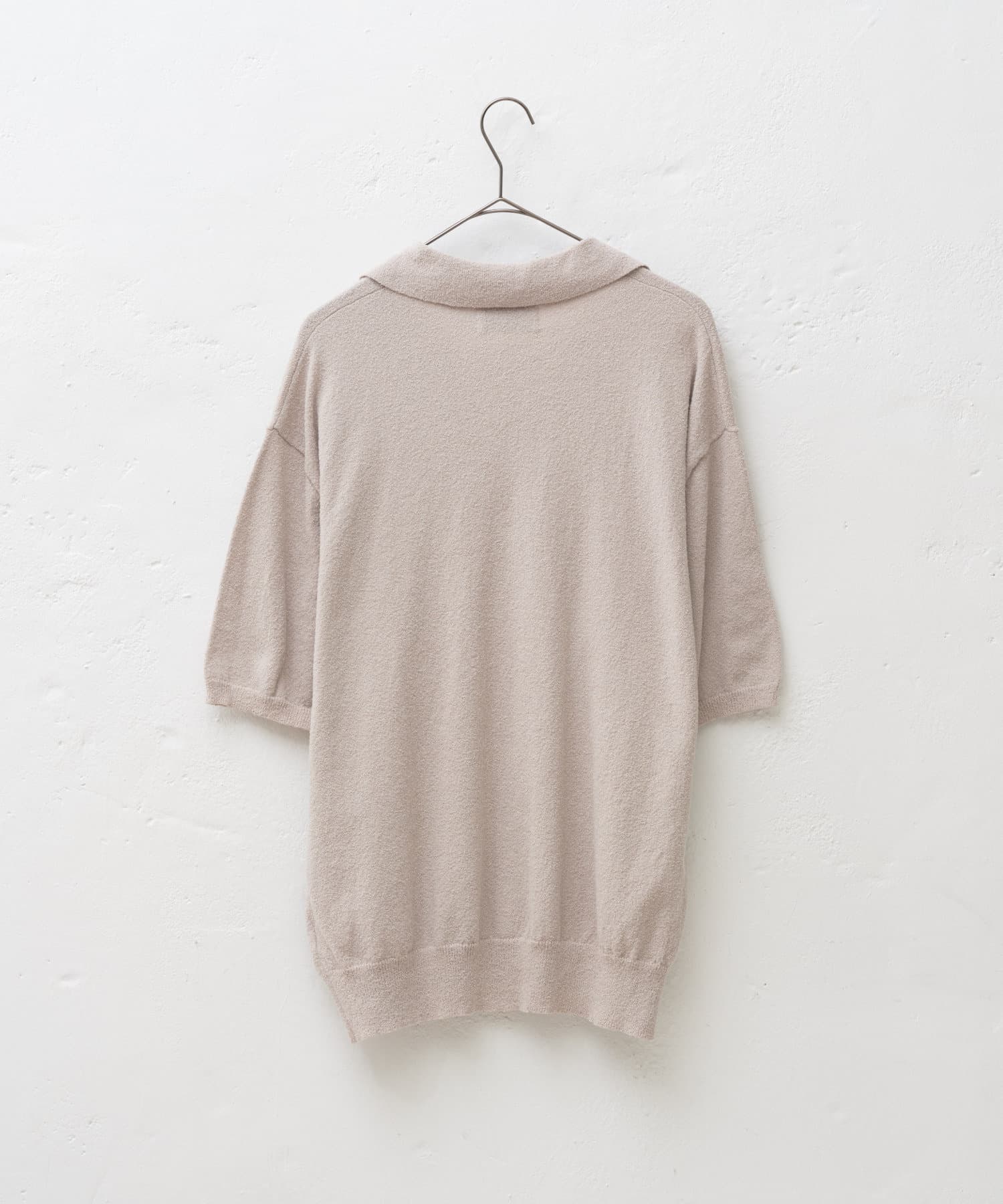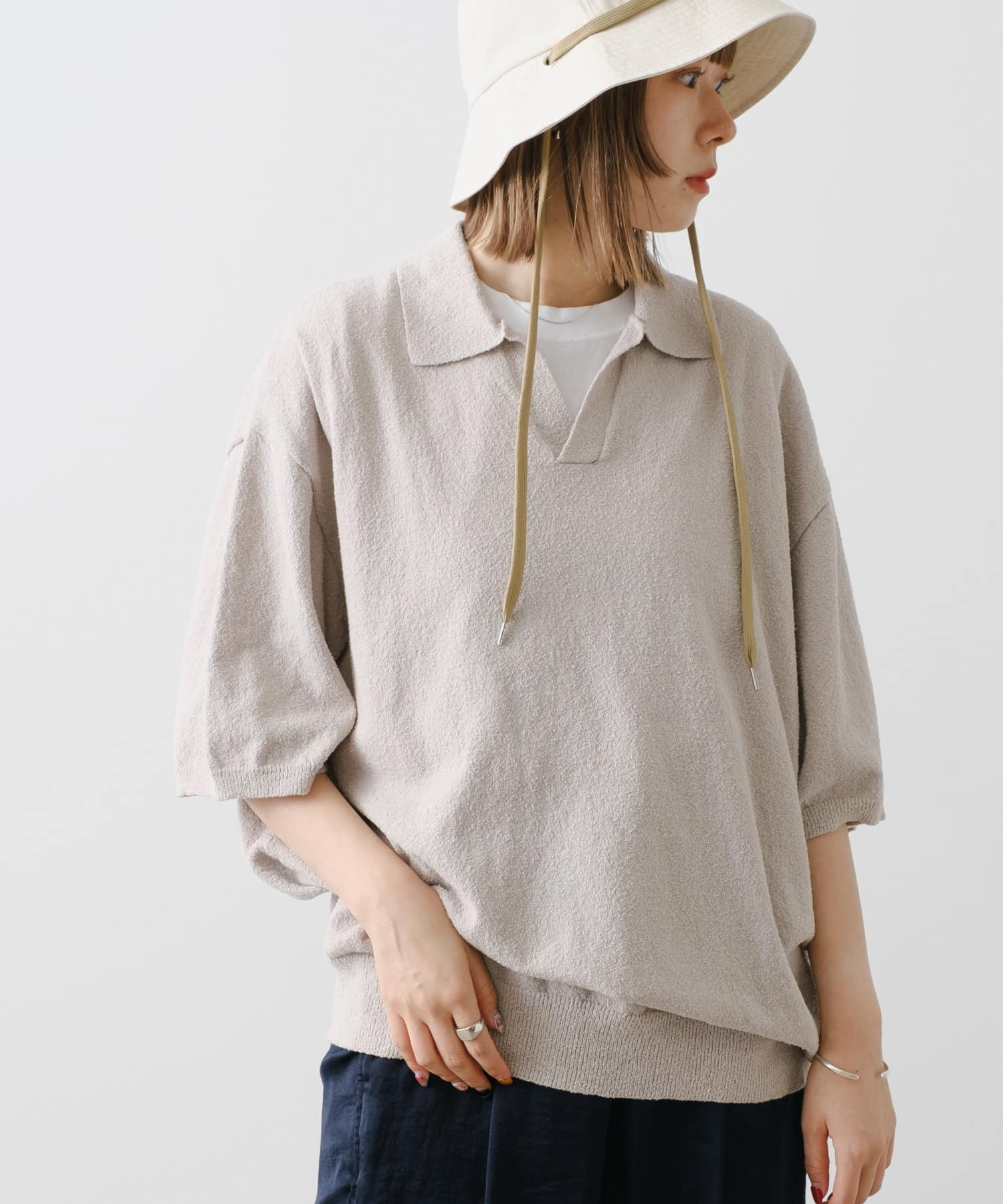 ドライタッチなブークレ糸を細かく編み上げた春夏に最適な清涼感のあるスキッパーネックタイプのプルオーバーです。