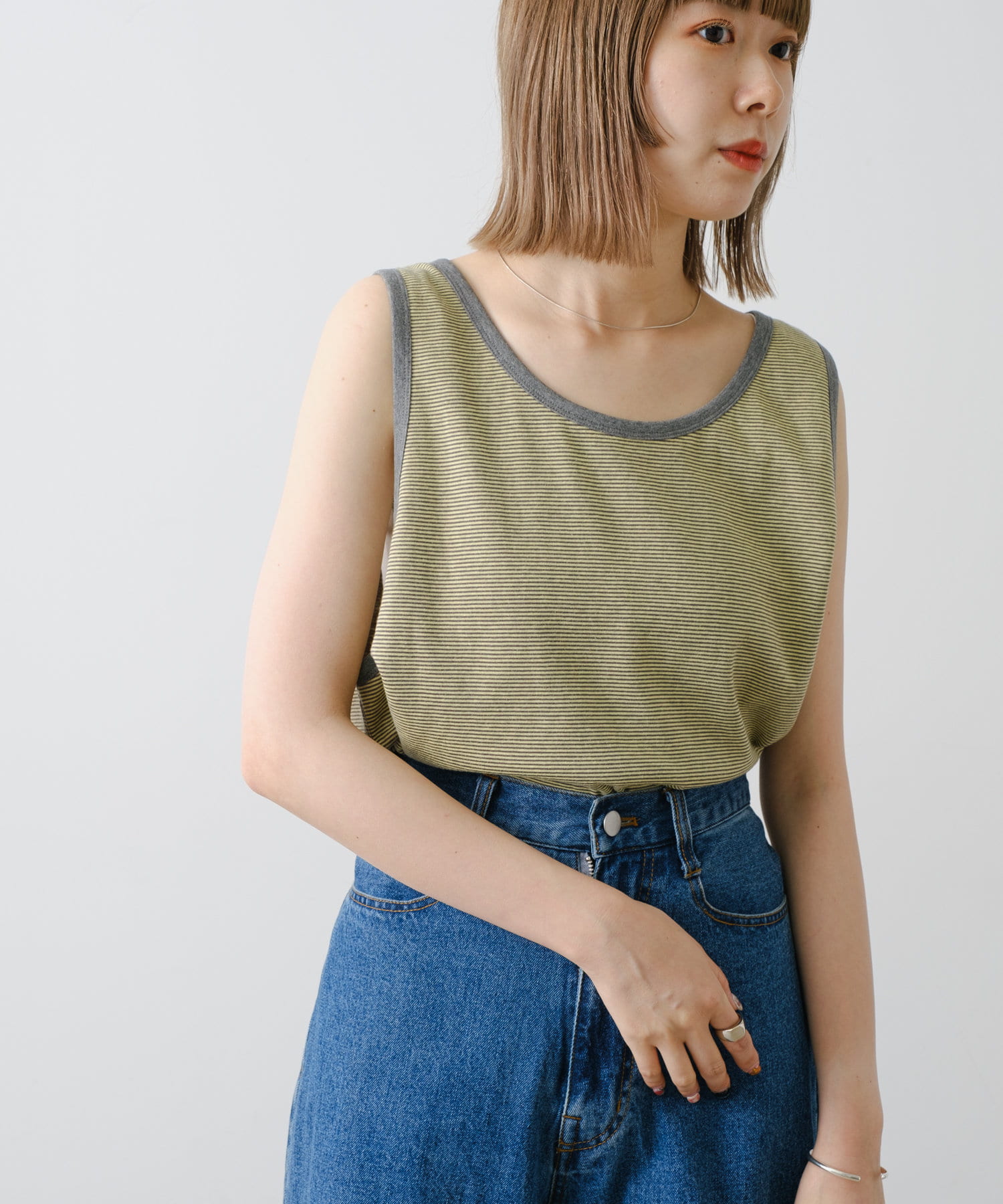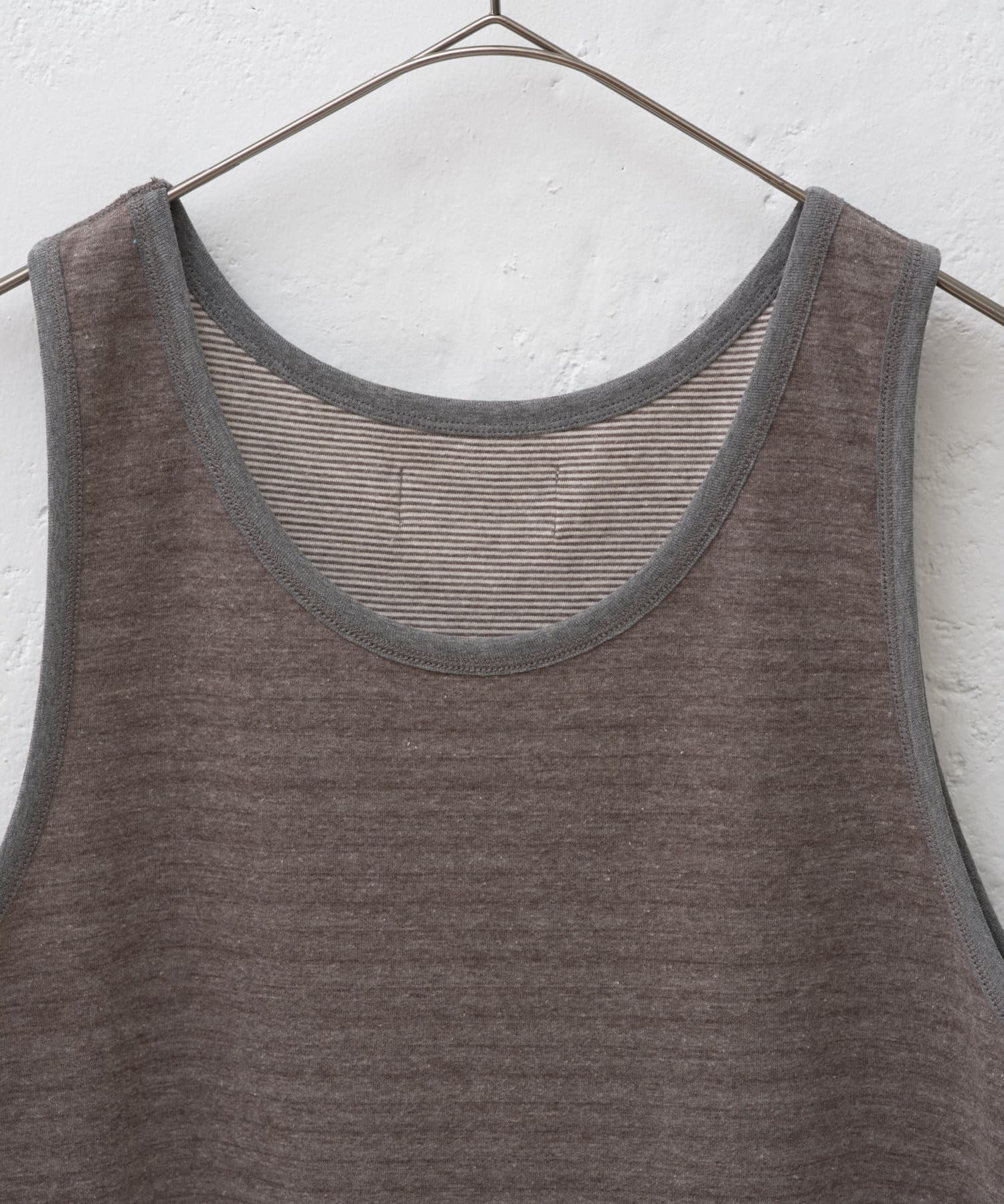薄い生地を2枚張り合わせたダブルフェイス仕様のリバーシブルタンクトップです。