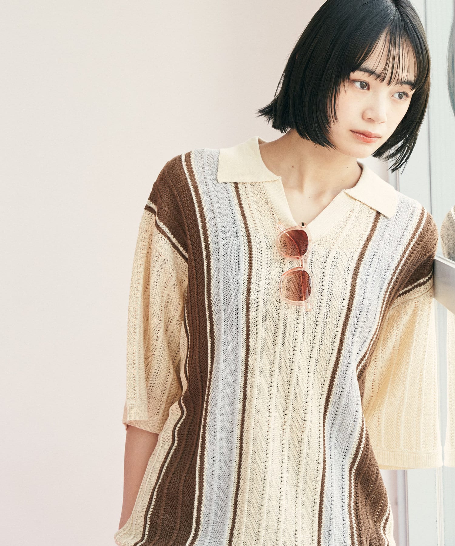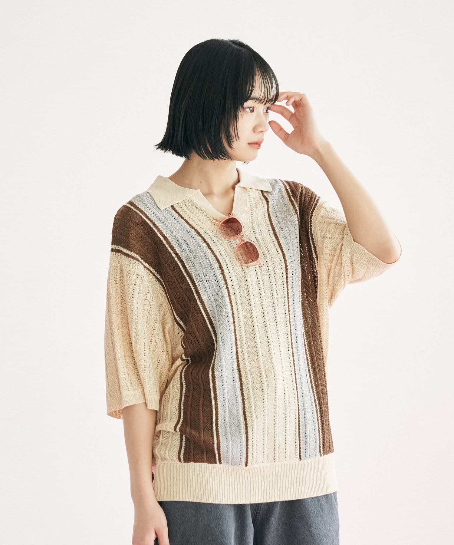 【WHIMSIC】スキッパーネックメッシュジャガードニットプルオーバー