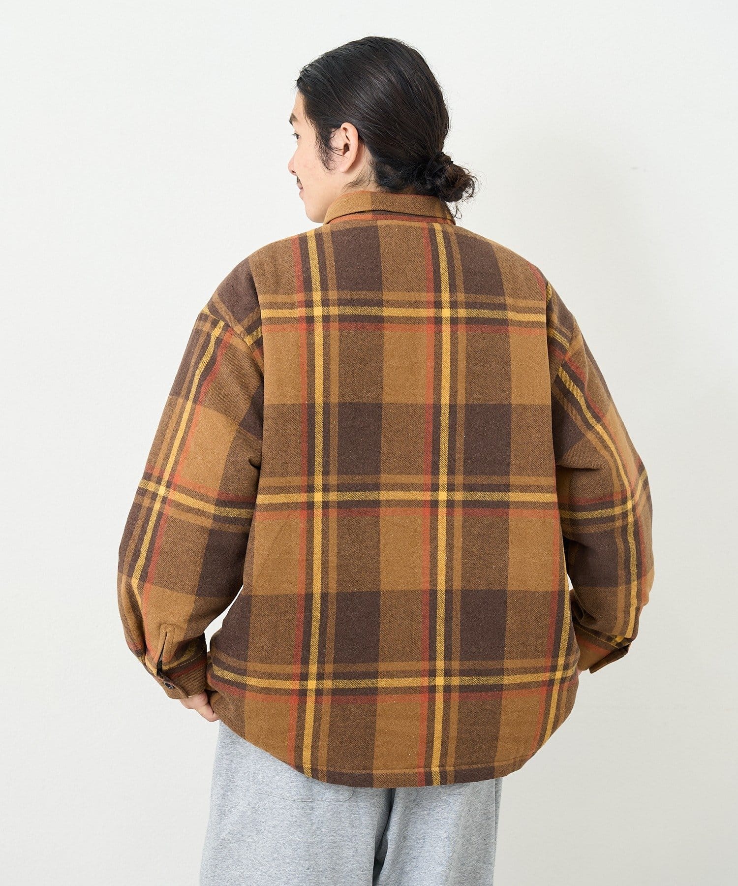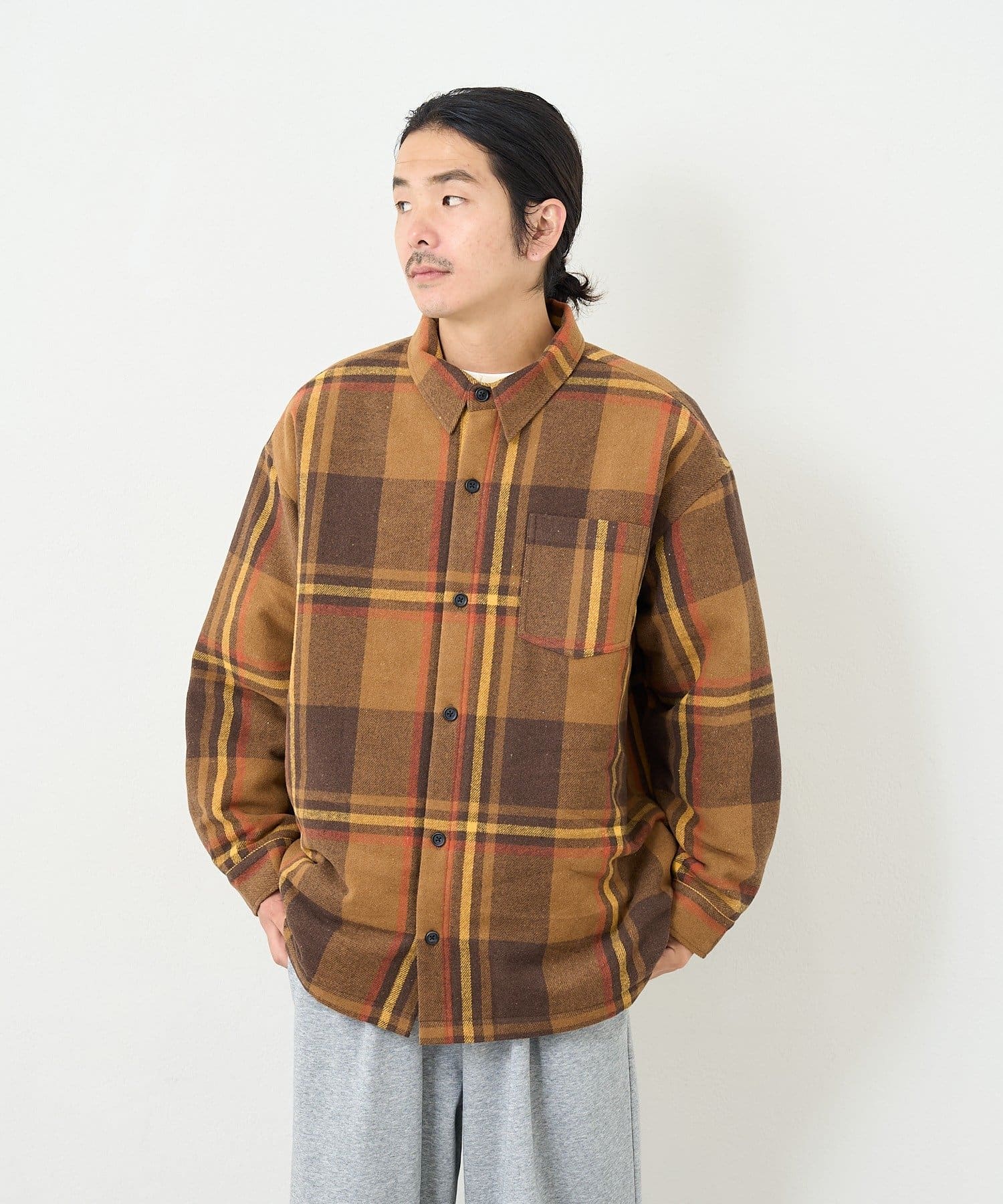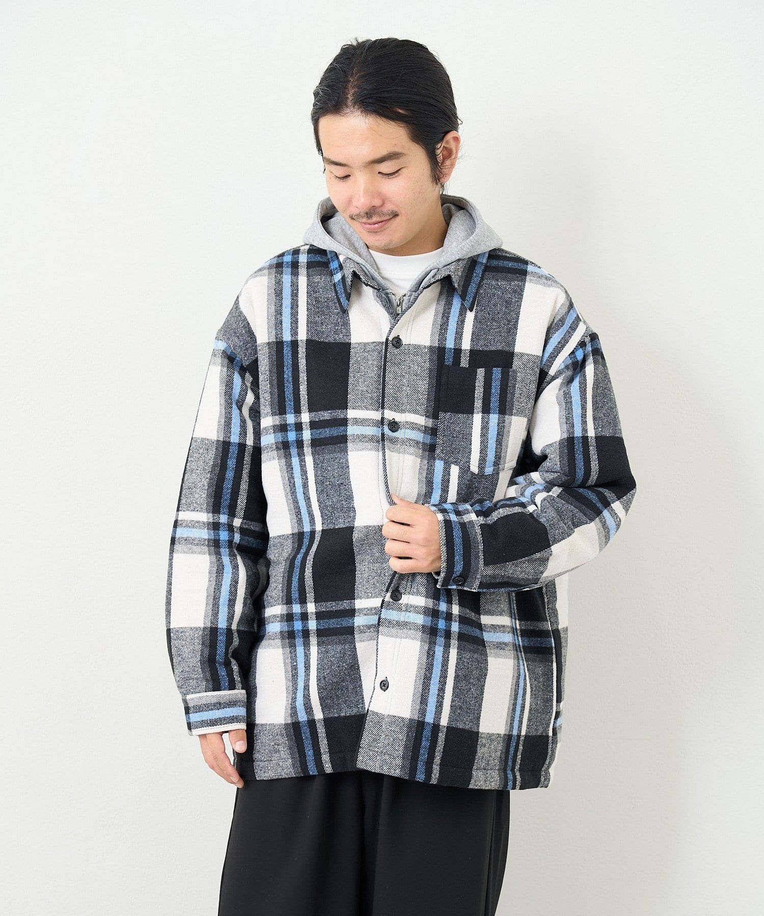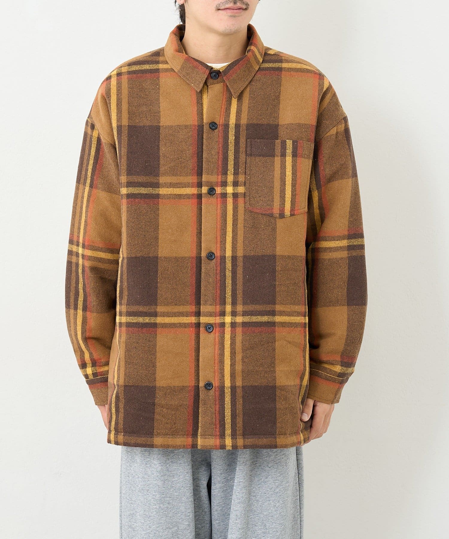ほっこりとした大柄チェックが存在感を放つ、中綿入りのシャツジャケット。