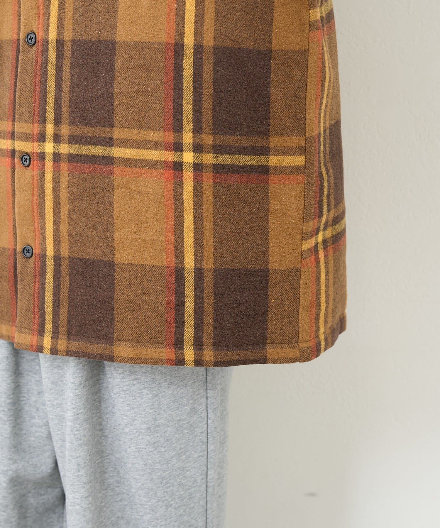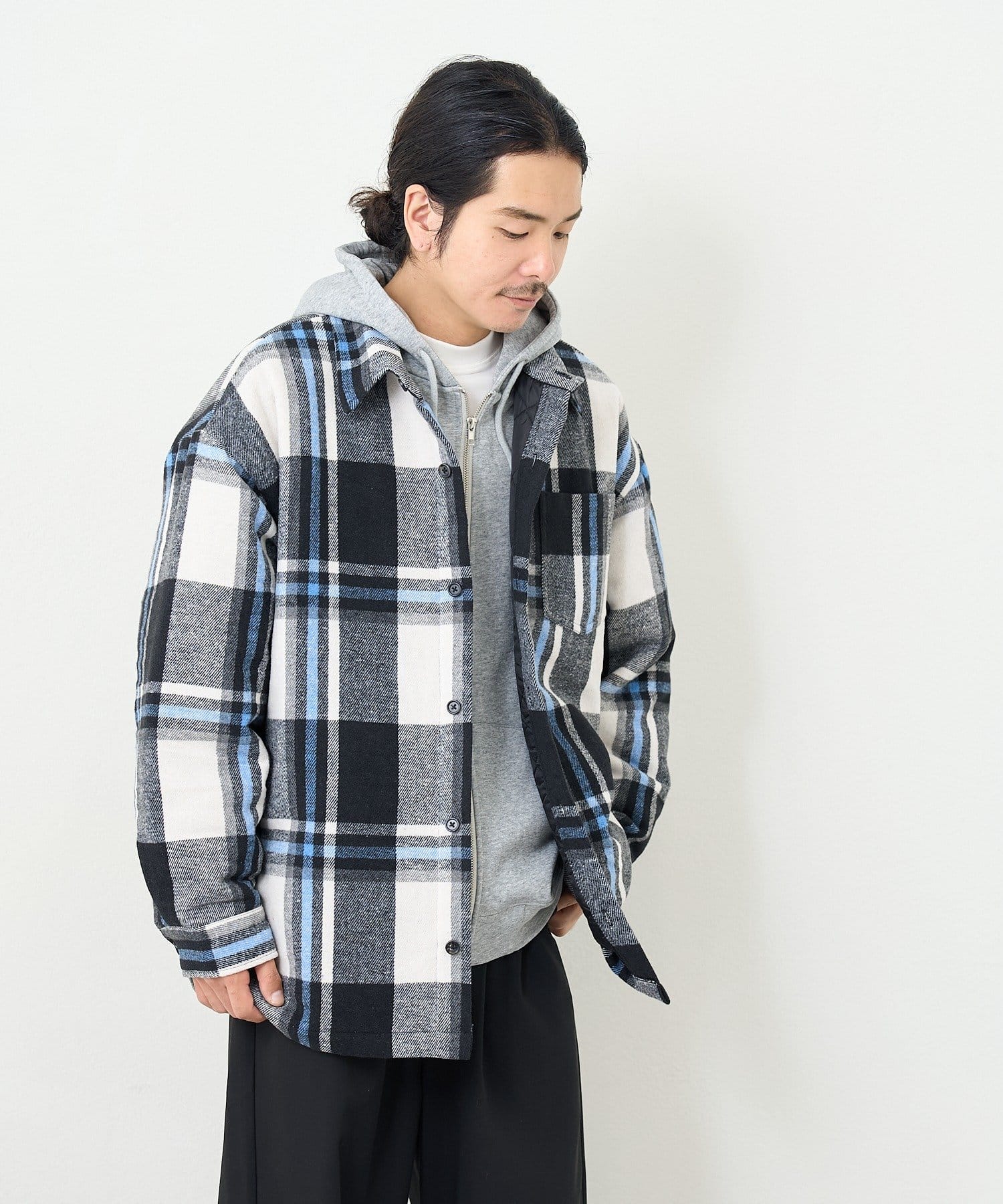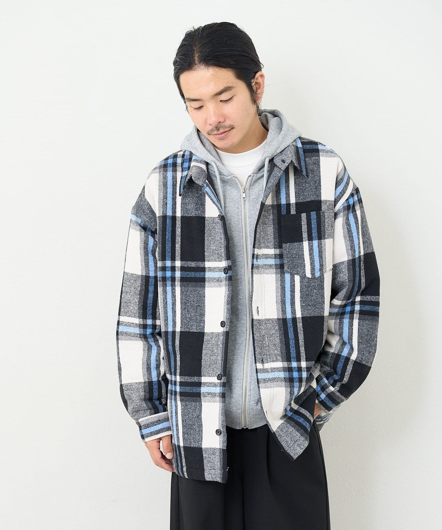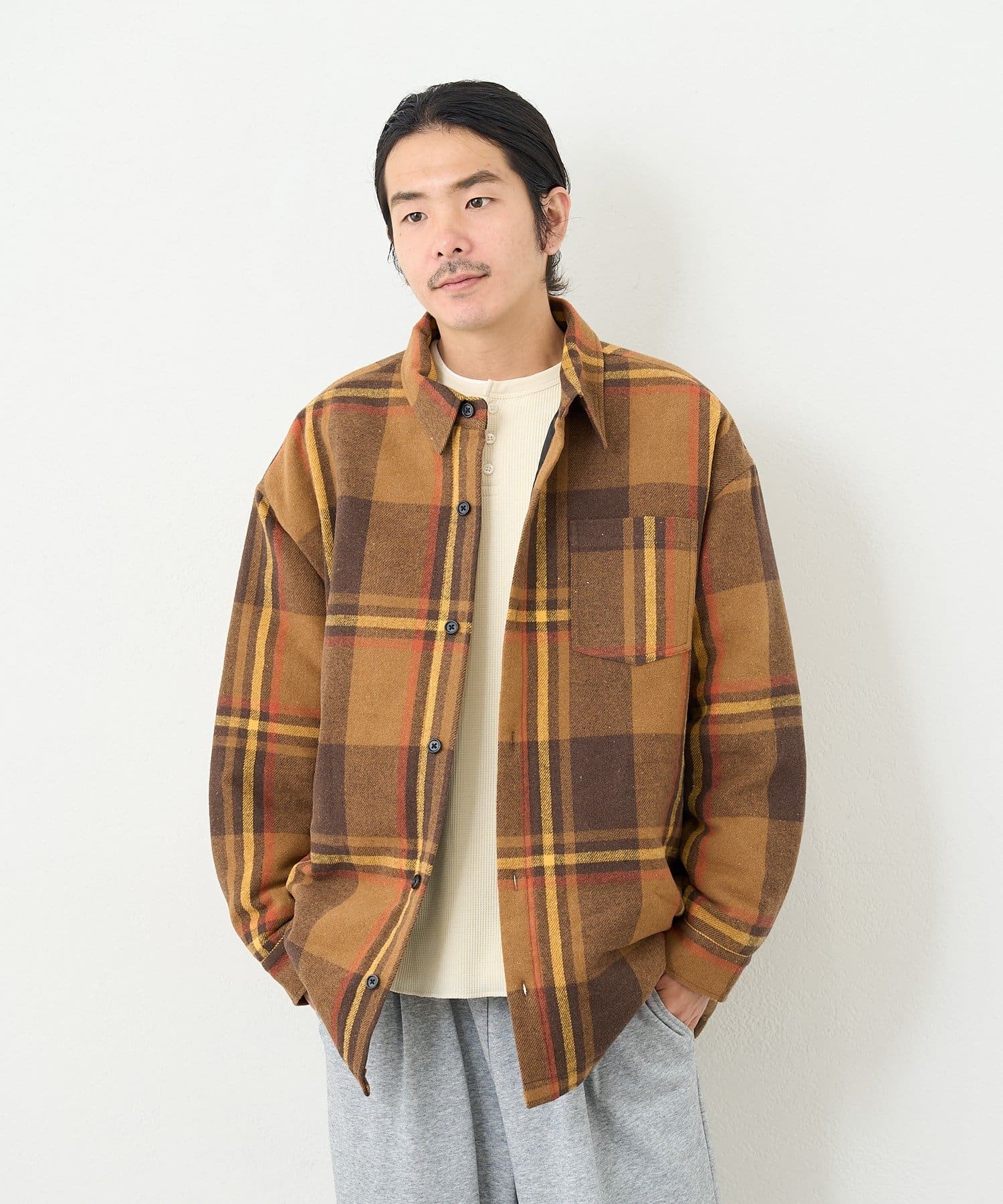 ほっこりとした大柄チェックが存在感を放つ、中綿入りのシャツジャケット。