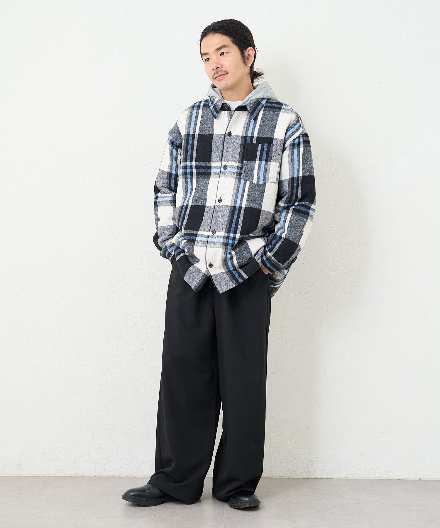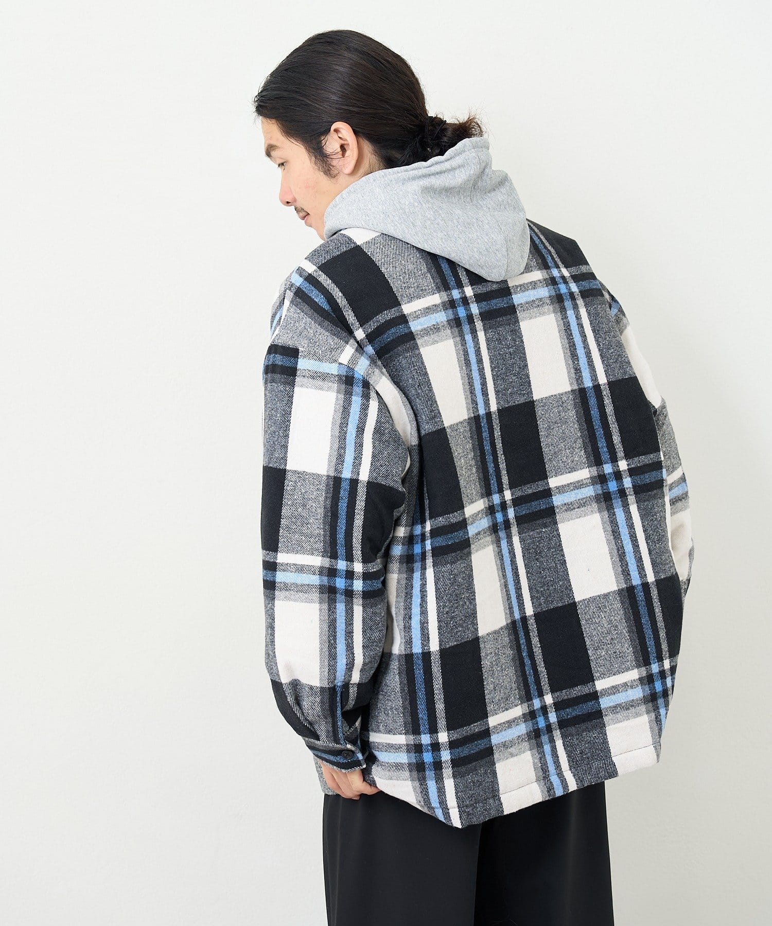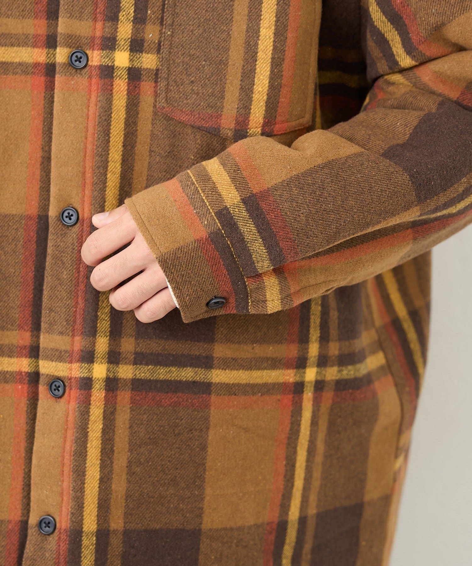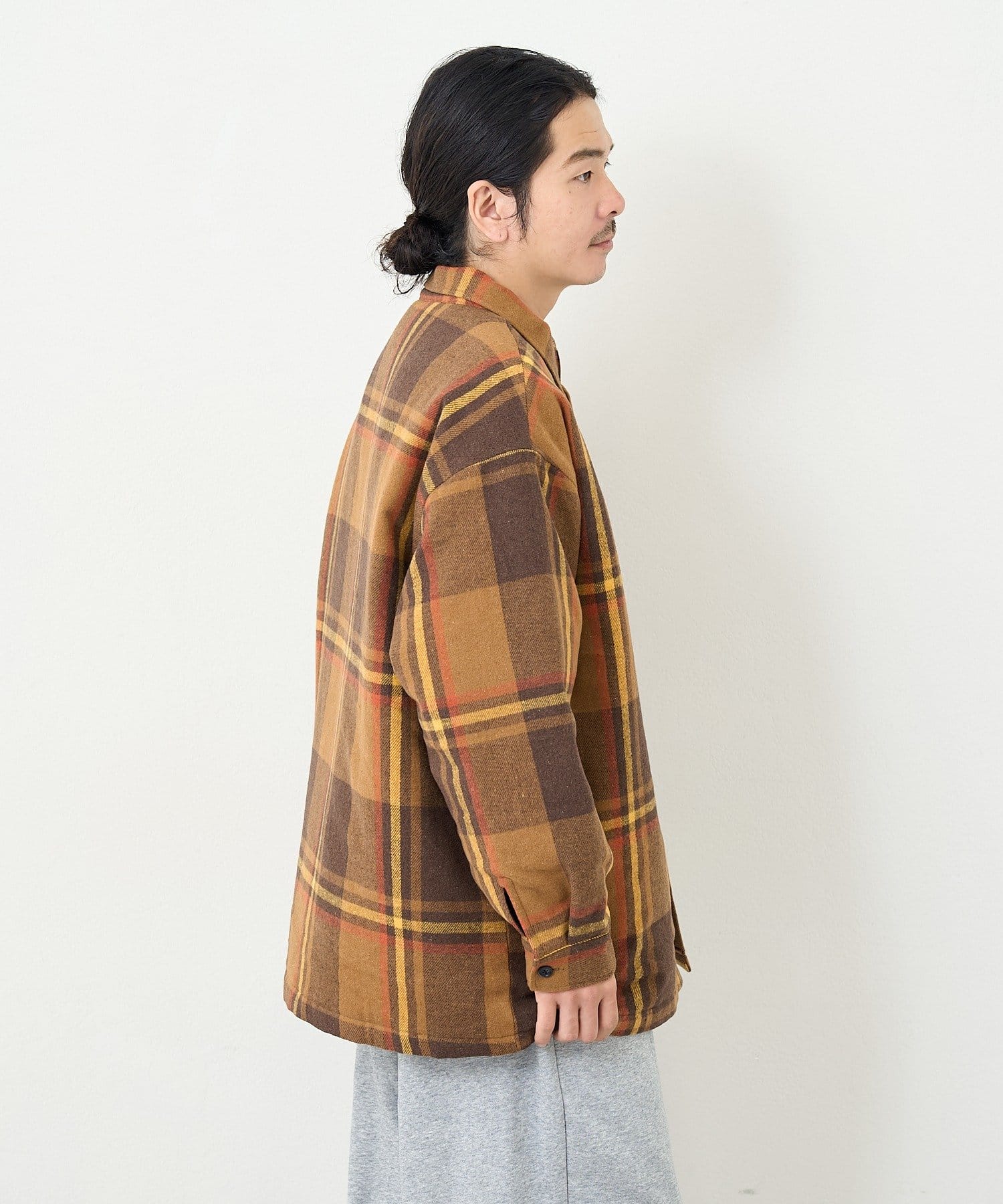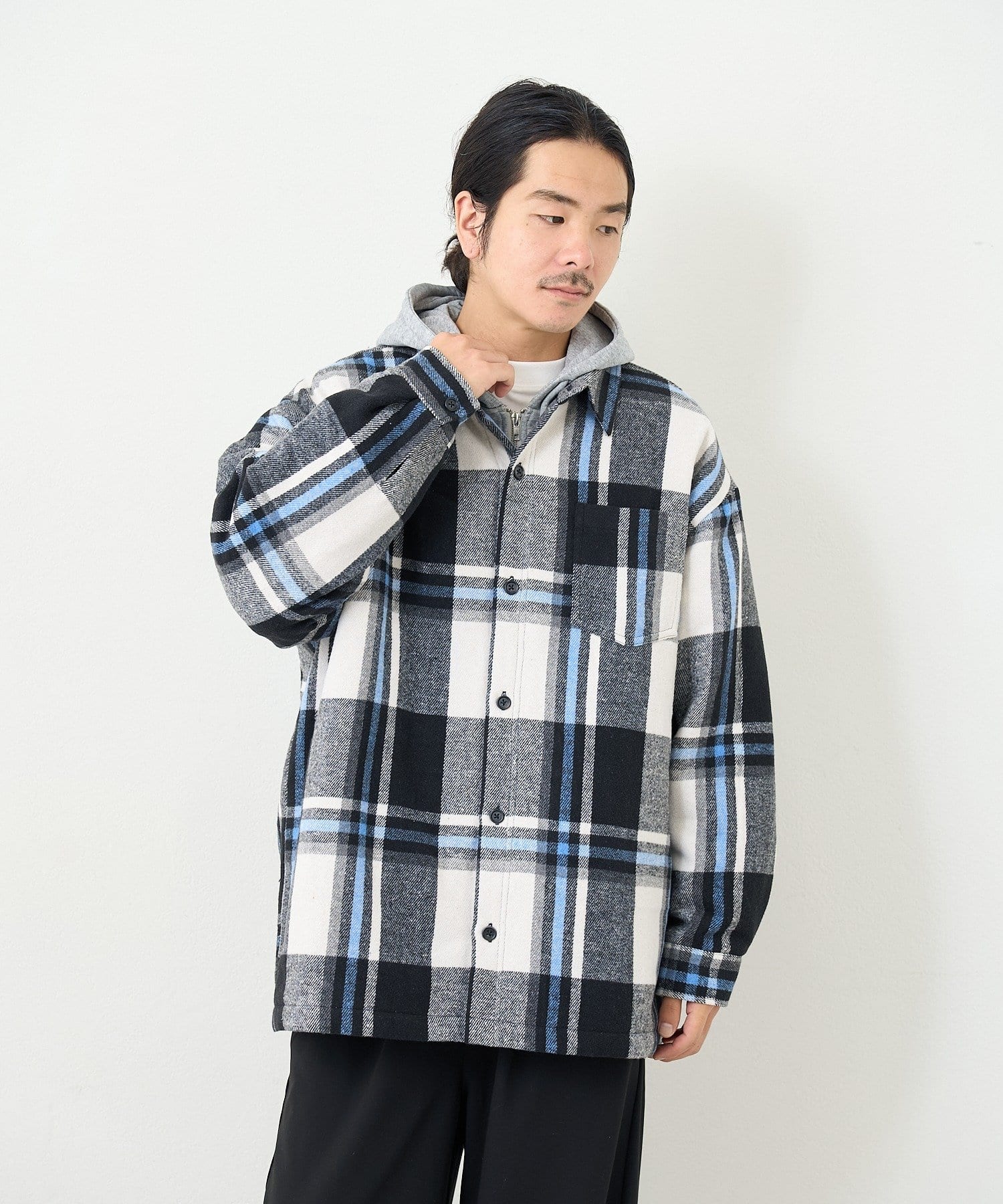 ほっこりとした大柄チェックが存在感を放つ、中綿入りのシャツジャケット。