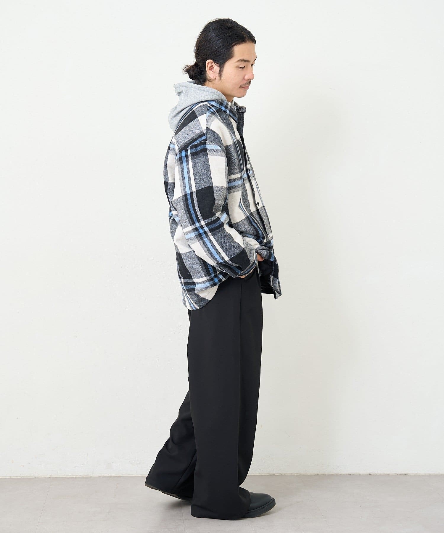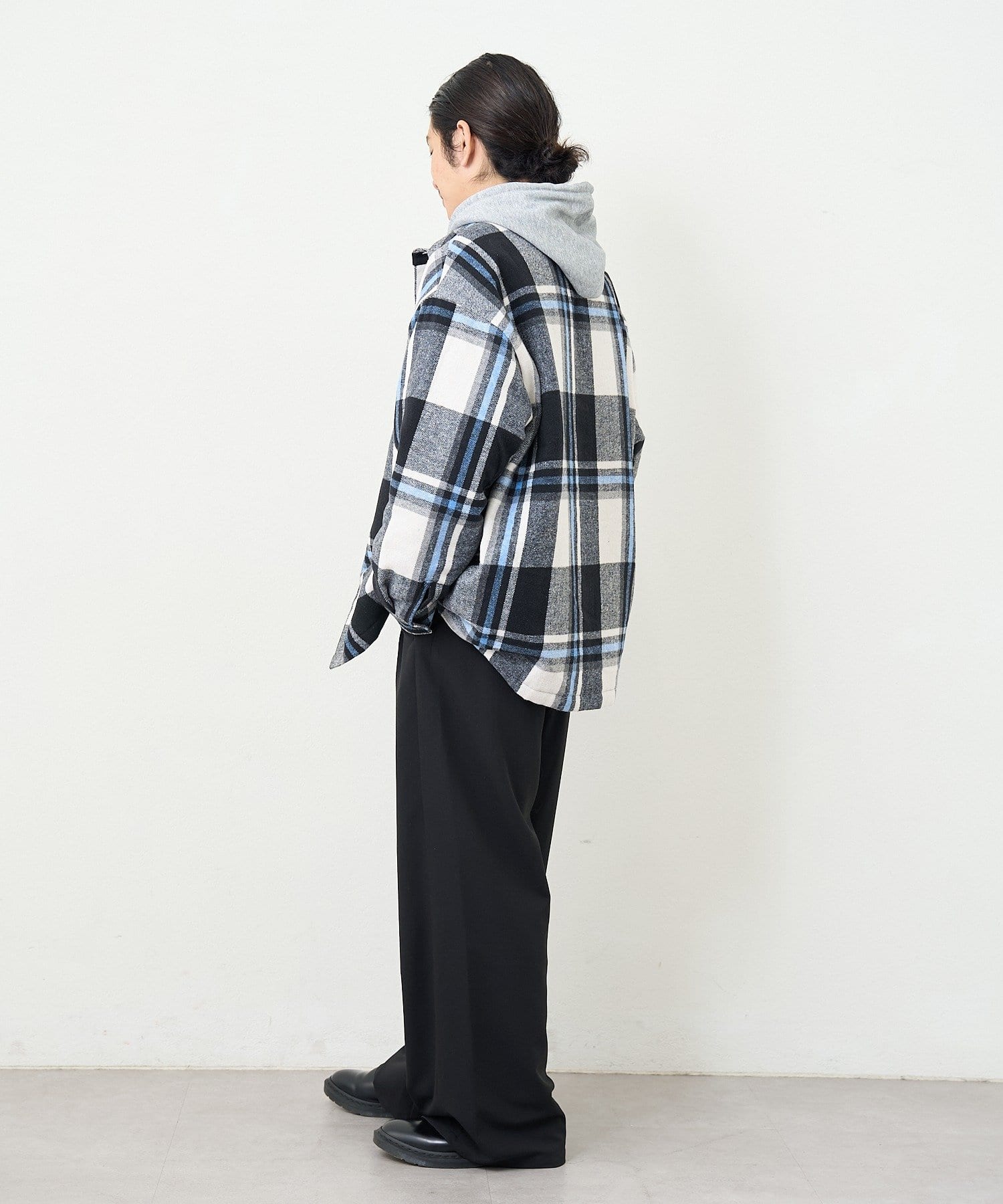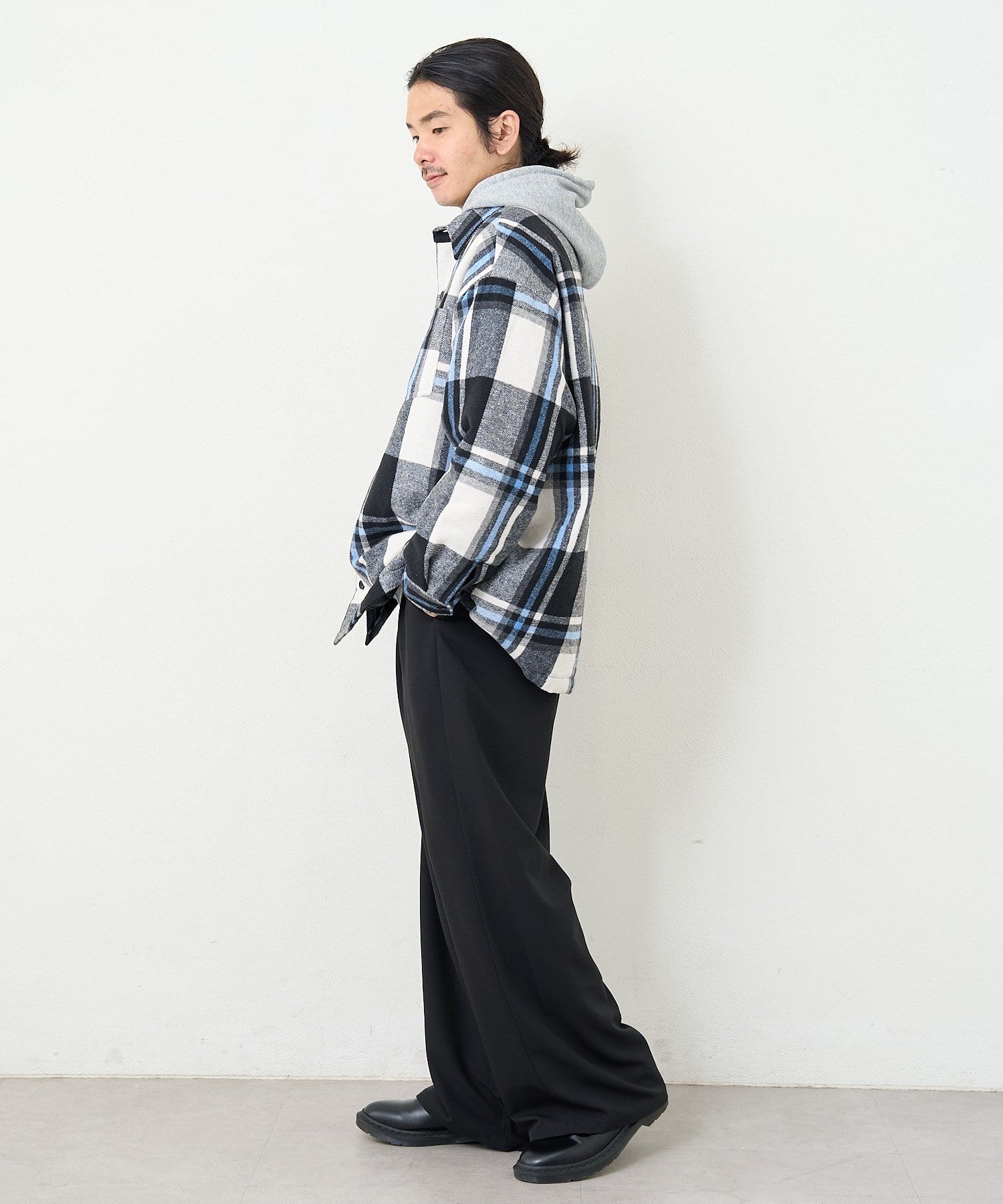 中にフーディを仕込み、カーゴパンツと合わせてボリューム感を楽しむストリートミックスな着こなしに。