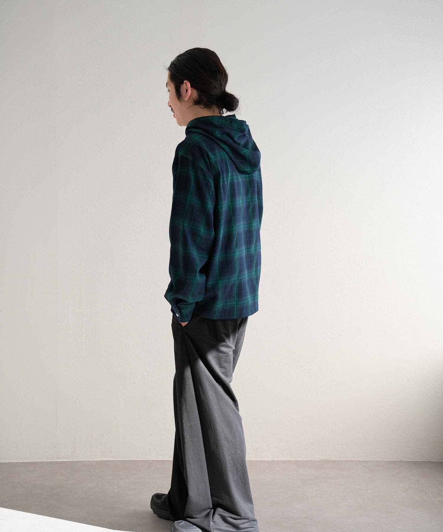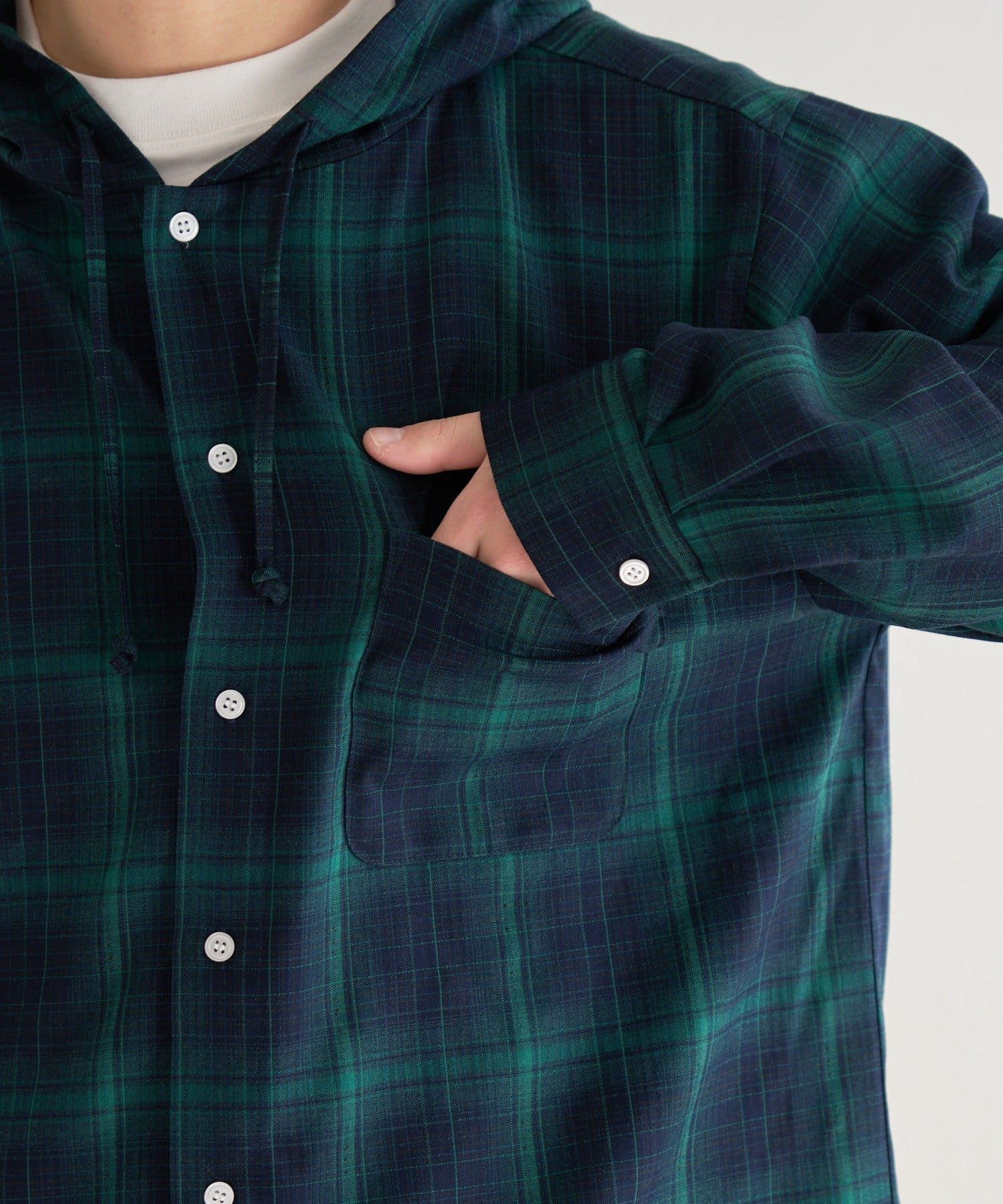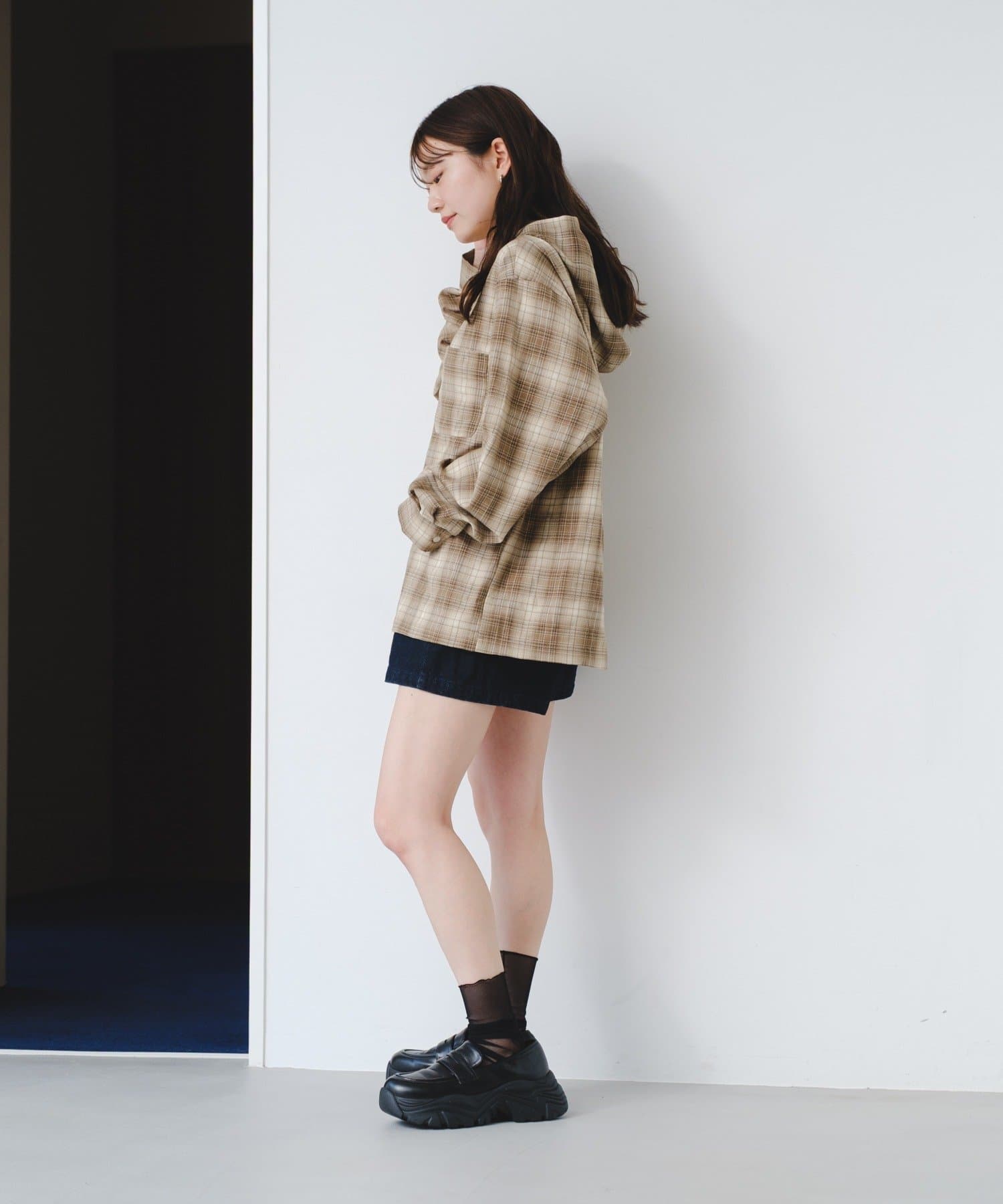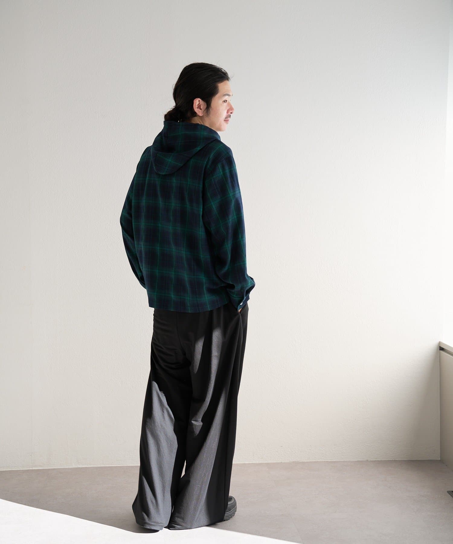 カジュアルなチェック柄にフードをプラスすることで、程よくストリート感のあるこなれた印象に。